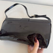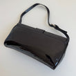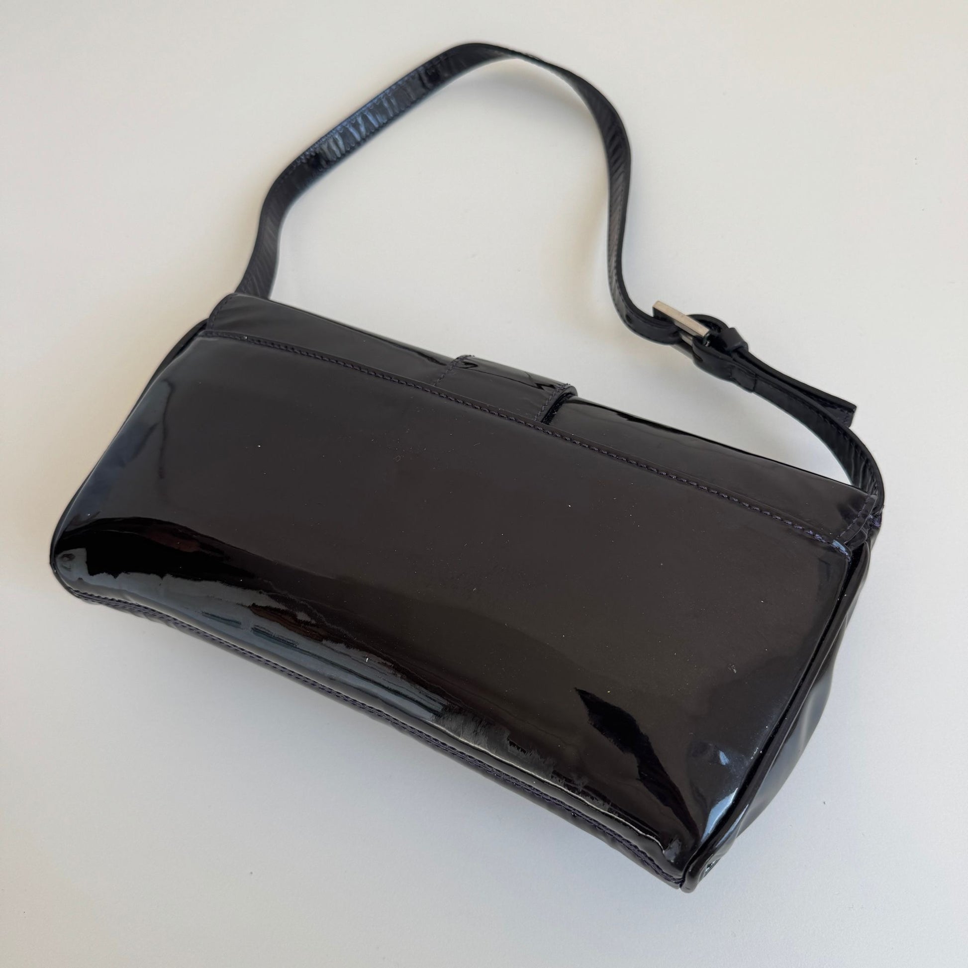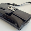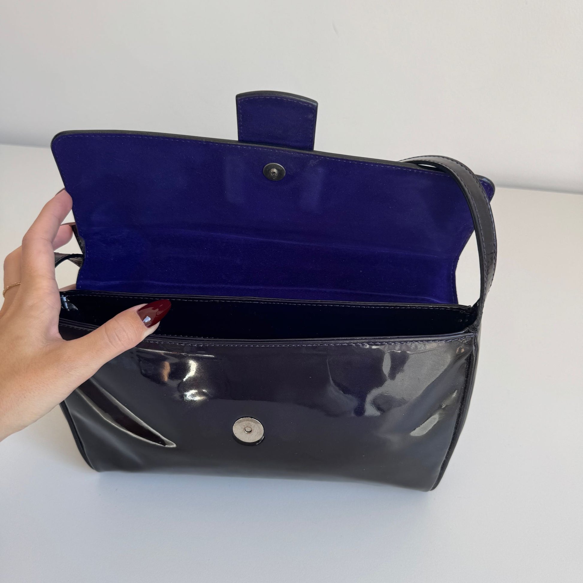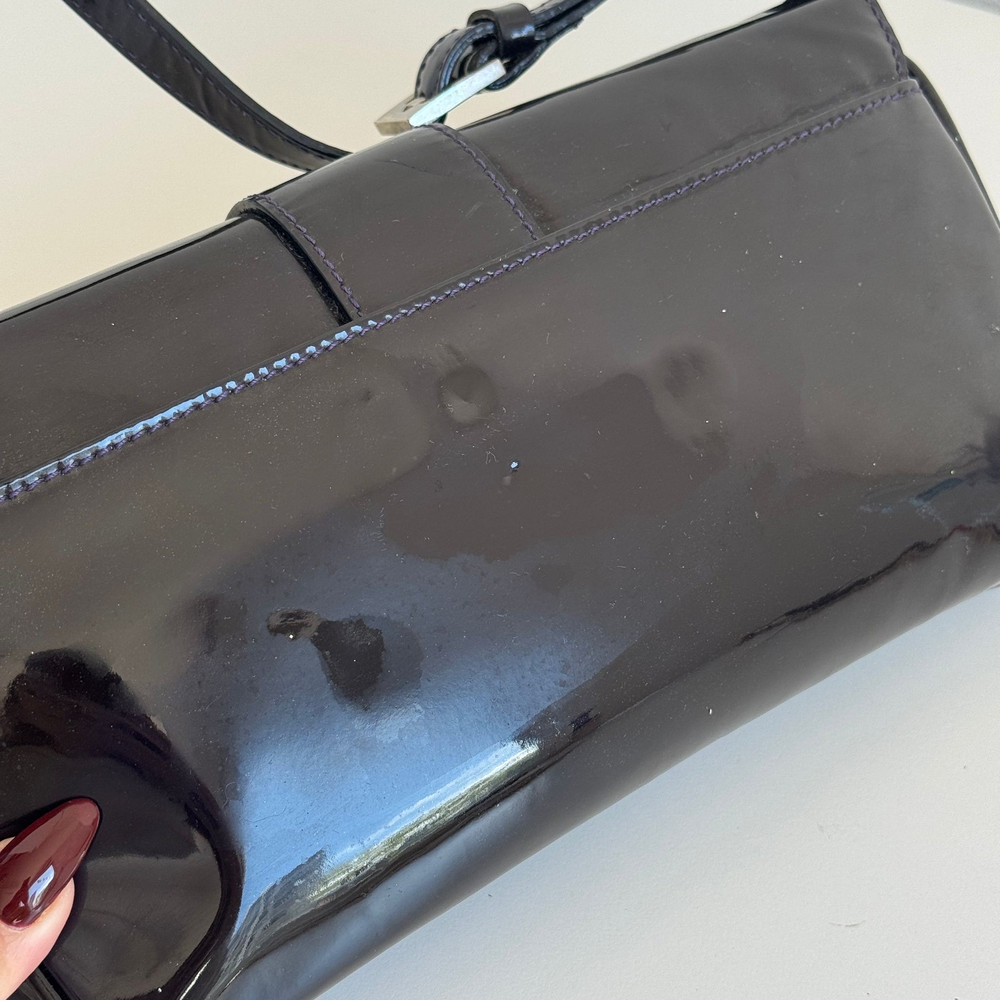 Bellissima borsa a spalla Dolce&Gabbana in vernice viola melanzana molto scuro, quasi nero e hardware argento. Si indossa a spalla.