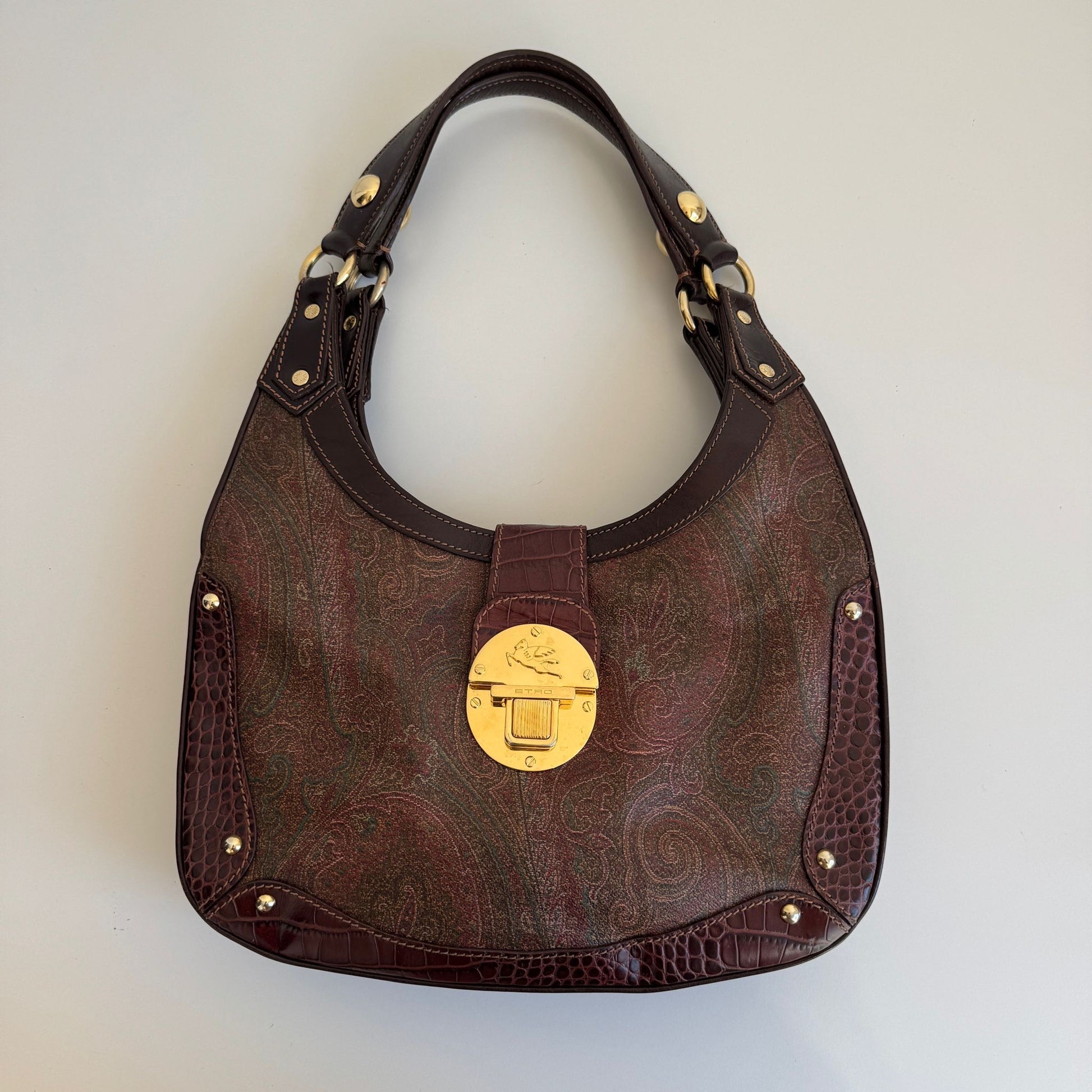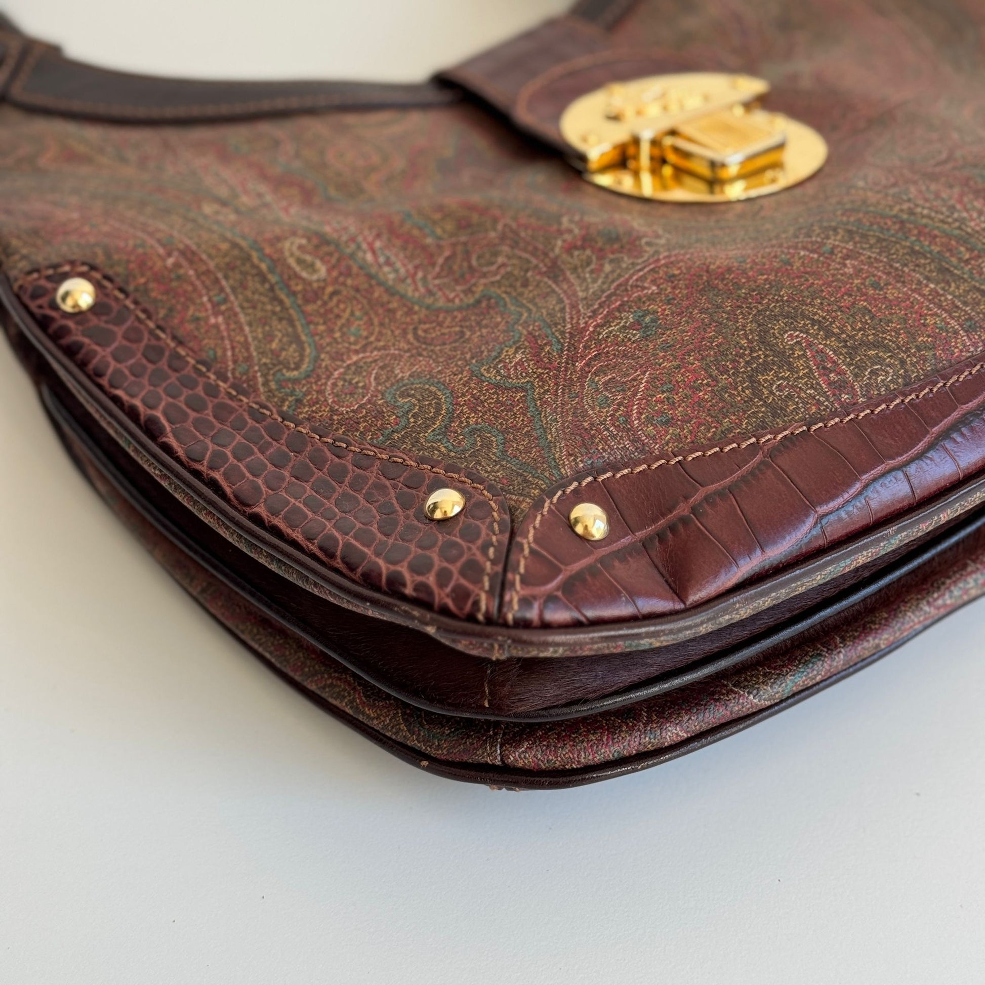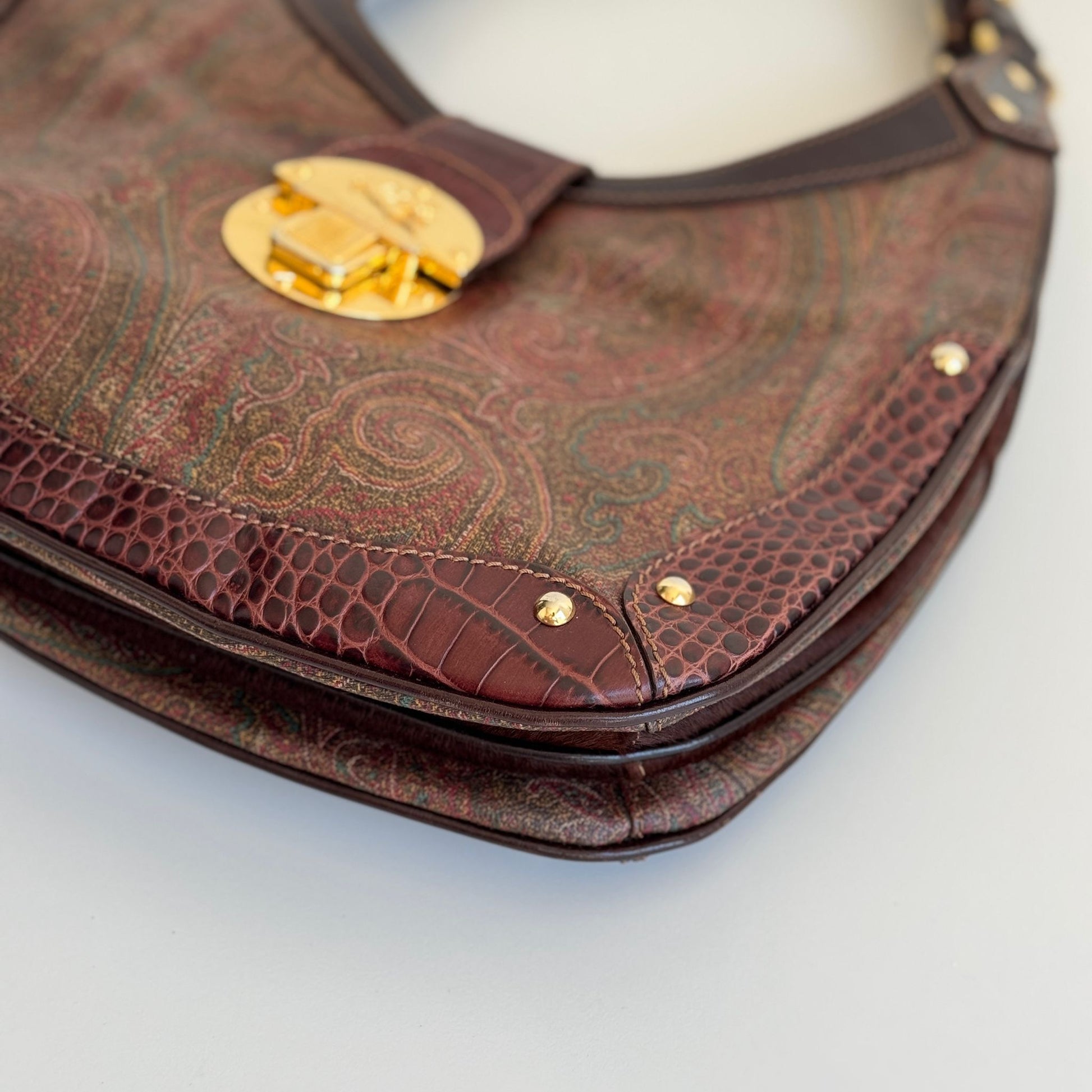 Meravigliosa borsa Etro modello Hobo in pelle Paisley e dettagli croco. Hardware oro. Si indossa a spalla.