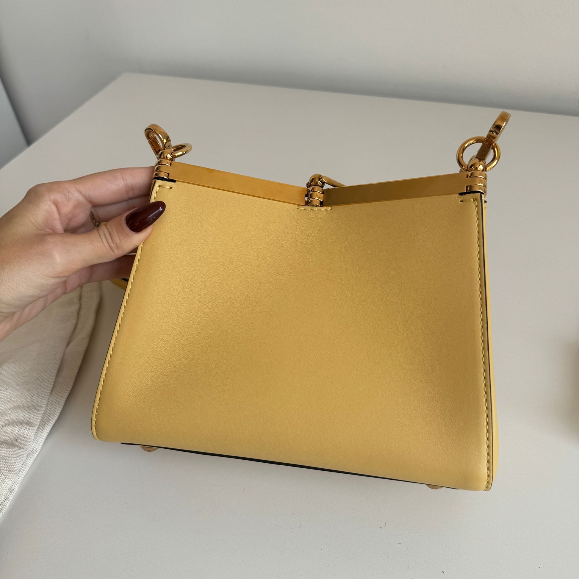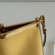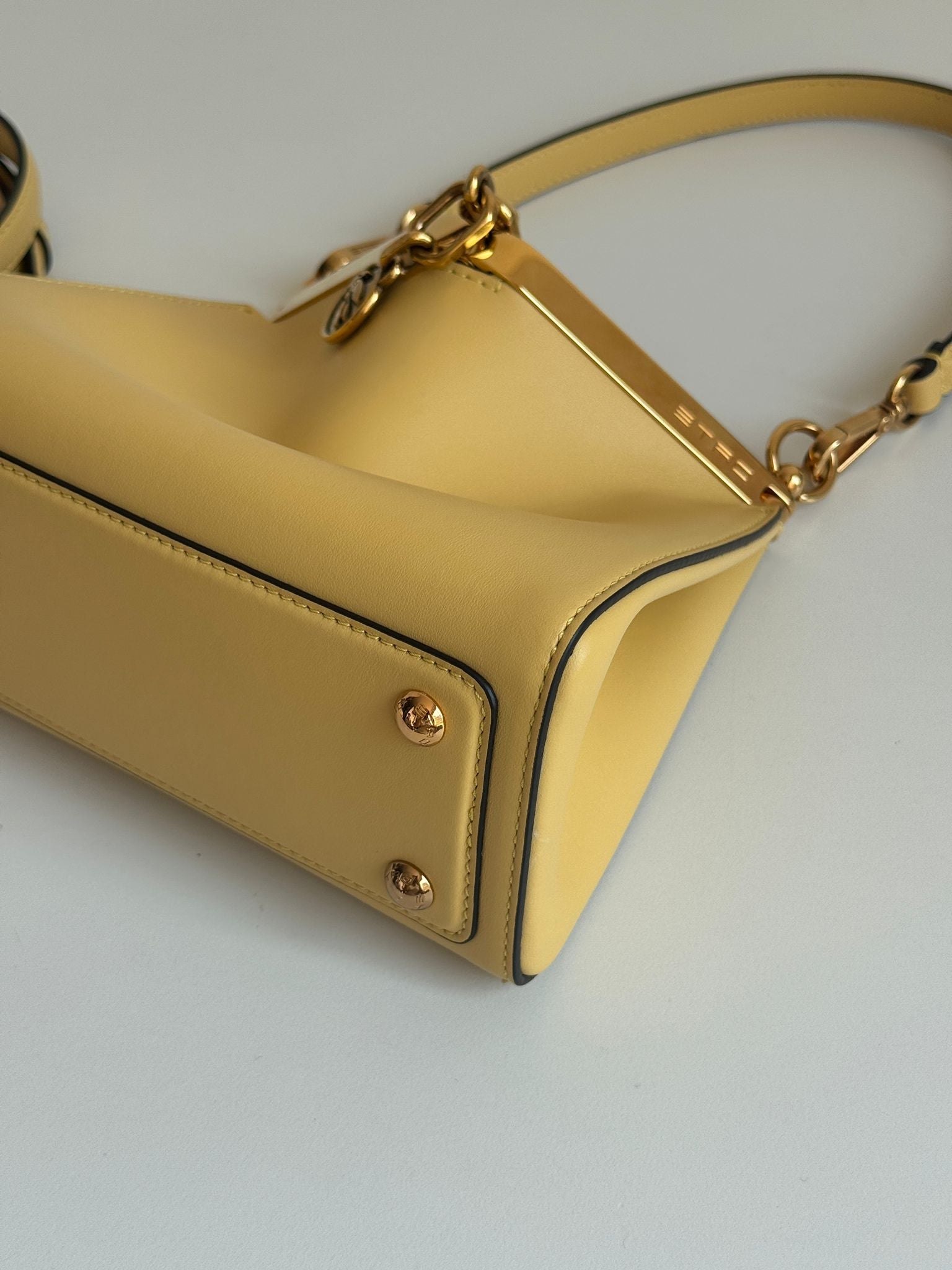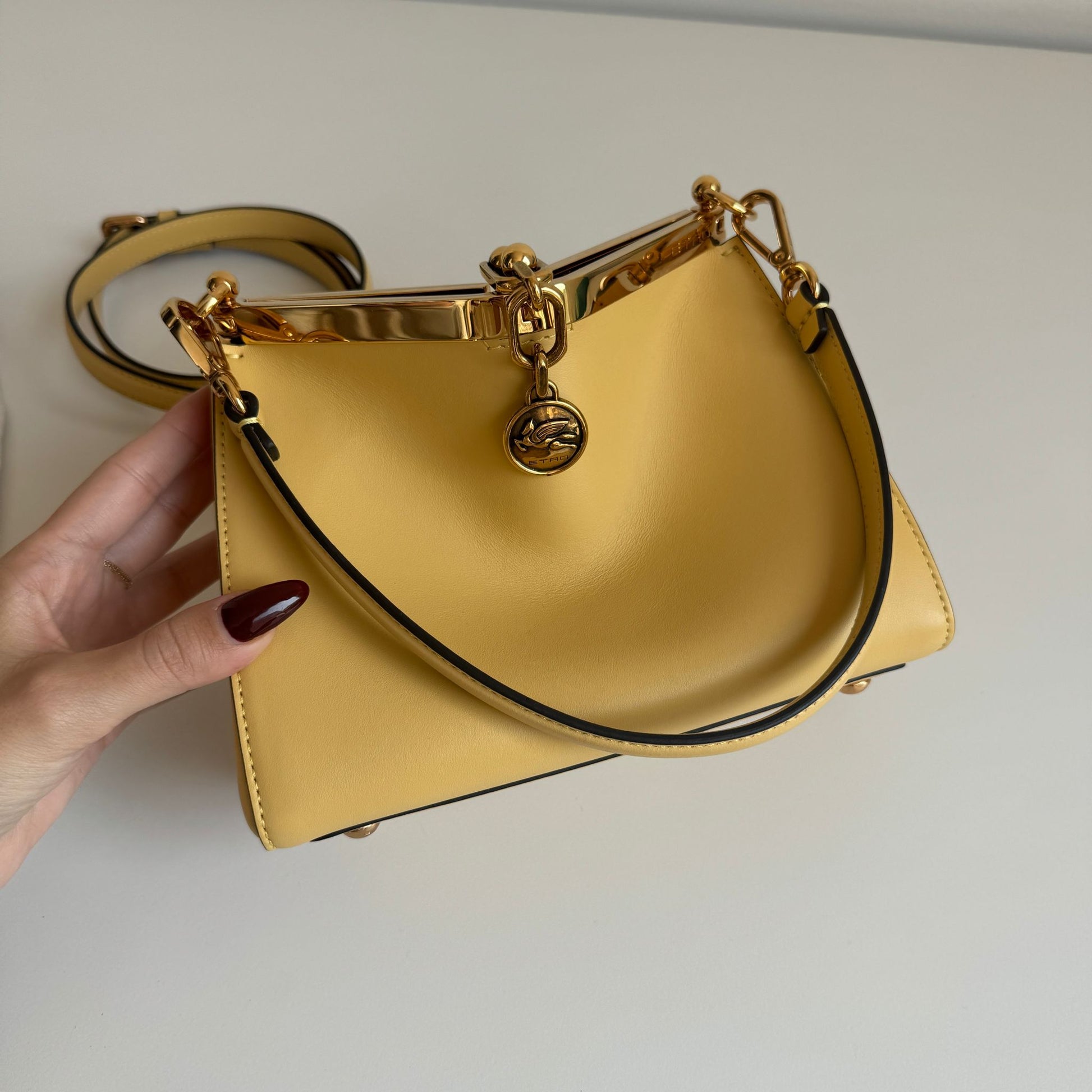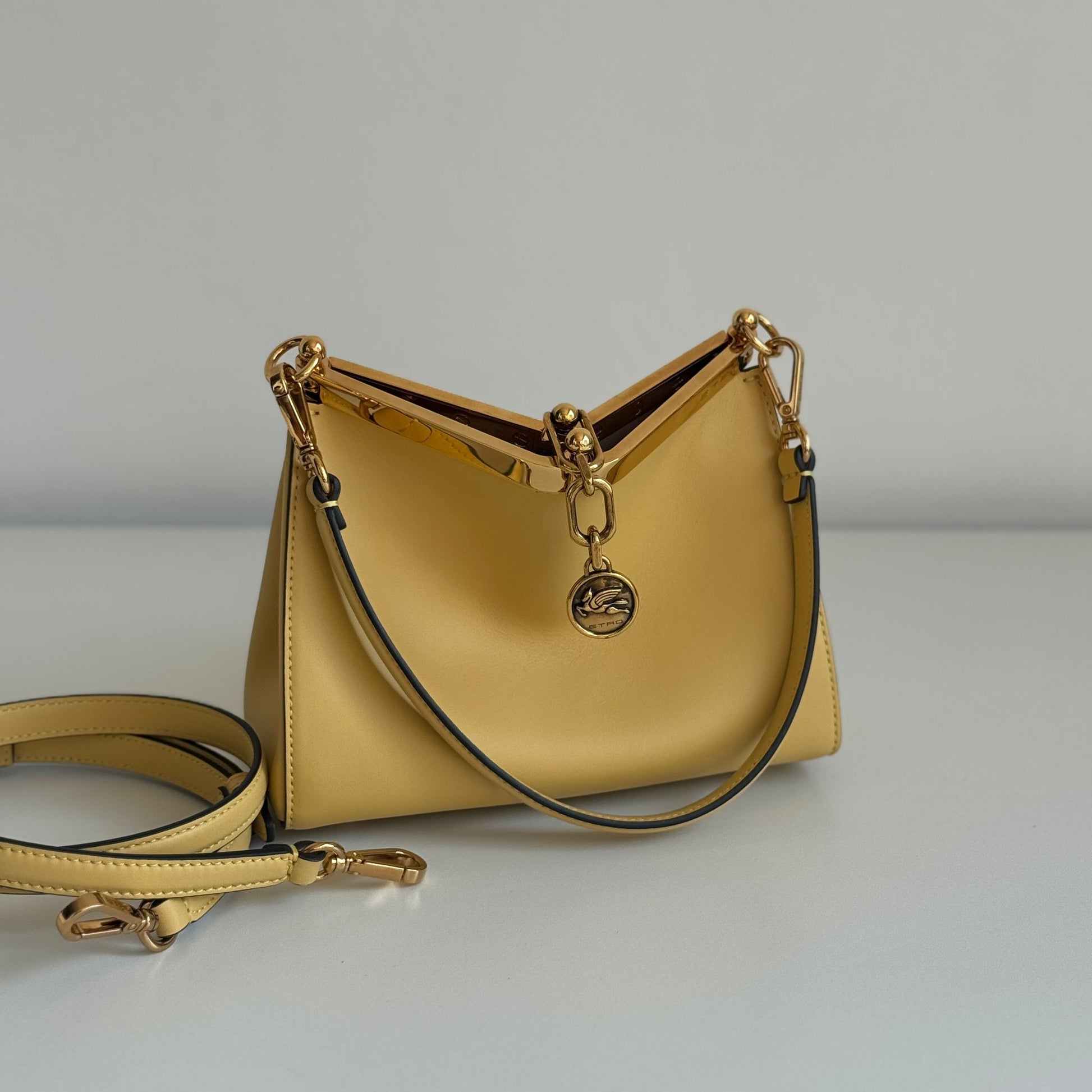 Bellissima borsa Etro modello Vela in morbida pelle liscia giallo pastello e hardware oro. Con tracolla rimovibile e regolabile e manico corto.