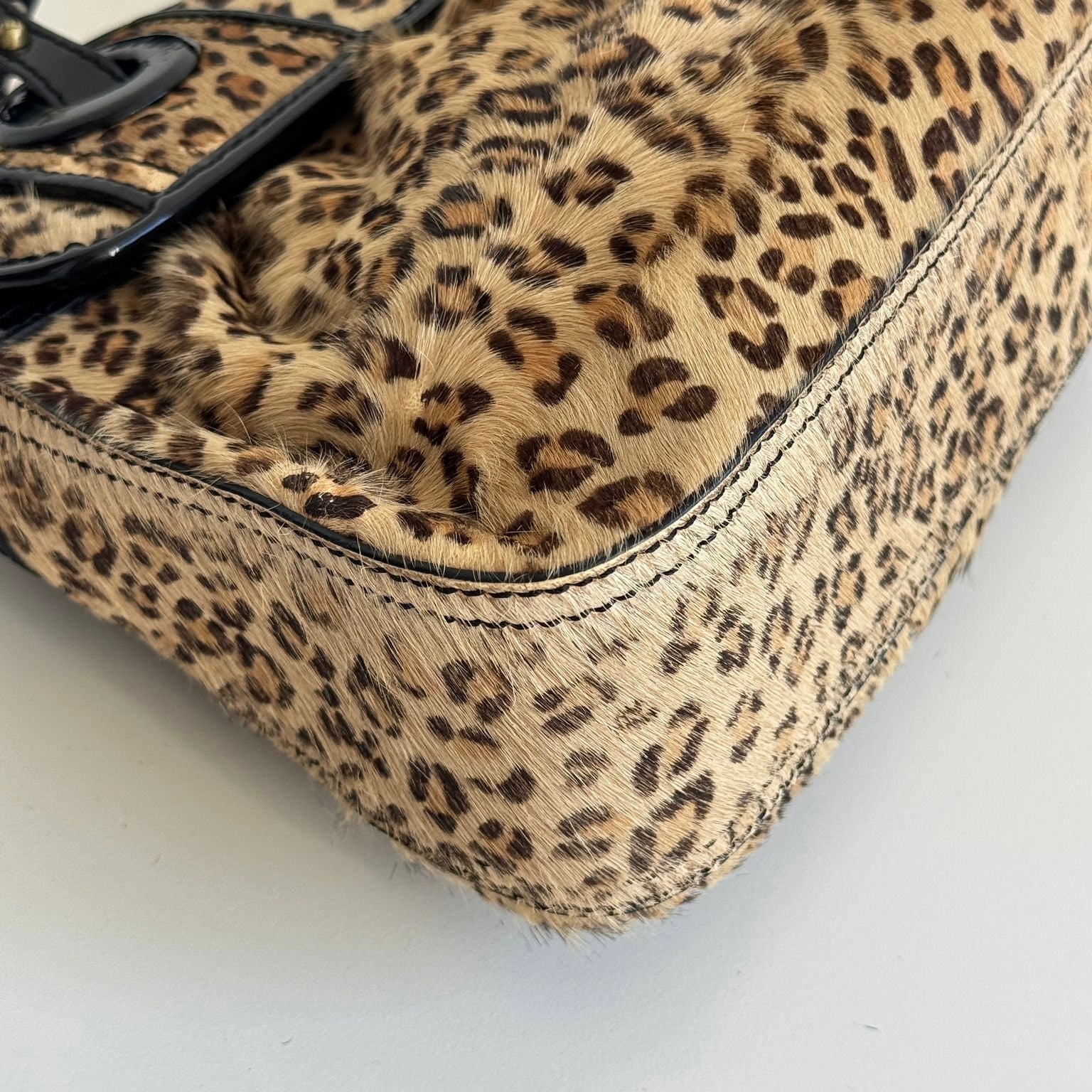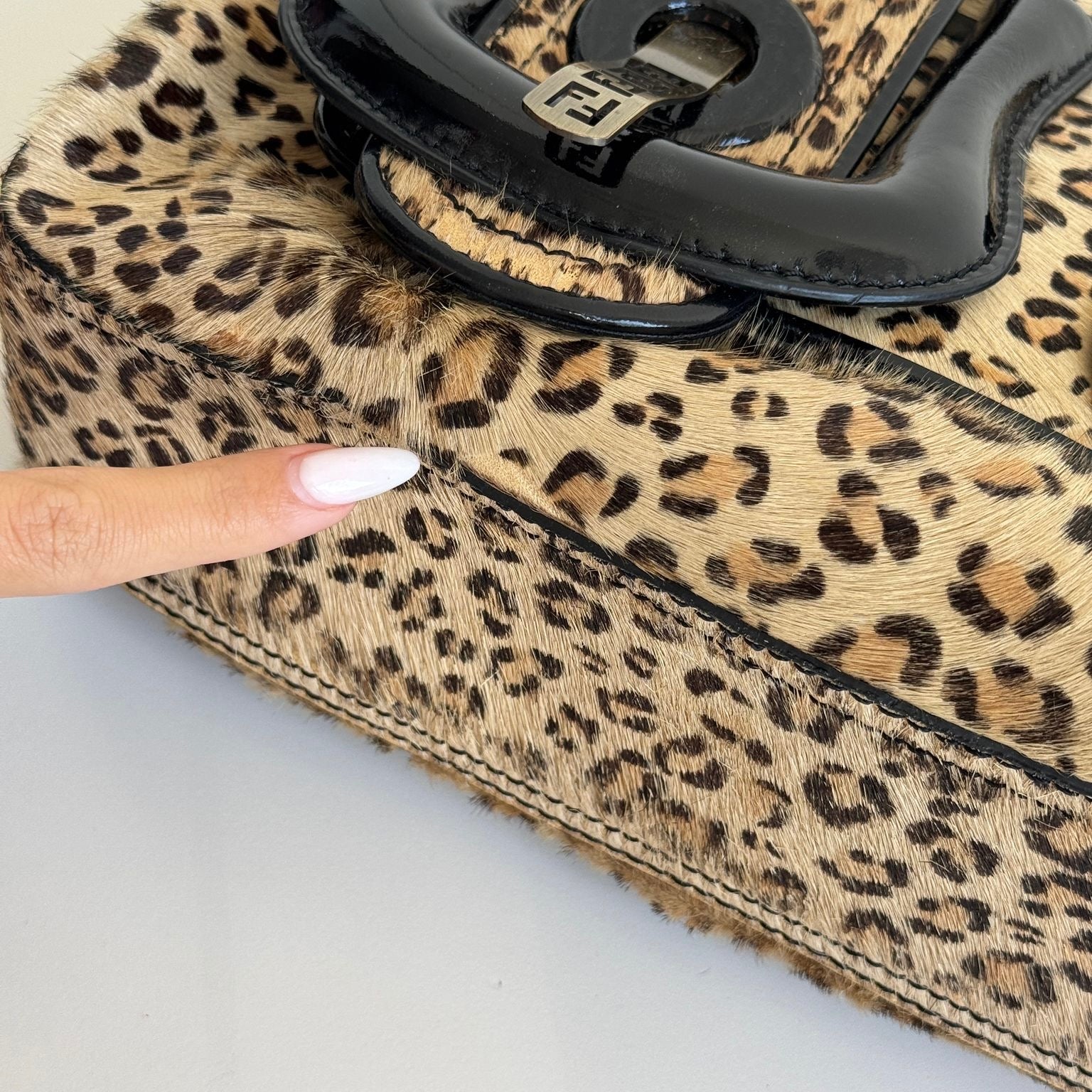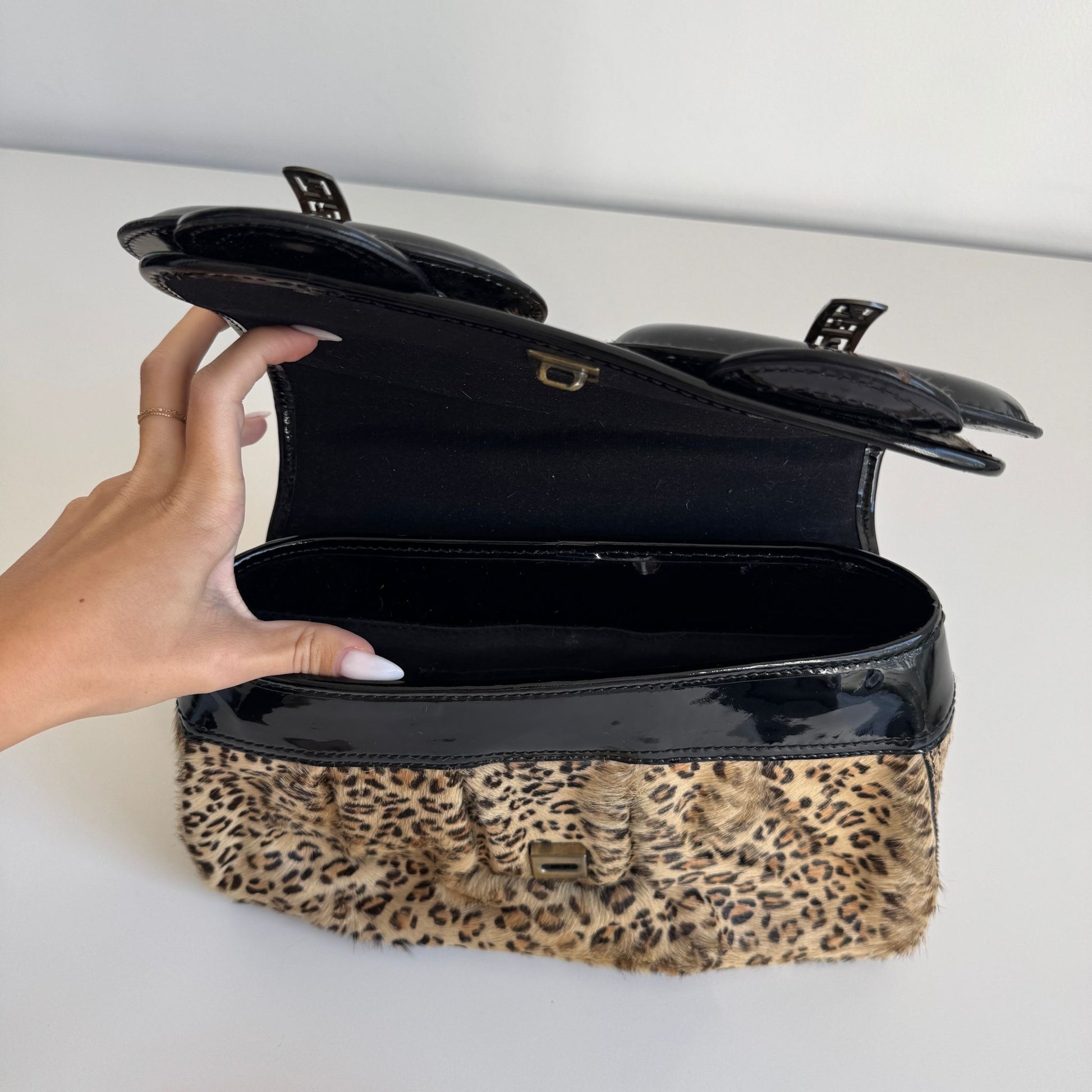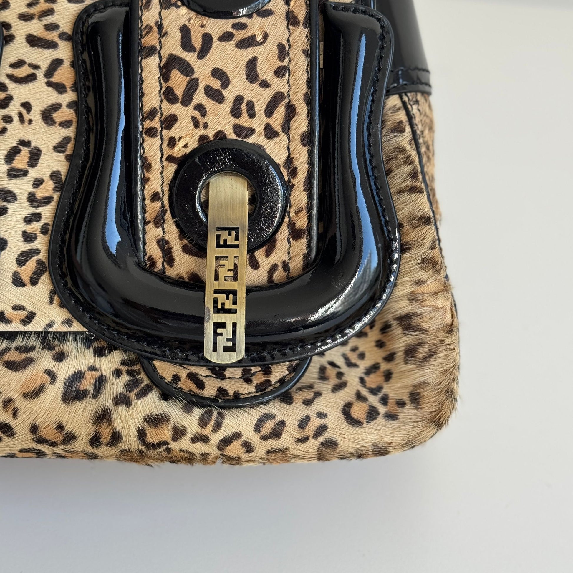 Magnifica borsa Fendi modello B Bag in cavallino stampa animalier, dettagli in vernice nera e hardware argento. Si indossa a spalla.