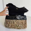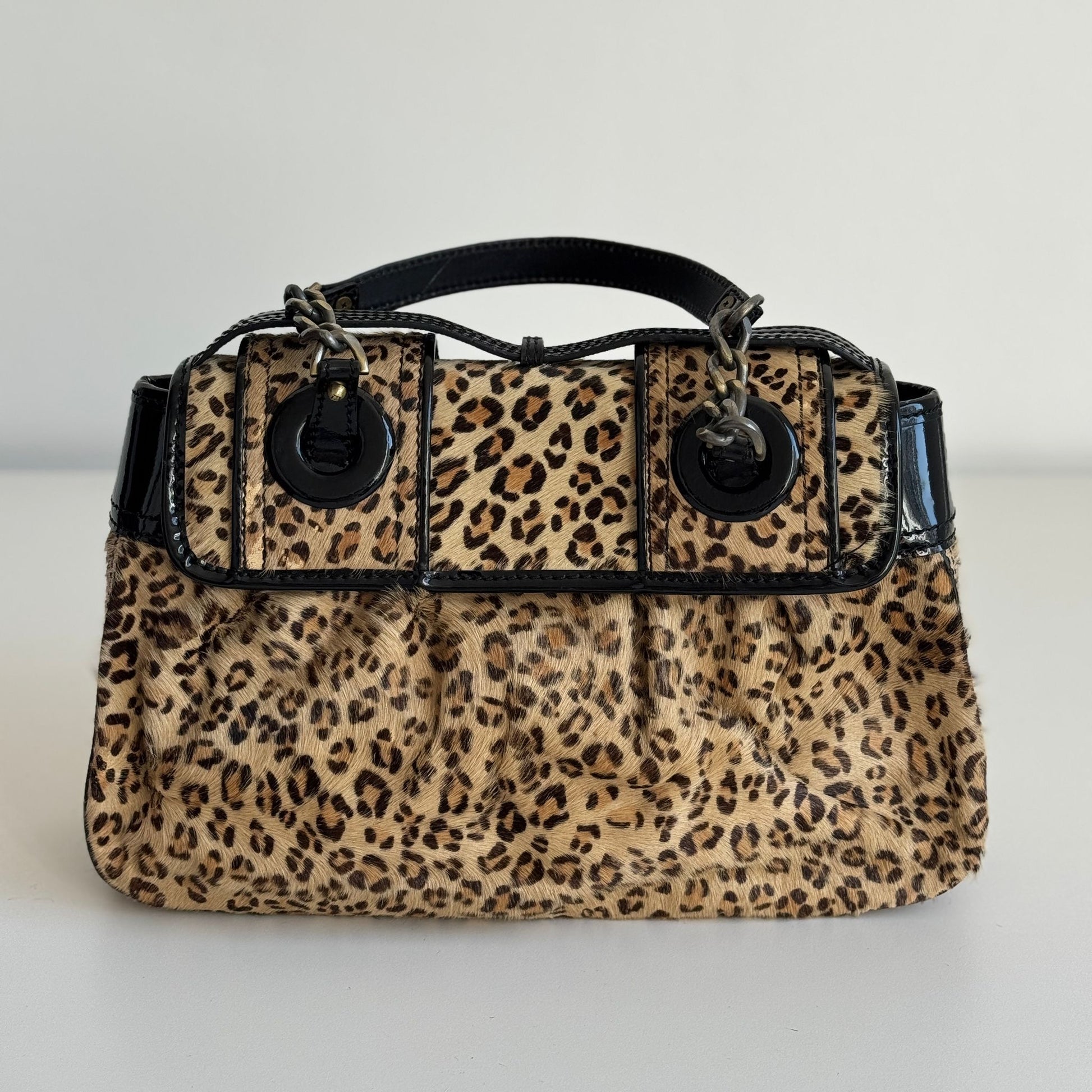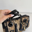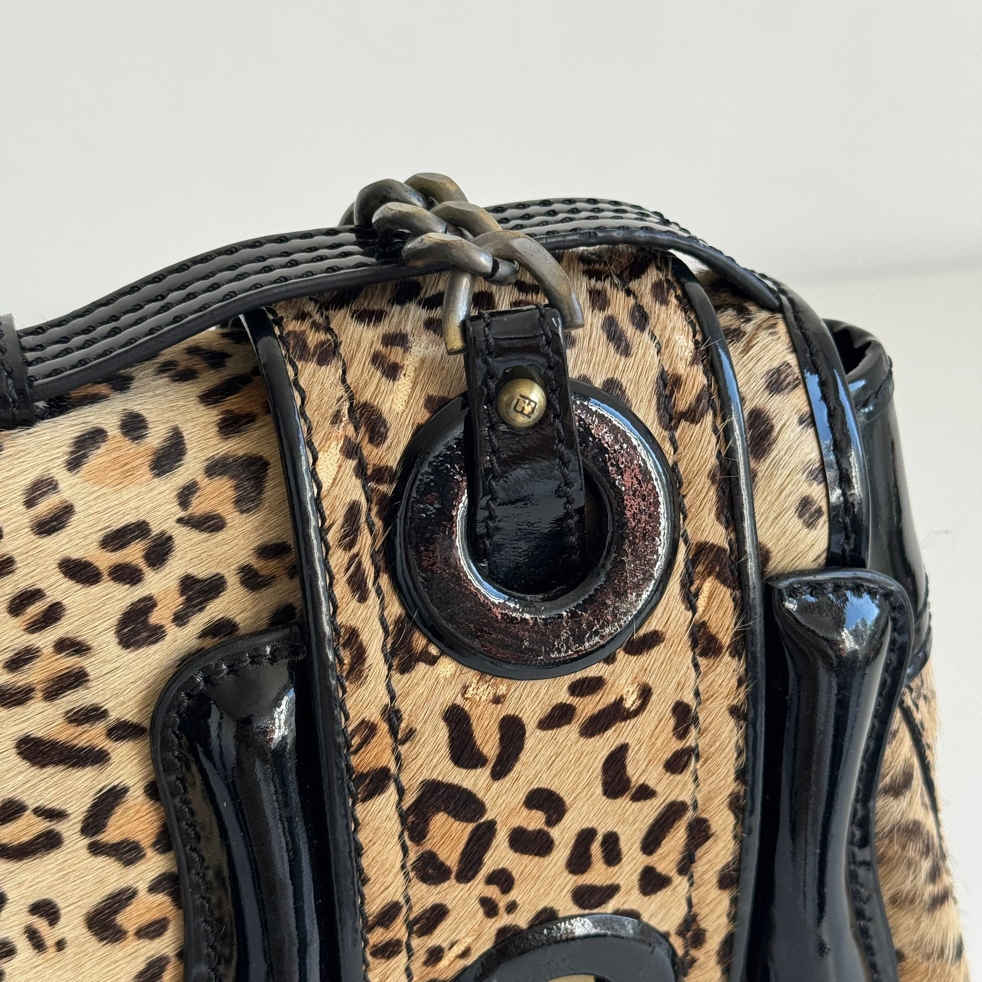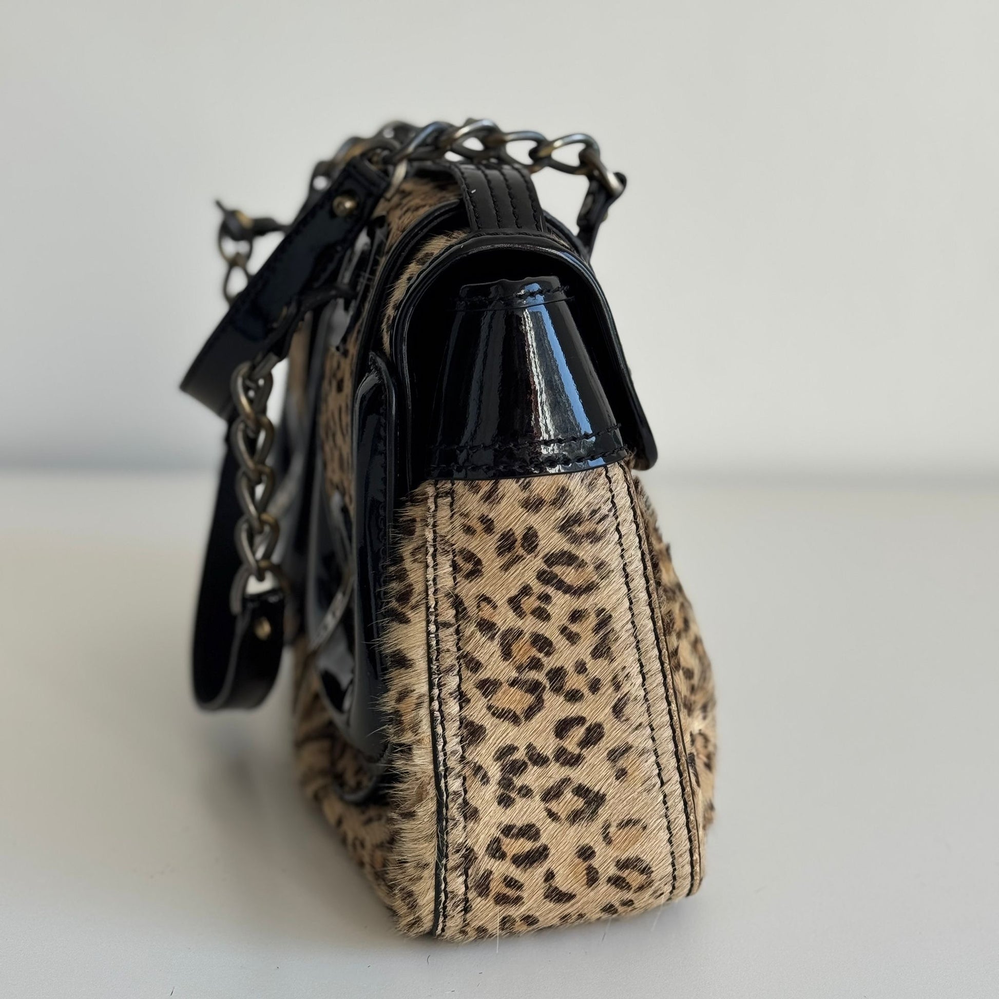 Magnifica borsa Fendi modello B Bag in cavallino stampa animalier, dettagli in vernice nera e hardware argento. Si indossa a spalla.