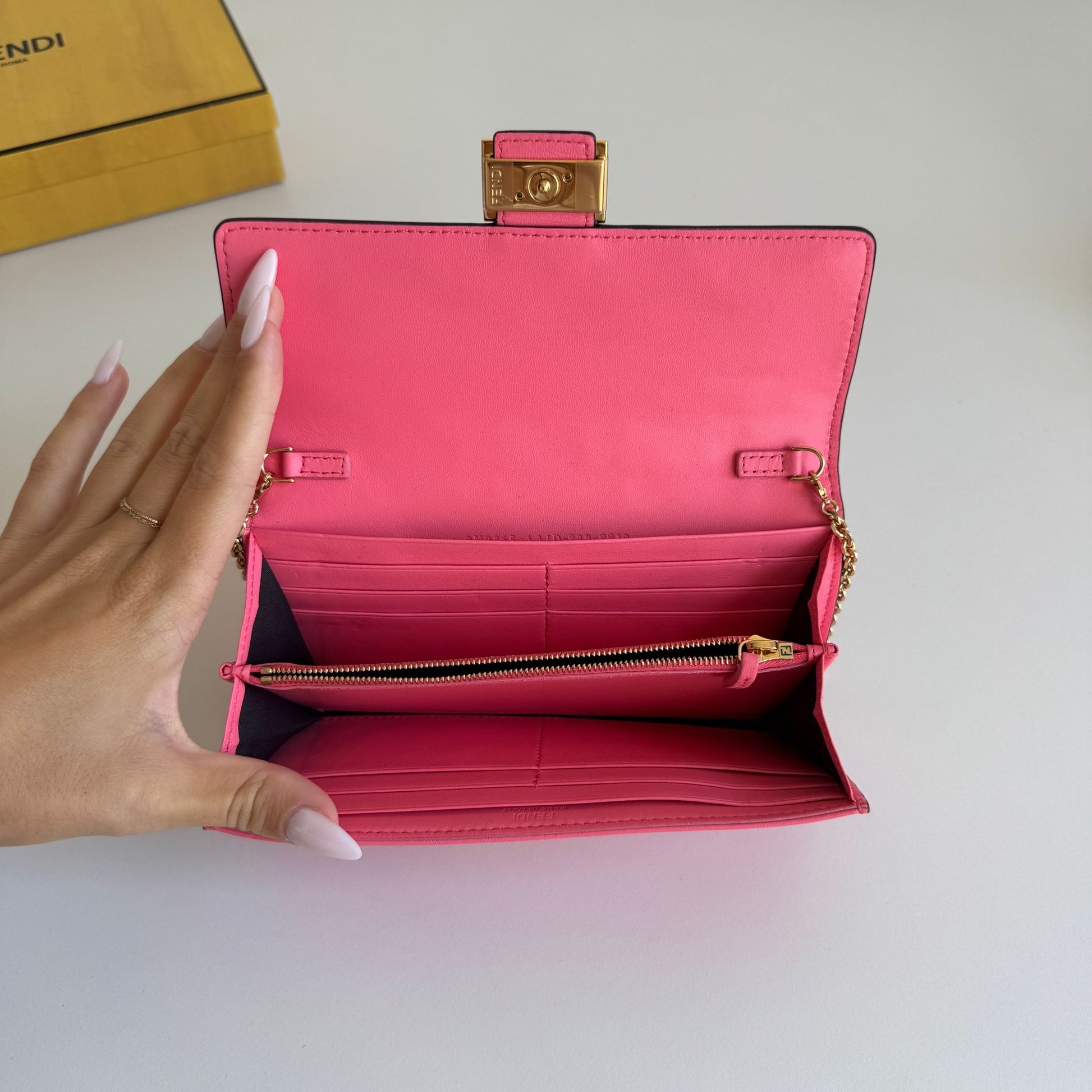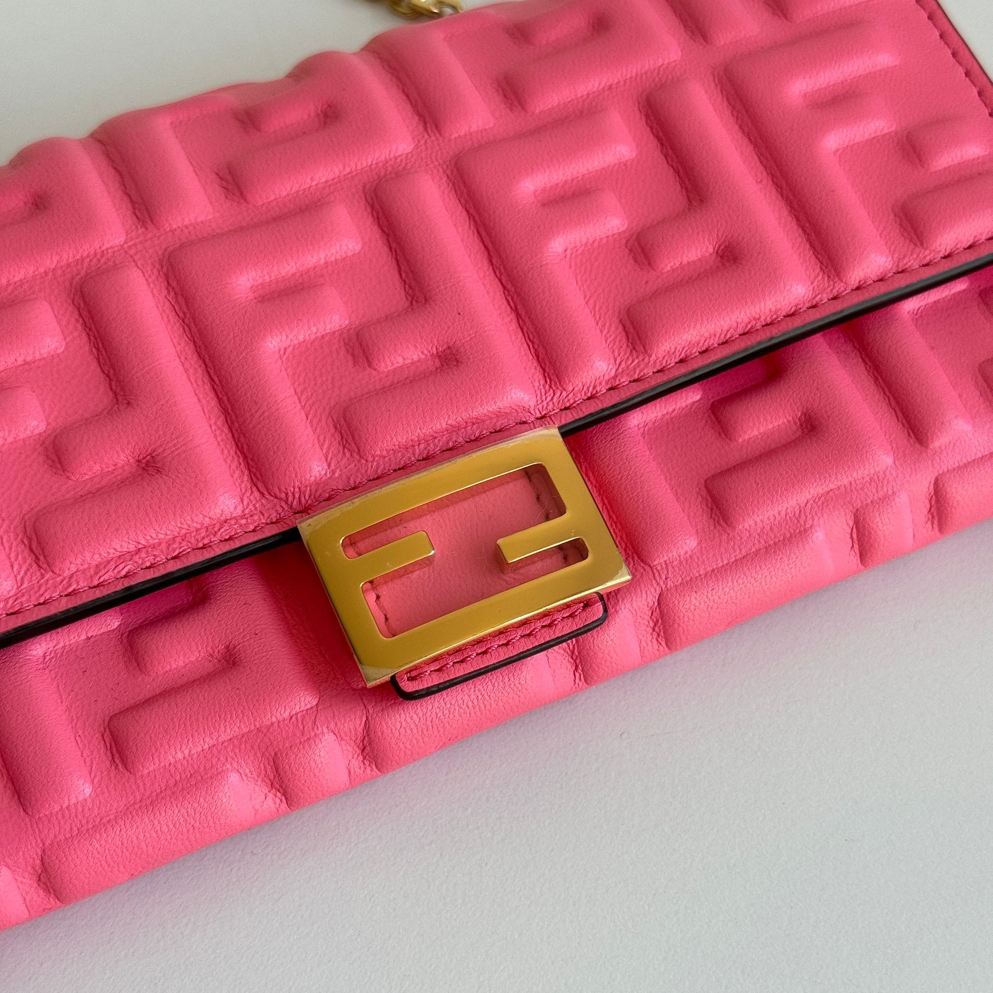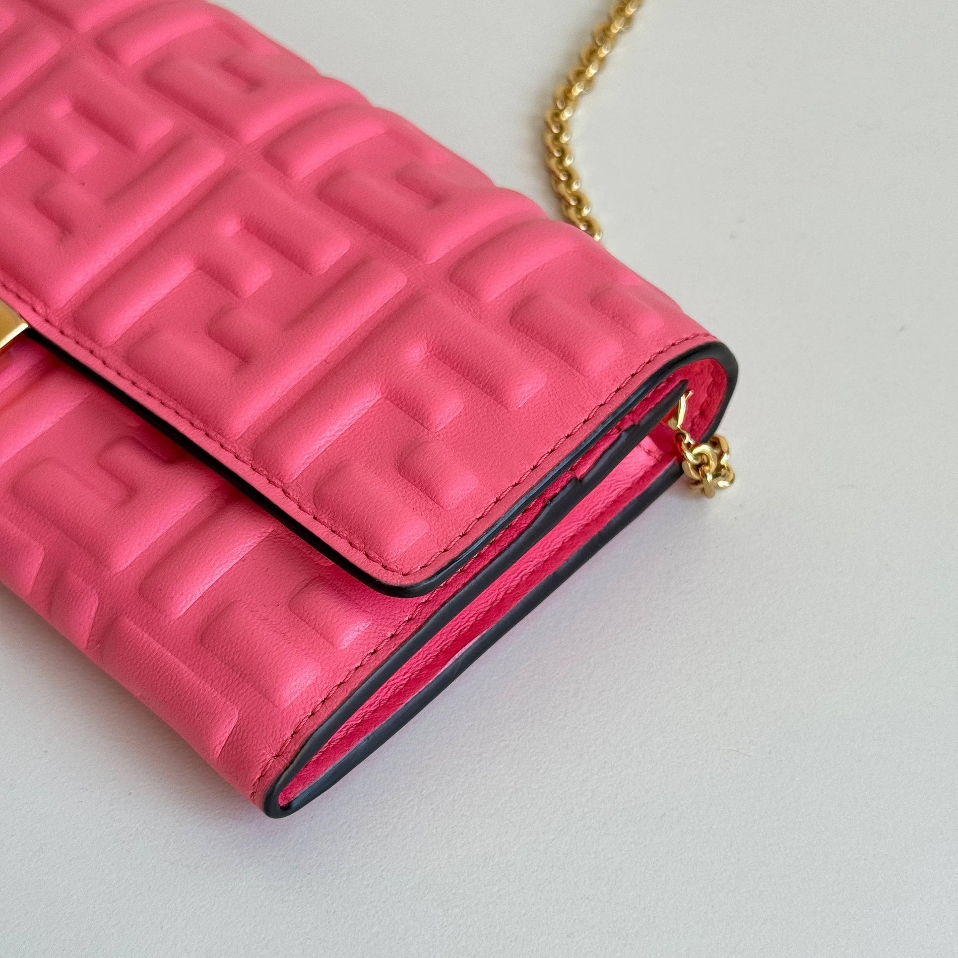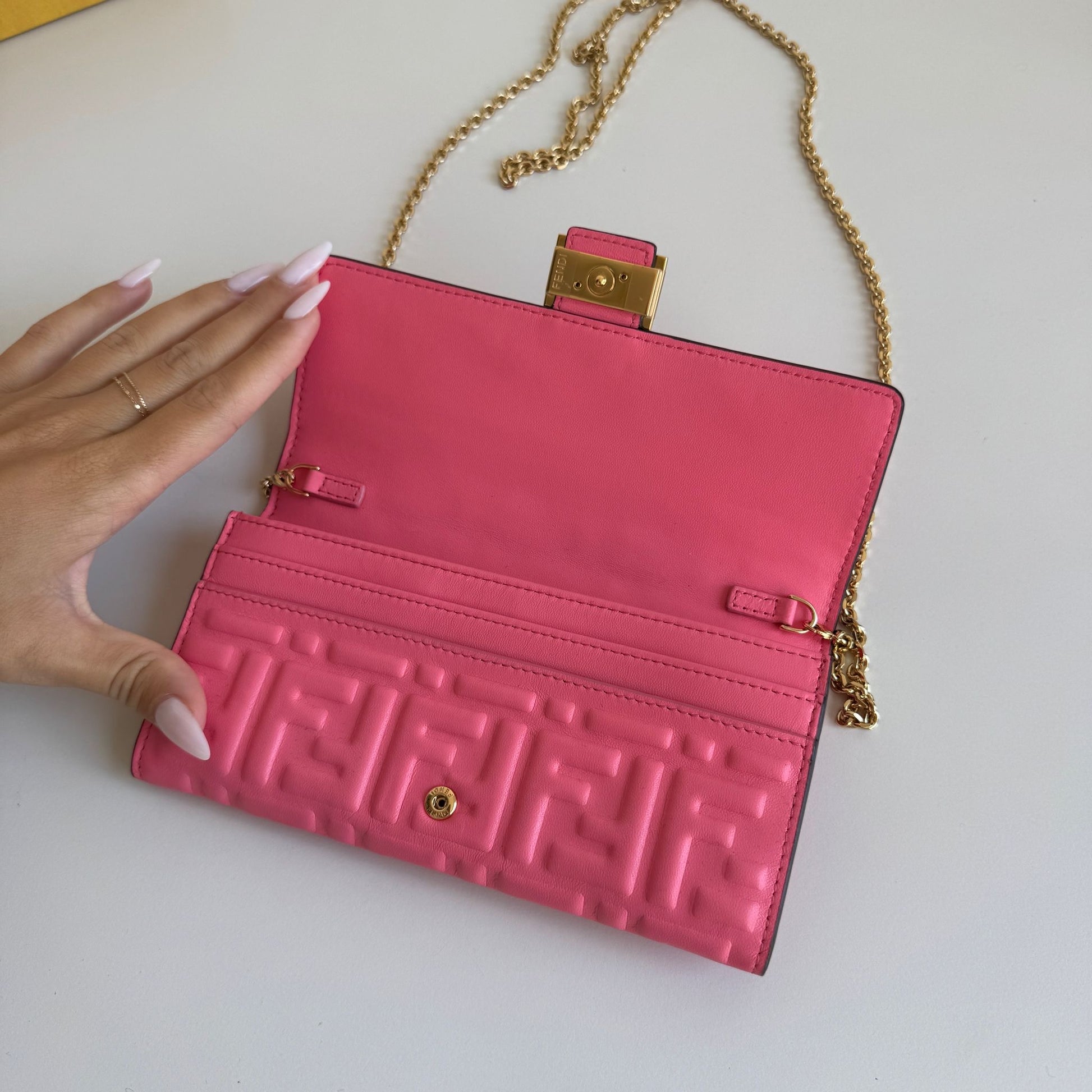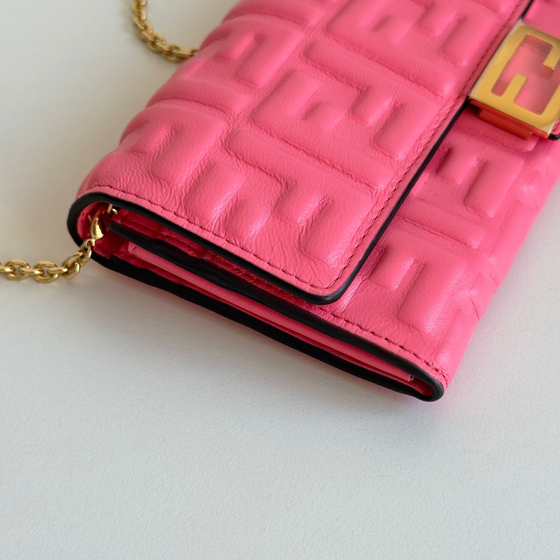 Bellissima mini bag Fendi modello Baguette Continental Wallet in pelle morbida rosa acceso e hardware oro. Si può usare come borsa o come portafoglio grazie alla catena rimovibile e non regolabile.