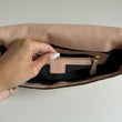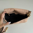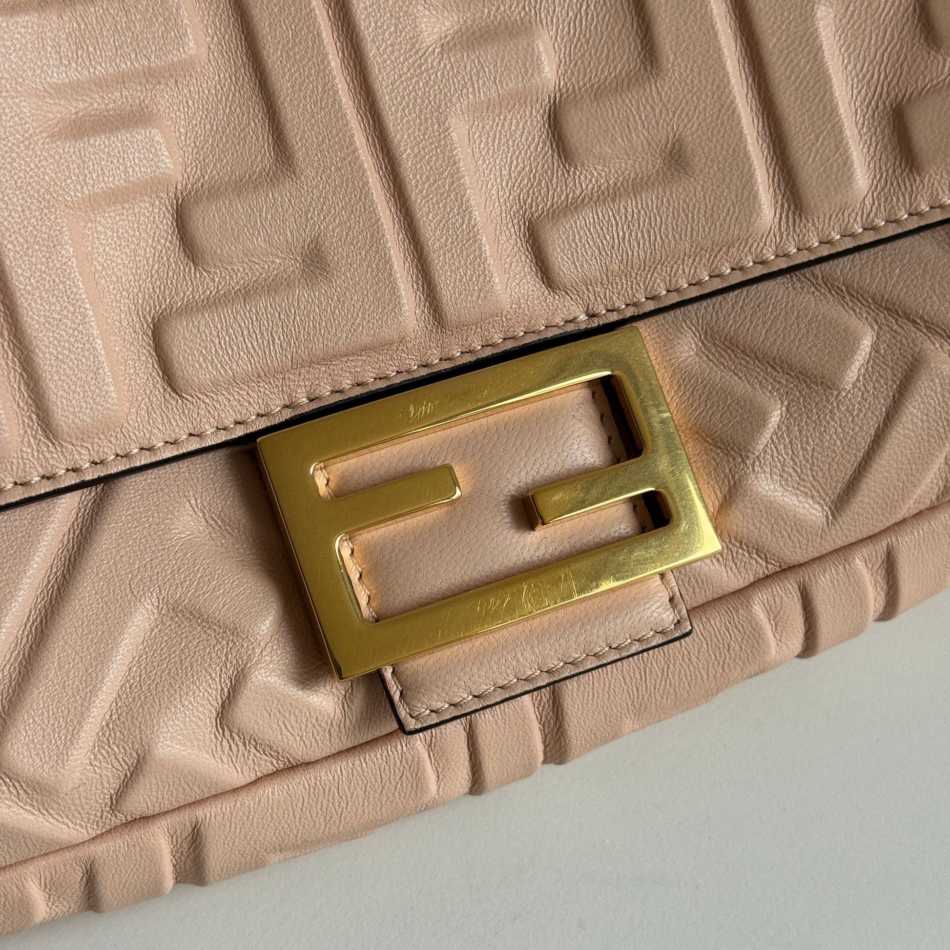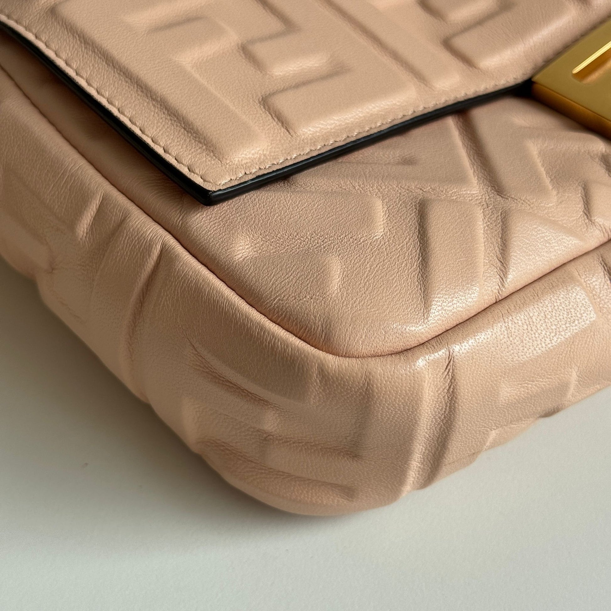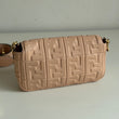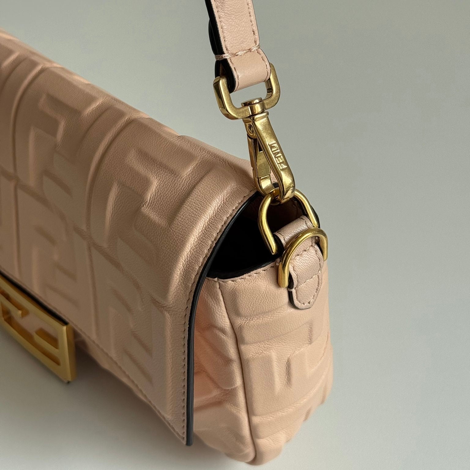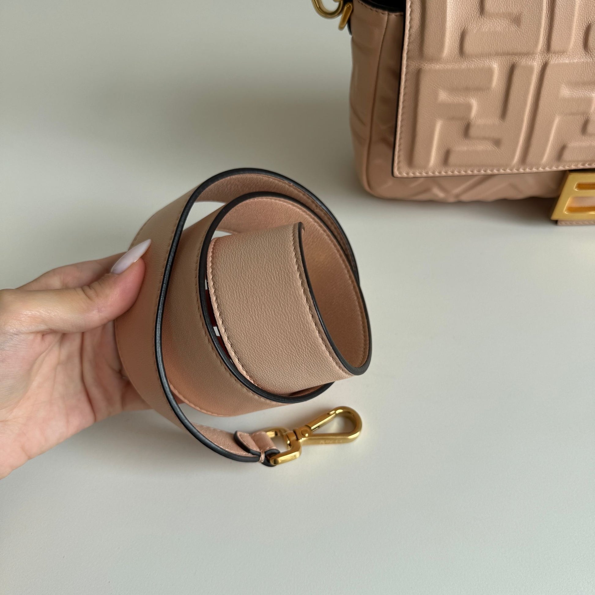 Bellissima borsa Fendi Baguette in pelle rosa cipria e hardware oro. Si indossa a spalla o a tracolla. La tracolla e il manico sono rimovibili.