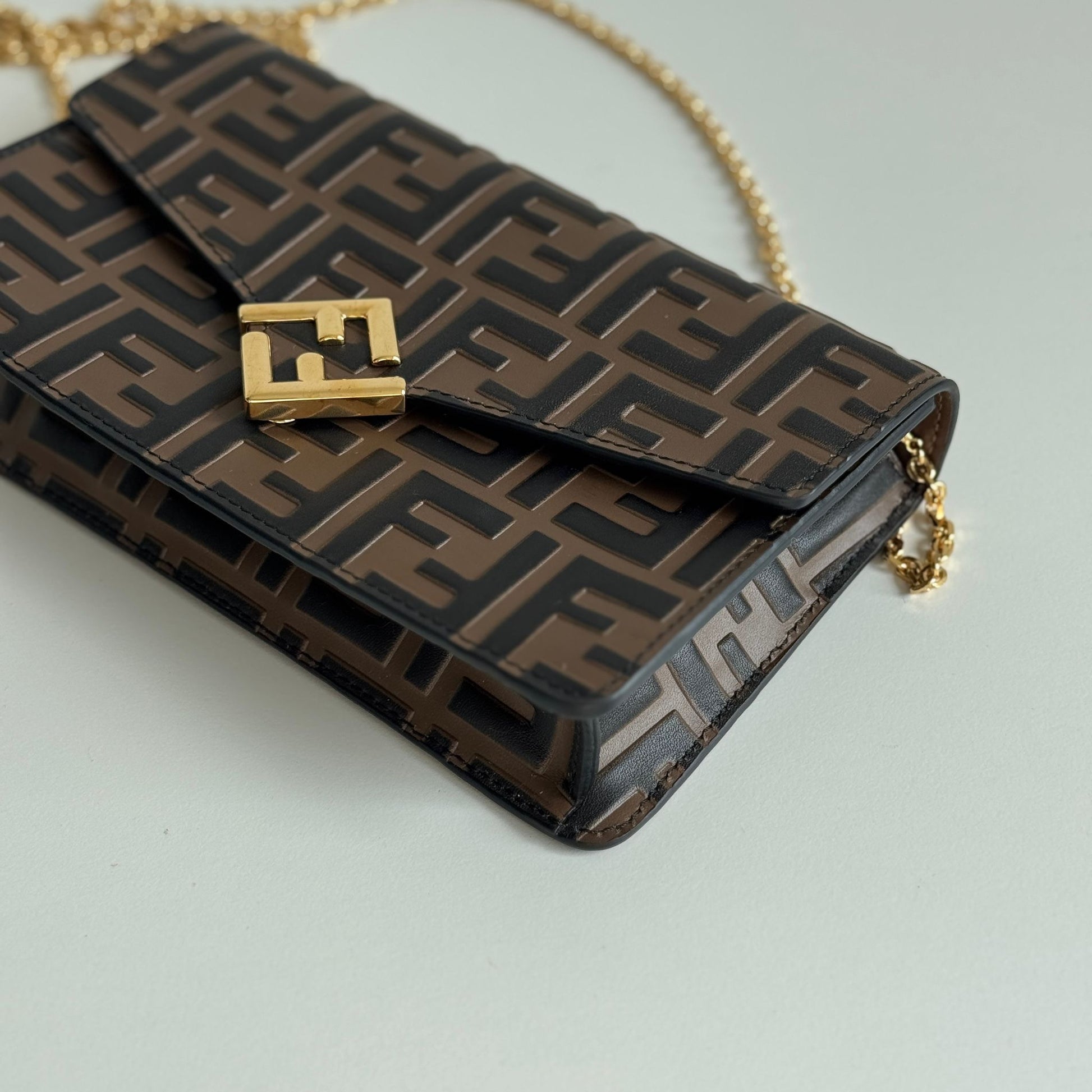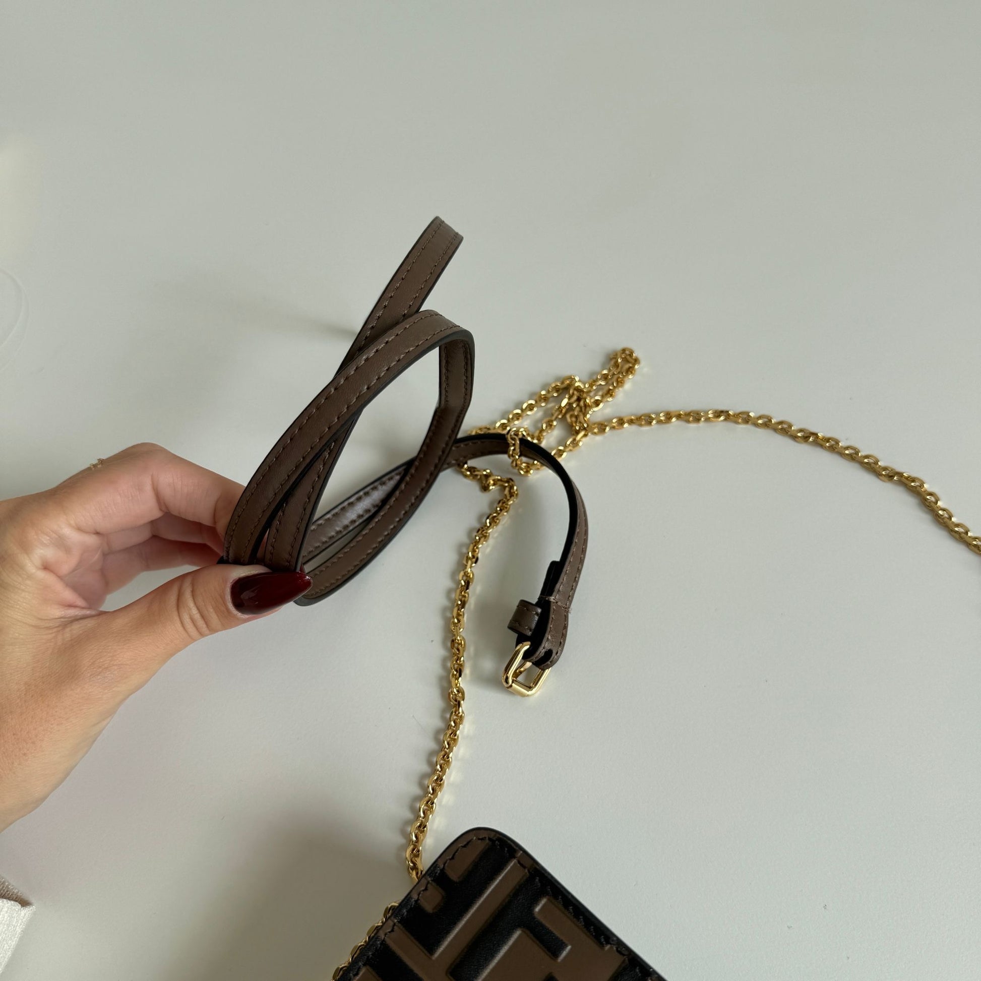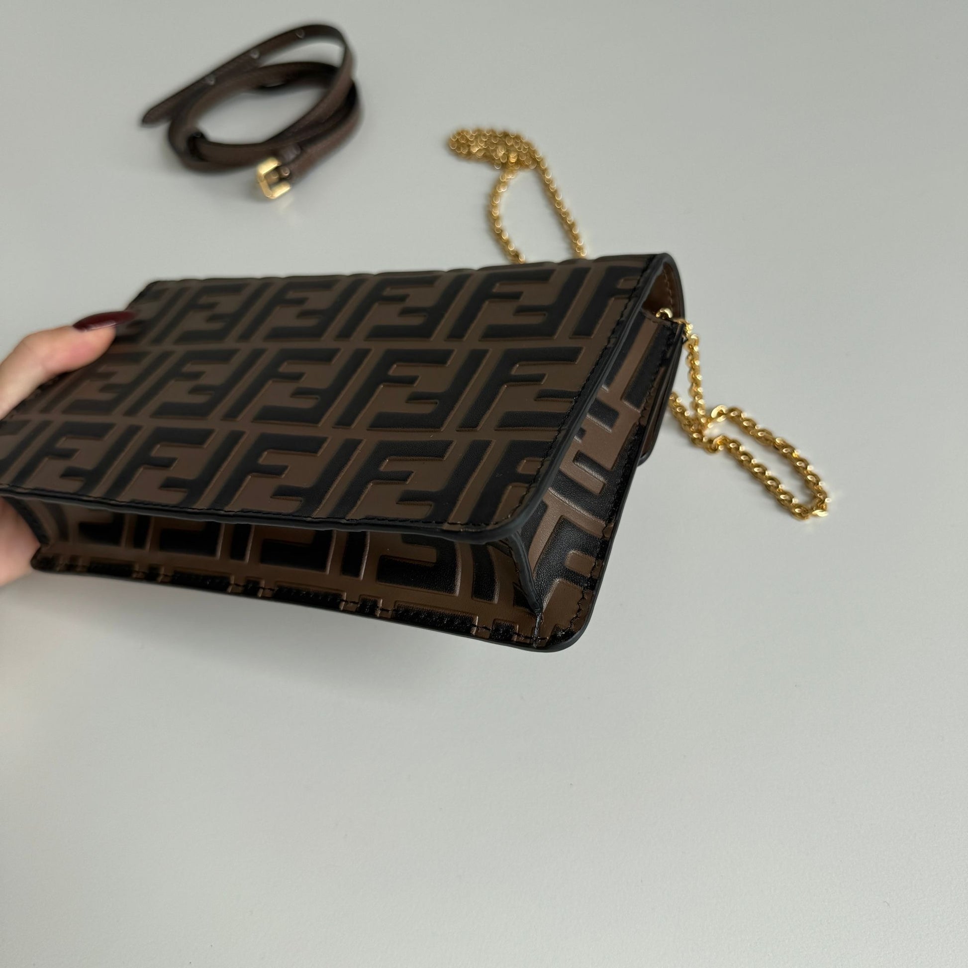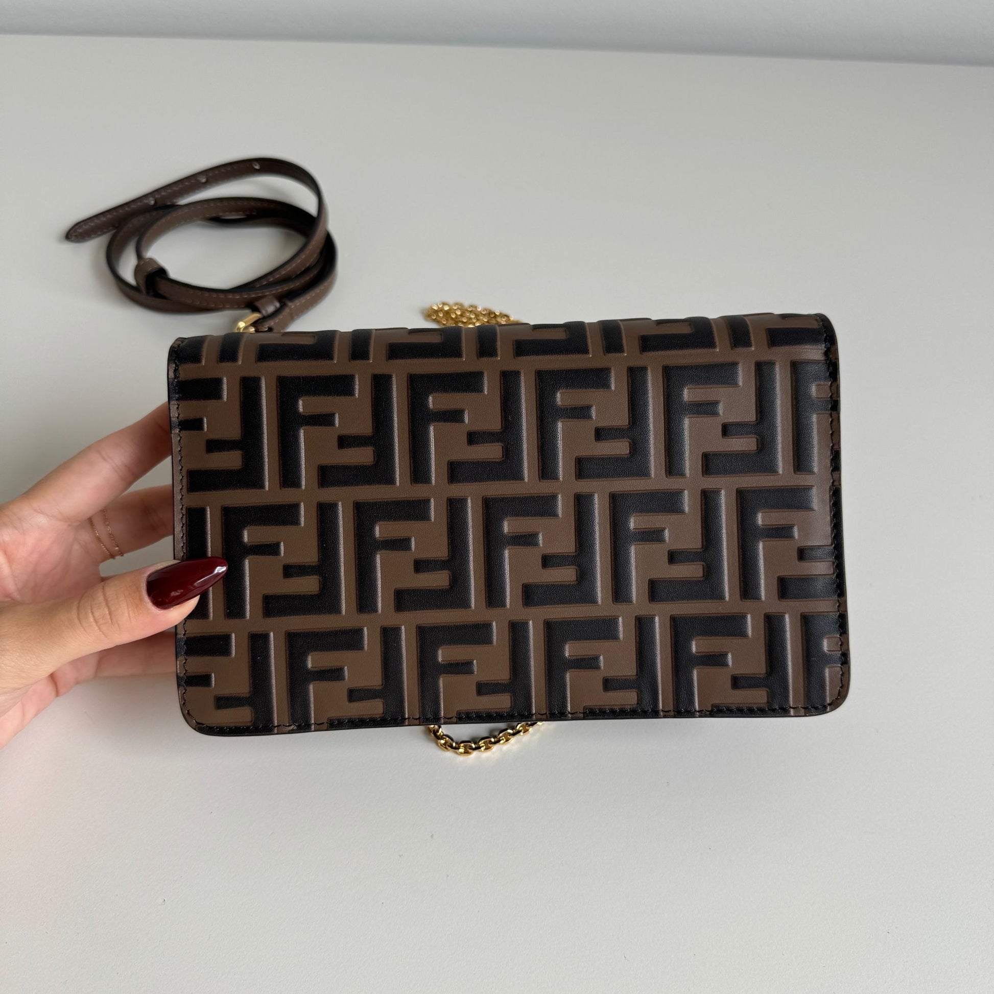 Bellissima pochette Fendi Wallet on Chain in pelle monogram FF marrone e hardware oro. Si indossa a mano o a tracolla: tracolla lunga a catena rimovibile e non regolabile e tracolla corta in pelle rimovibile e regolabile.