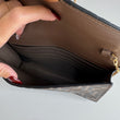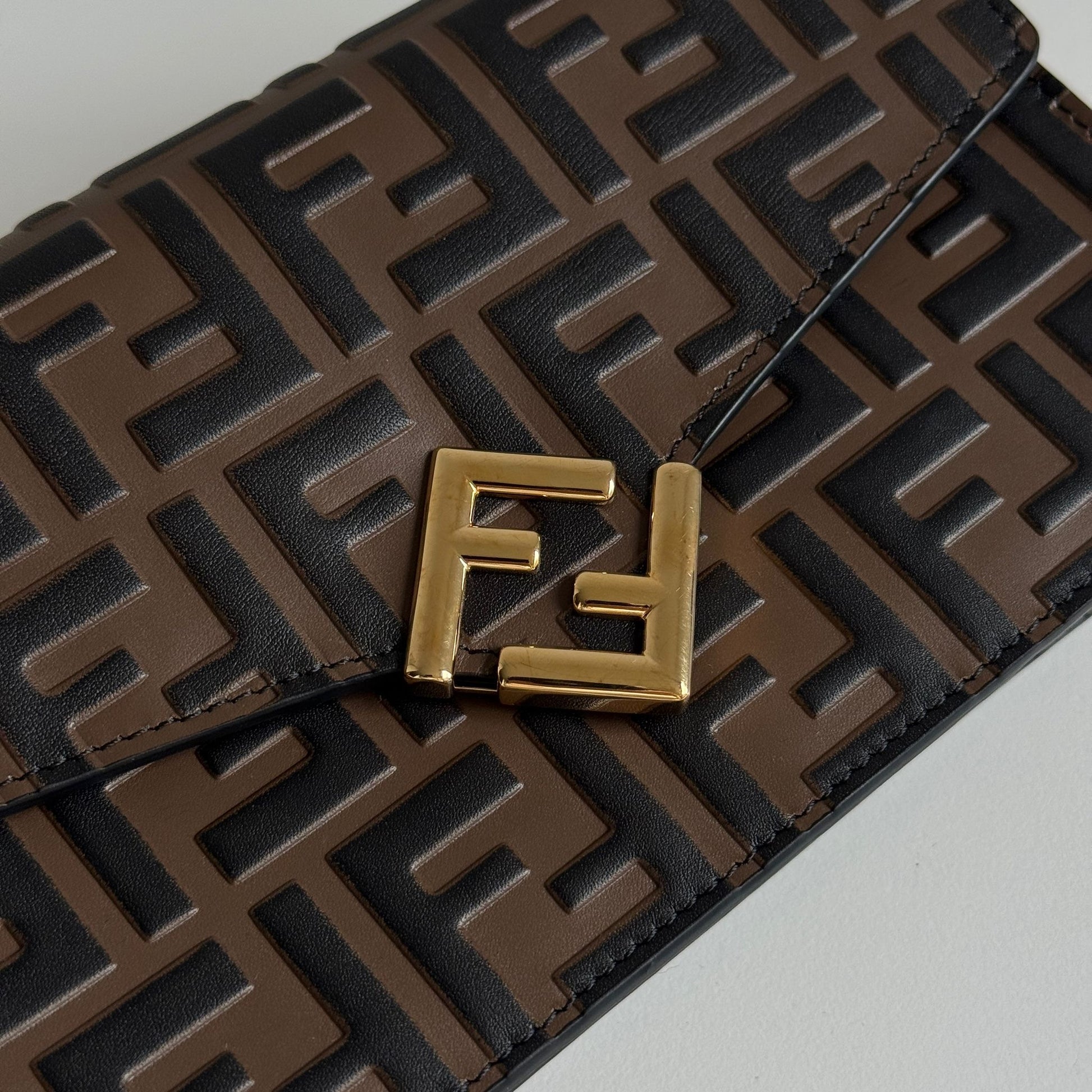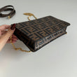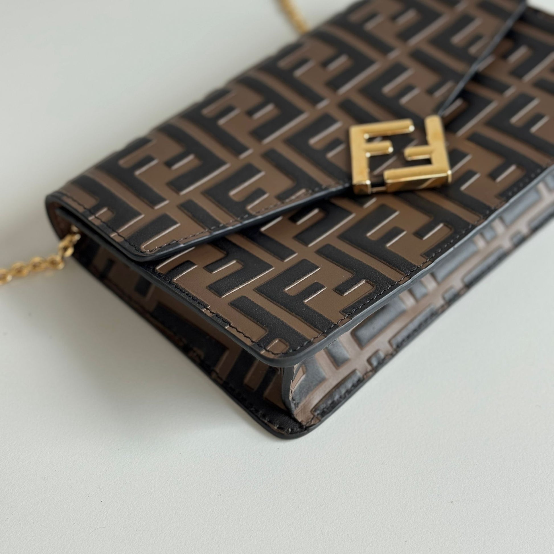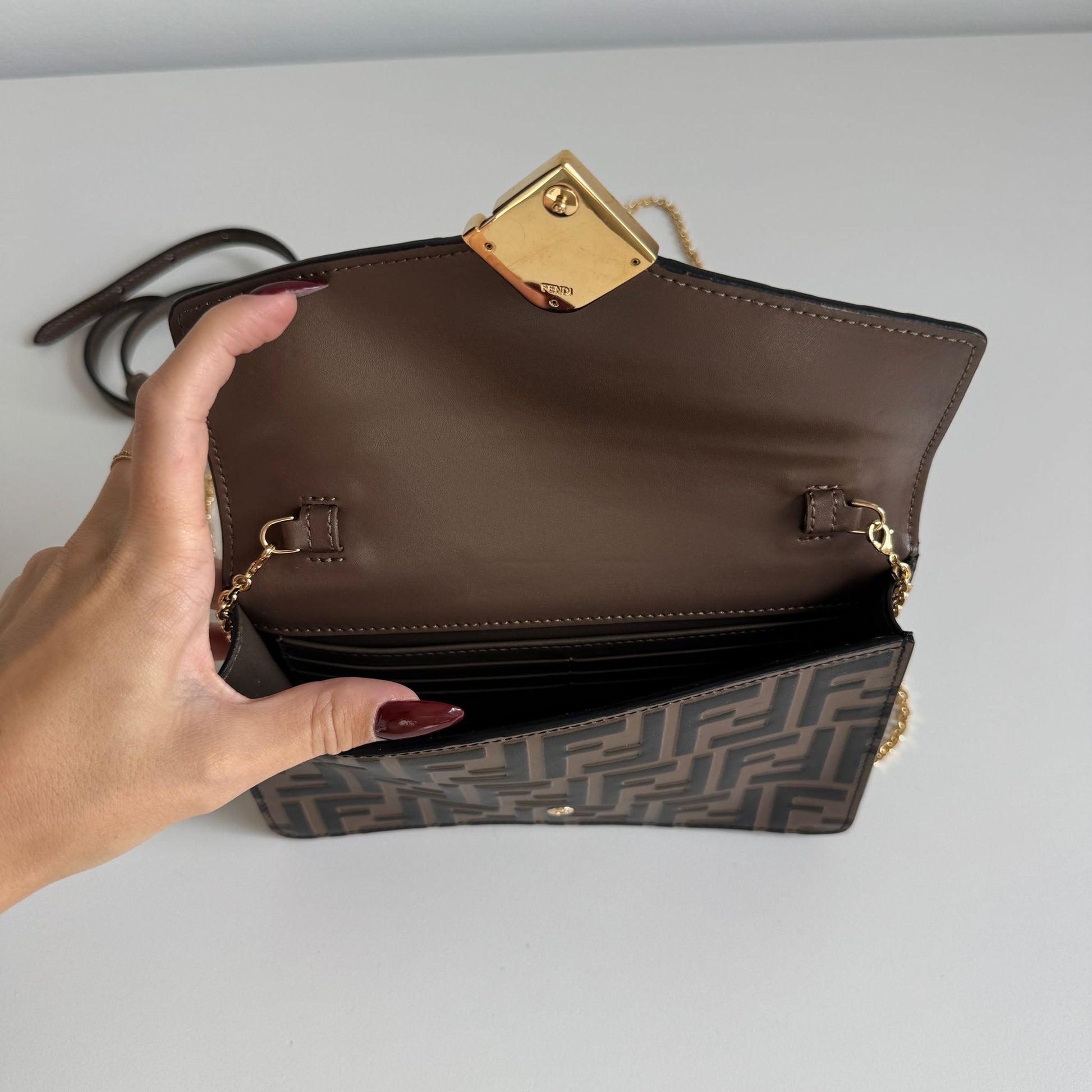 Bellissima pochette Fendi Wallet on Chain in pelle monogram FF marrone e hardware oro. Si indossa a mano o a tracolla: tracolla lunga a catena rimovibile e non regolabile e tracolla corta in pelle rimovibile e regolabile.
