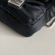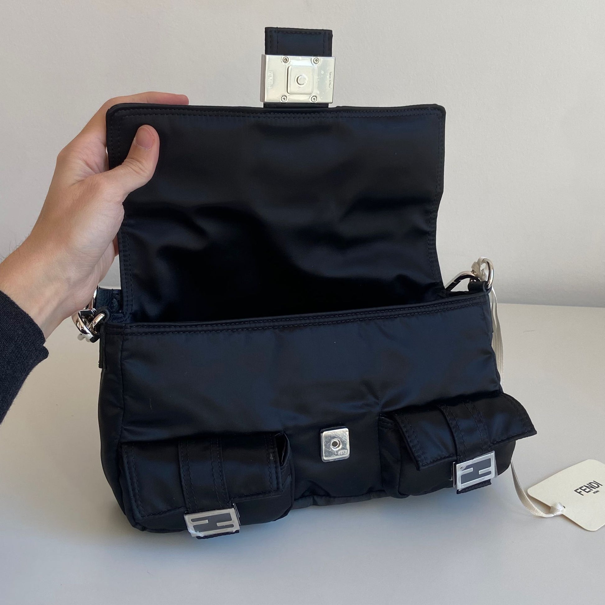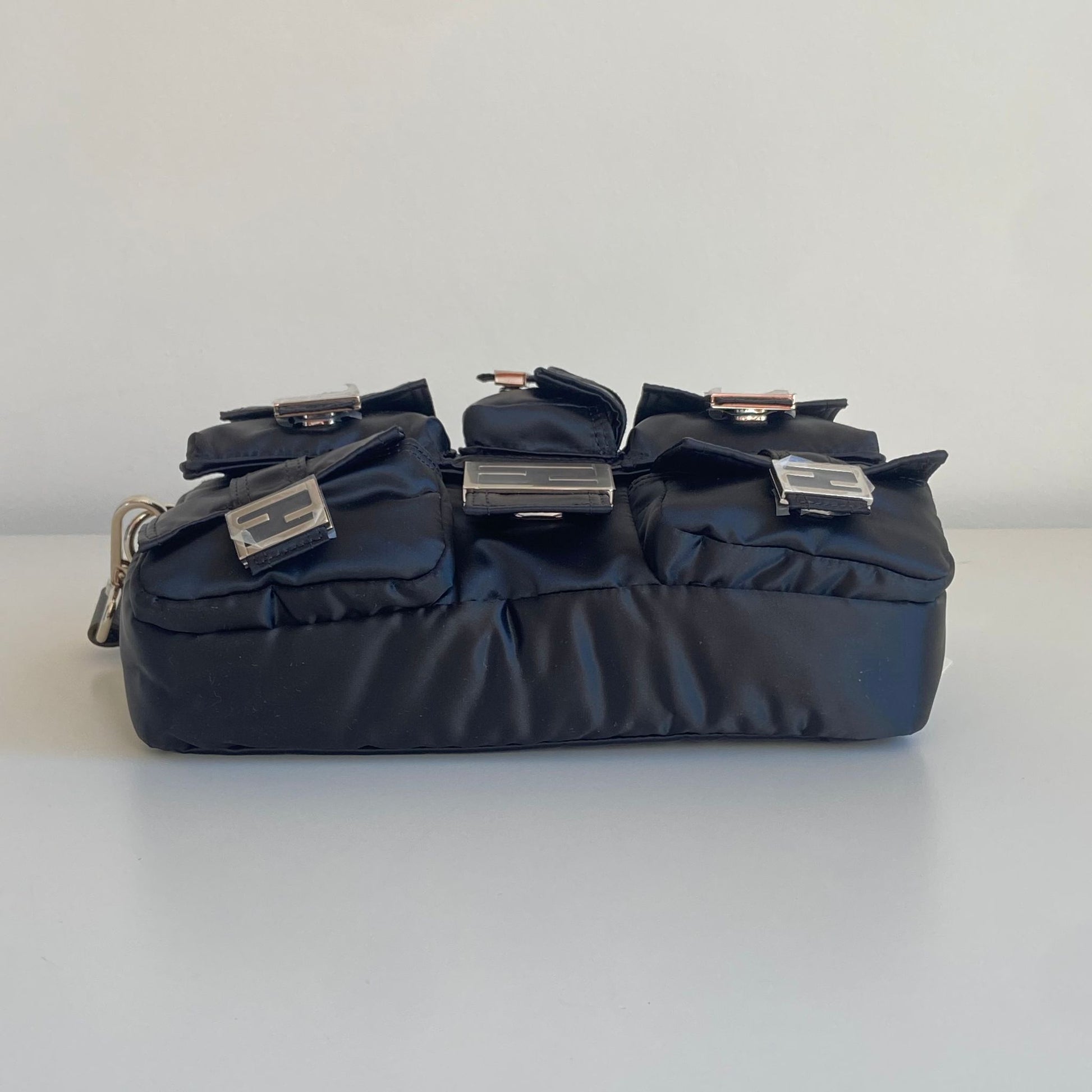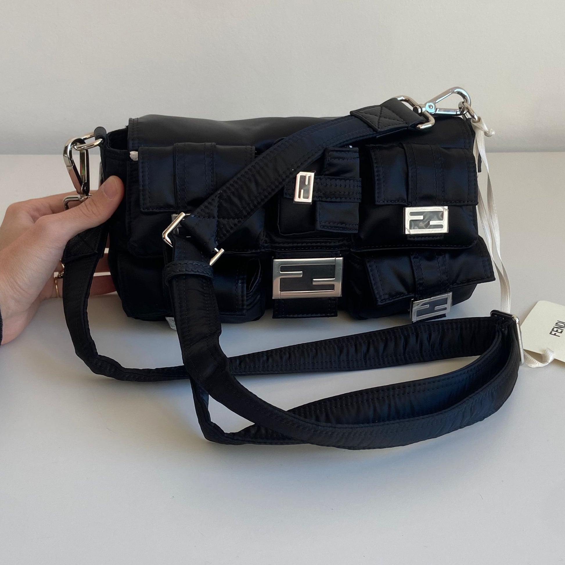 Iconica Fendi modello Baguette in nylon nero multipocket e hardware argento. Si indossa a spalla, a tracolla e come marsupio, grazie ai tre spallacci regolabili e rimovibili.