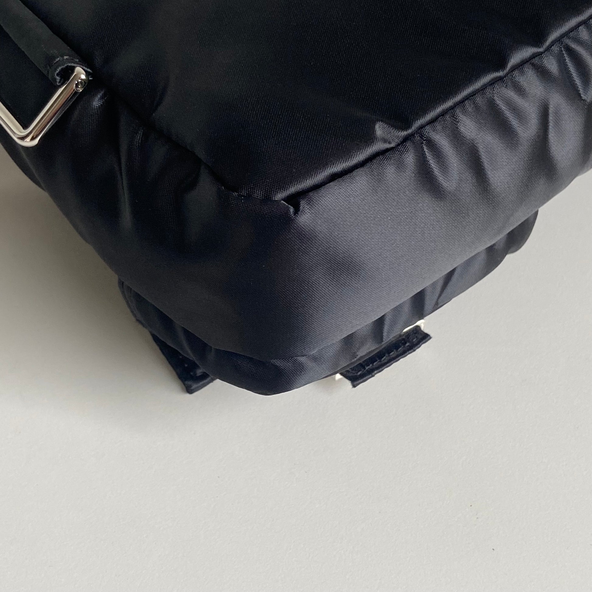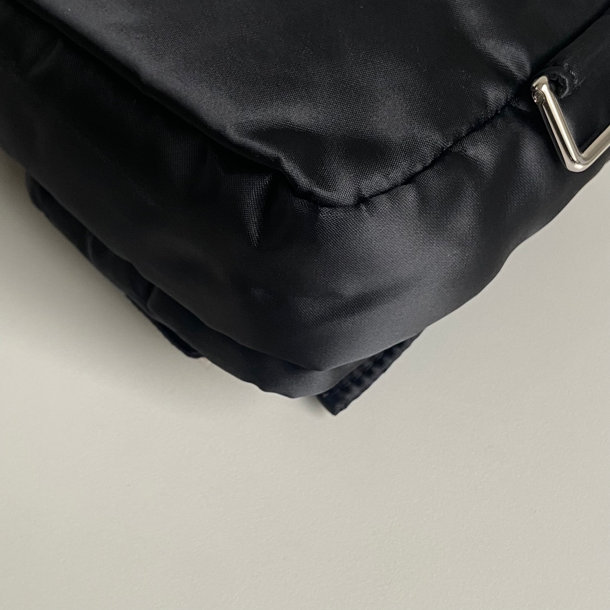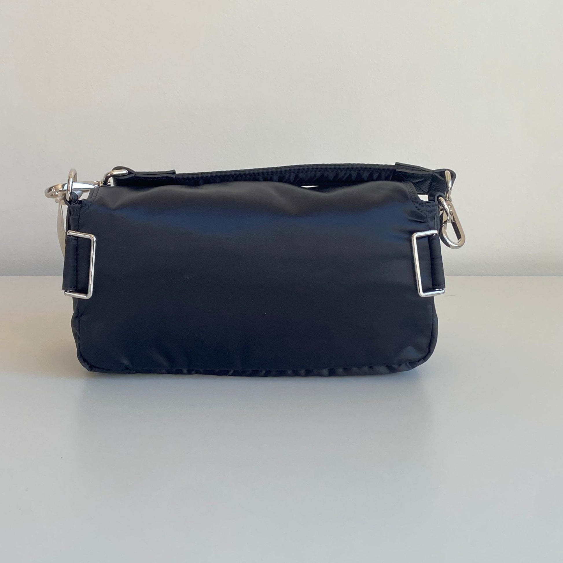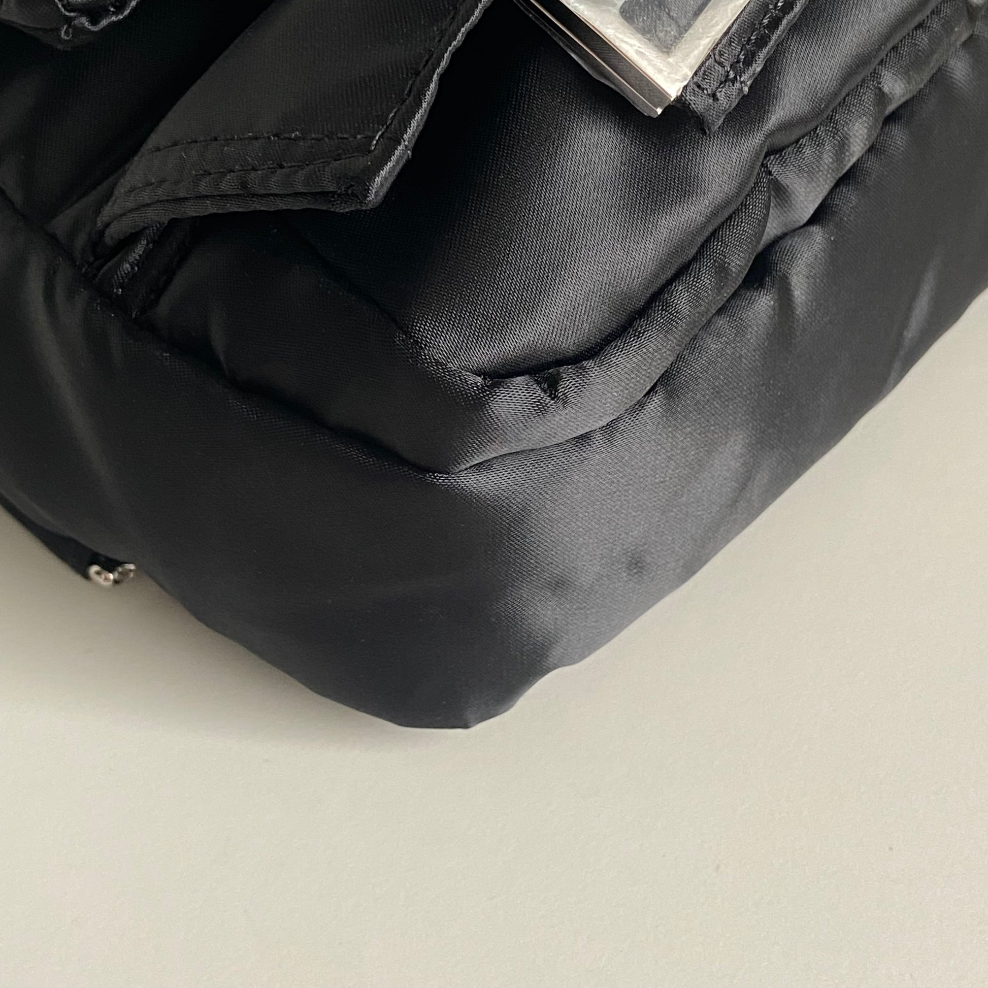Iconica Fendi modello Baguette in nylon nero multipocket e hardware argento. Si indossa a spalla, a tracolla e come marsupio, grazie ai tre spallacci regolabili e rimovibili.