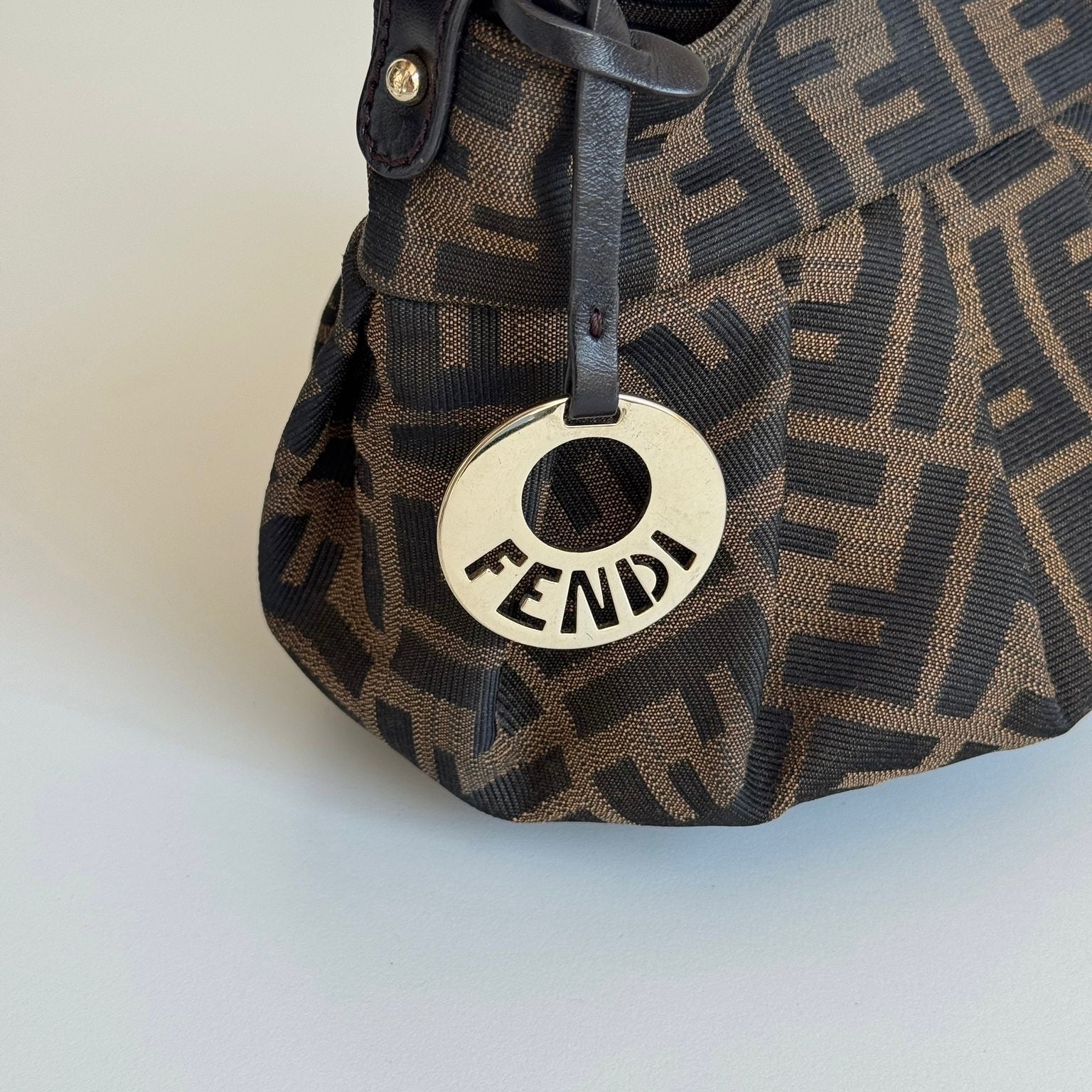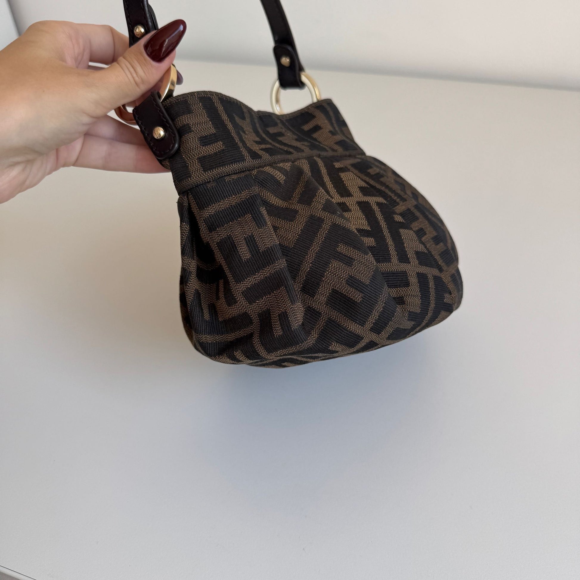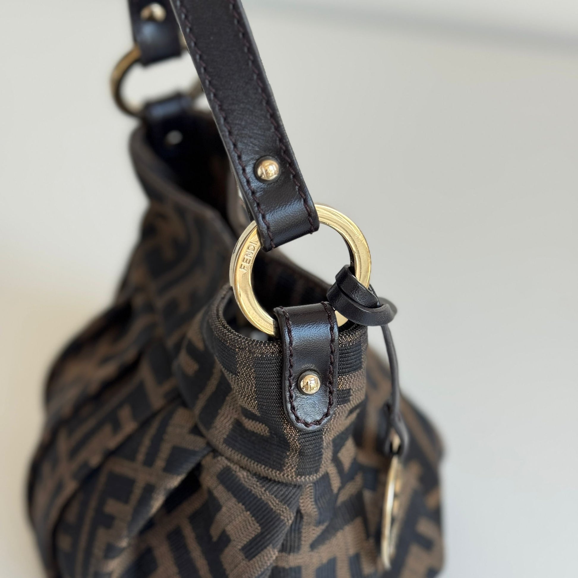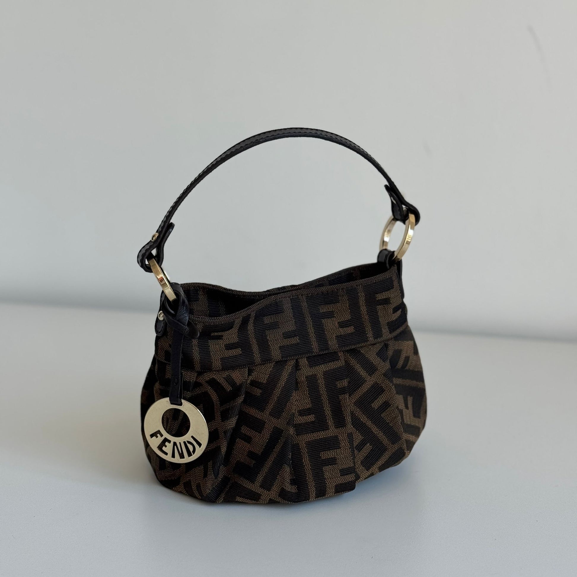 Magnifica borsa Fendi modello Chef in tela monogram FF marrone, dettagli in pelle e hardware oro. Si indossa a mano.