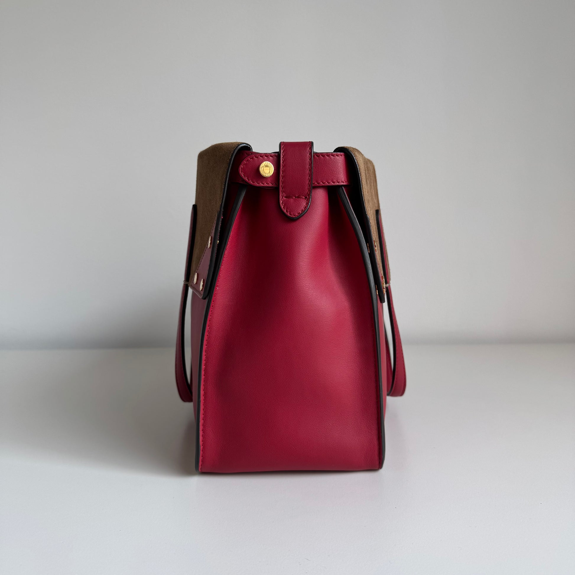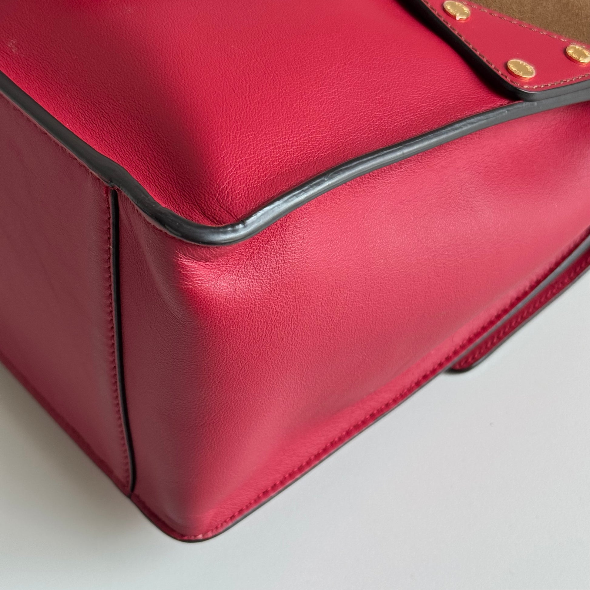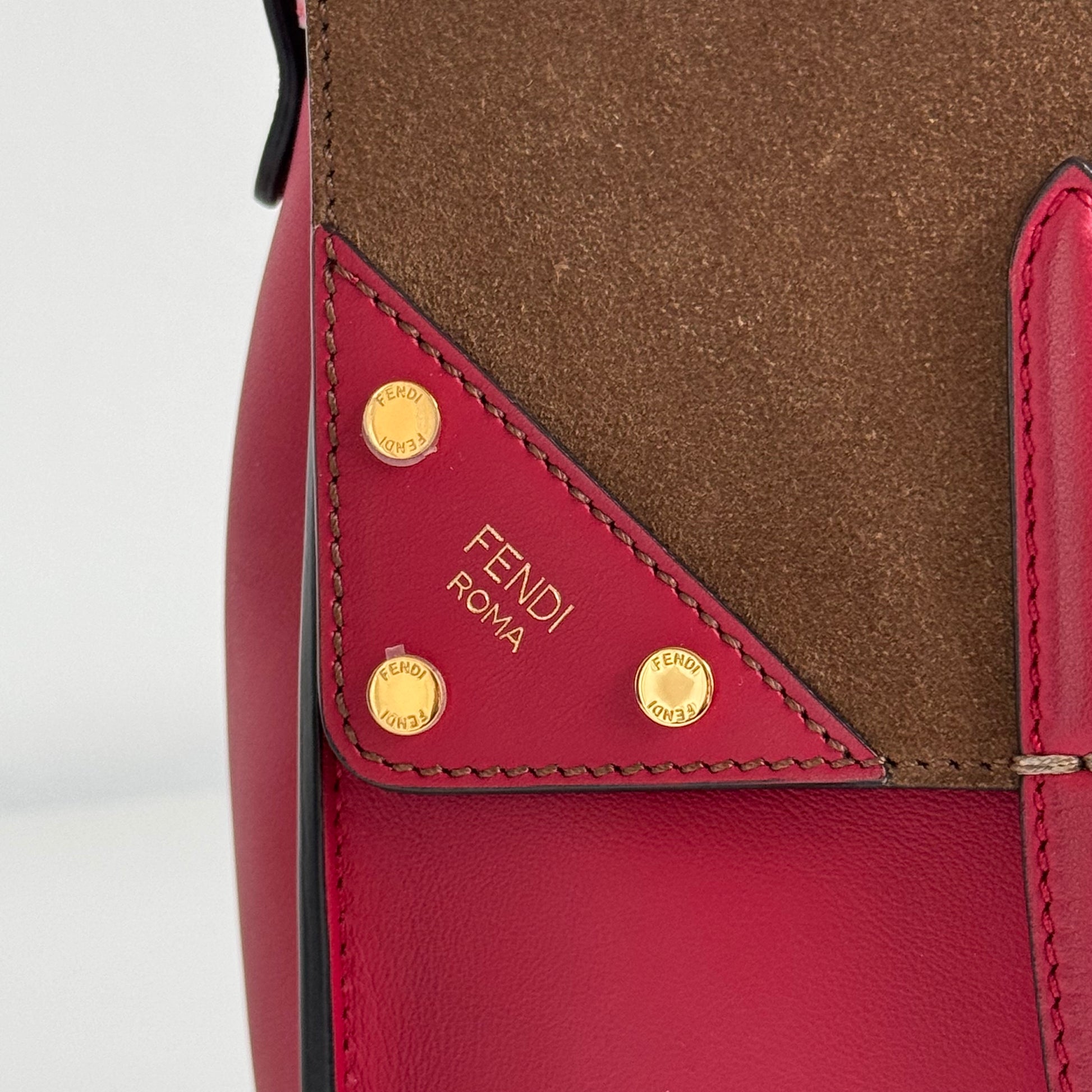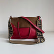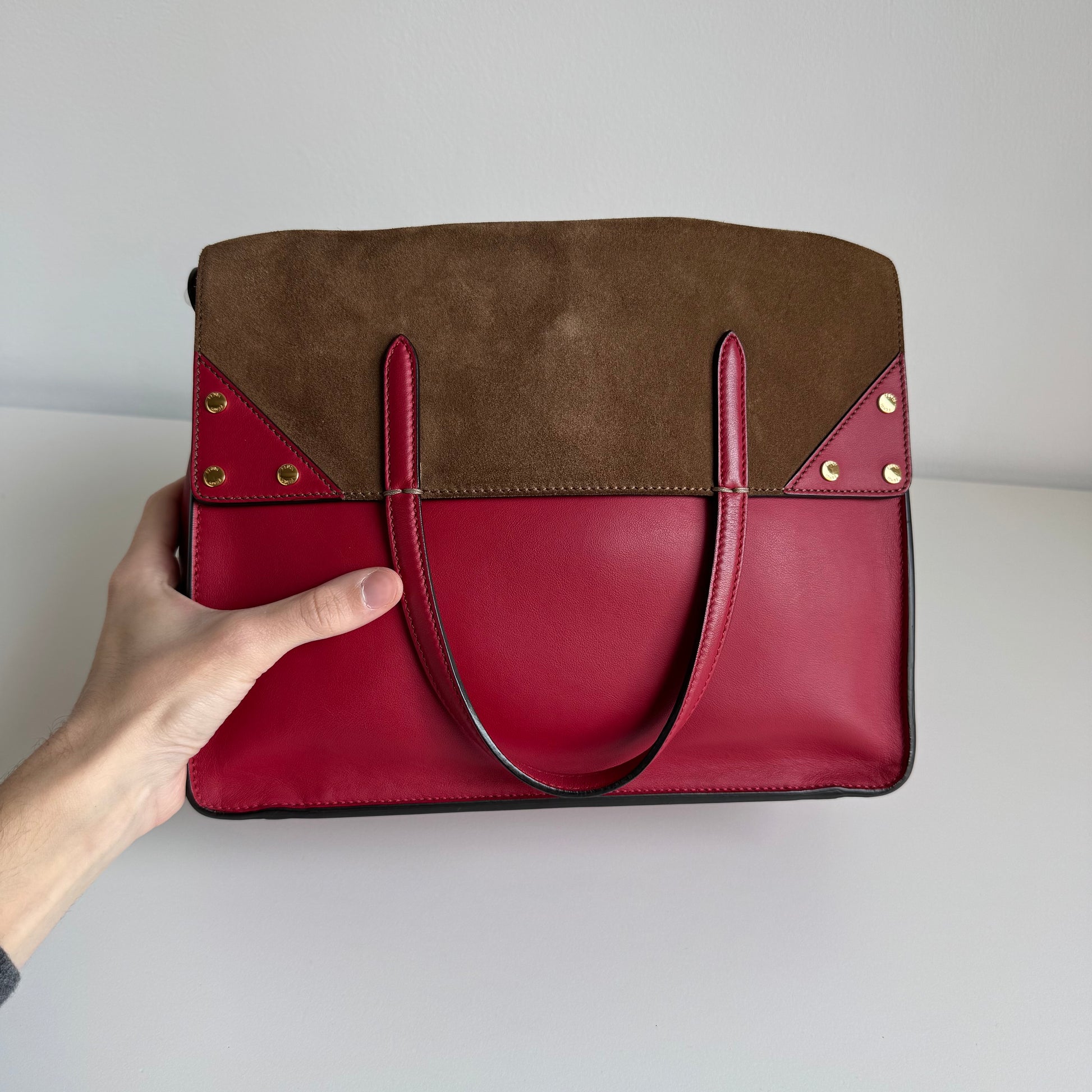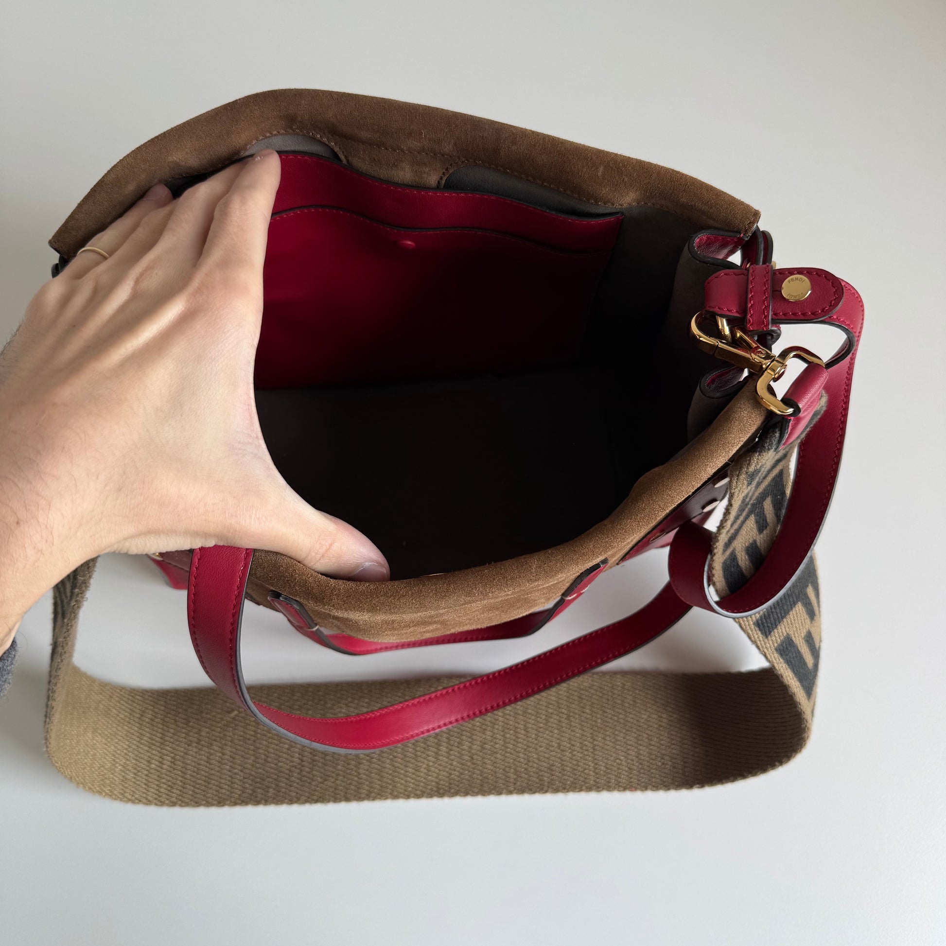 Stupenda borsa Fendi modello Flip in morbidissima pelle liscia rossa con “piega” in pelle scamosciata marrone e hardware oro. Si indossa a mano e ha una doppia tracolla: una in pelle e l’altra in tela FF morbida.