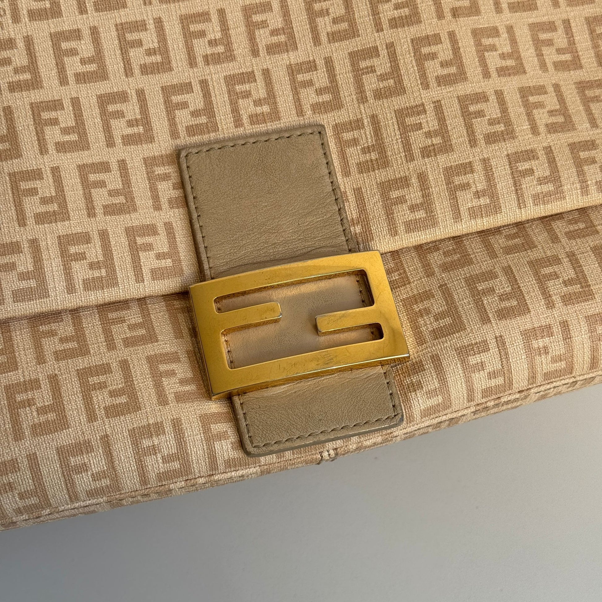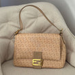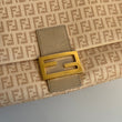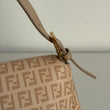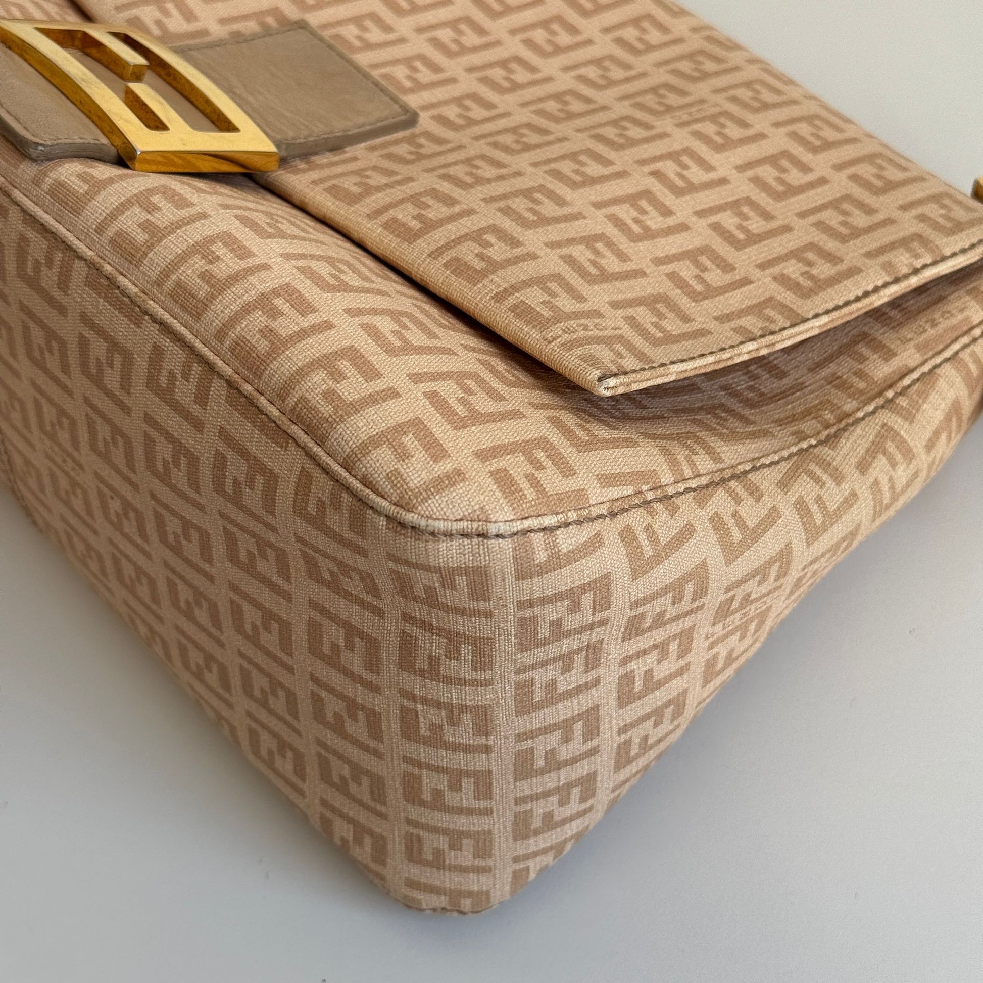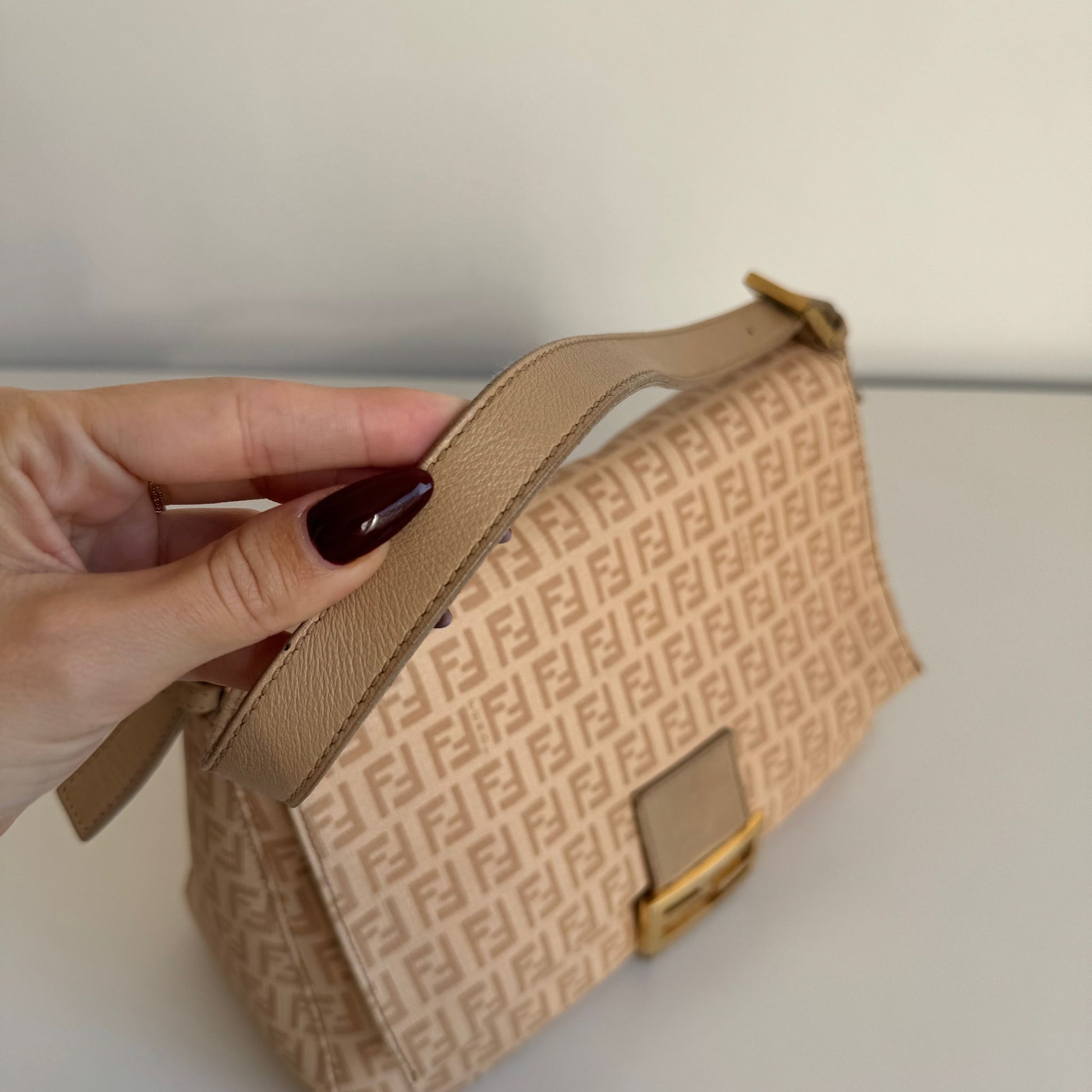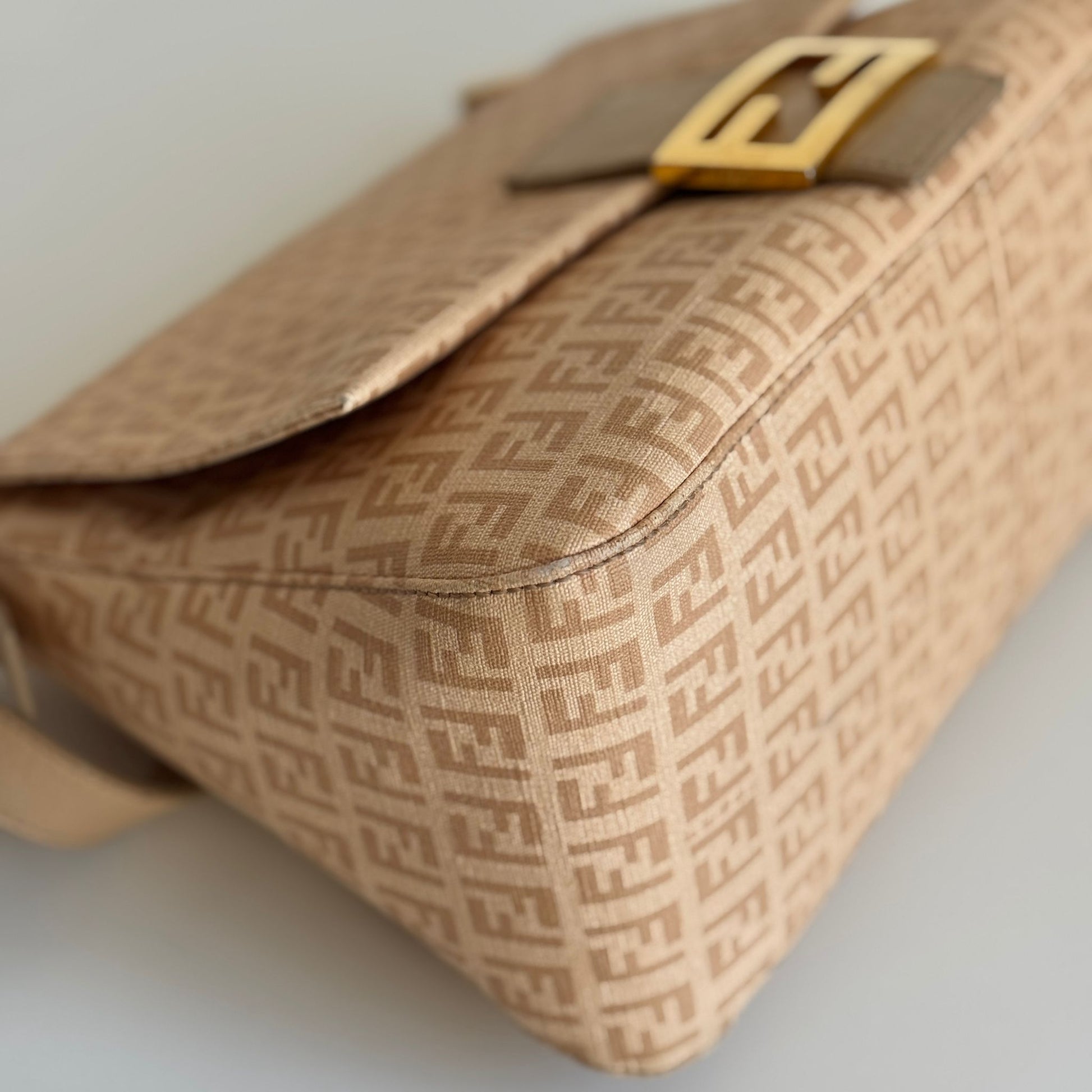 Magnifica borsa Fendi modello Mama Baguette in tela cerata zucchino rosa e inserti in pelle rosa con hardware oro. Si indossa a spalla, il manico è regolabile.