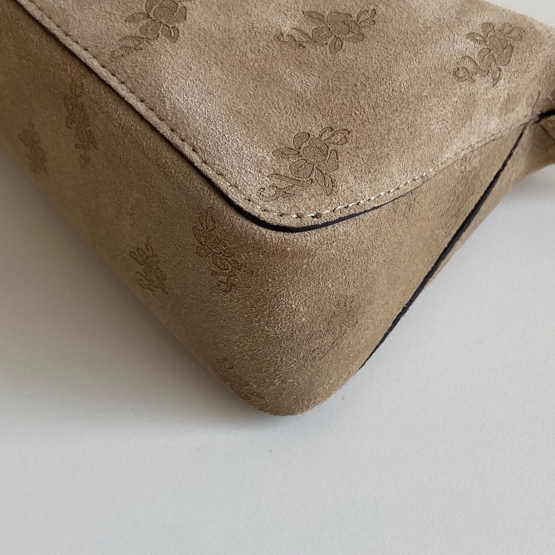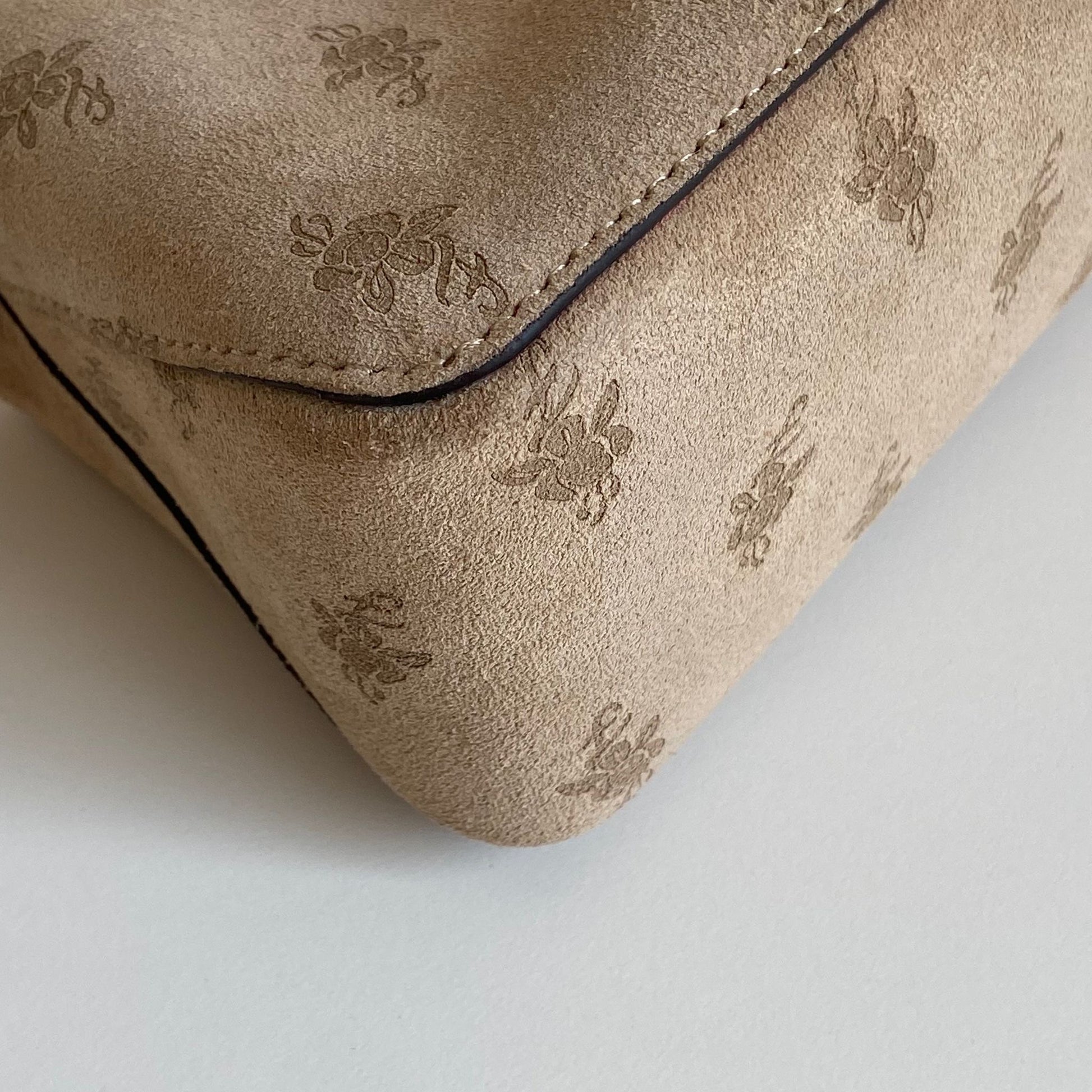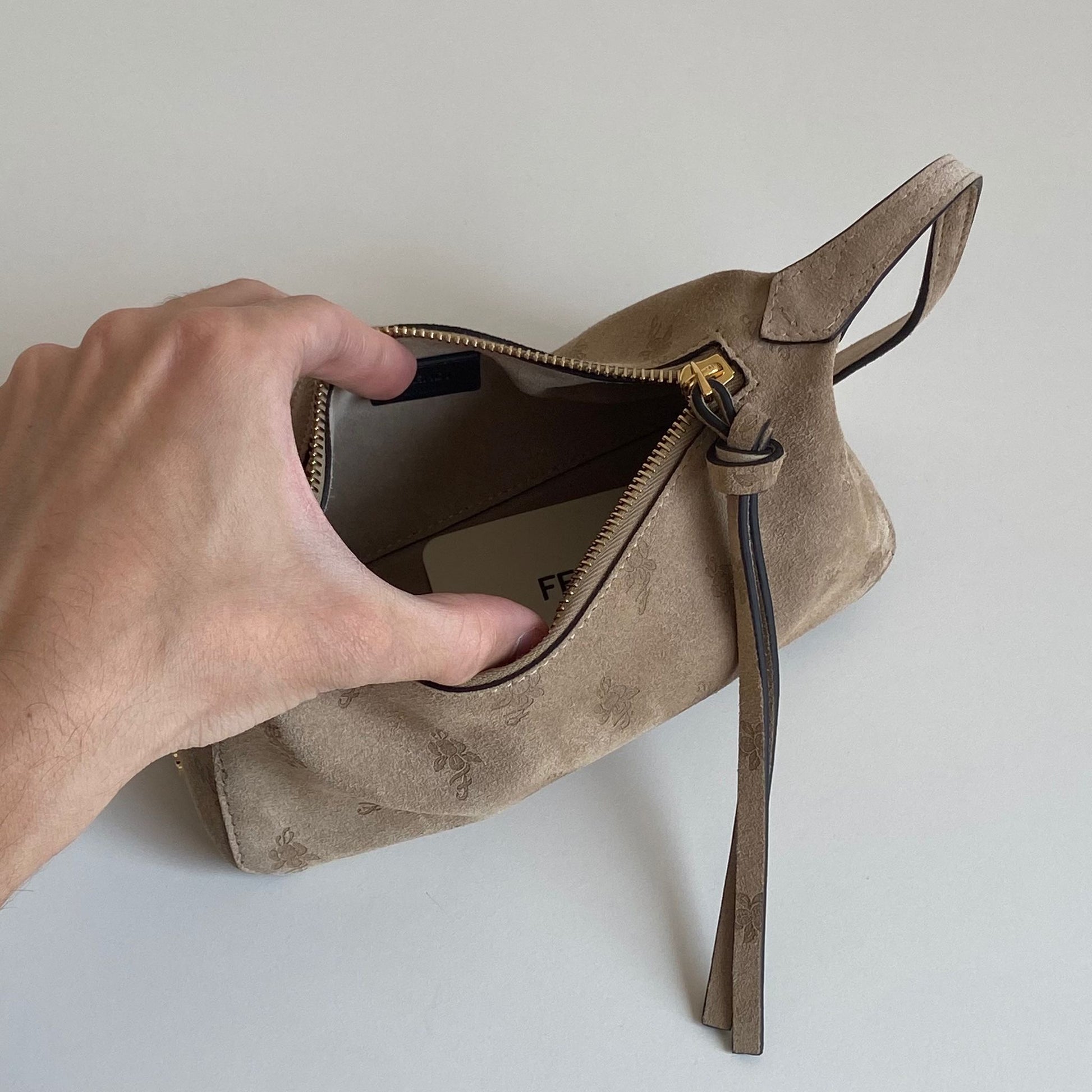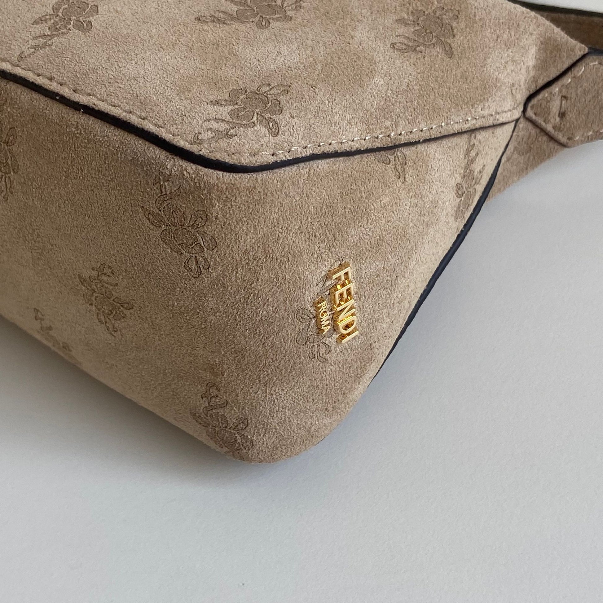 Meravigliosa mini bag Fendi in pelle suede beige con decorazioni logo laser e hardware oro. Si indossa a spalla.