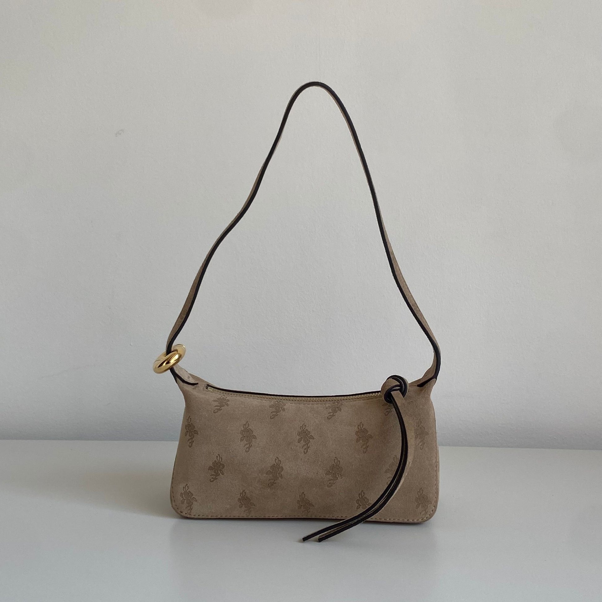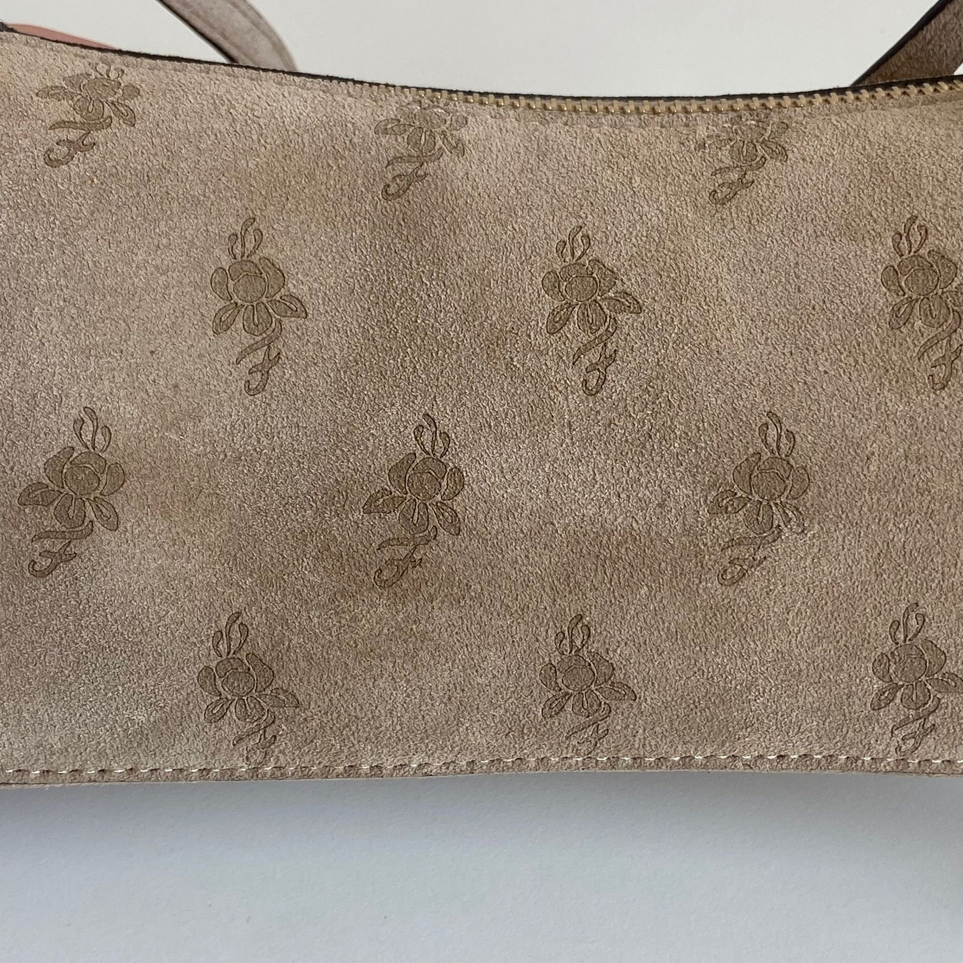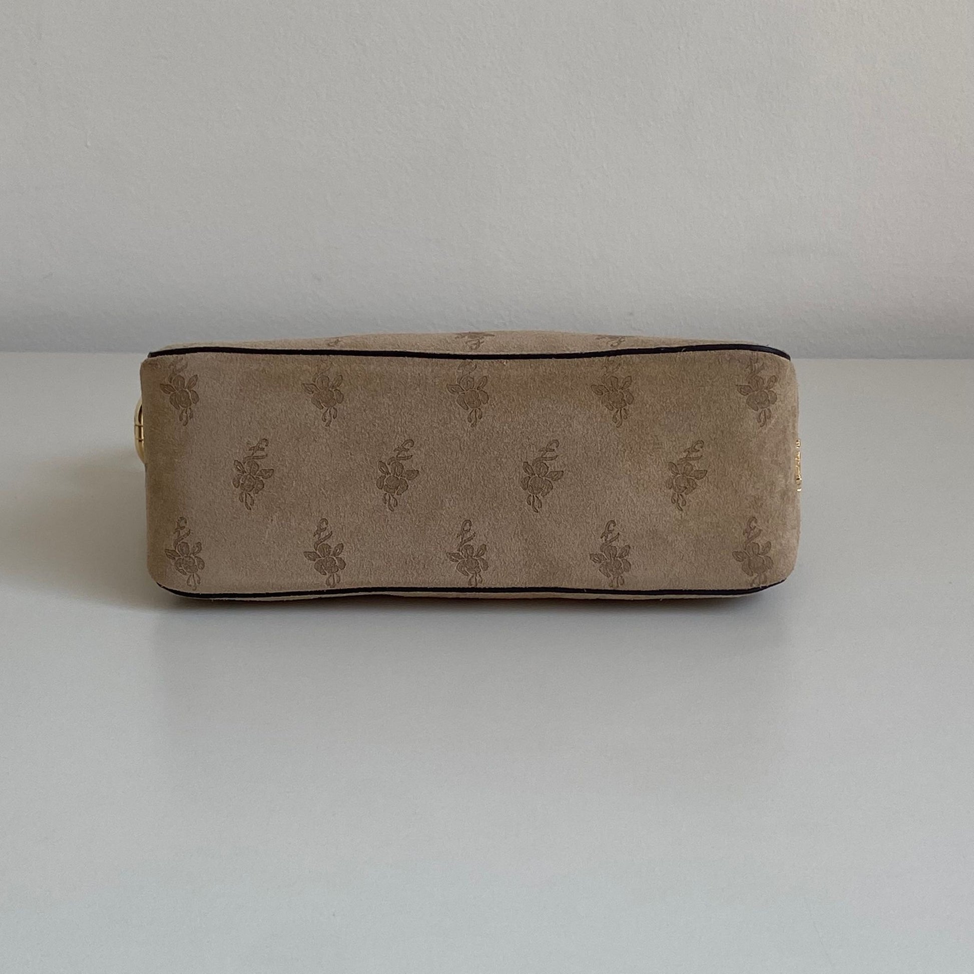 Meravigliosa mini bag Fendi in pelle suede beige con decorazioni logo laser e hardware oro. Si indossa a spalla.