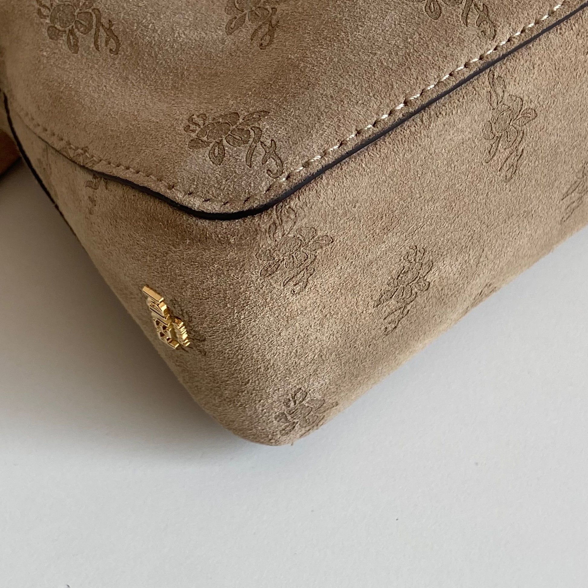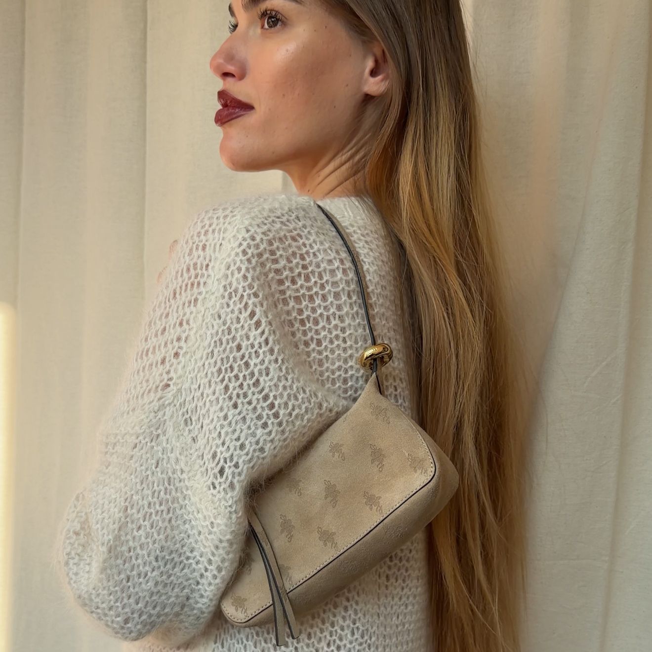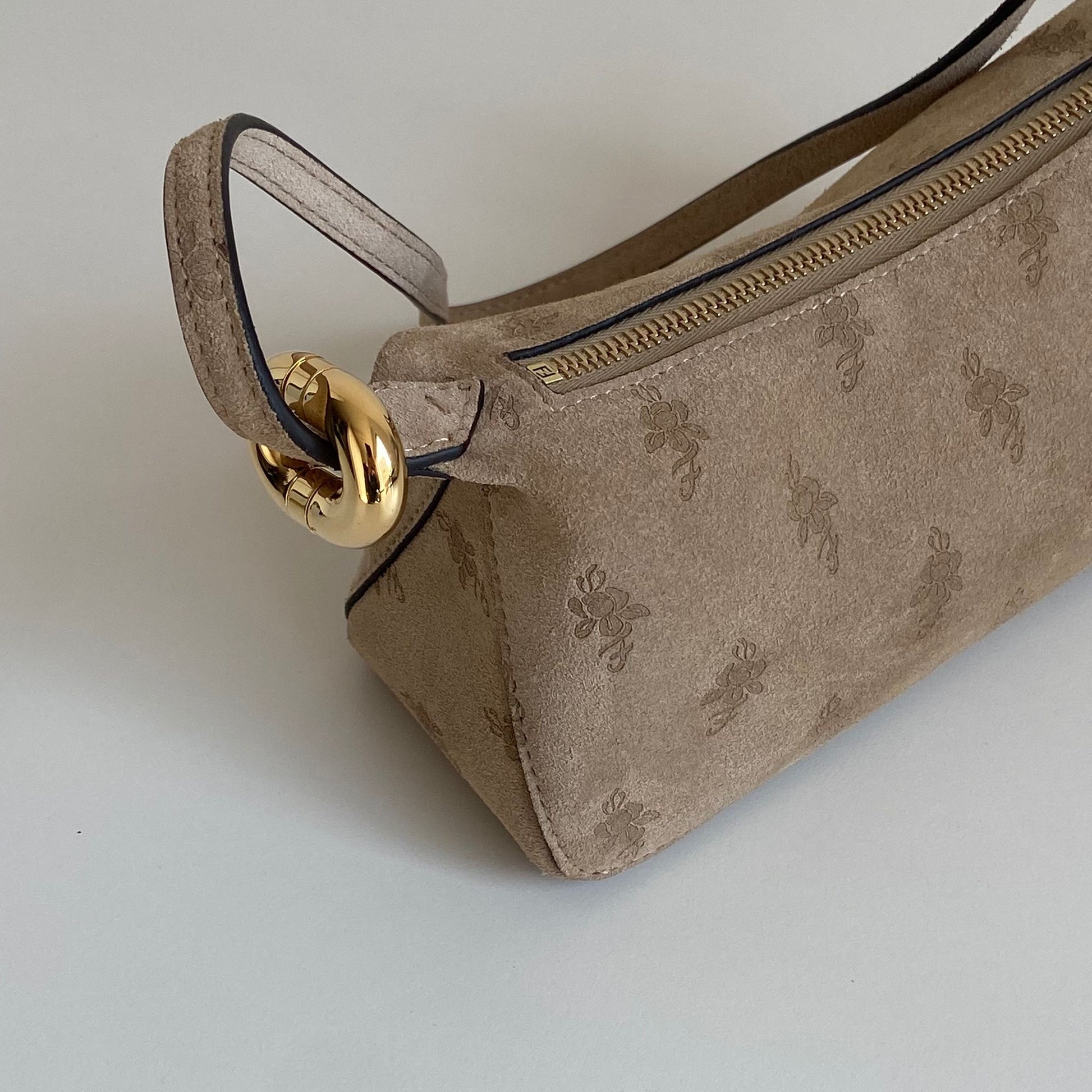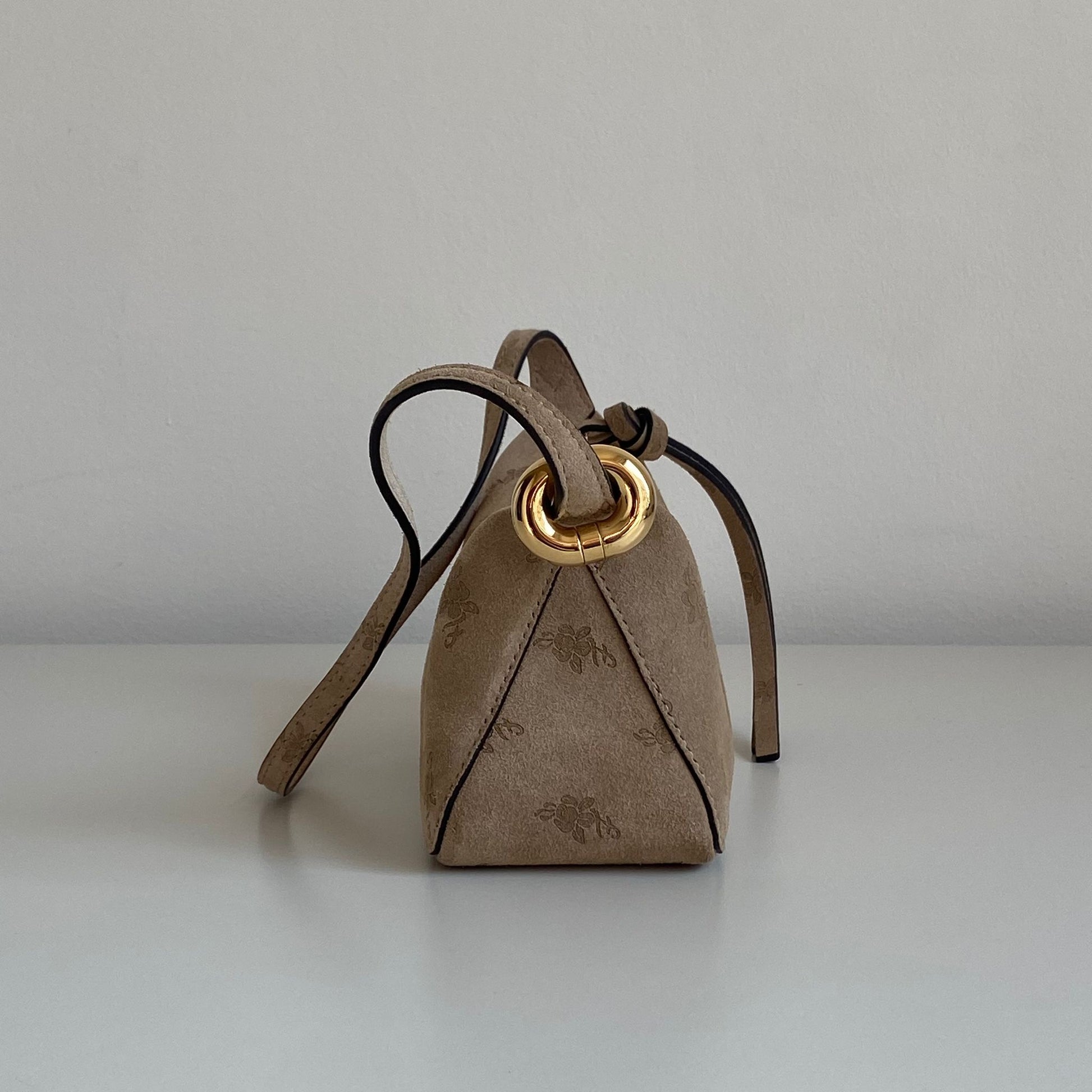 Meravigliosa mini bag Fendi in pelle suede beige con decorazioni logo laser e hardware oro. Si indossa a spalla.