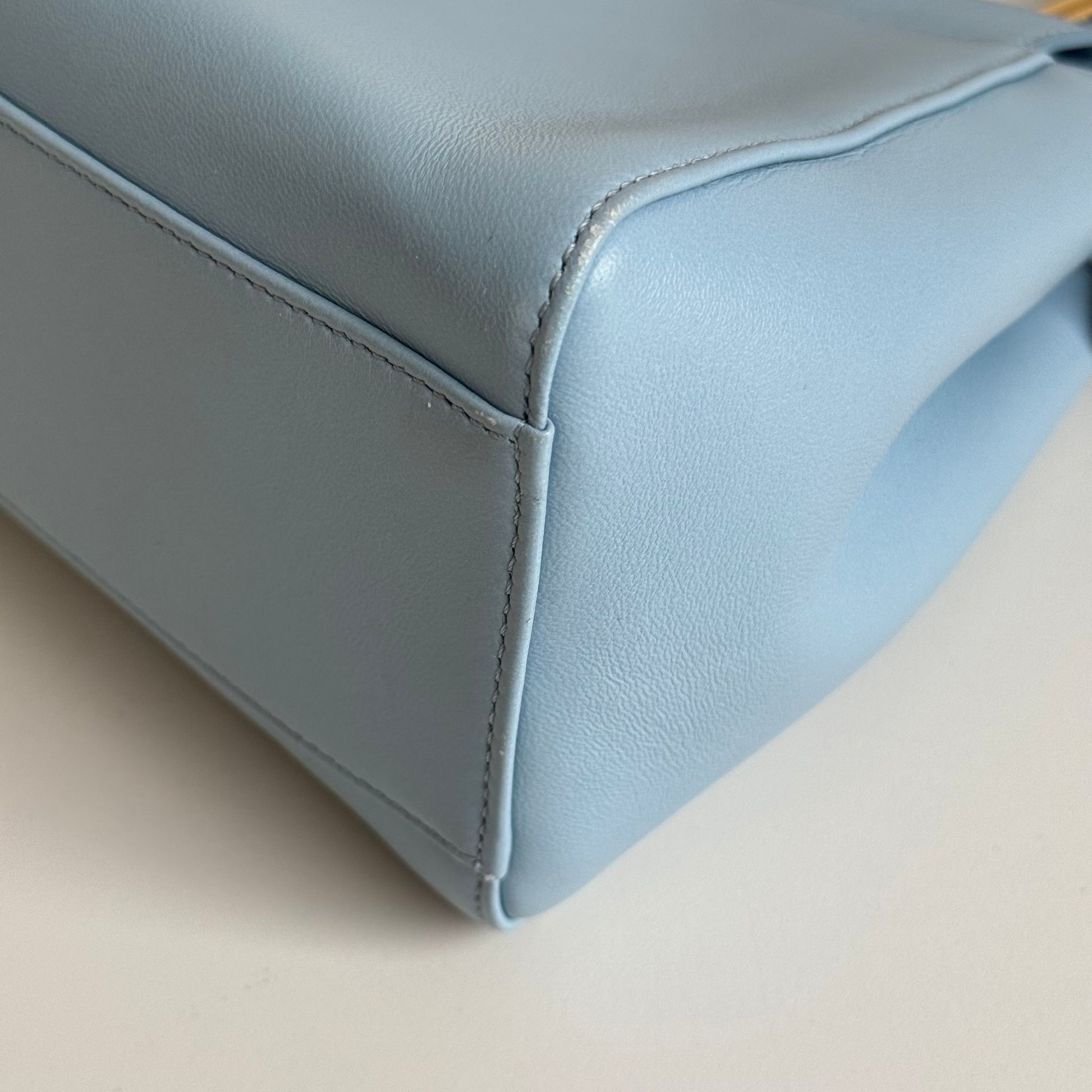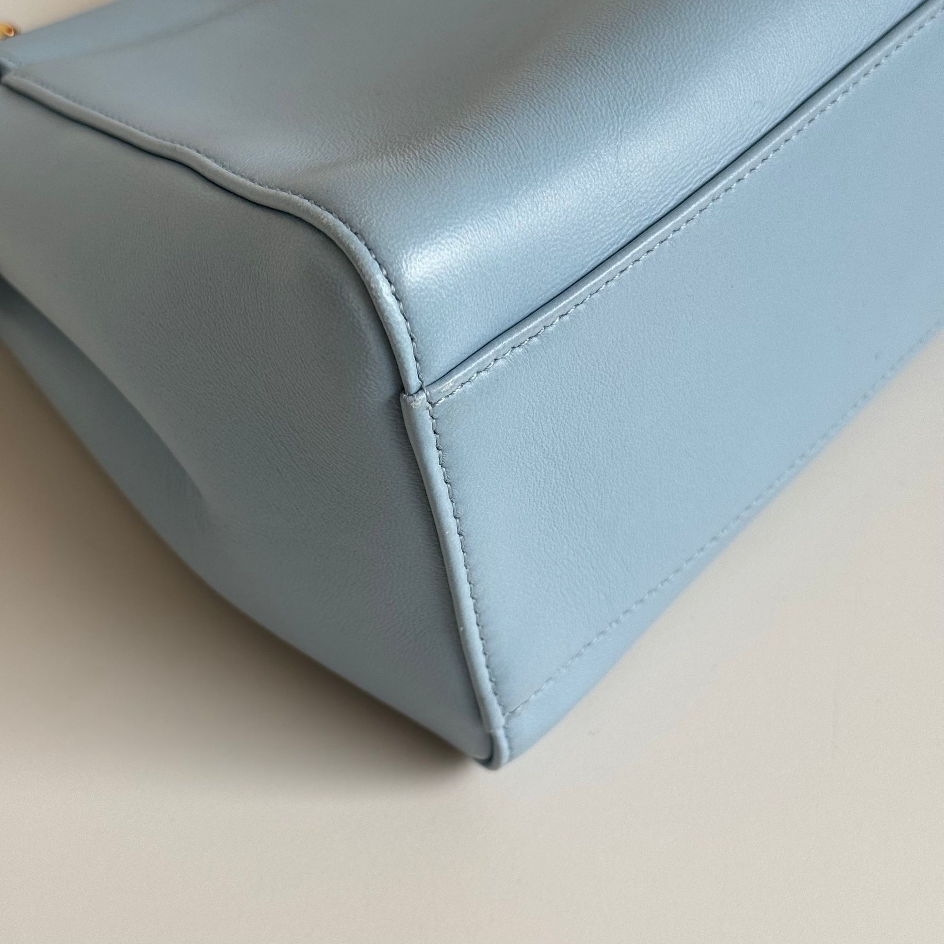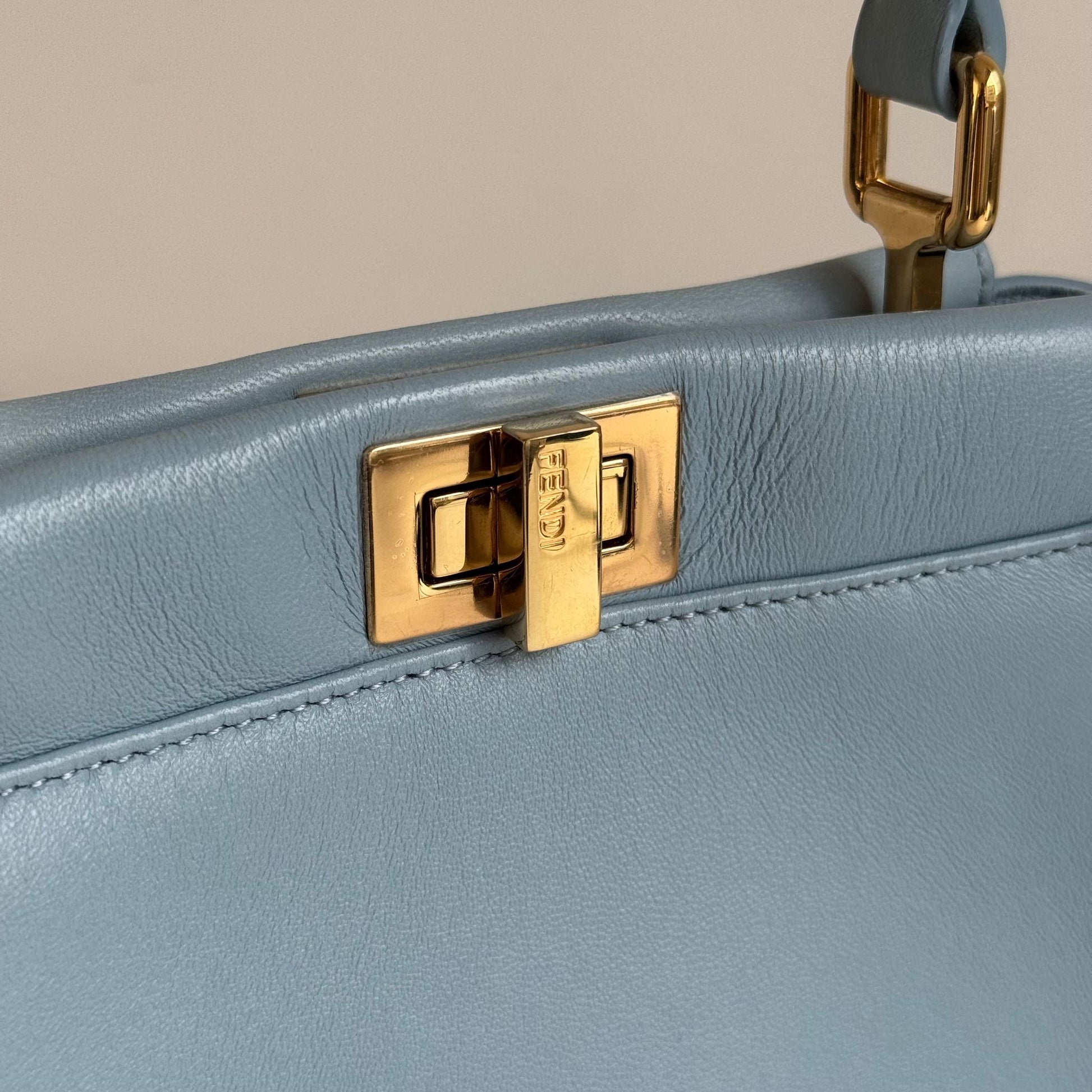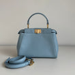 Meravigliosa Fendi modello Peekaboo in morbidissima nappa azzurra, con hardware oro. Tracolla rimovibile e e regolabile.