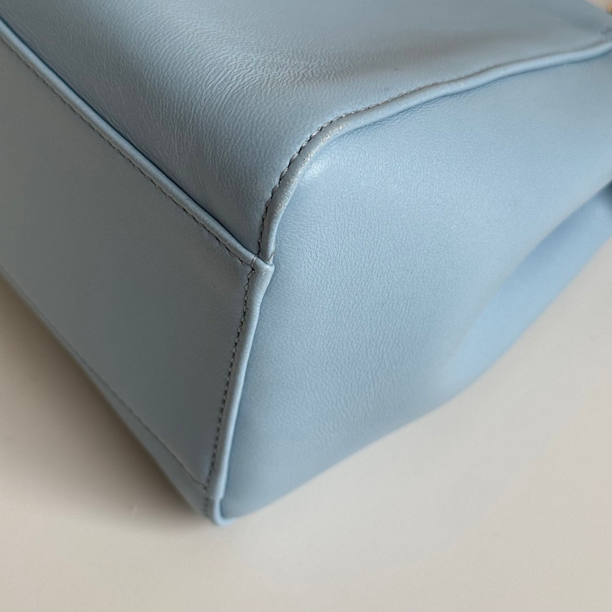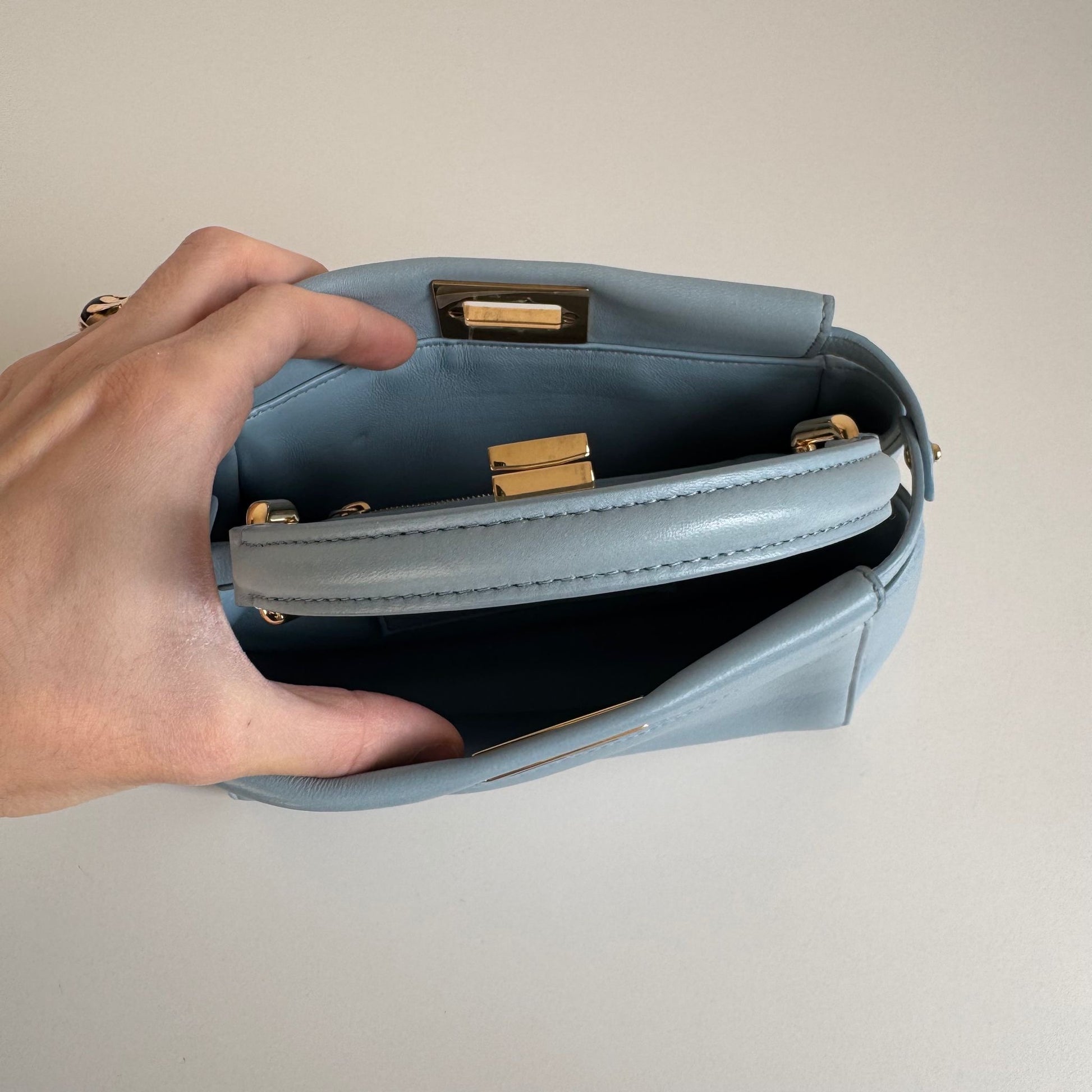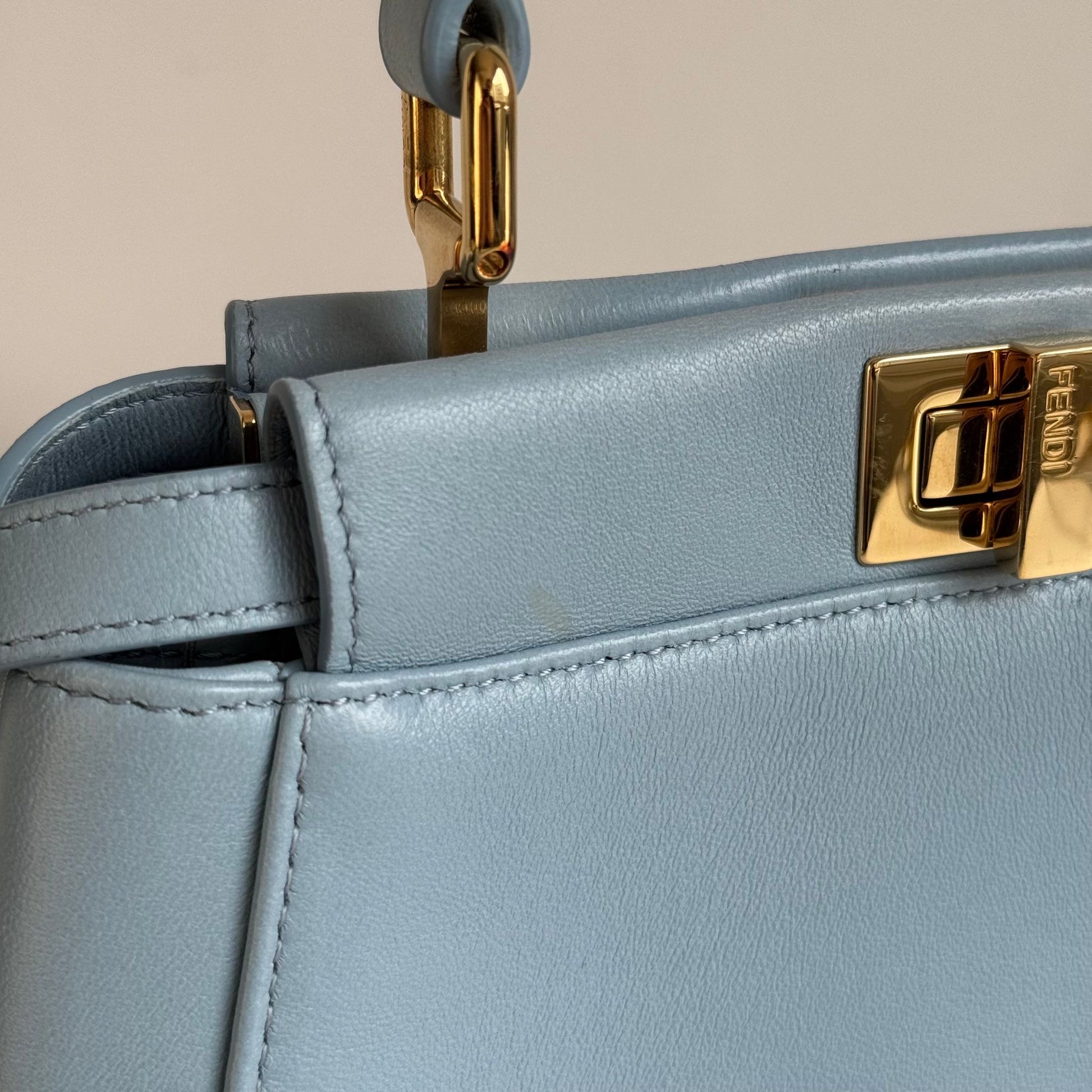 Meravigliosa Fendi modello Peekaboo in morbidissima nappa azzurra, con hardware oro. Tracolla rimovibile e e regolabile.