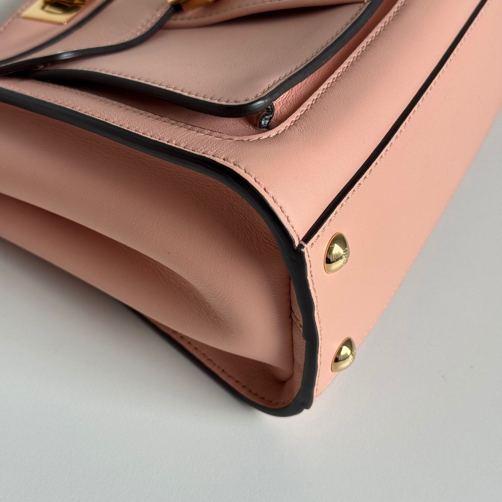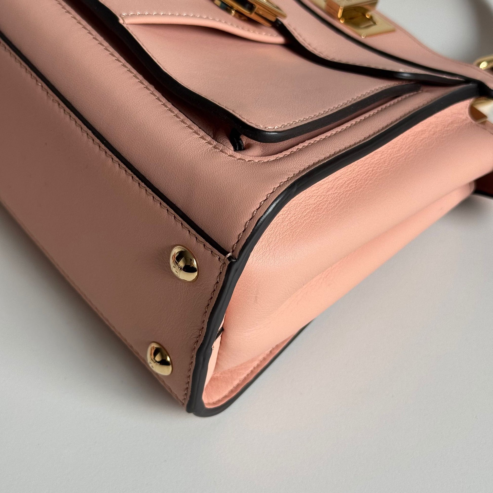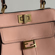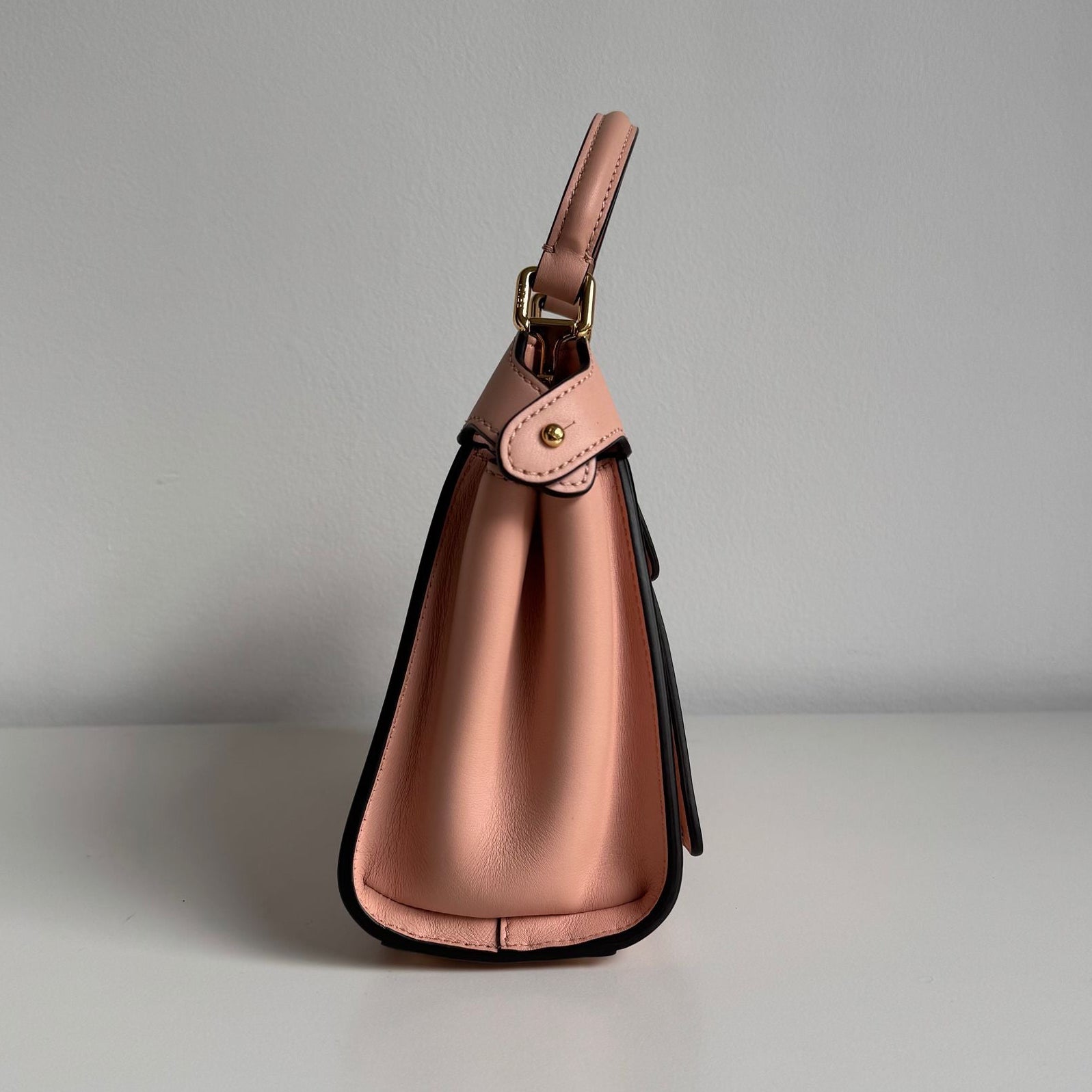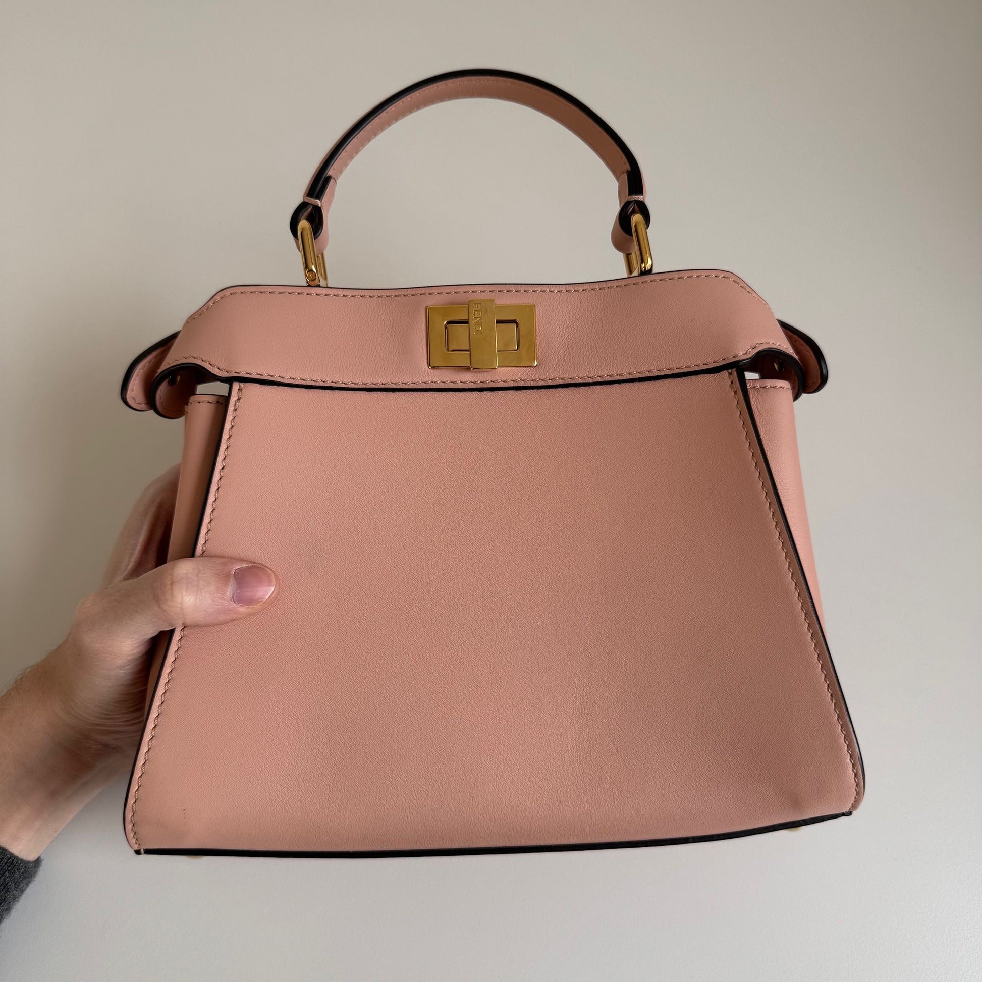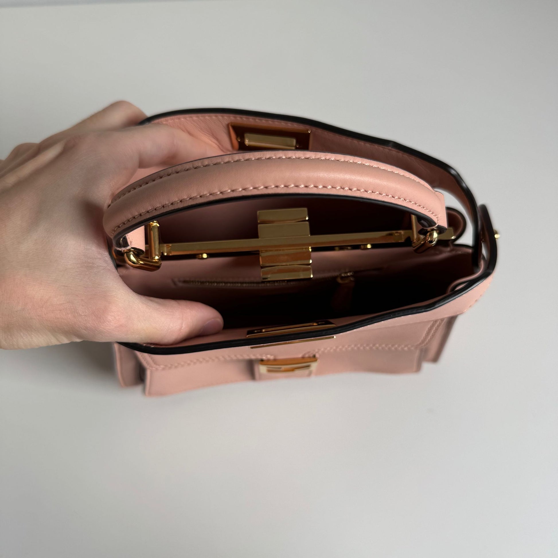 Meravigliosa borsa Fendi modello Peekaboo in pelle liscia rosa chiaro e hardware oro. Si indossa a mano e a tracolla, la tracolla è rimovibile e regolabile.