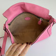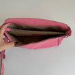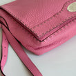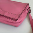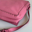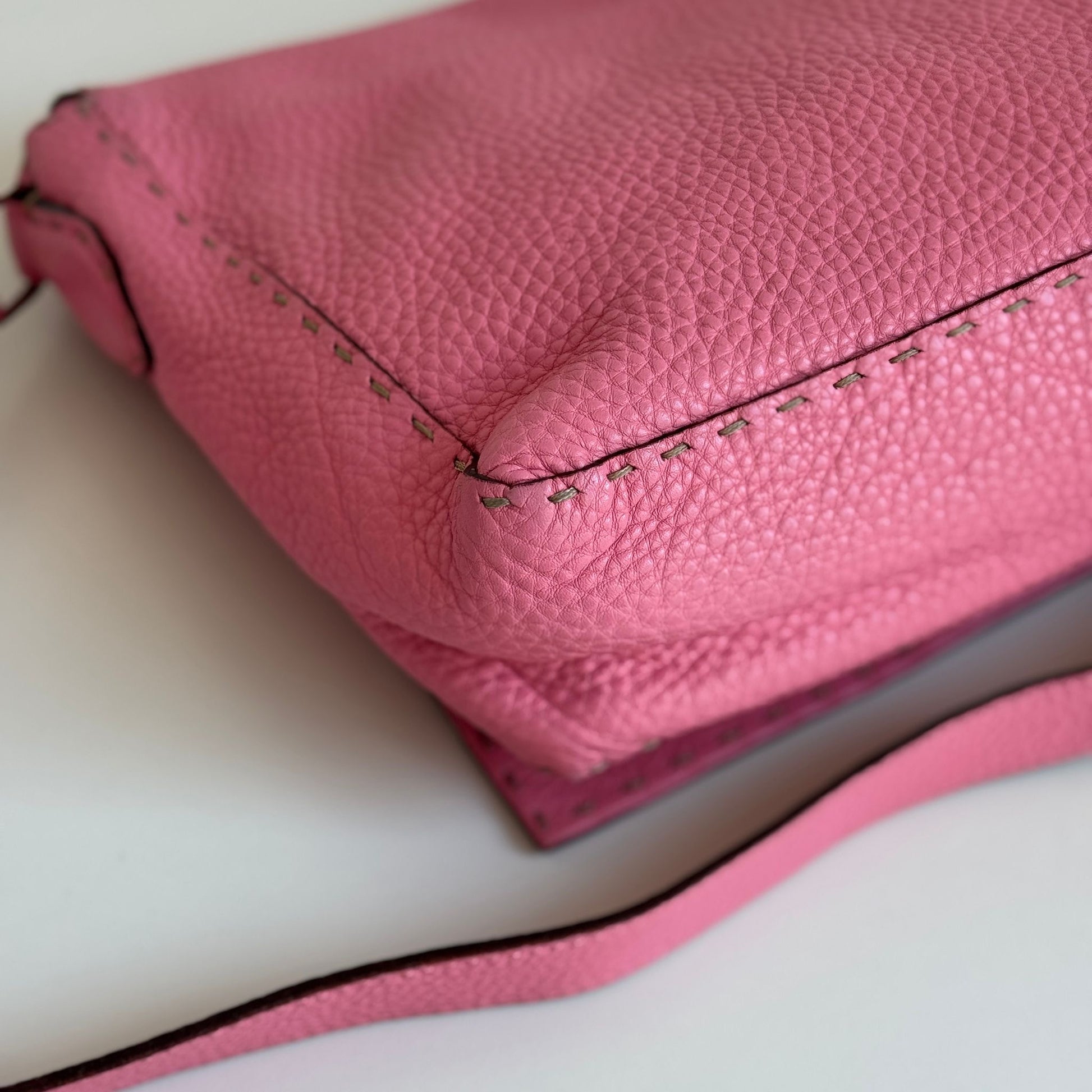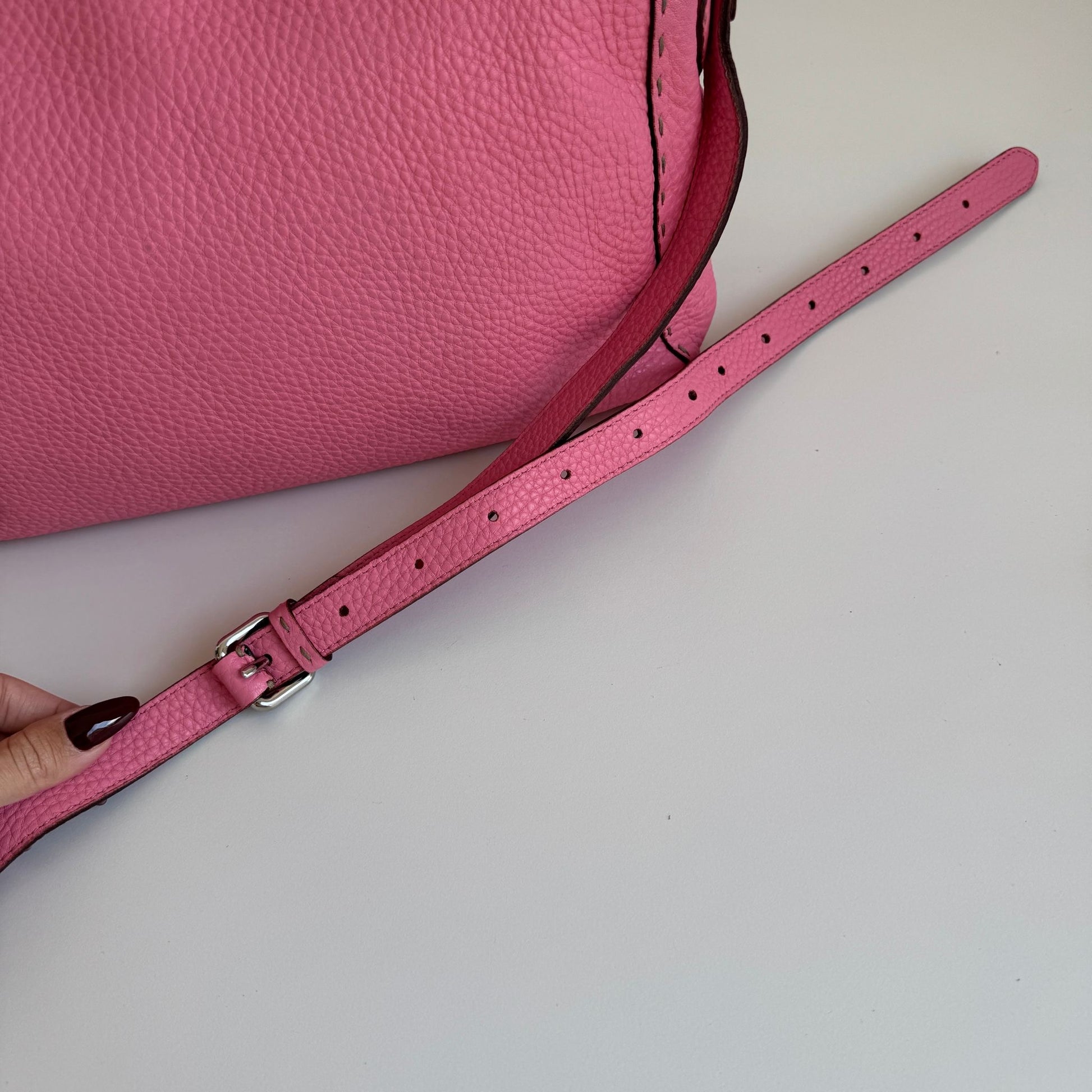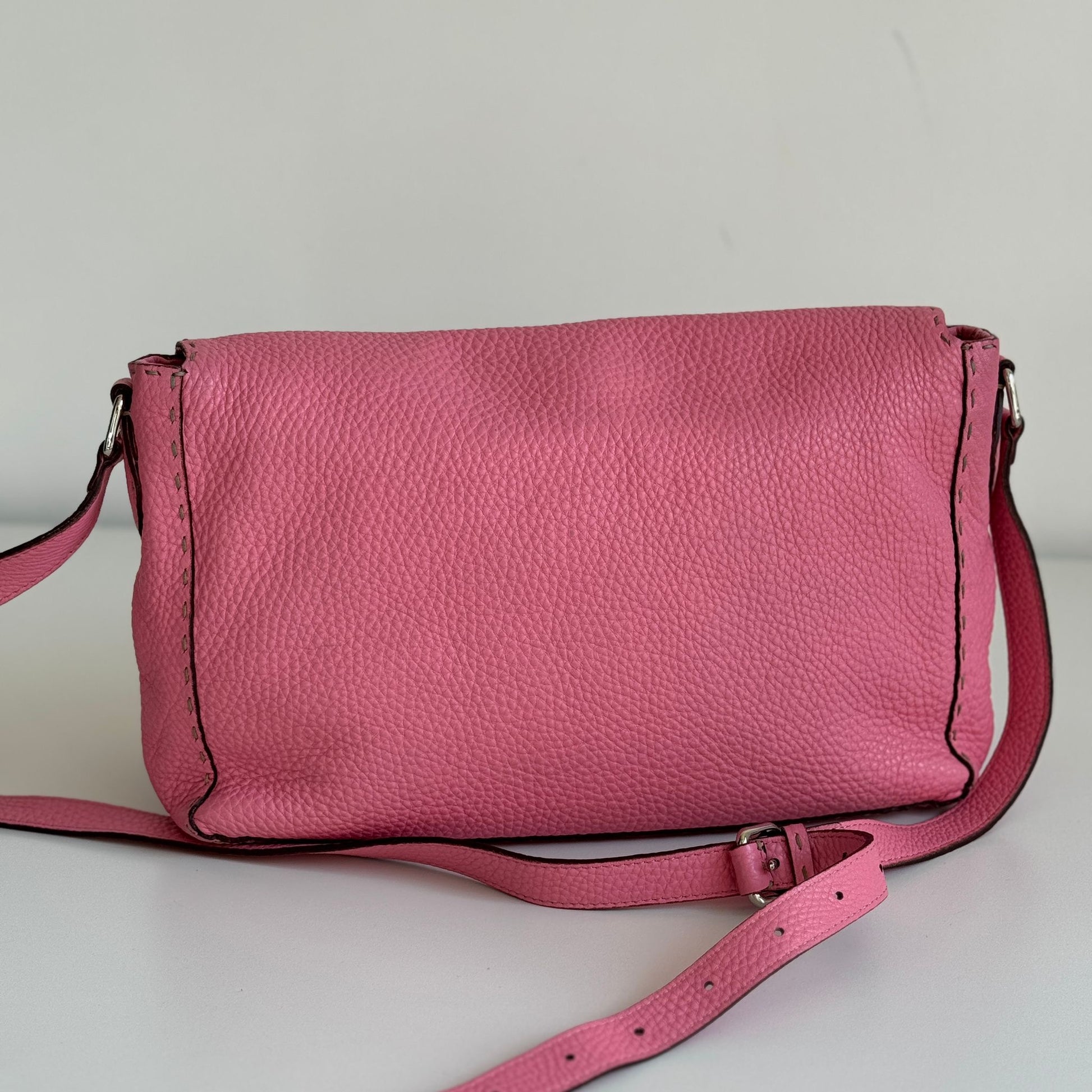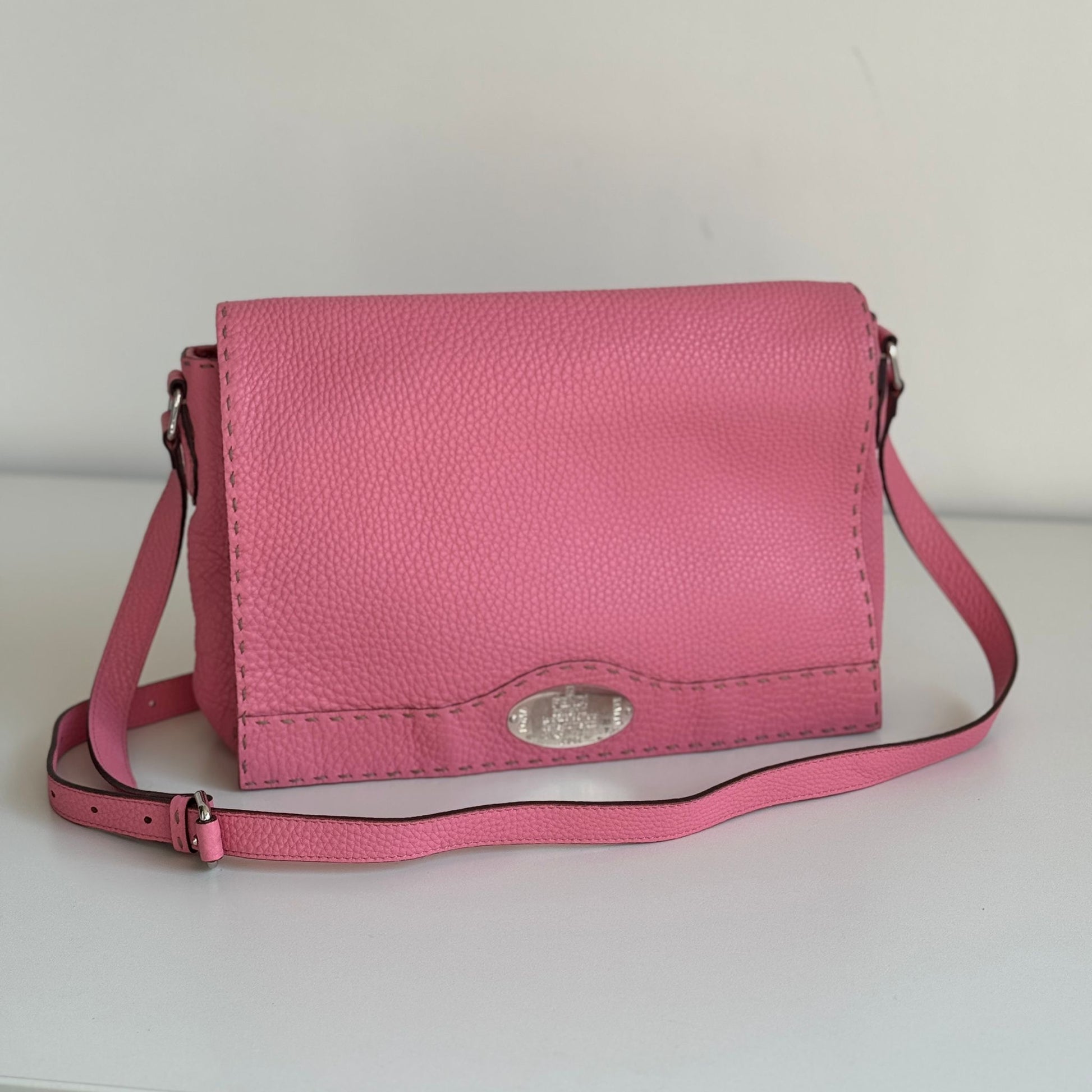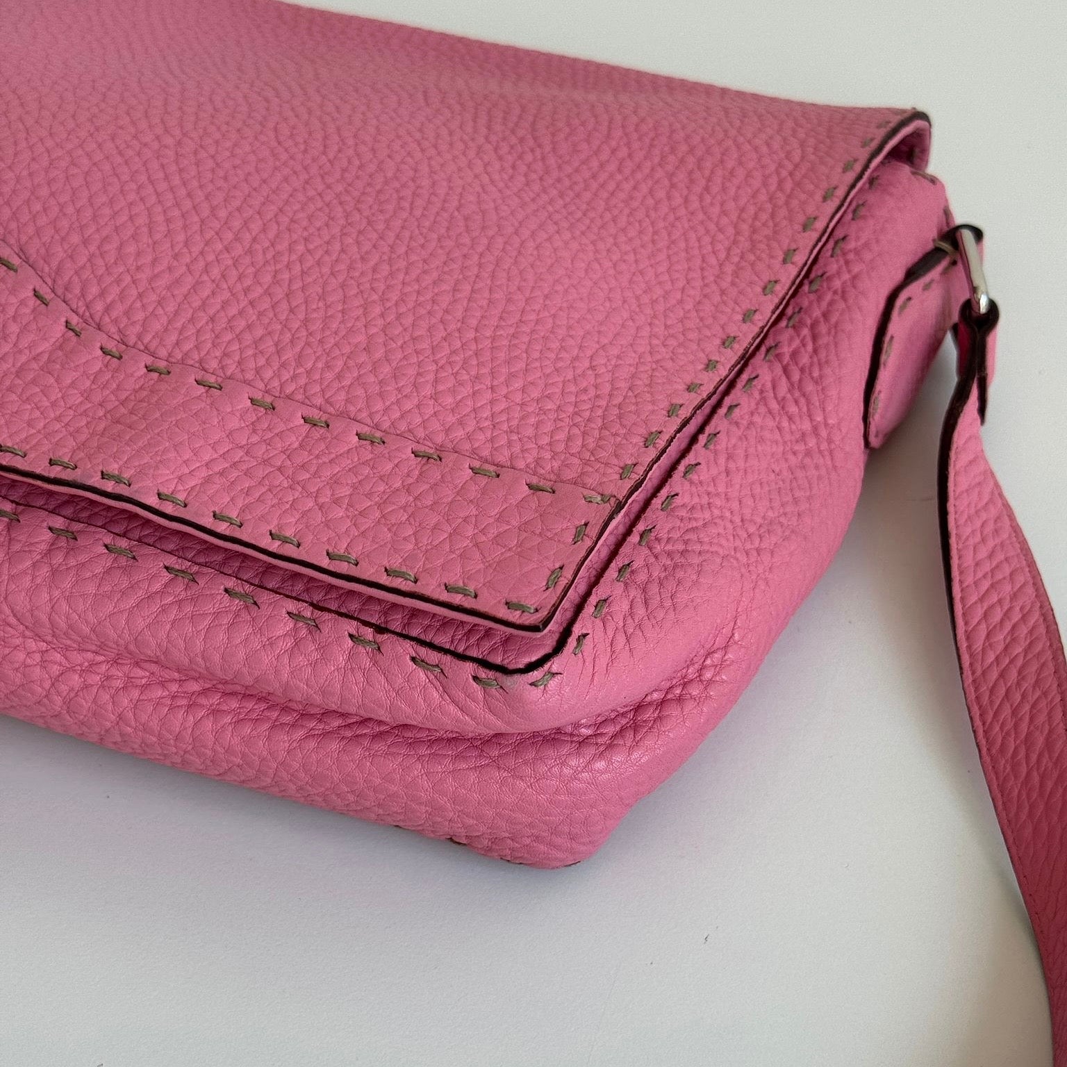 Meravigliosa borsa Fendi Selleria modello Messenger in pelle rosa acceso con impunture beige e hardware argento. Si indossa a tracolla ed è regolabile.