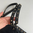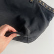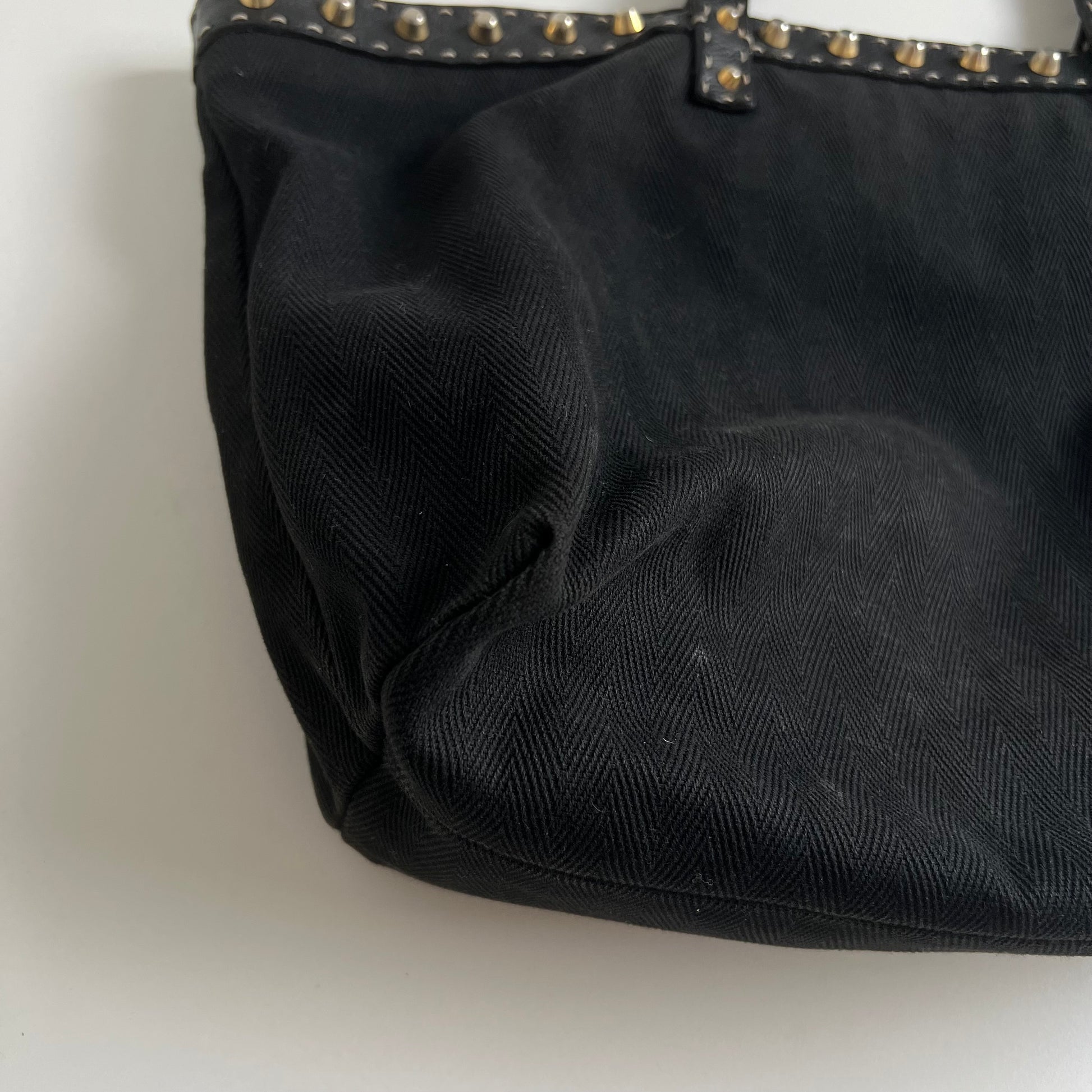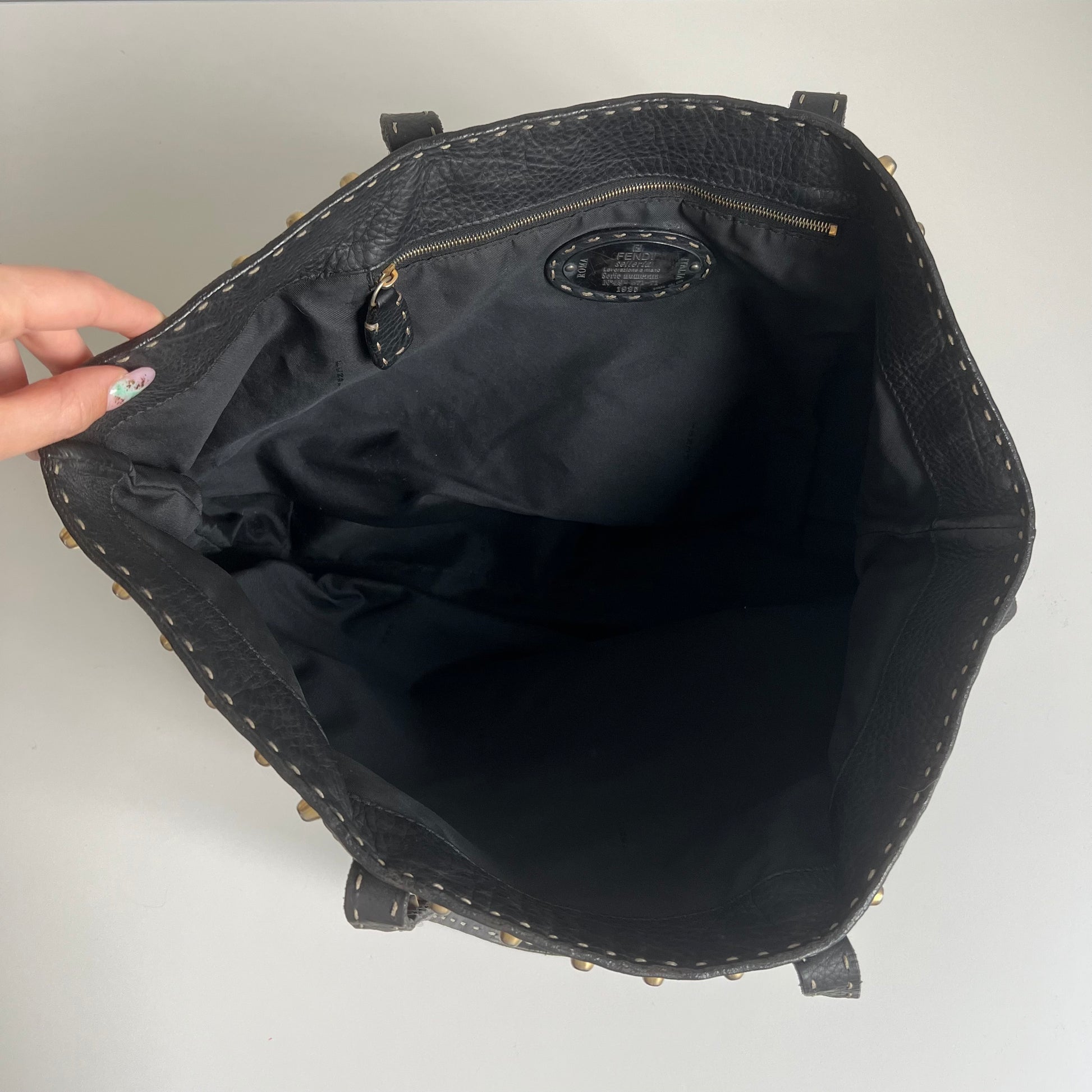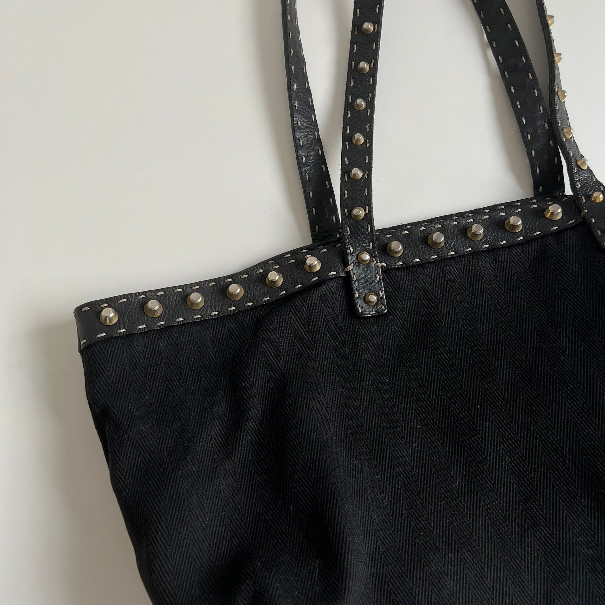 Stupenda borsa Fendi shopper edizione Selleria in tessuto nero spigato con dettagli in pelle e borchie oro sfumato argento.