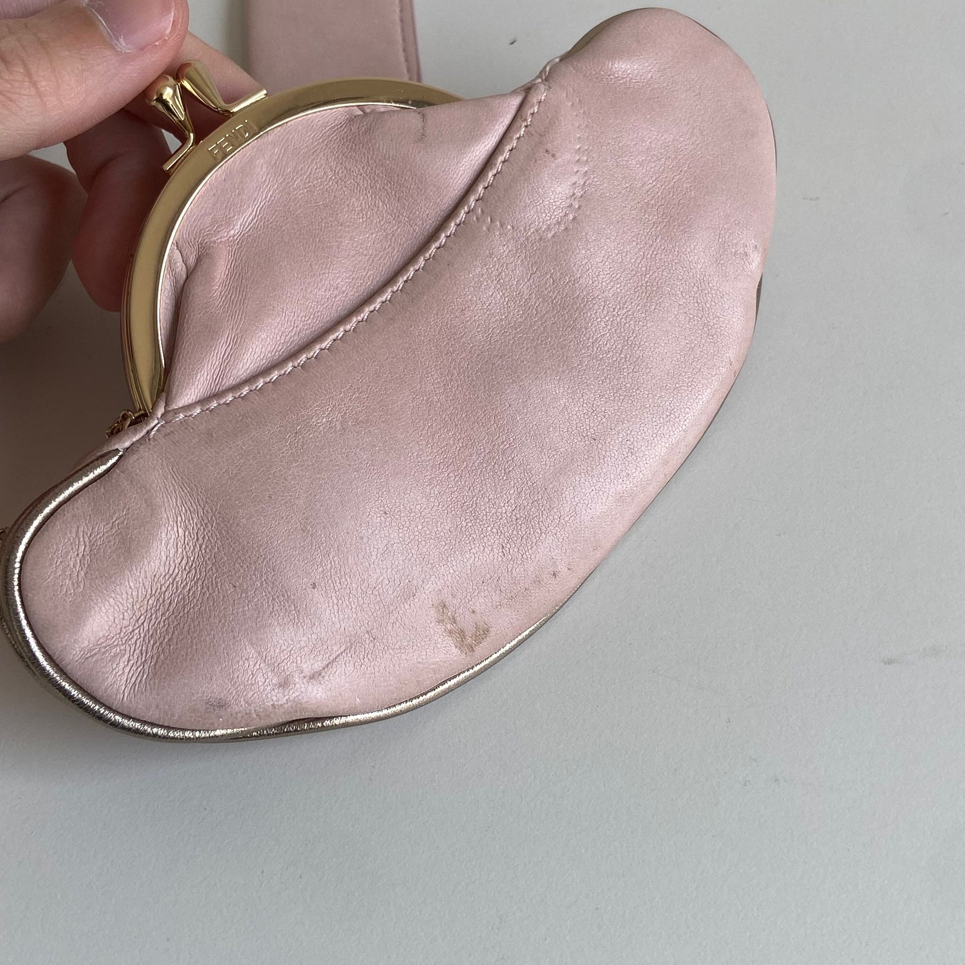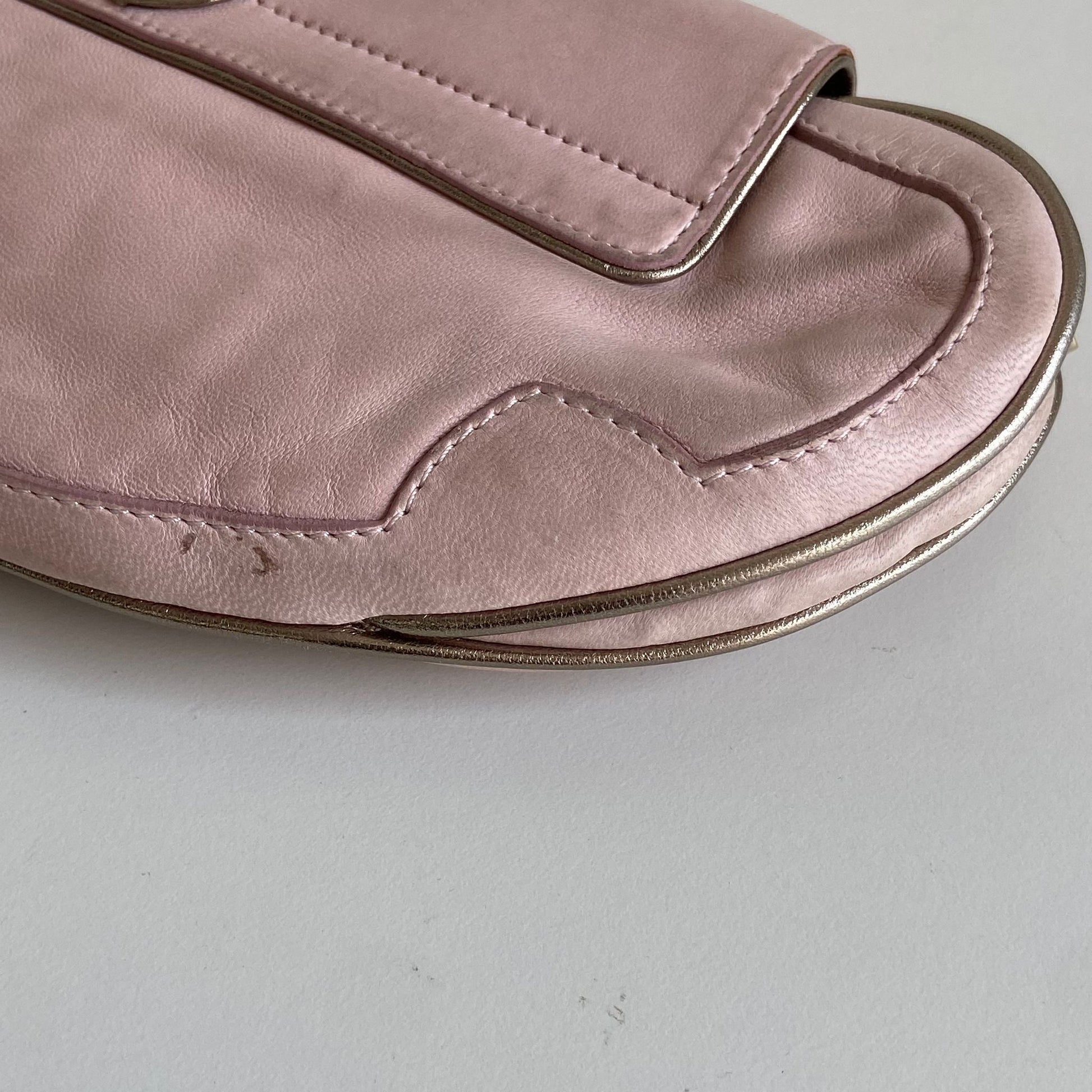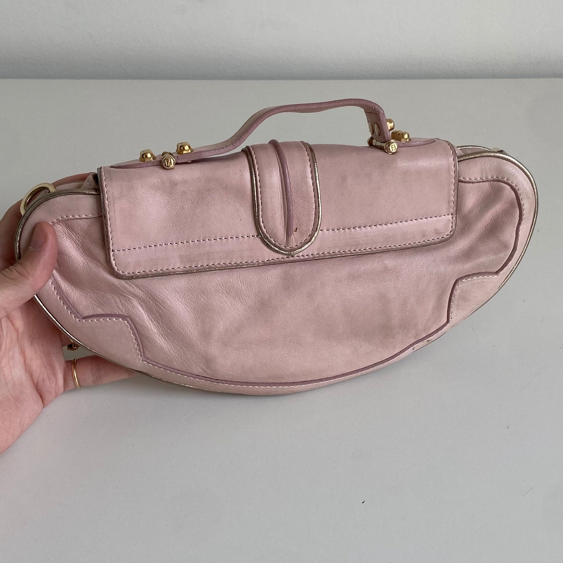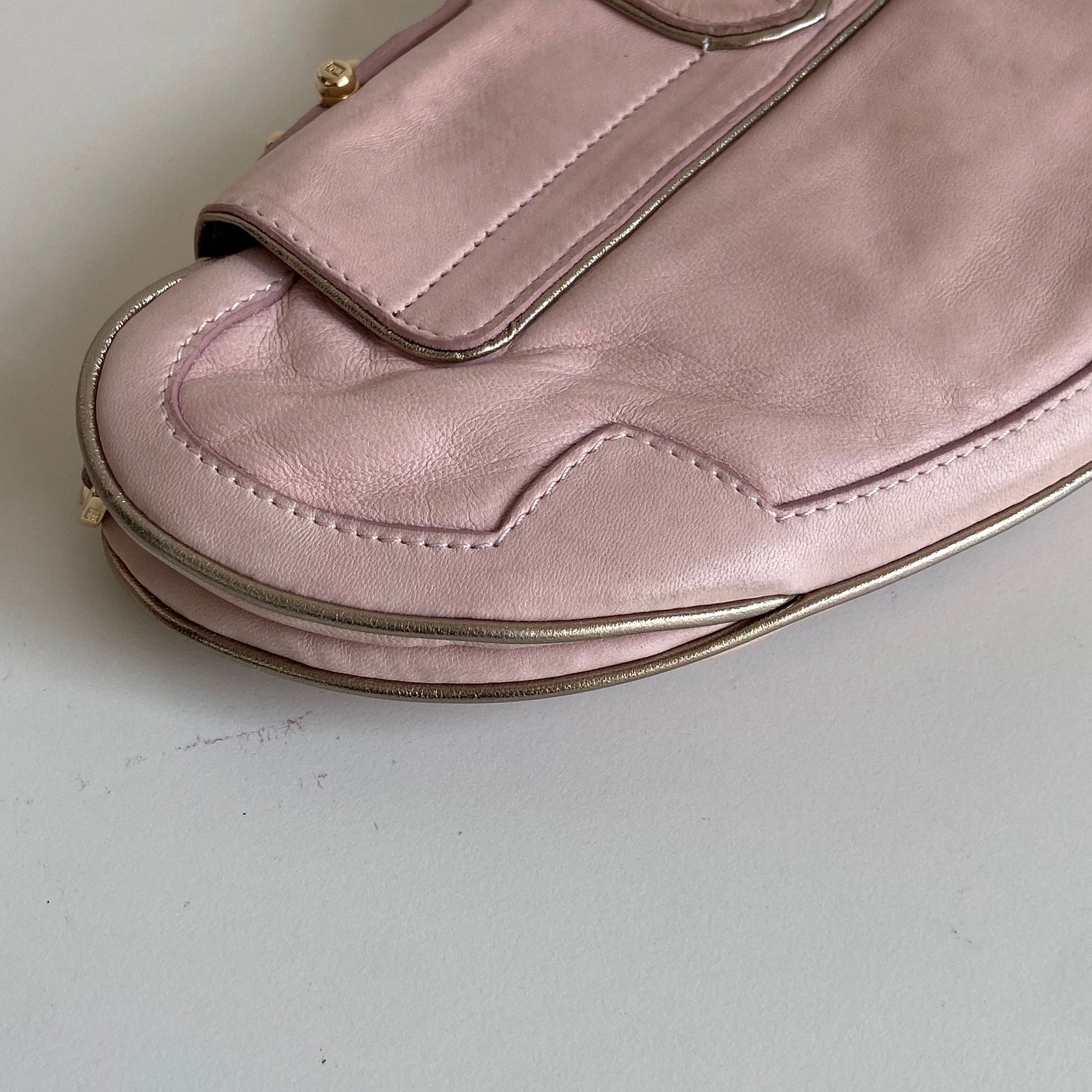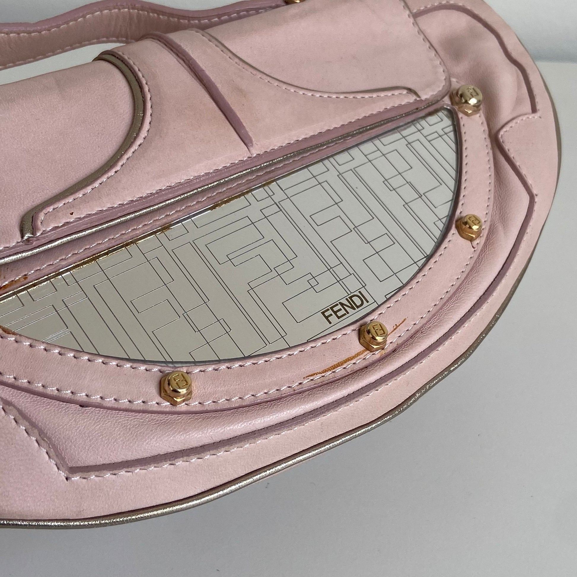 Magnifica e rarissima Pochette Fendi modello Vanity in nappa rosa con profili oro, dettaglio a specchio e hardware oro. Si indossa a mano o a spalla, la tracolla è rimovibile ma non regolabile.