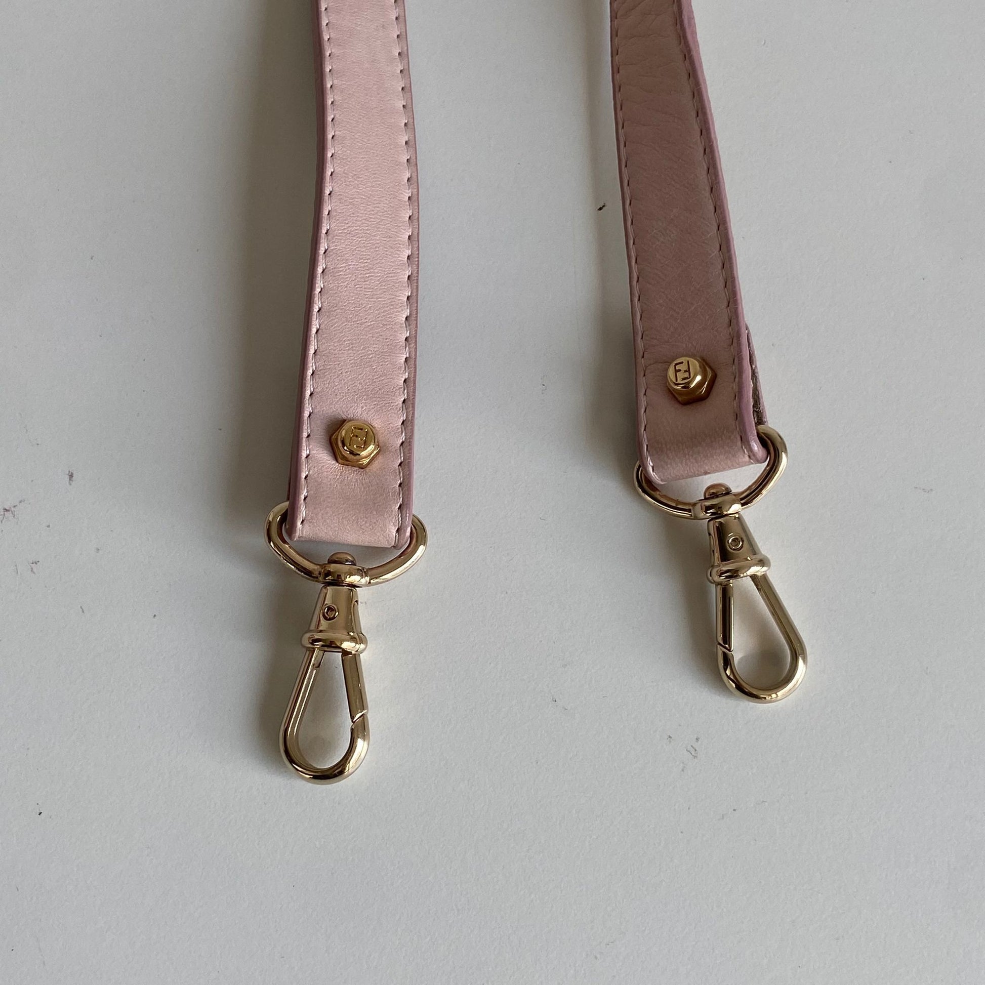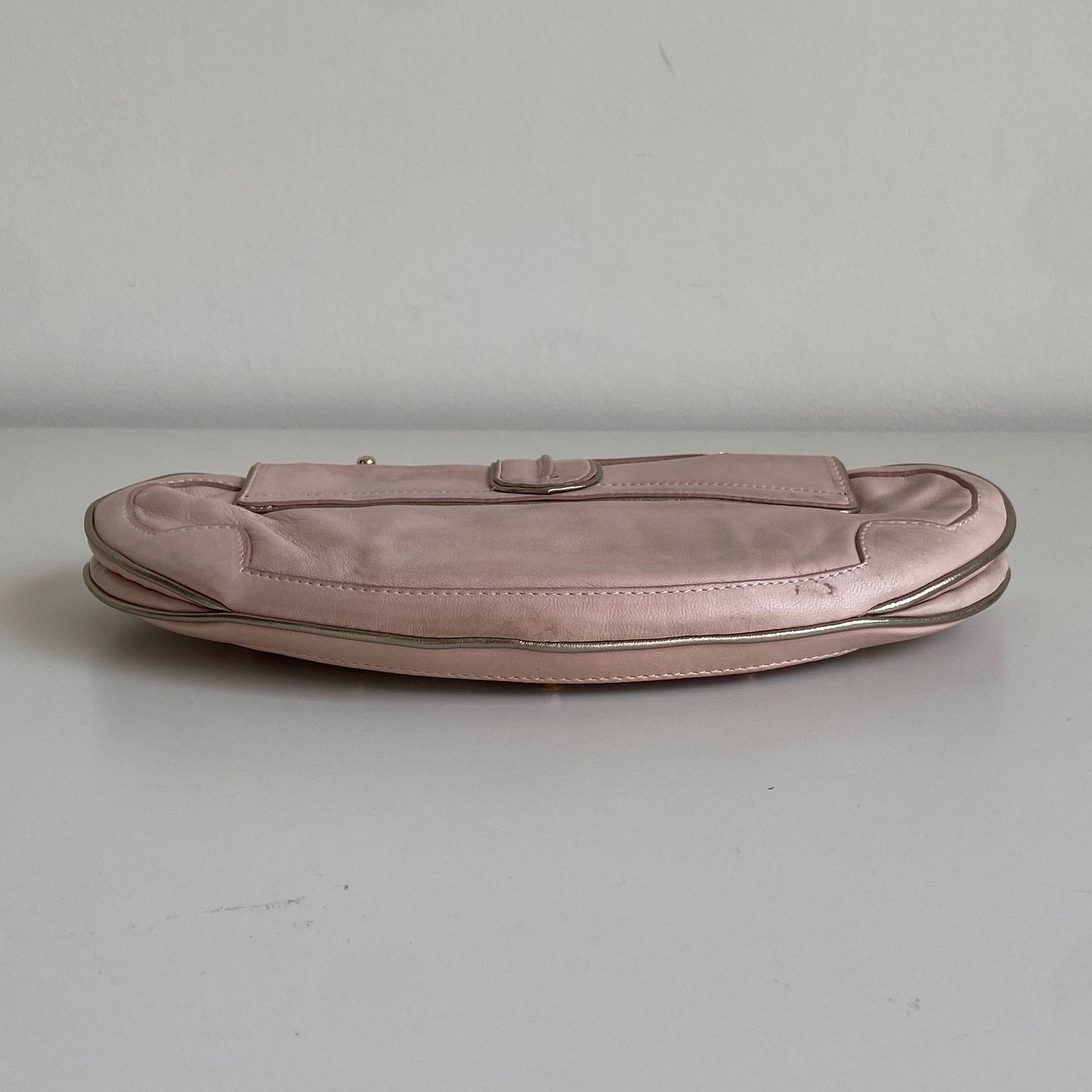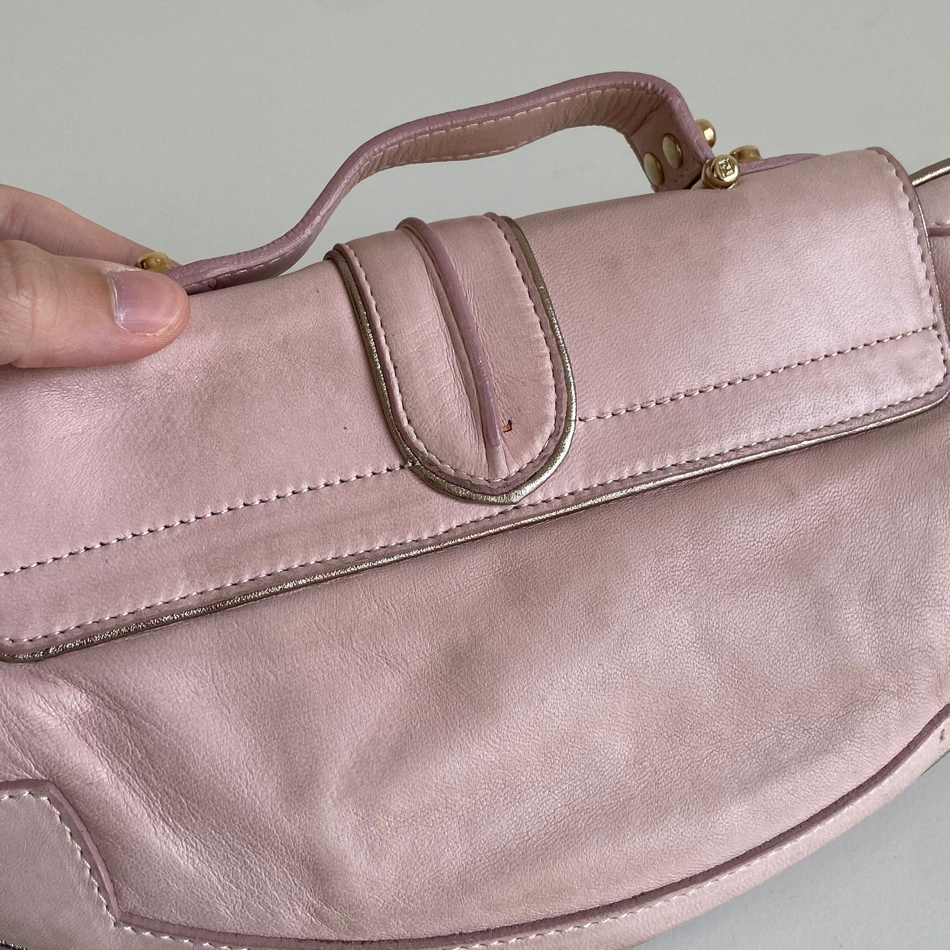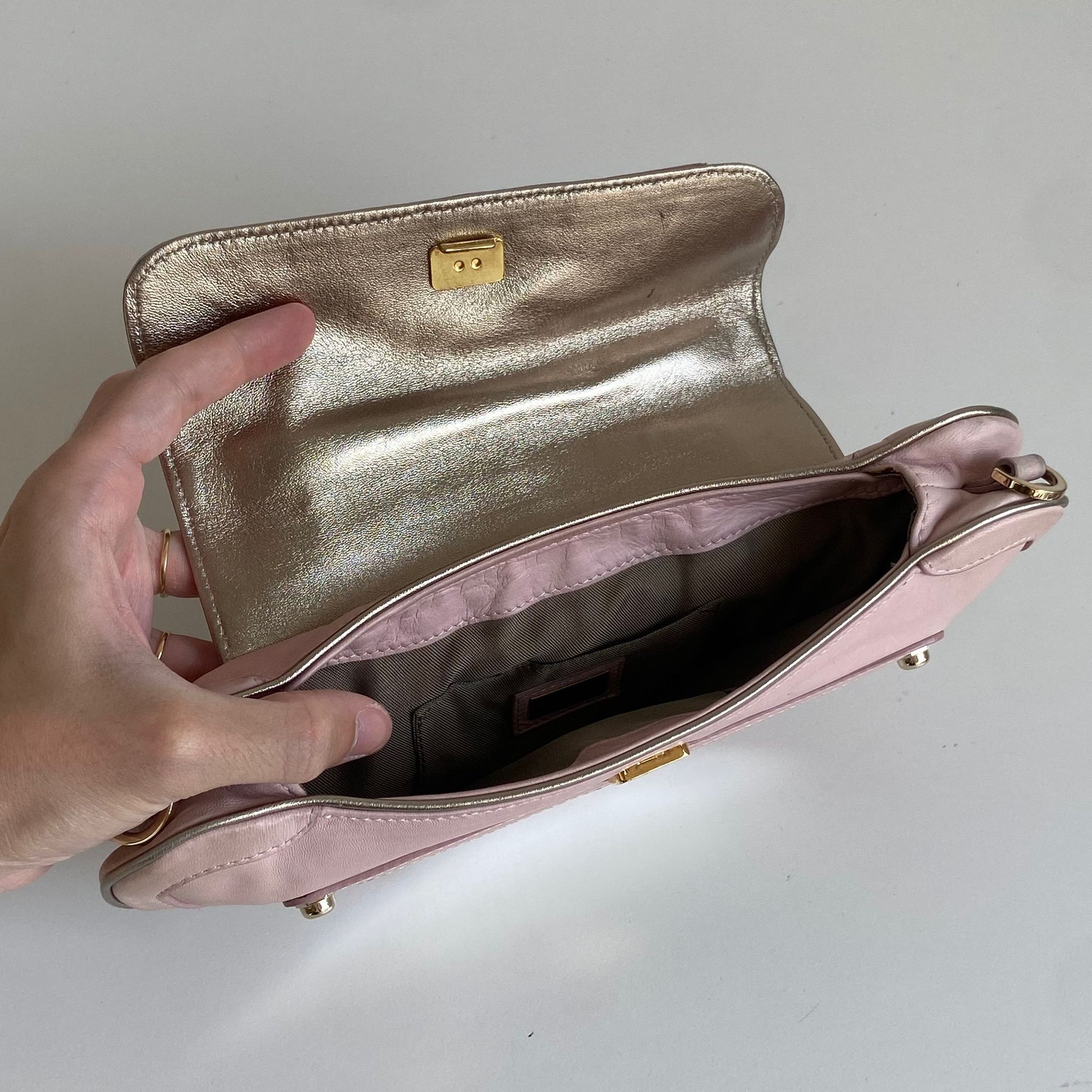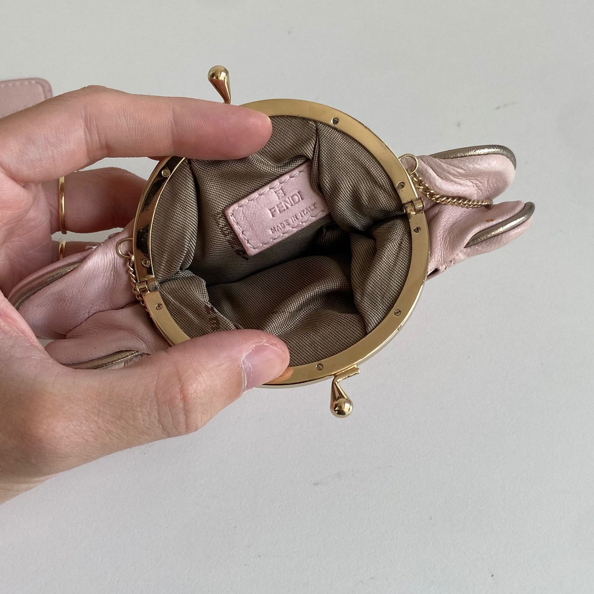 Magnifica e rarissima Pochette Fendi modello Vanity in nappa rosa con profili oro, dettaglio a specchio e hardware oro. Si indossa a mano o a spalla, la tracolla è rimovibile ma non regolabile.