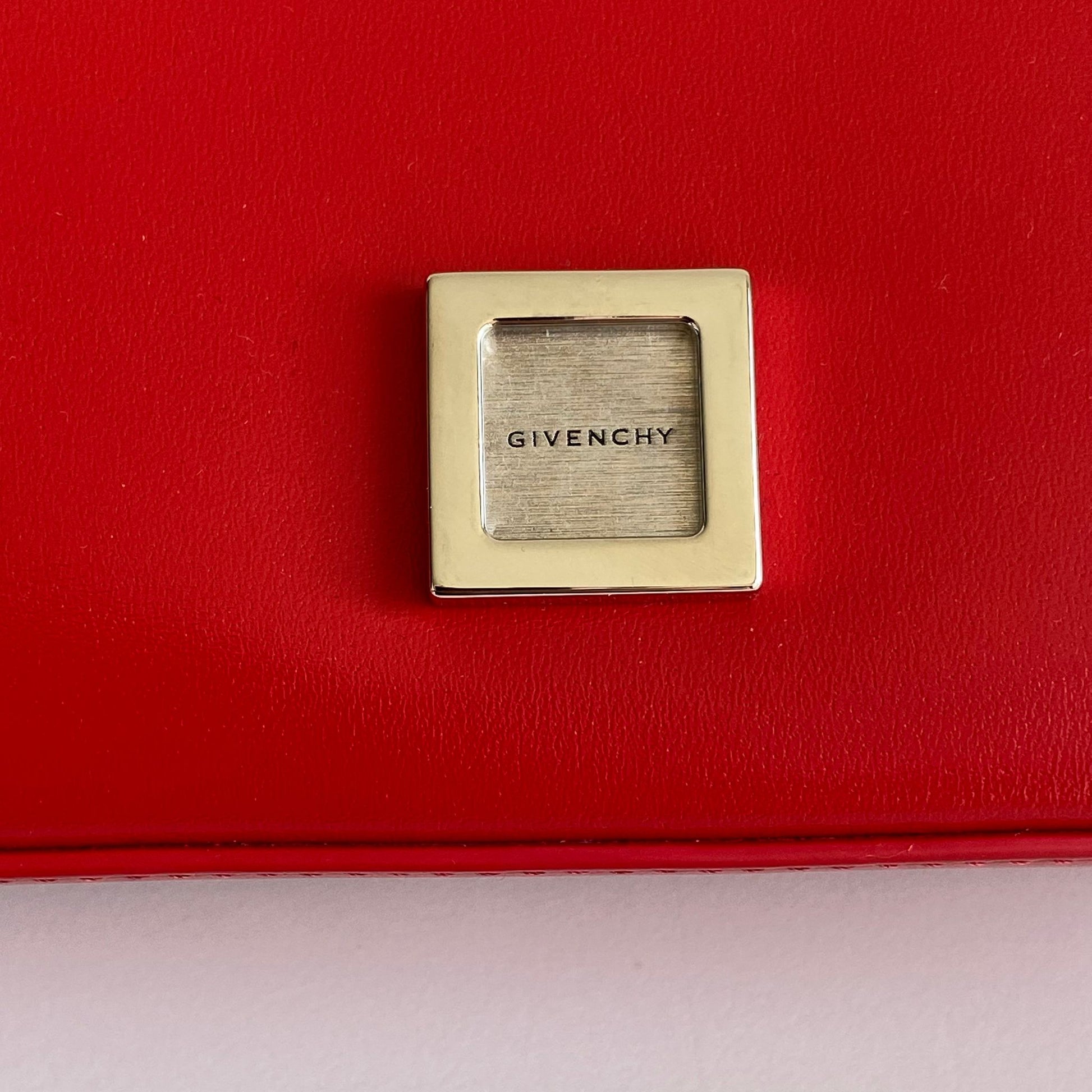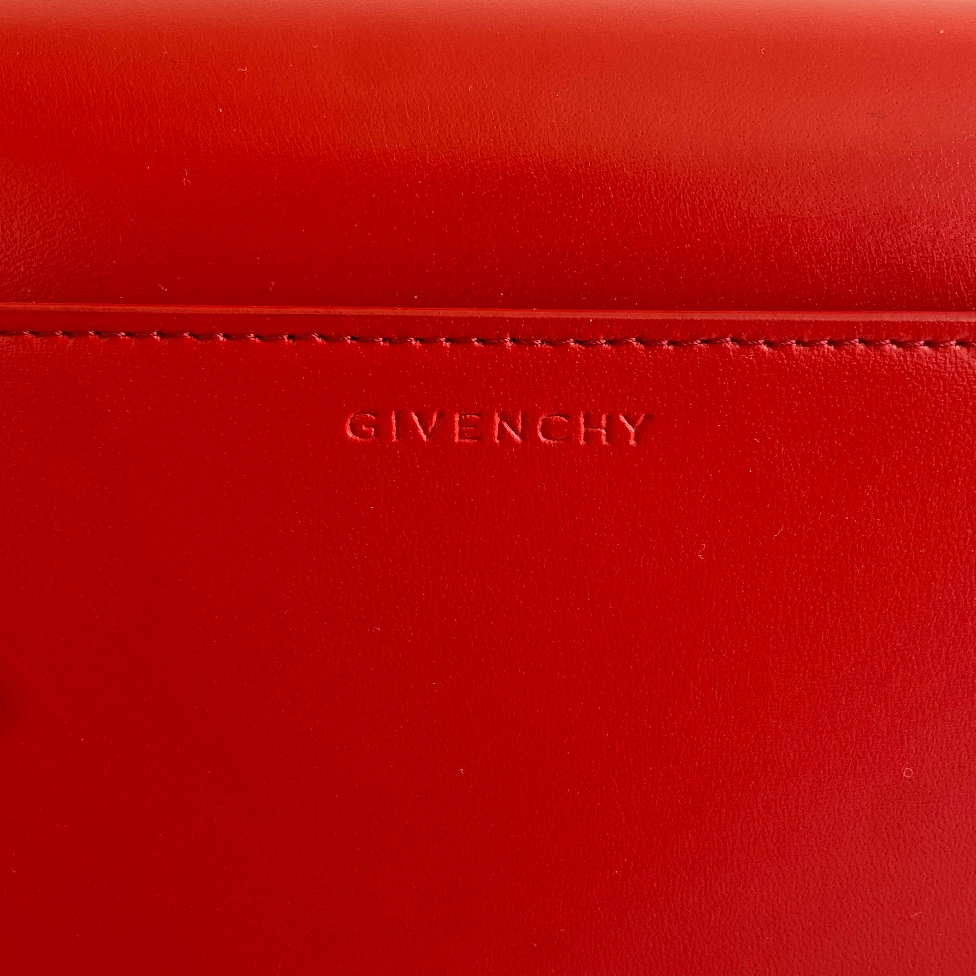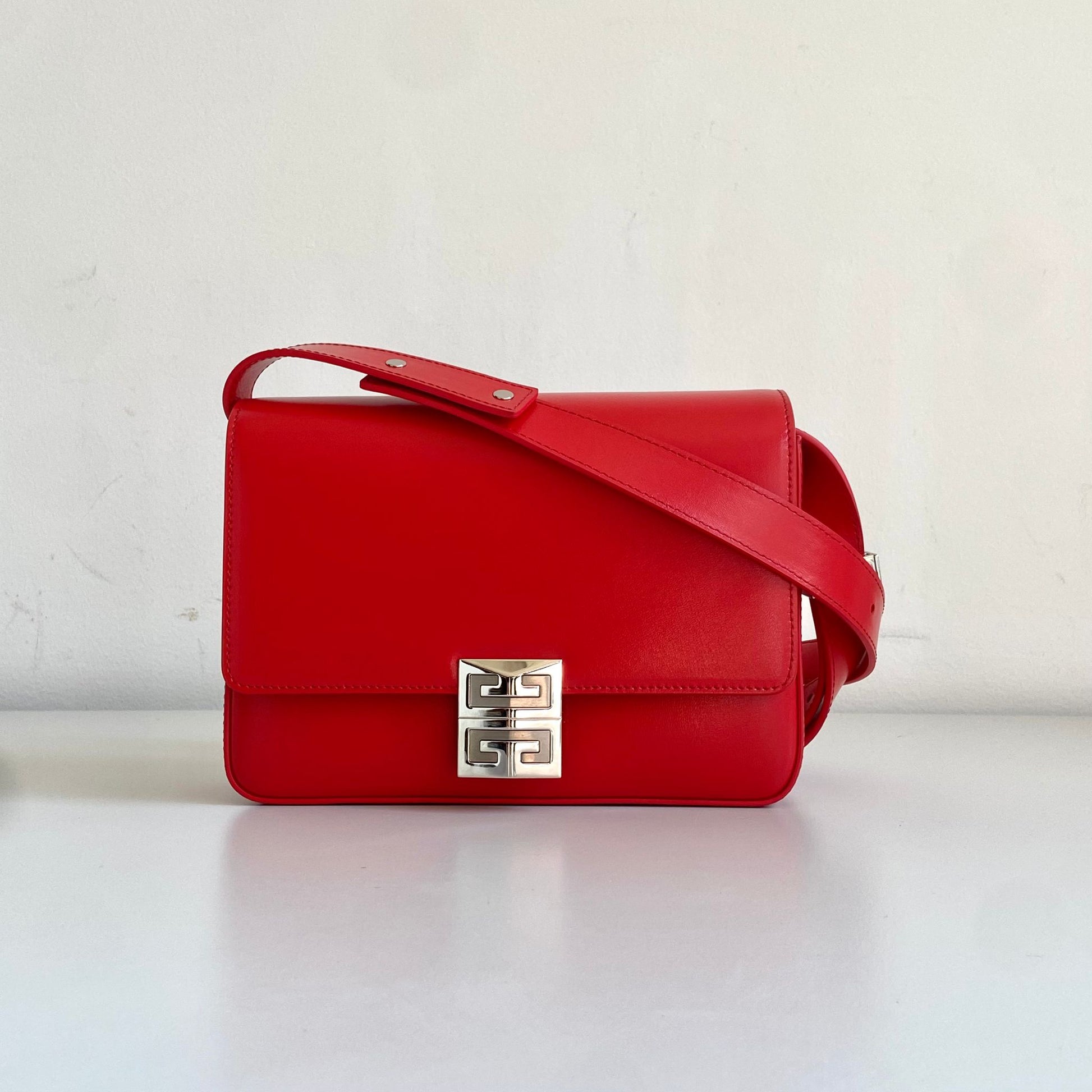 Bellissima borsa Givenchy modello 4G in pelle liscia rossa e hardware argento. Si indossa a spalla o a tracolla. La tracolla è regolabile.