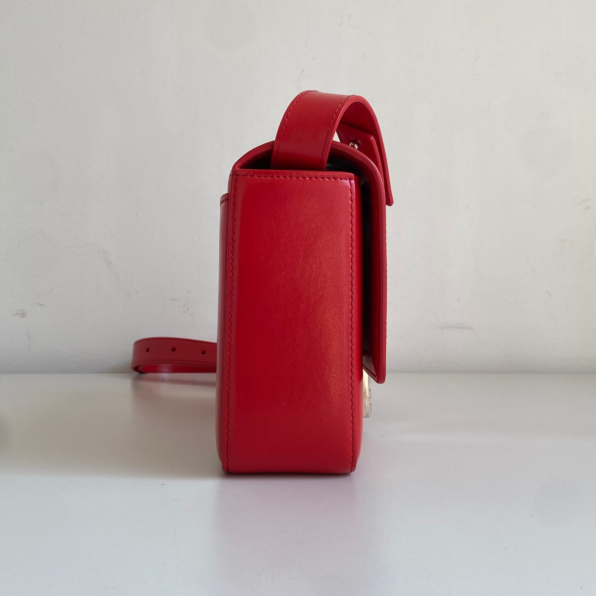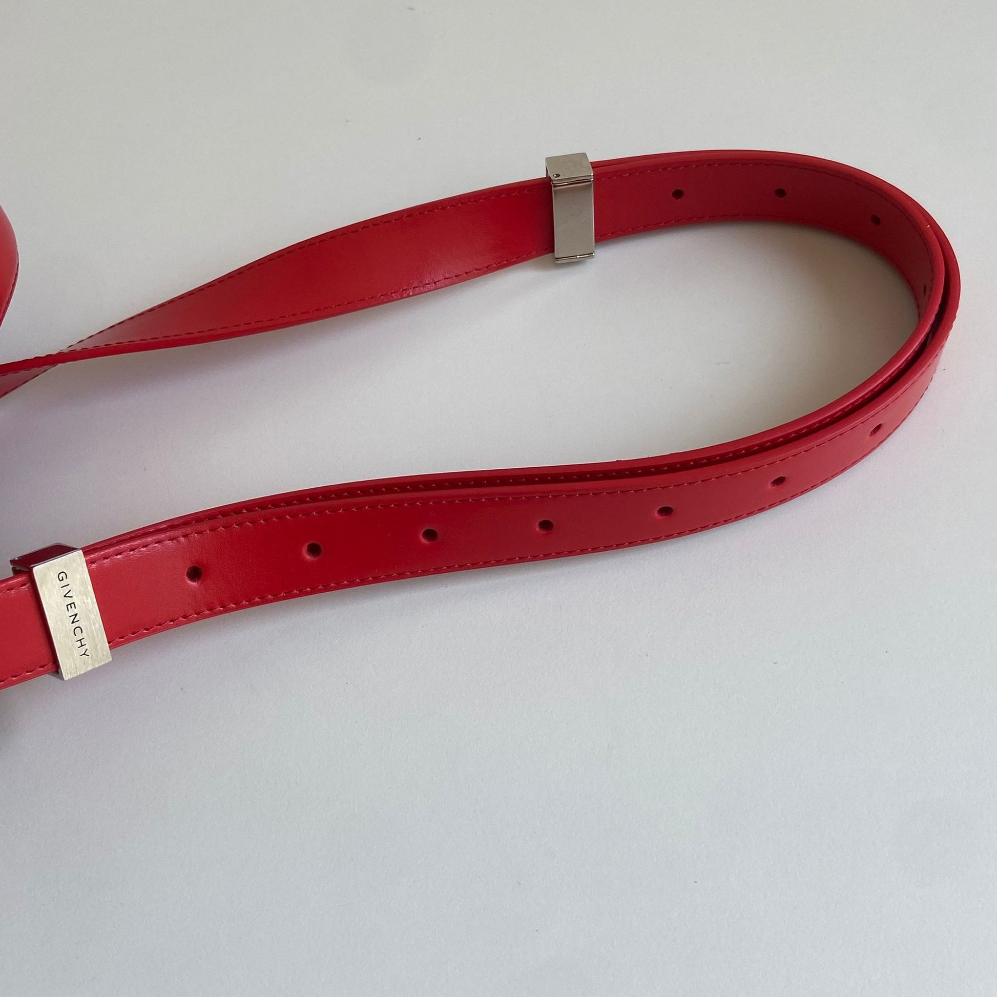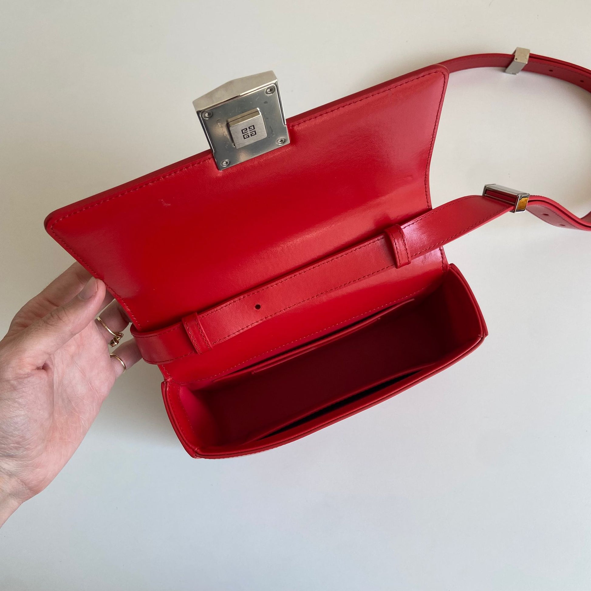 Bellissima borsa Givenchy modello 4G in pelle liscia rossa e hardware argento. Si indossa a spalla o a tracolla. La tracolla è regolabile.