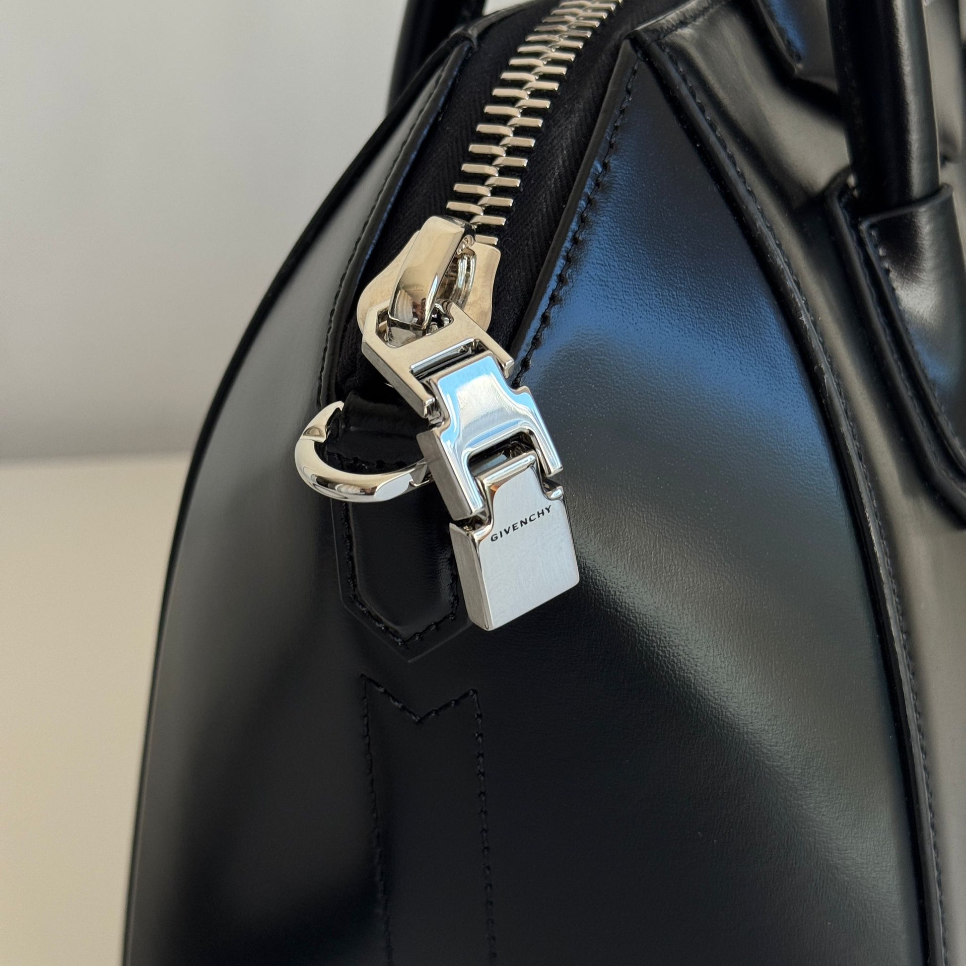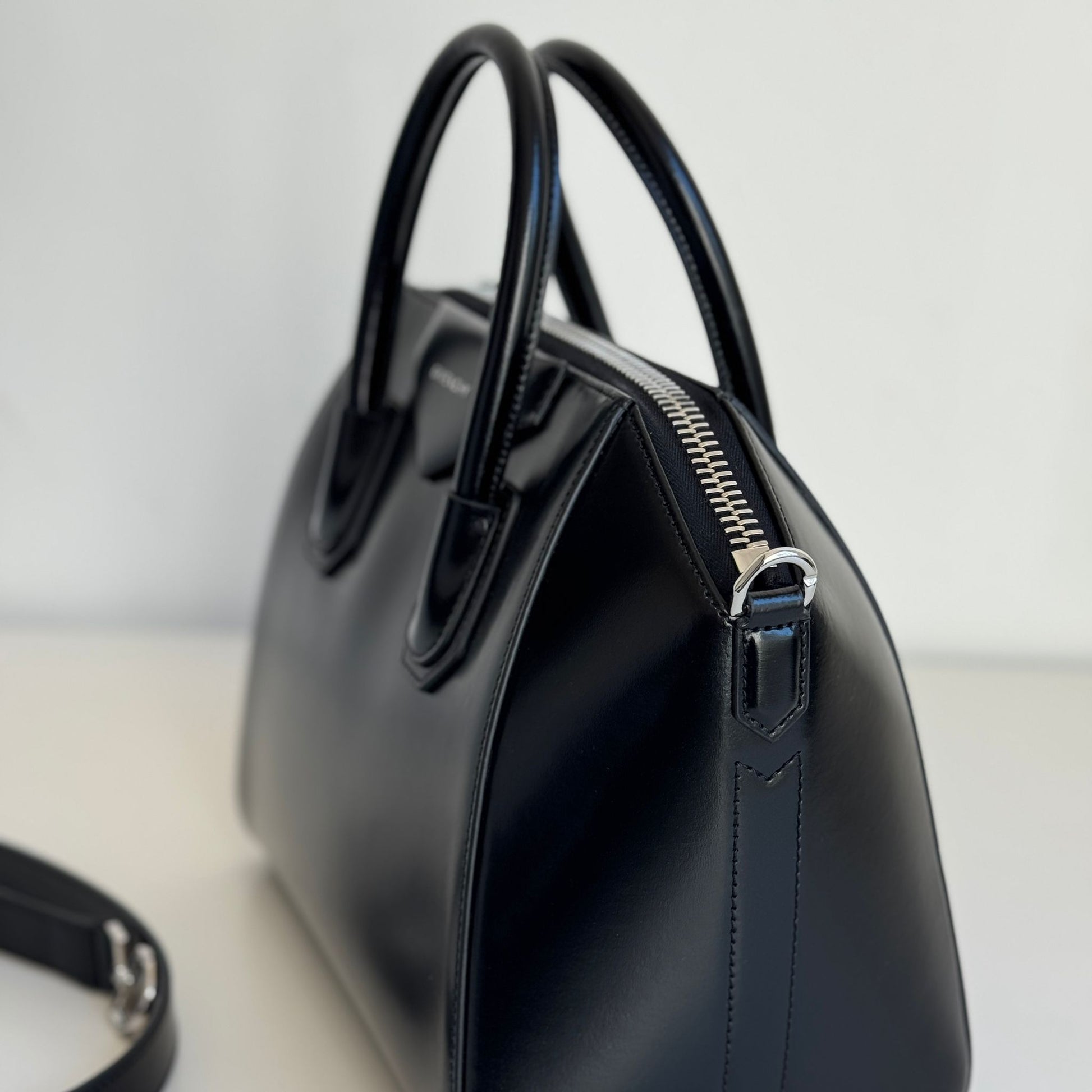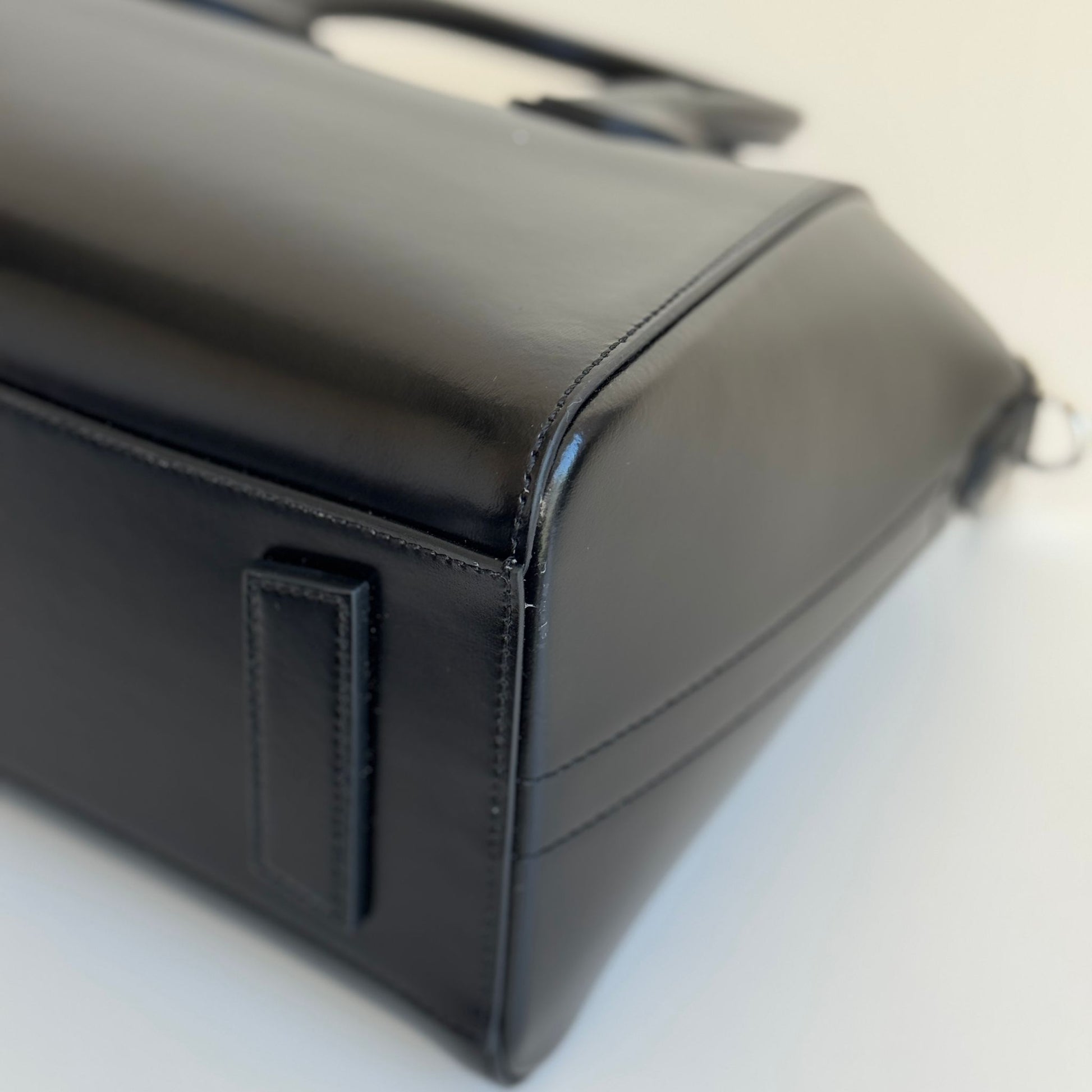Stupenda borsa di Givenchy modello Medium Antigona in pelle nera lucida con hardware argento. Si indossa a mano e a spalla. La tracolla è rimovibile ma non regolabile.