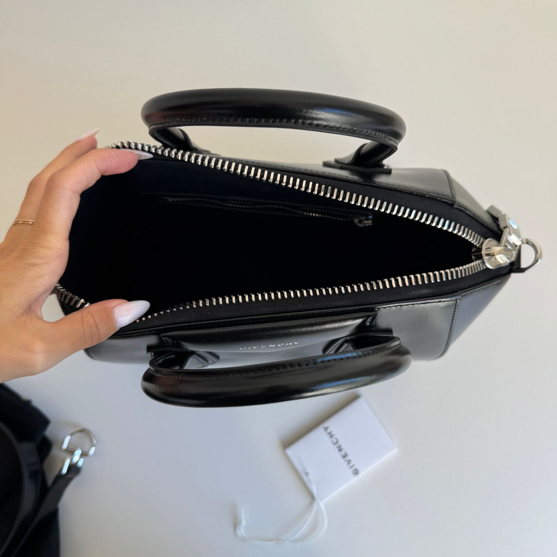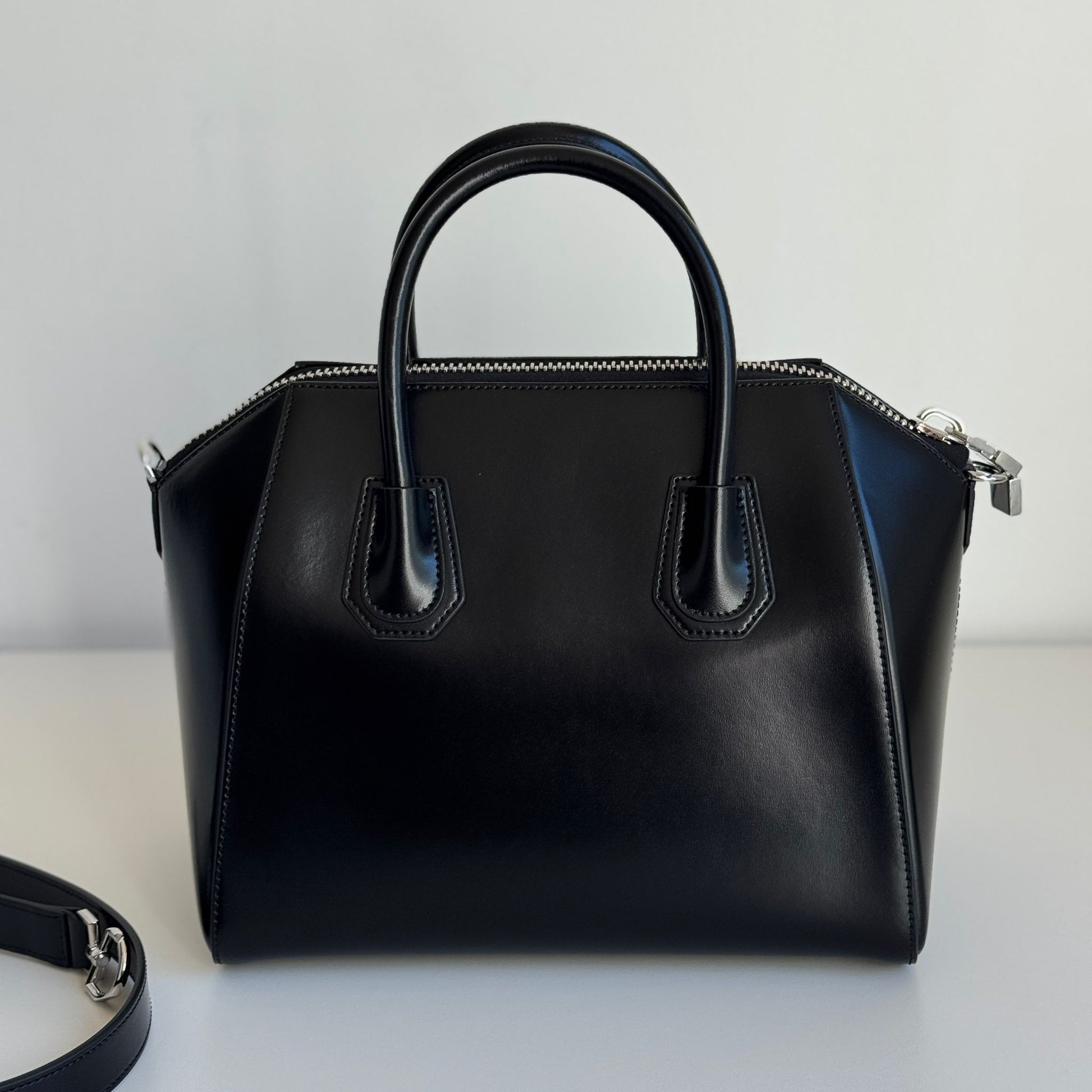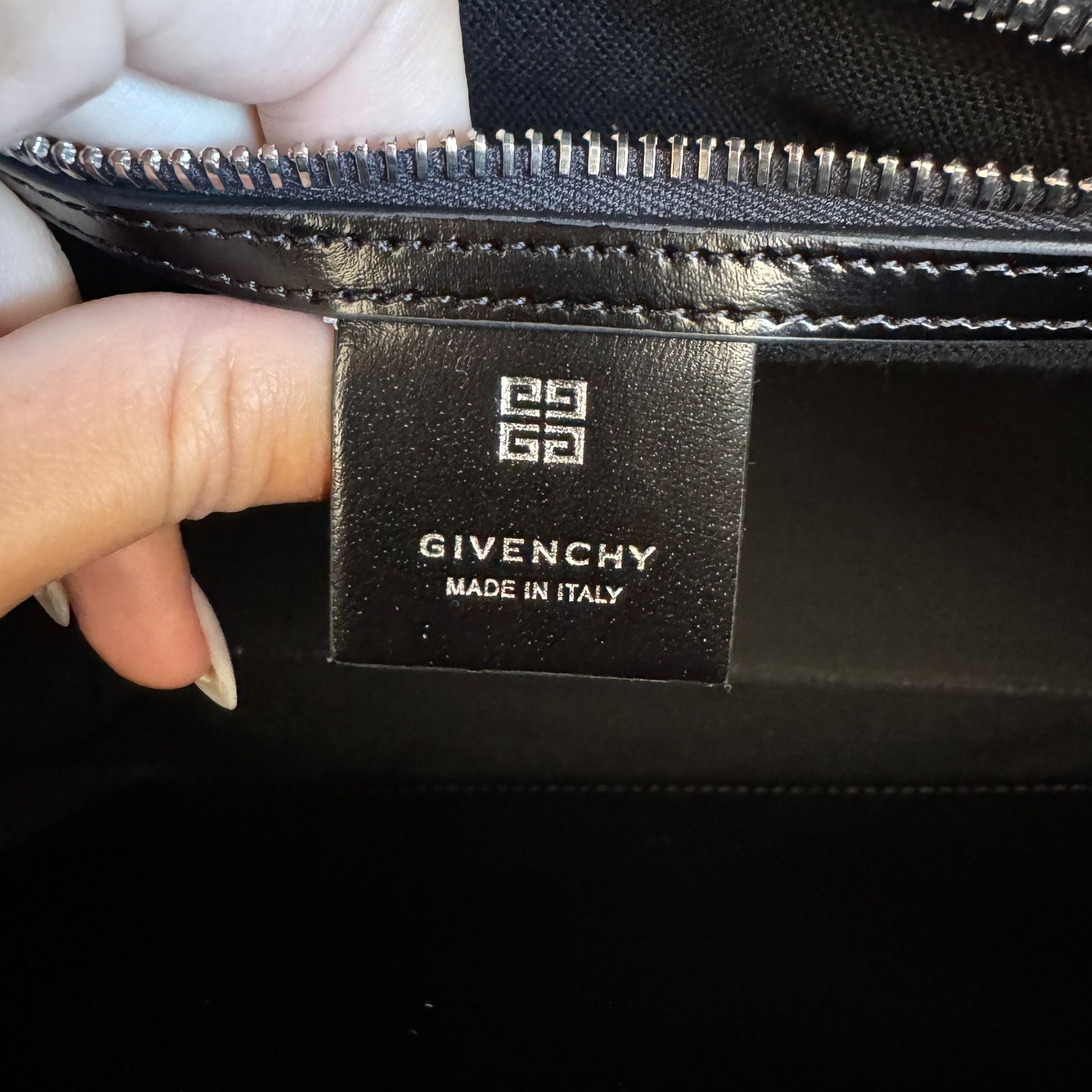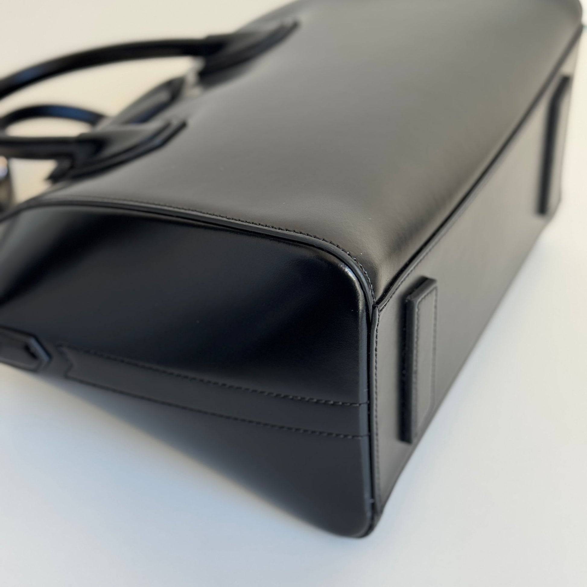 Stupenda borsa di Givenchy modello Medium Antigona in pelle nera lucida con hardware argento. Si indossa a mano e a spalla. La tracolla è rimovibile ma non regolabile.