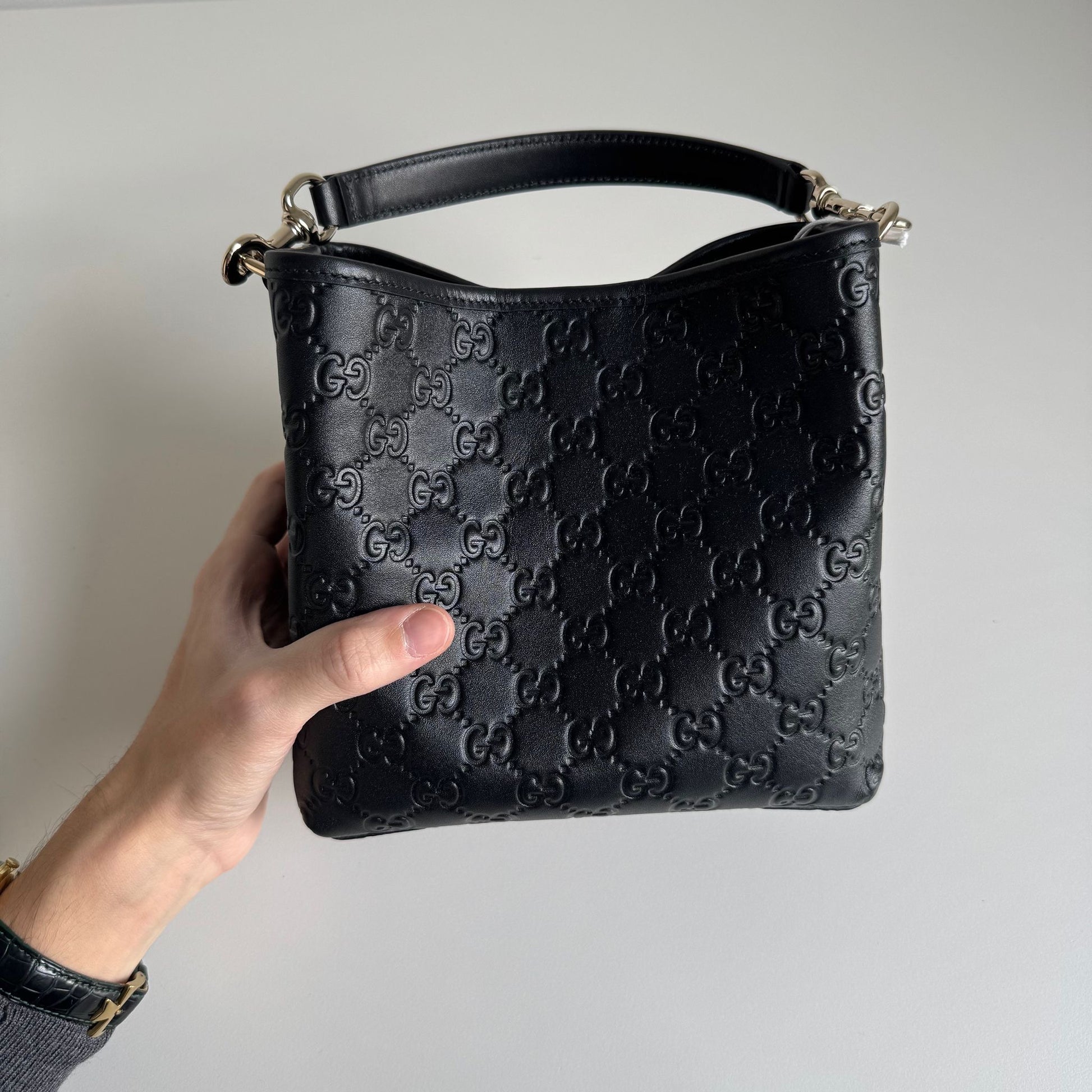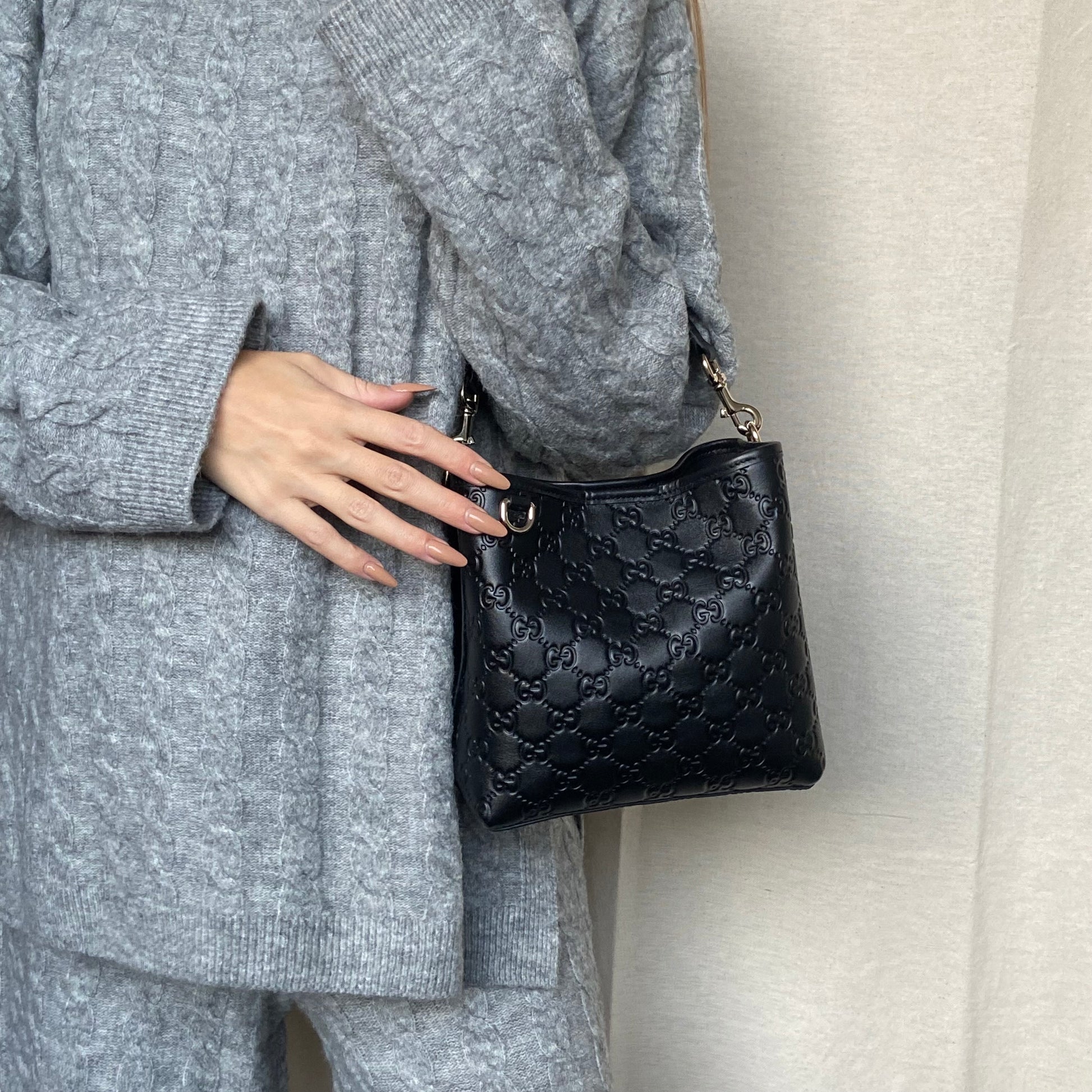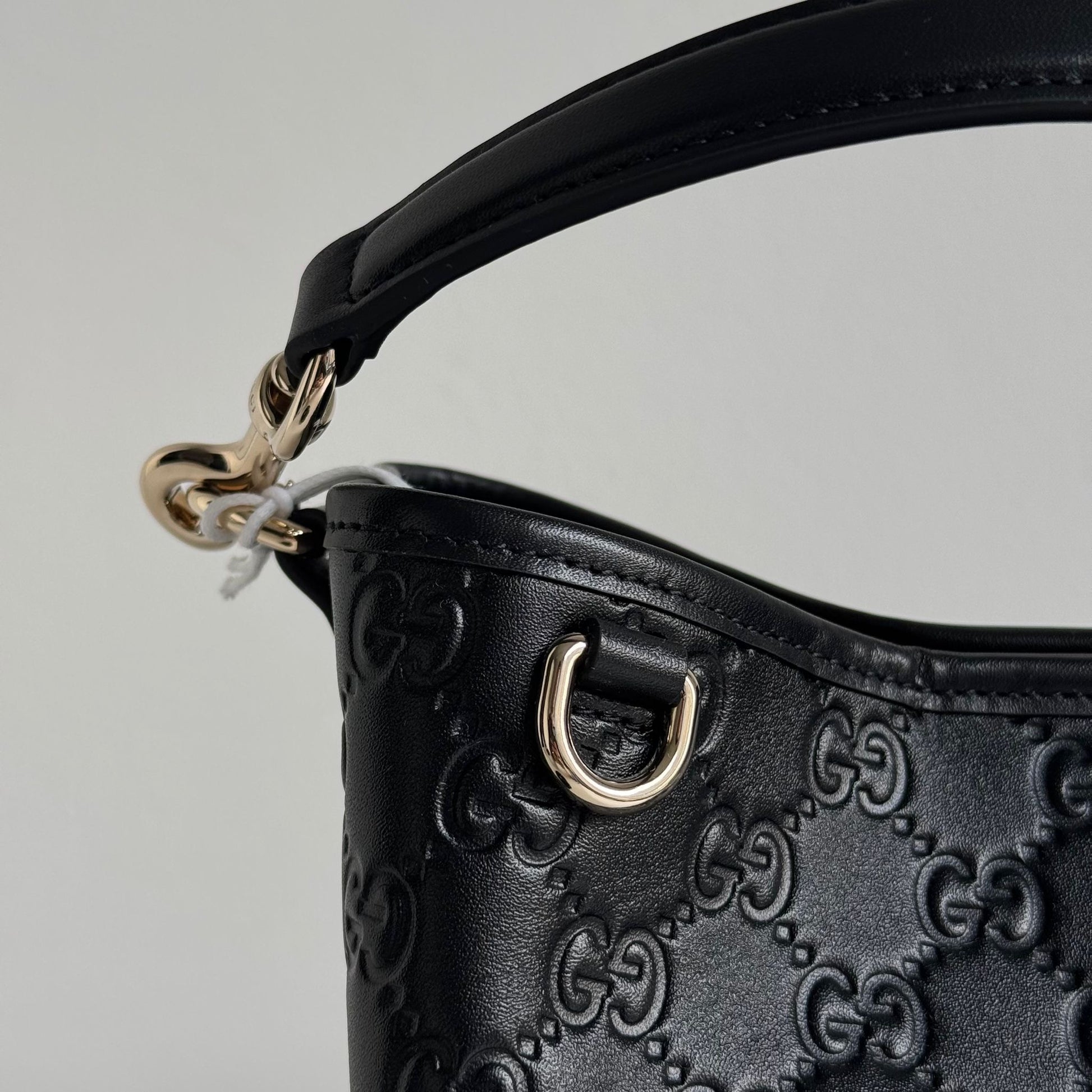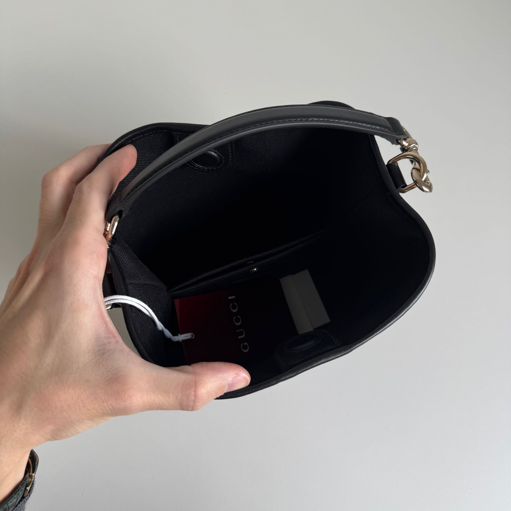 Meraviglioso secchiello Gucci modello Emblem Piccola in pelle Monogram GG nera con hardware oro. Si indossa a mano o a tracolla, la tracolla è regolabile e rimovibile.