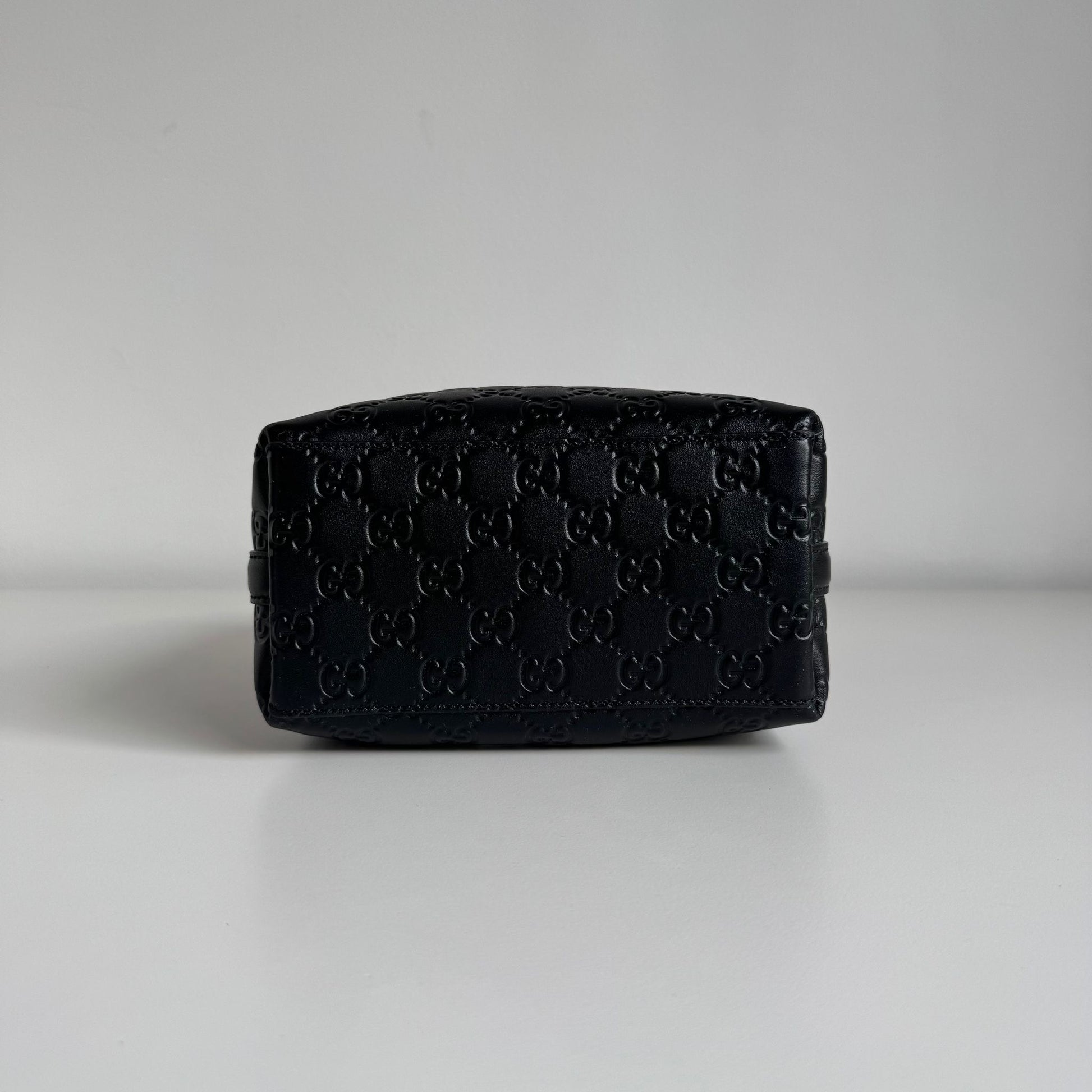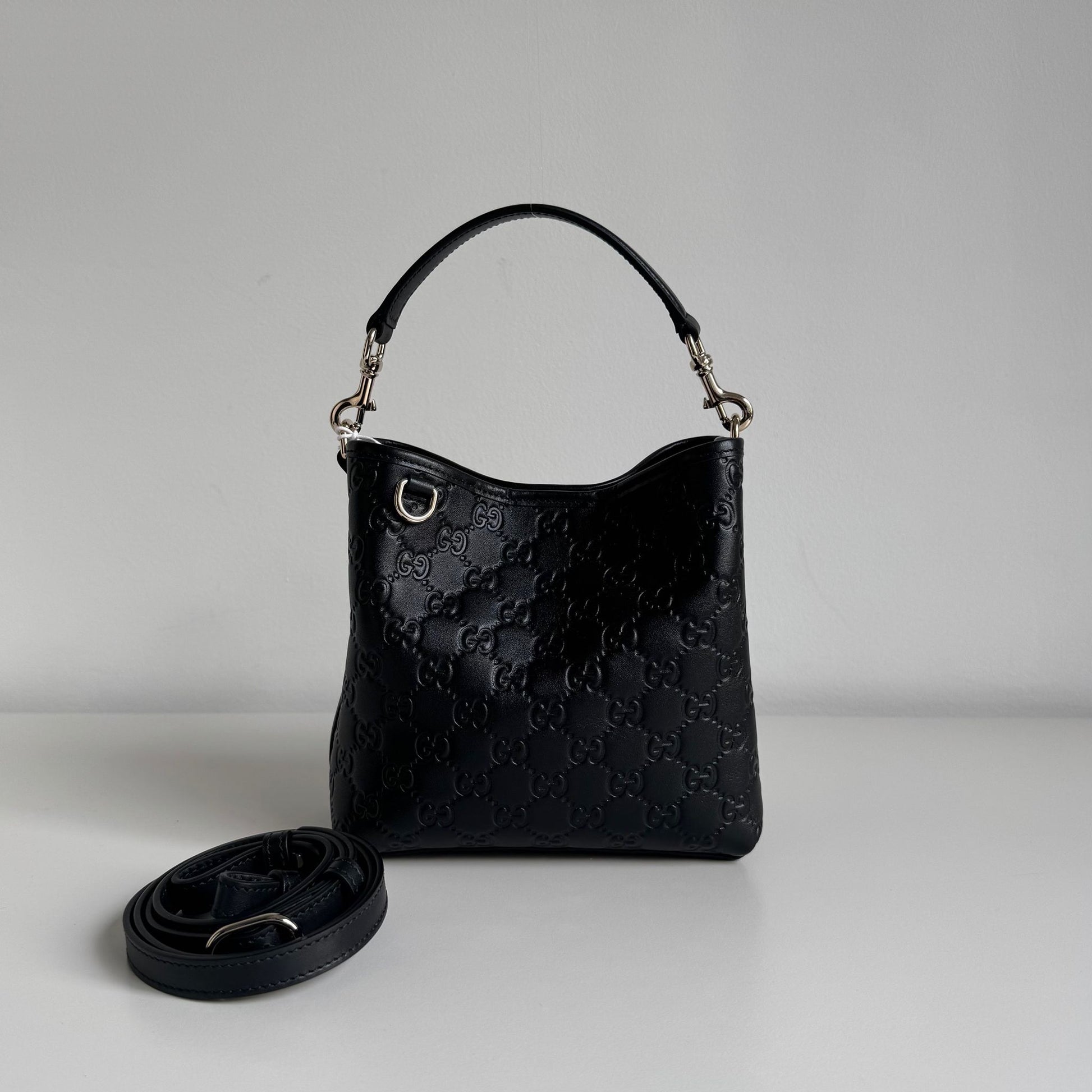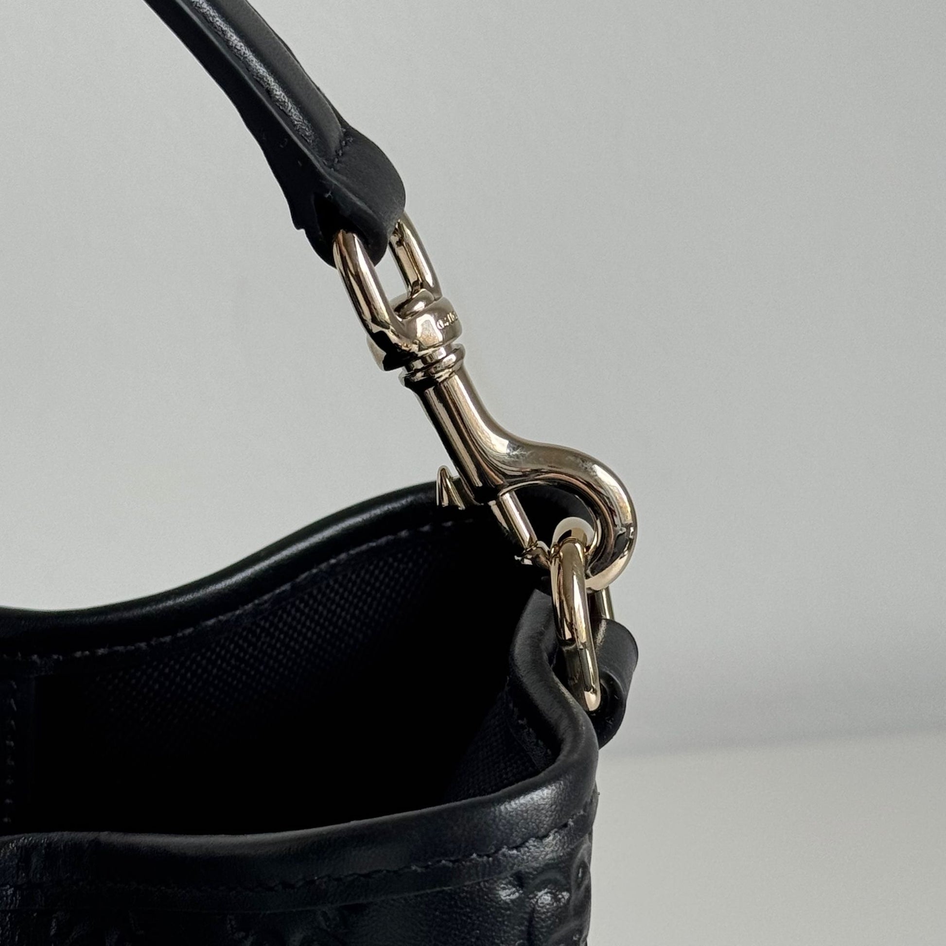 Meraviglioso secchiello Gucci modello Emblem Piccola in pelle Monogram GG nera con hardware oro. Si indossa a mano o a tracolla, la tracolla è regolabile e rimovibile.