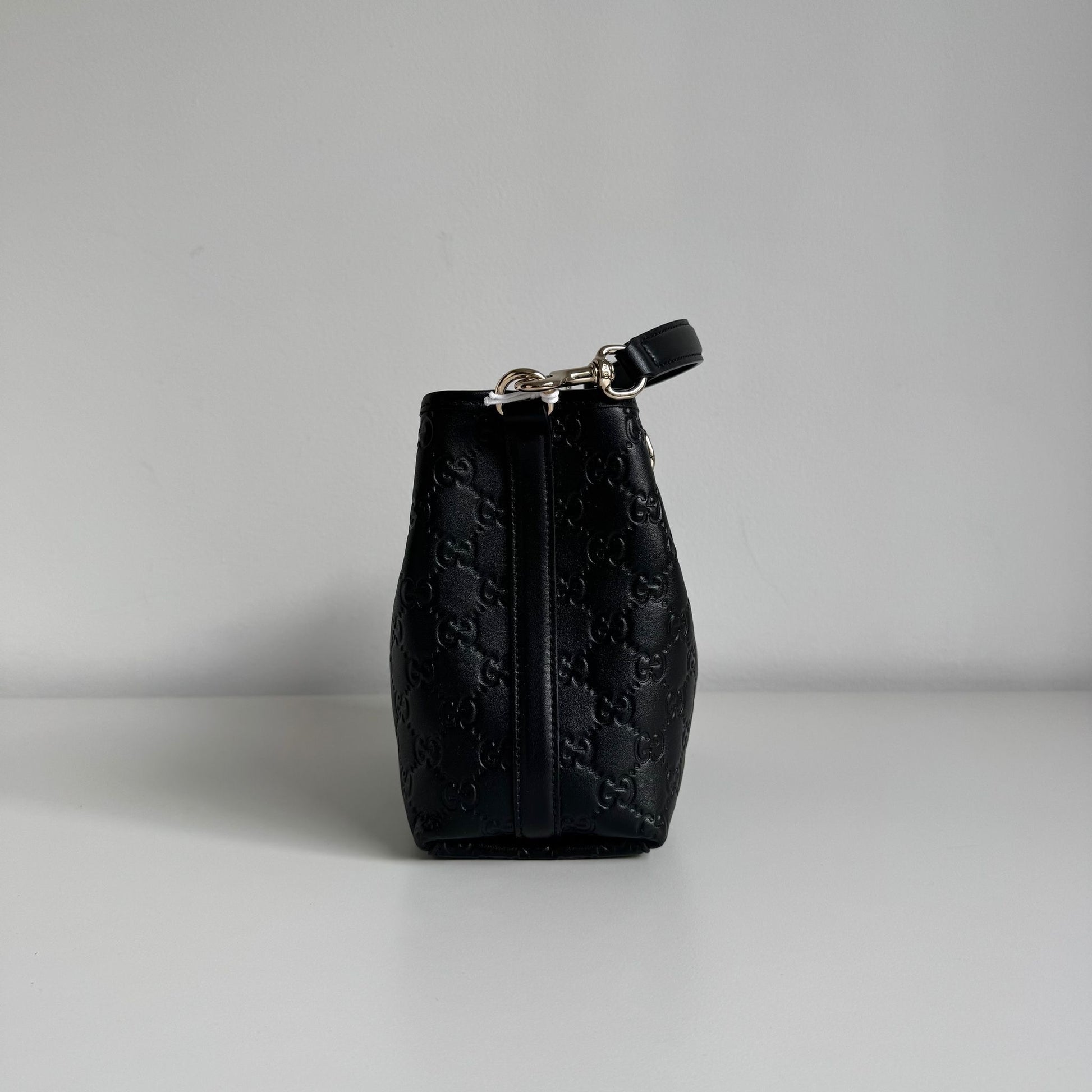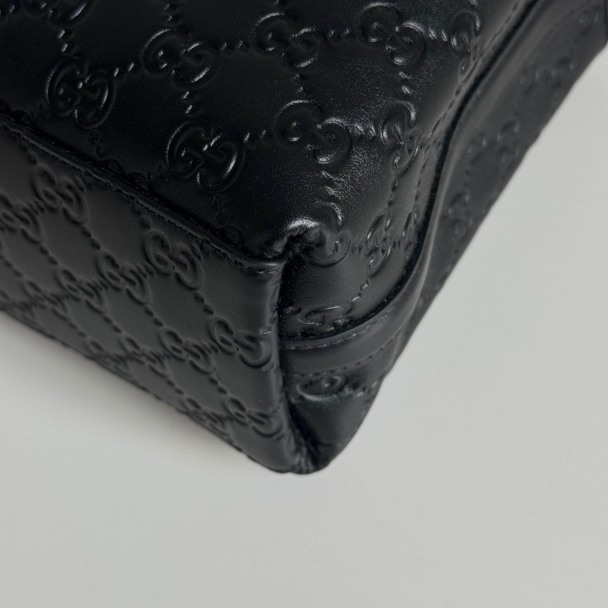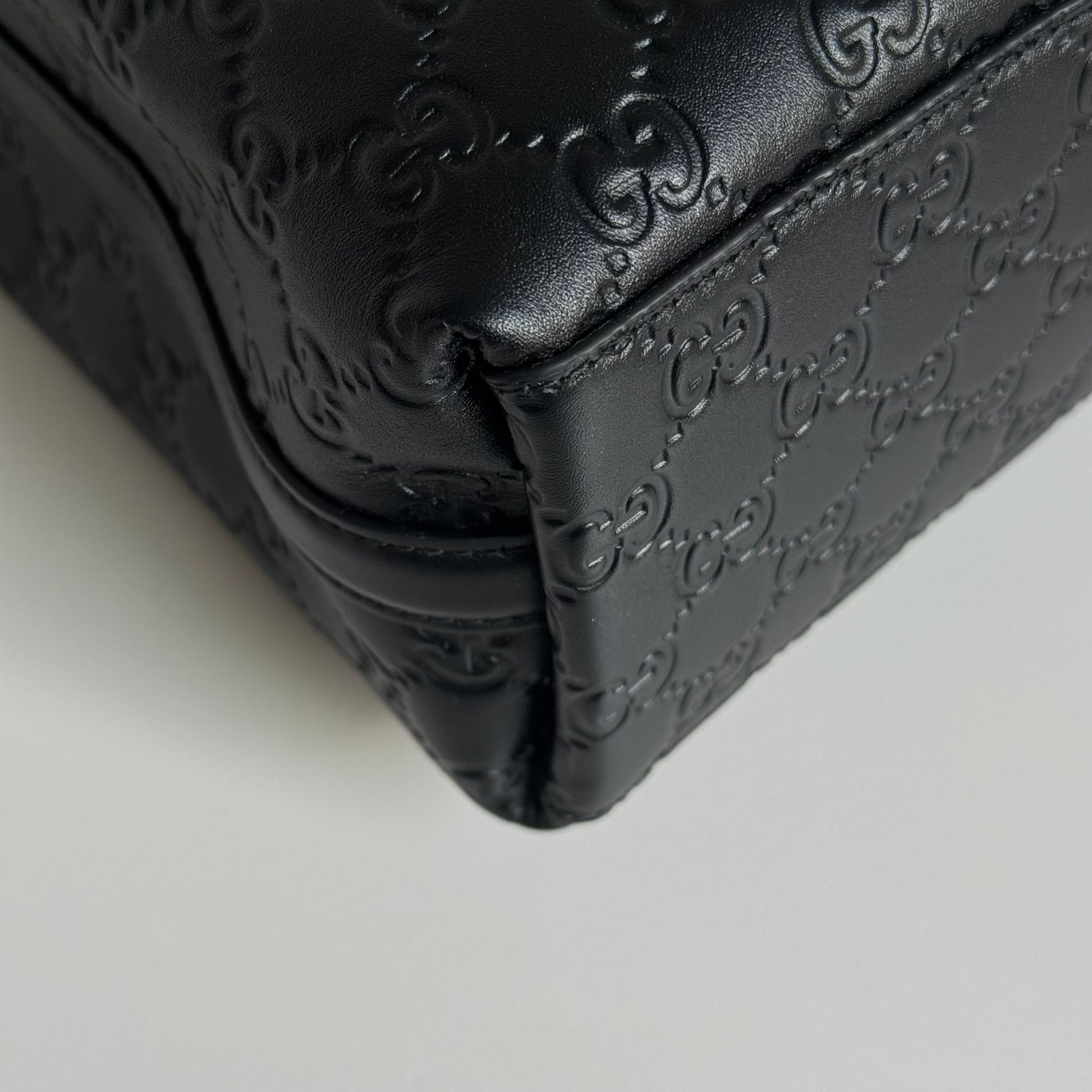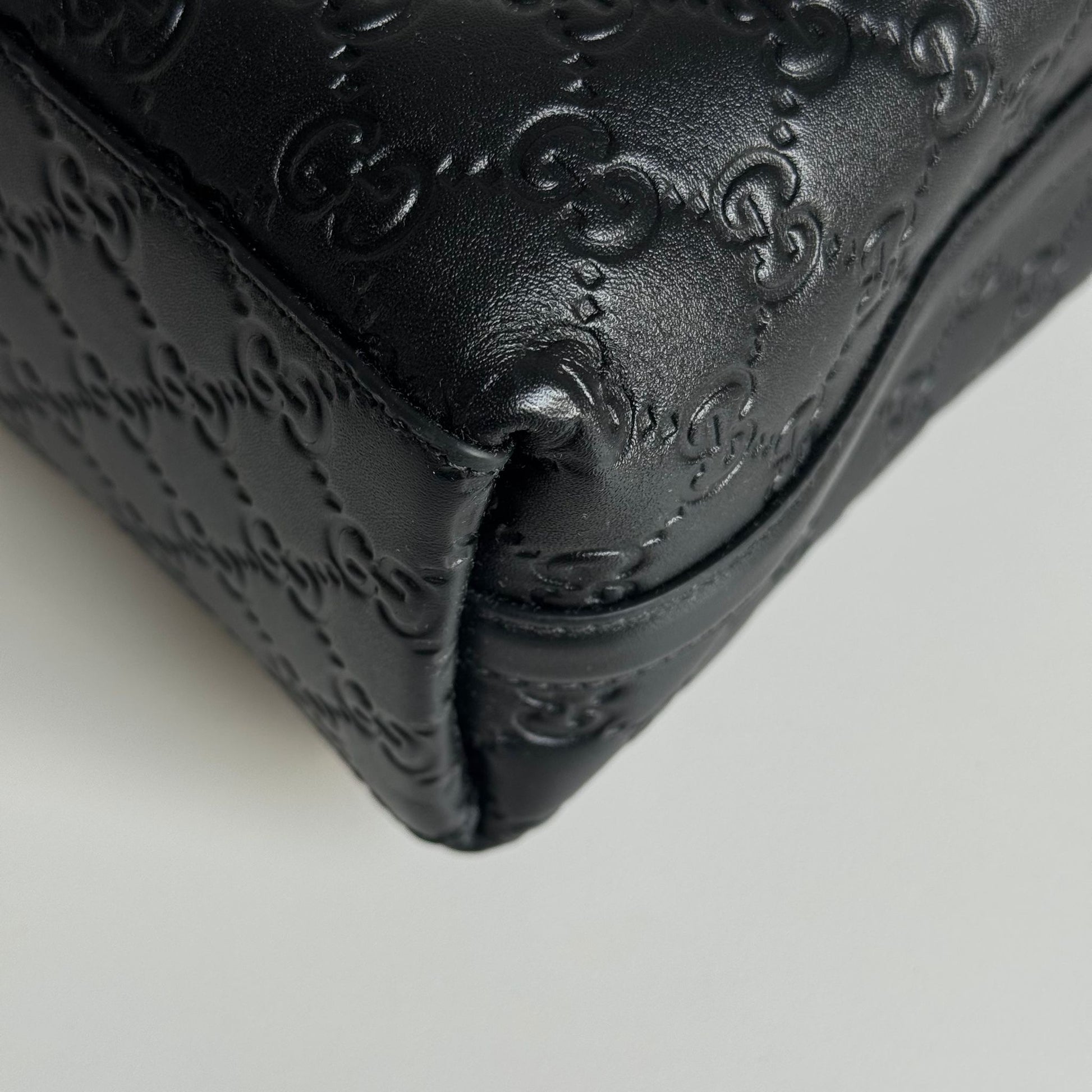 Meraviglioso secchiello Gucci modello Emblem Piccola in pelle Monogram GG nera con hardware oro. Si indossa a mano o a tracolla, la tracolla è regolabile e rimovibile.