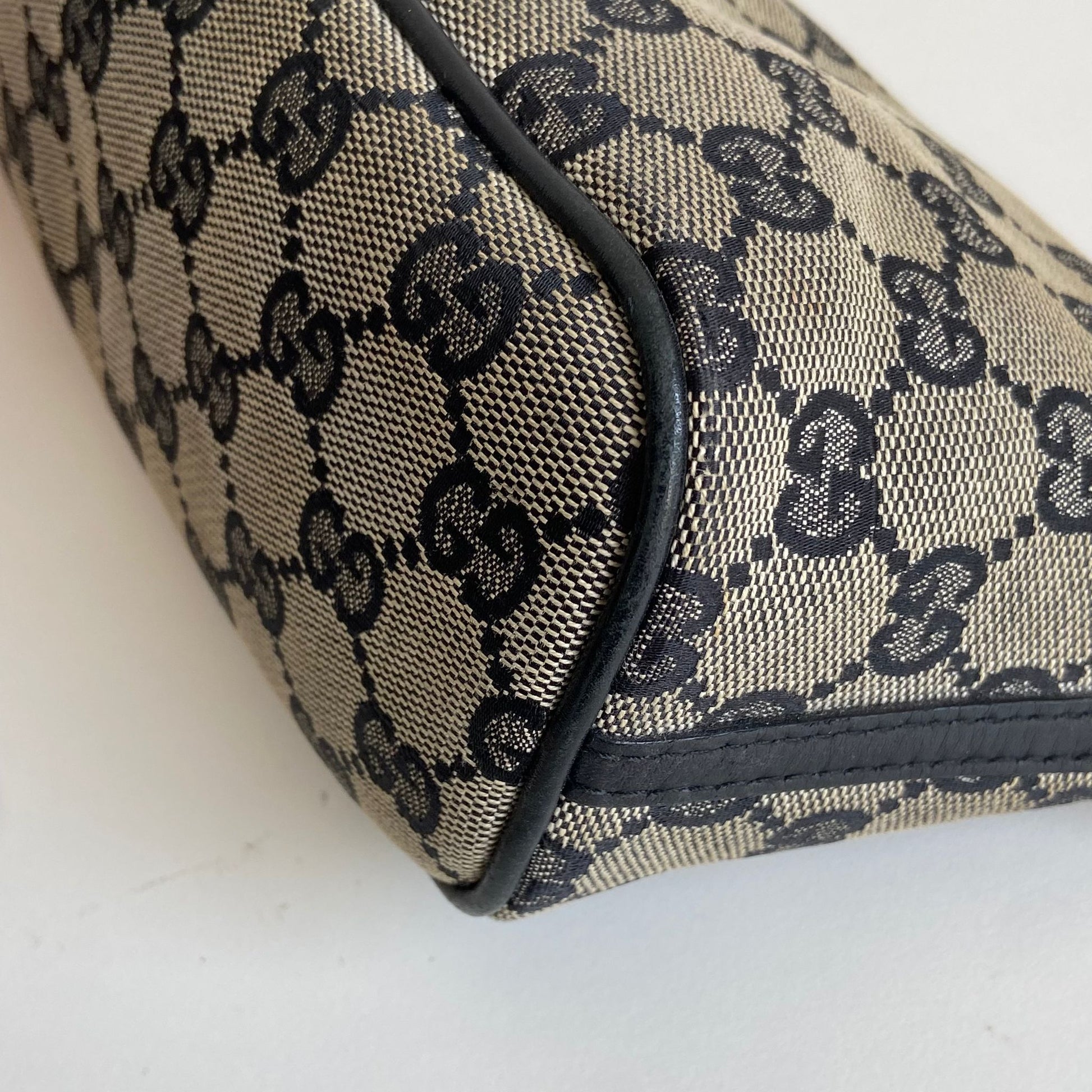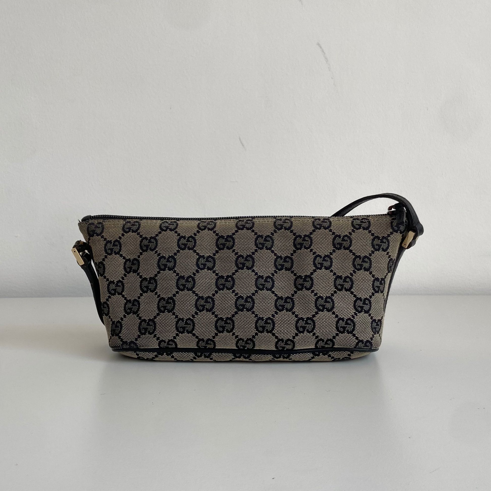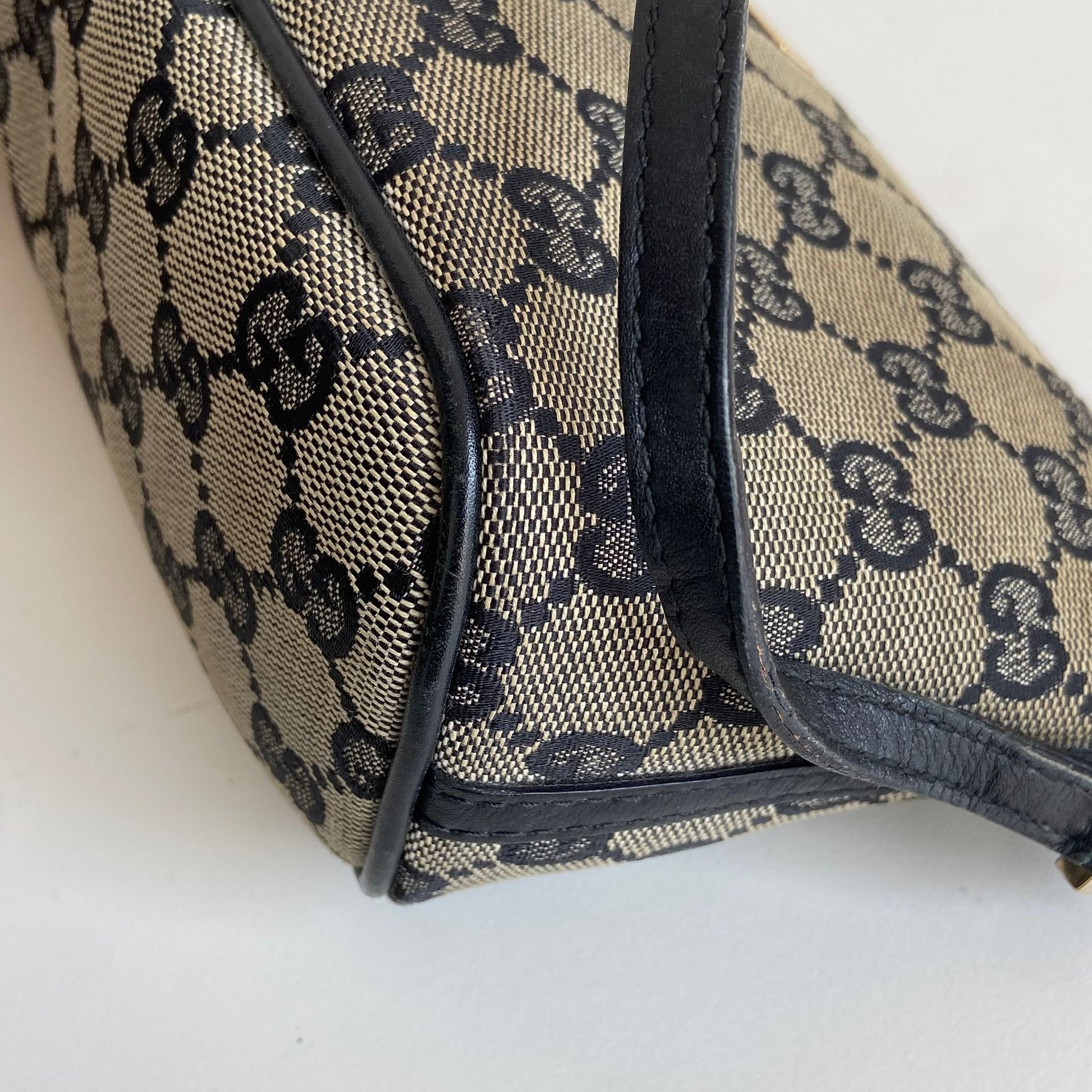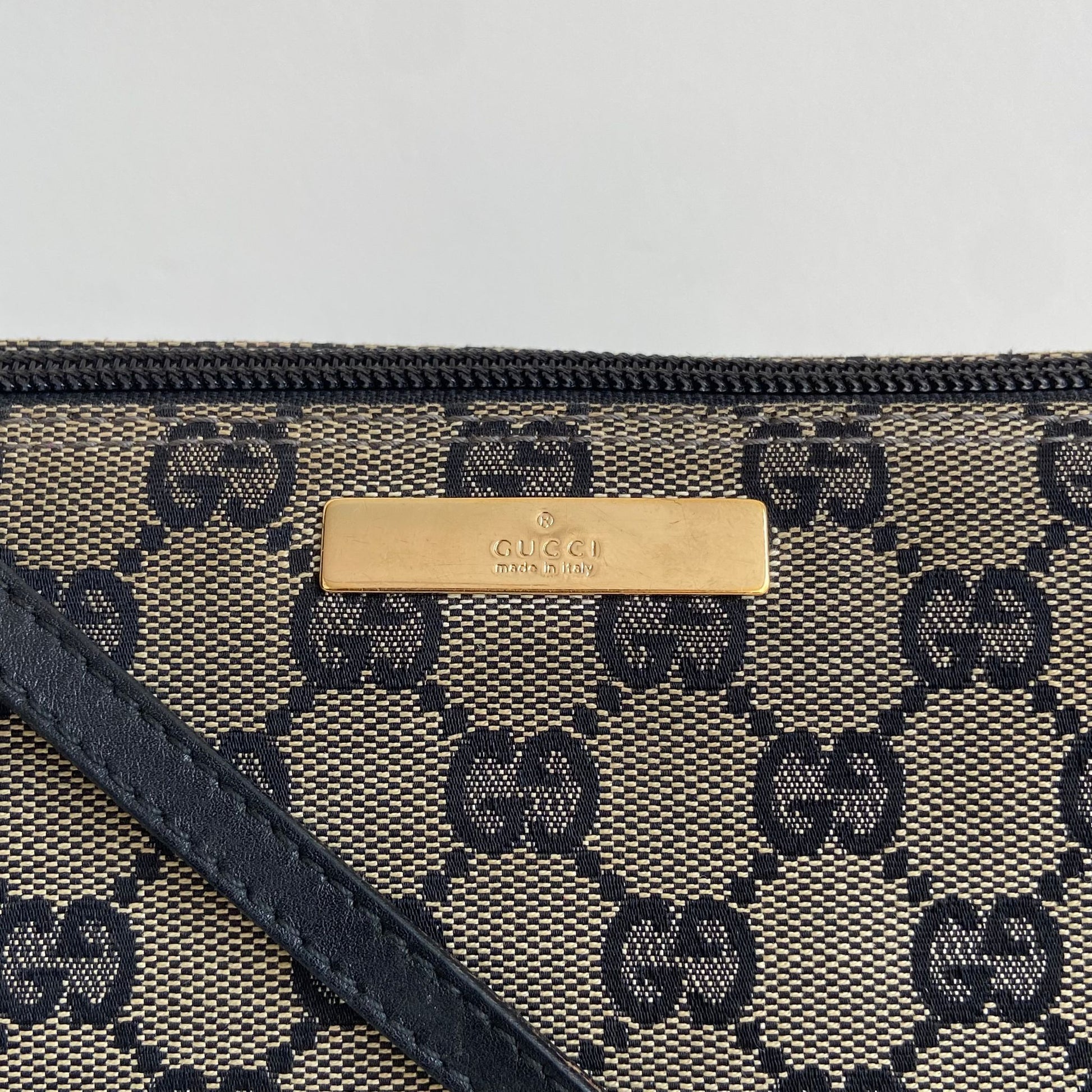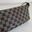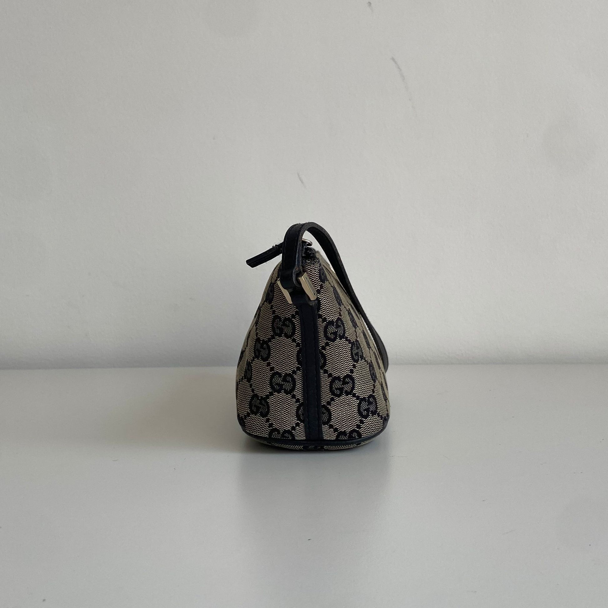 Stupenda minibag Gucci modello Barchetta in tela GG beige e blu navy con inserti in pelle blu navy e hardware oro. Si indossa a spalla.