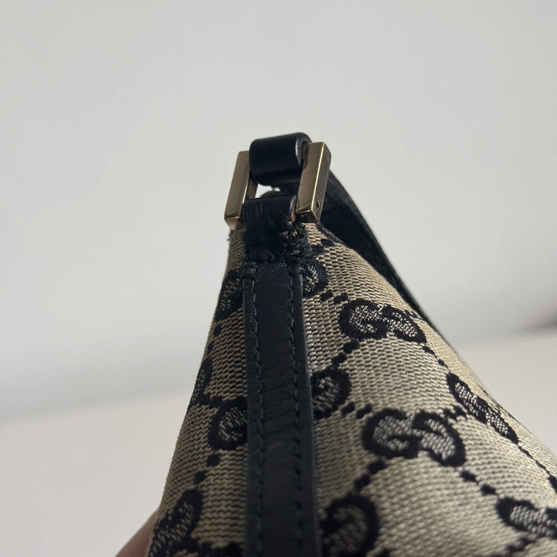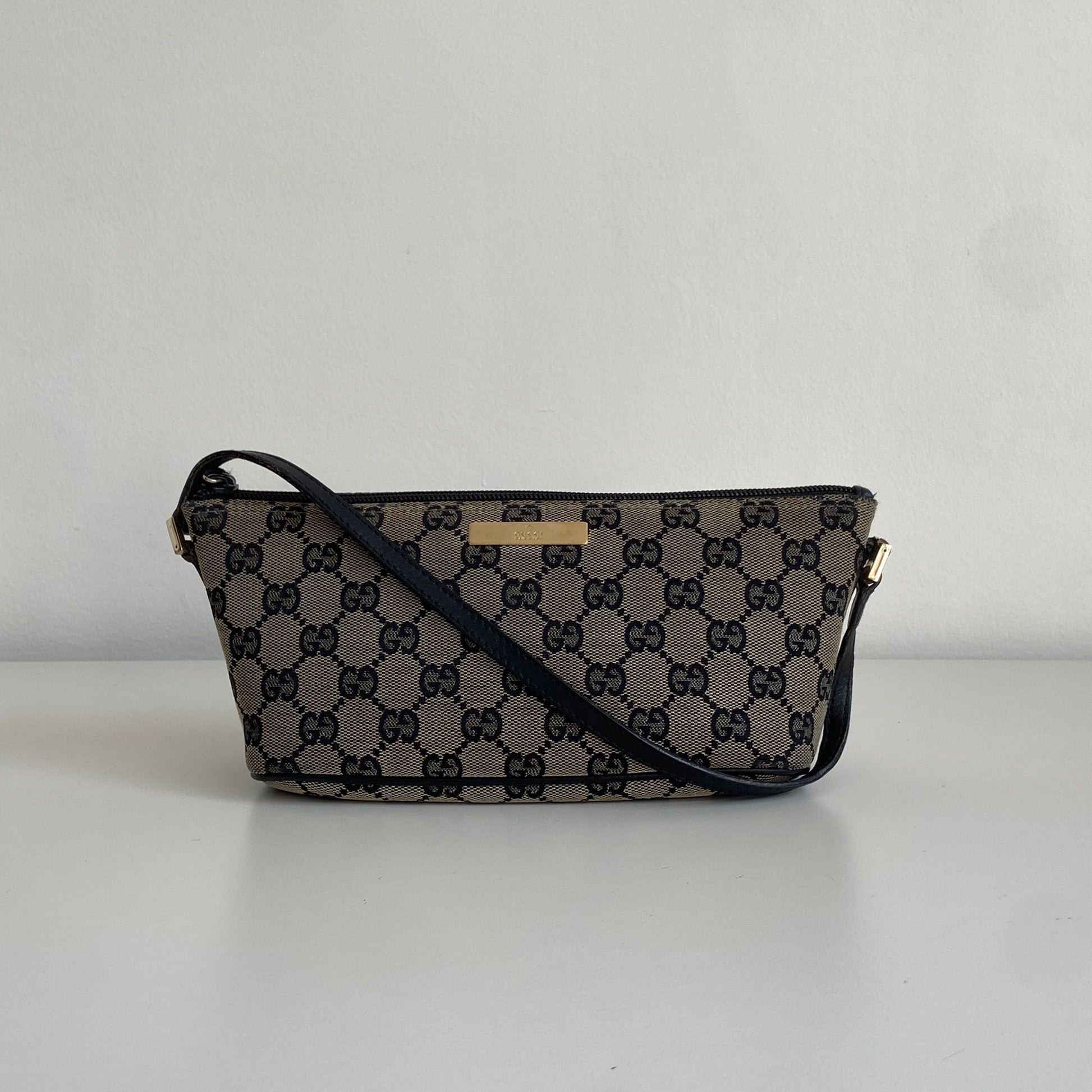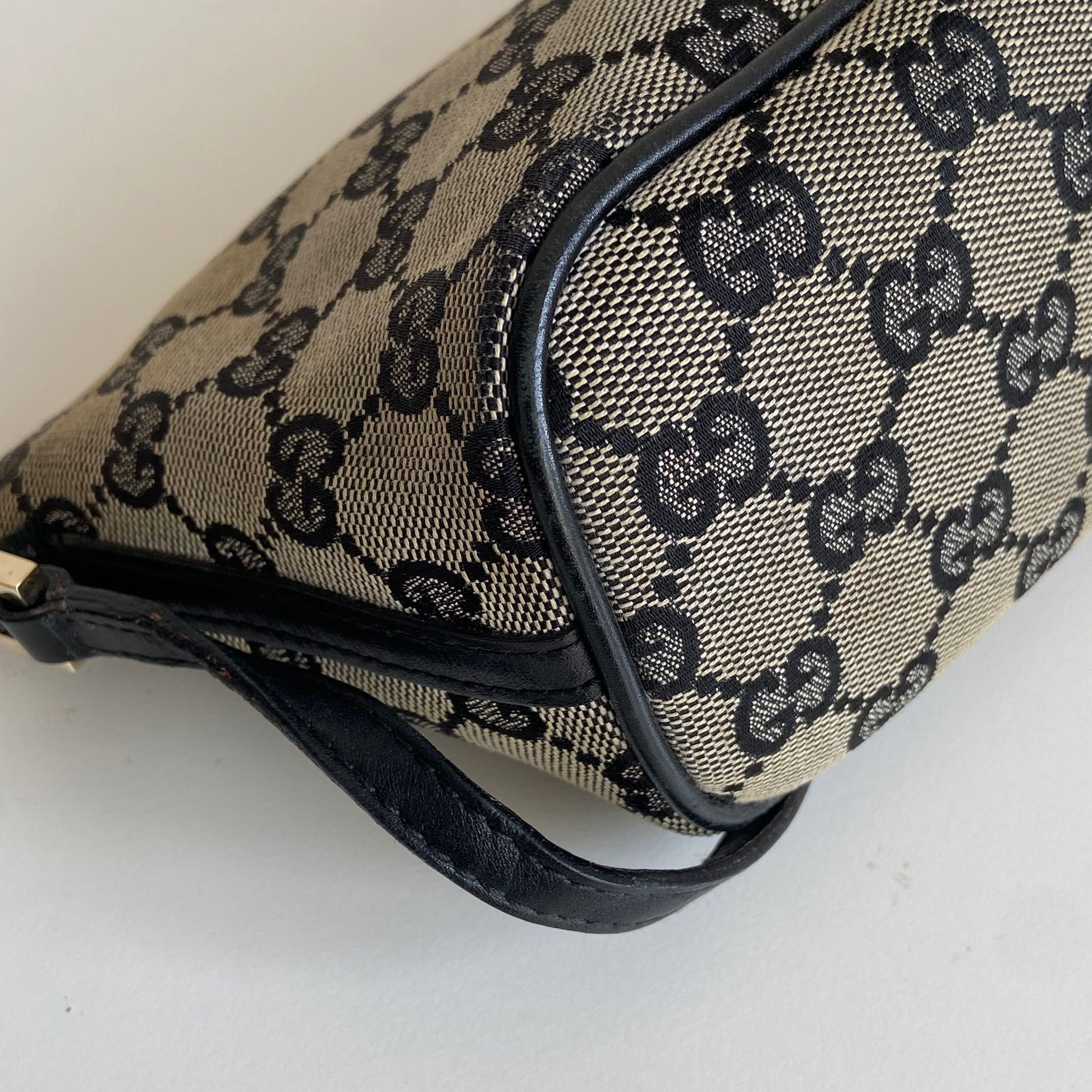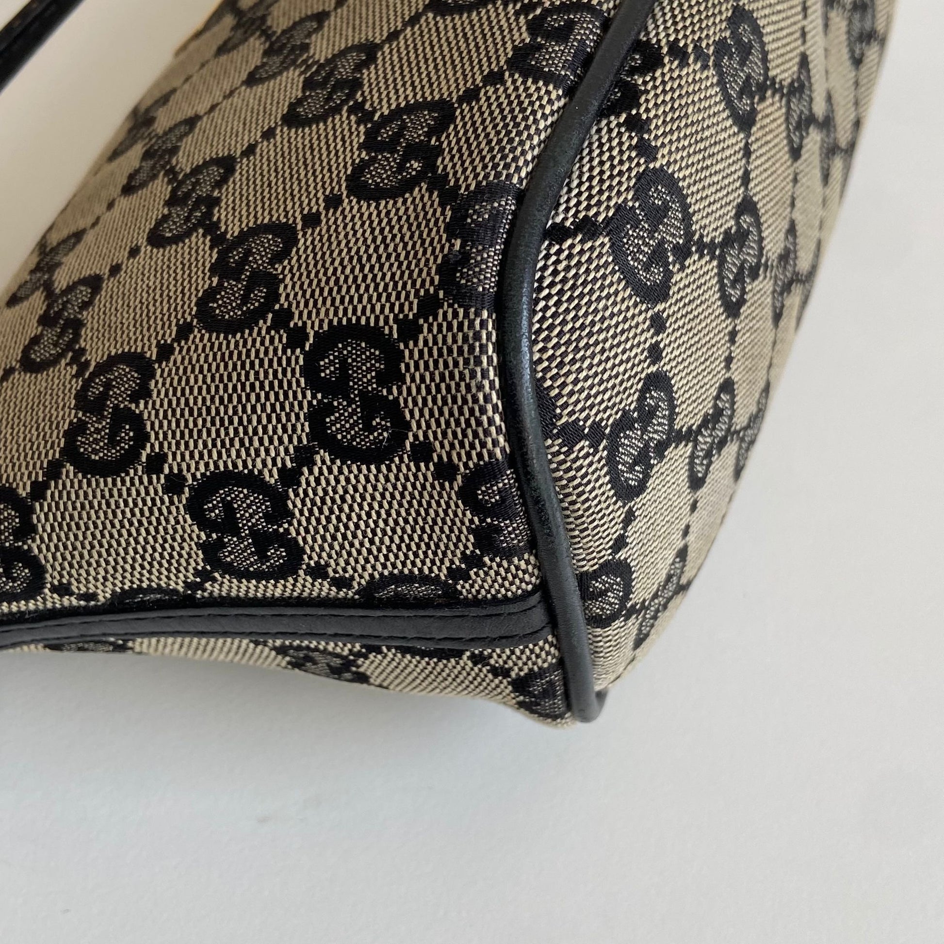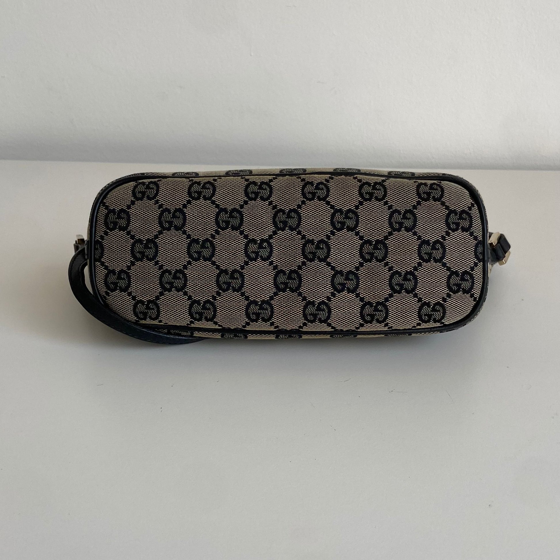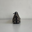 Stupenda minibag Gucci modello Barchetta in tela GG beige e blu navy con inserti in pelle blu navy e hardware oro. Si indossa a spalla.