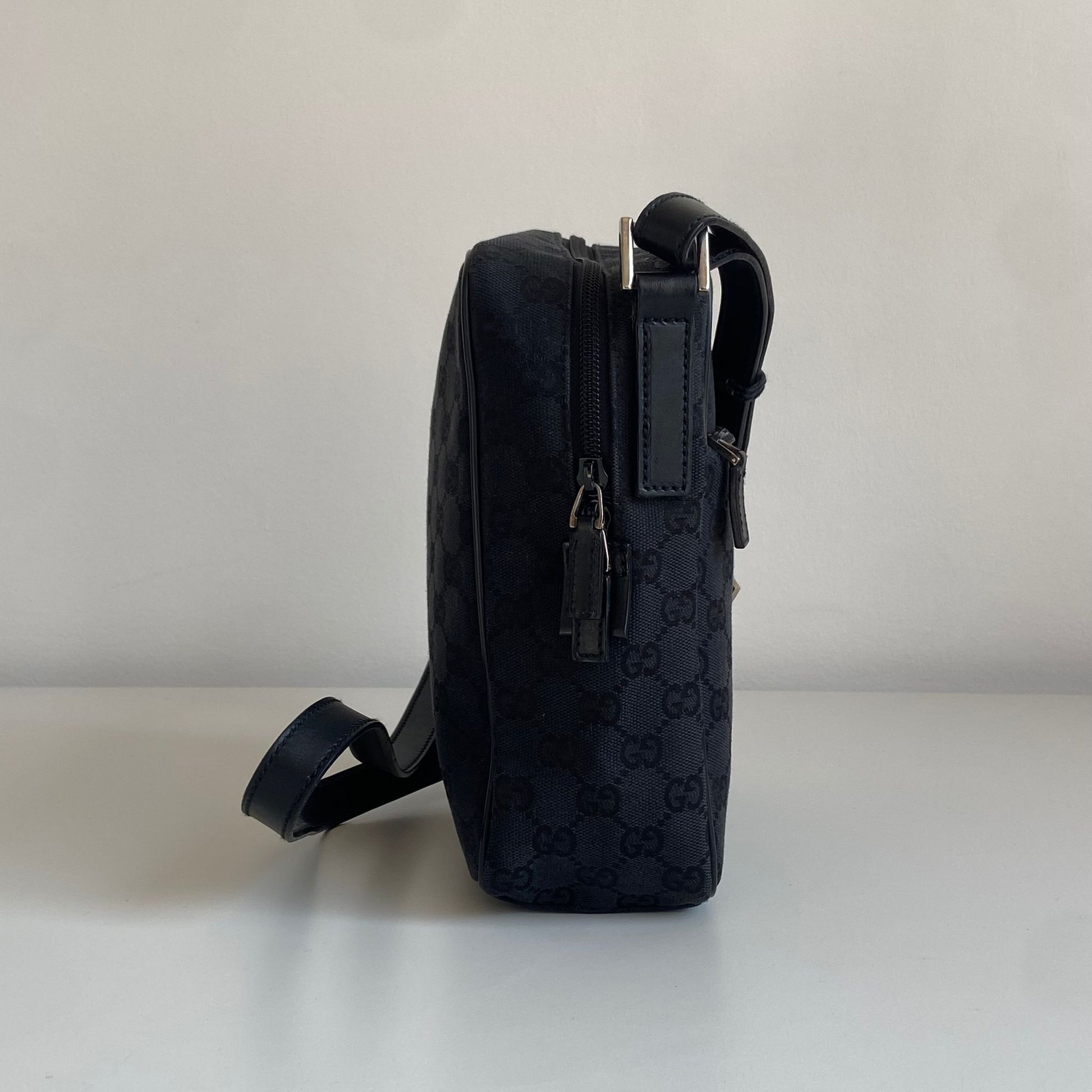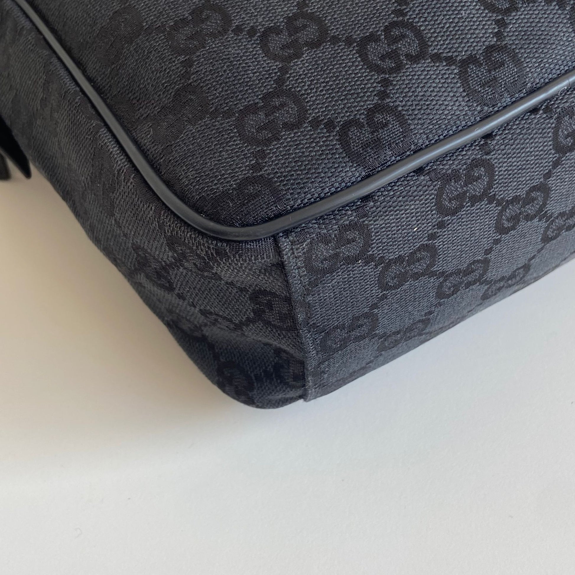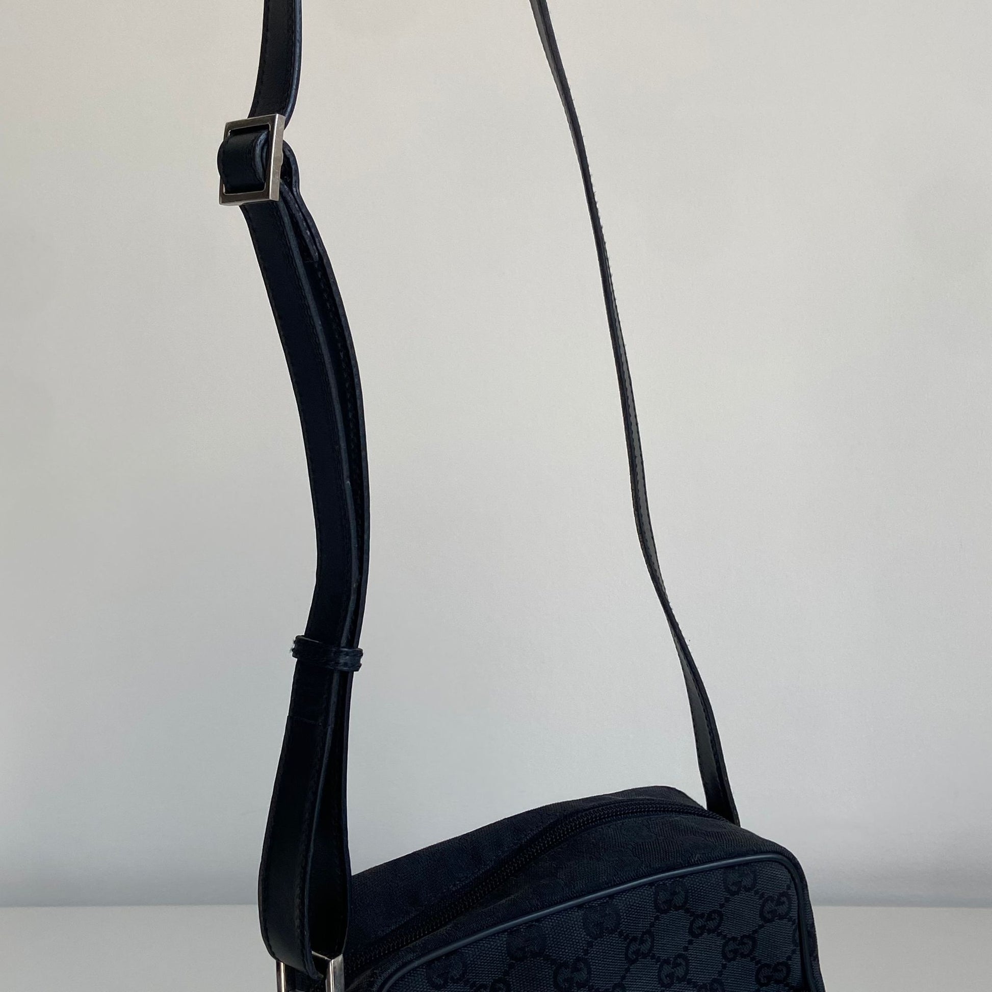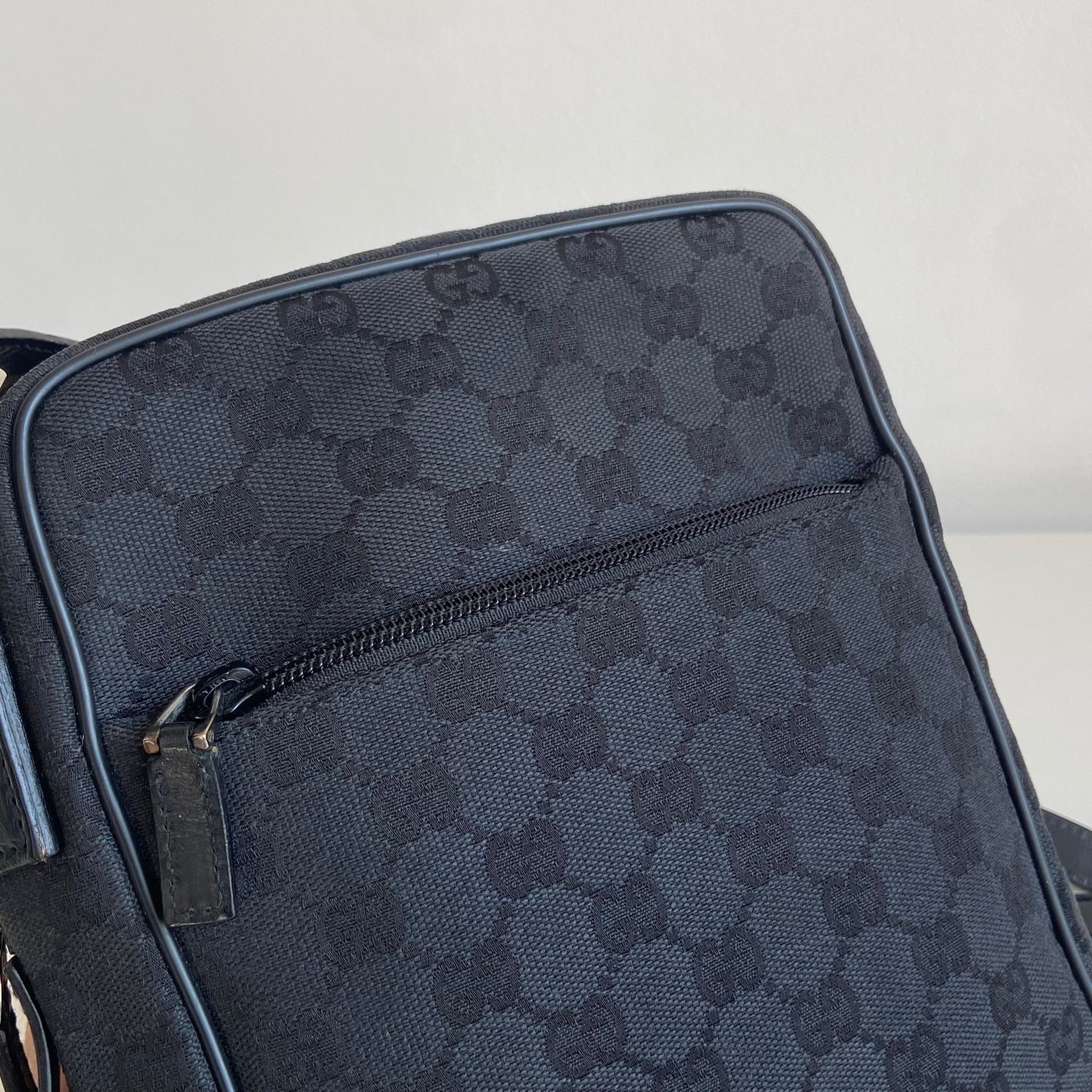 Bellissimo borsello Gucci in tela monogram GG e dettagli in pelle nera con hardware argento. Si indossa a tracolla.