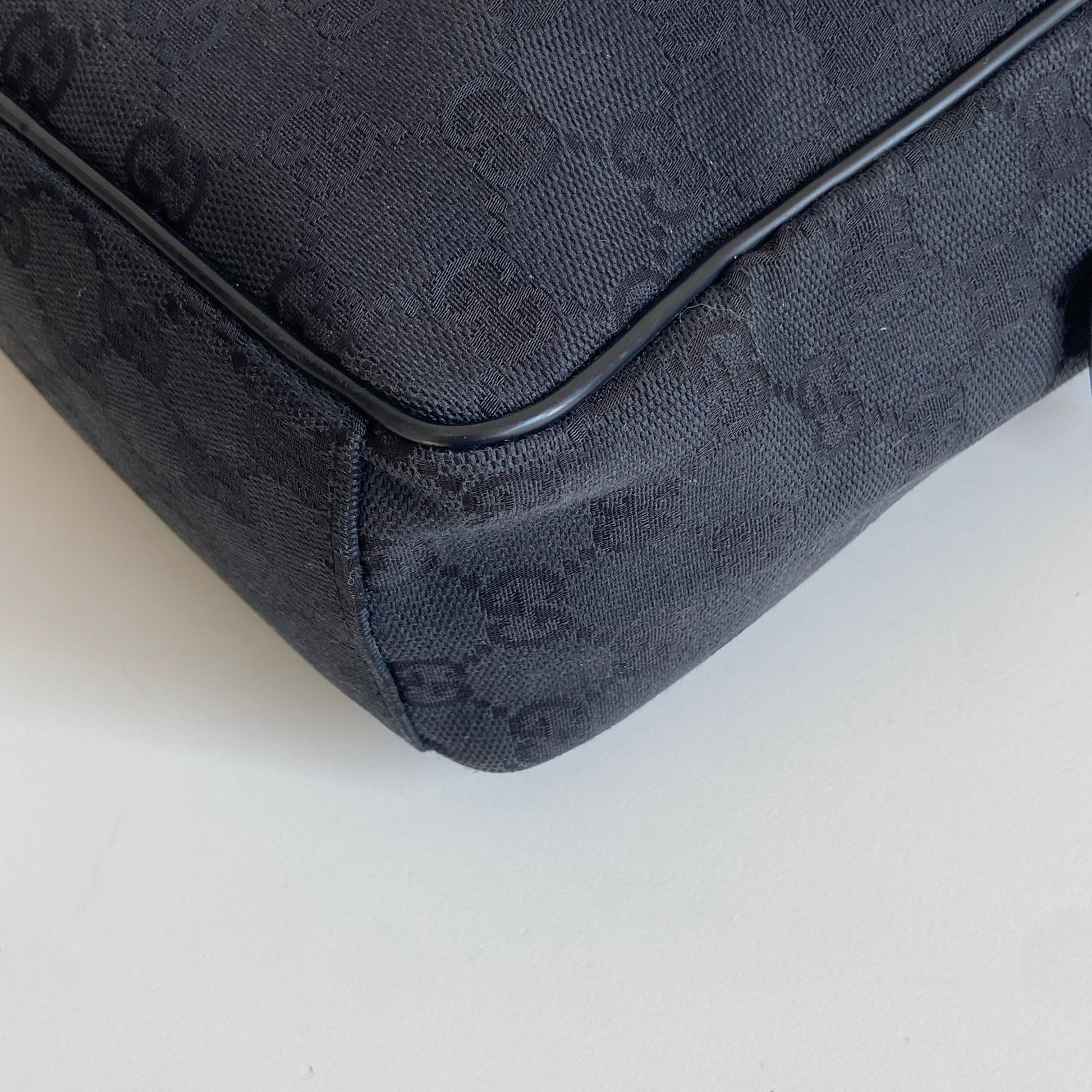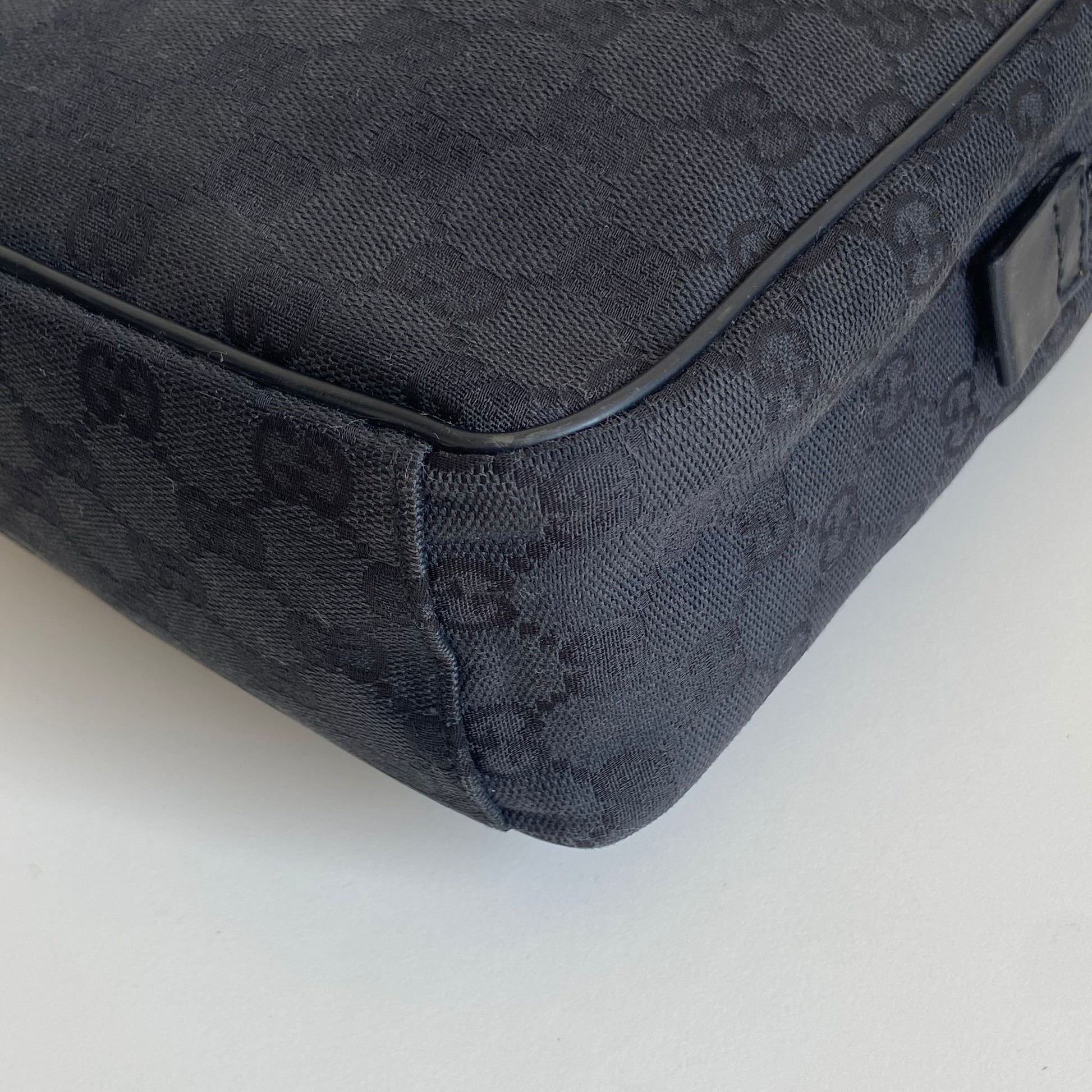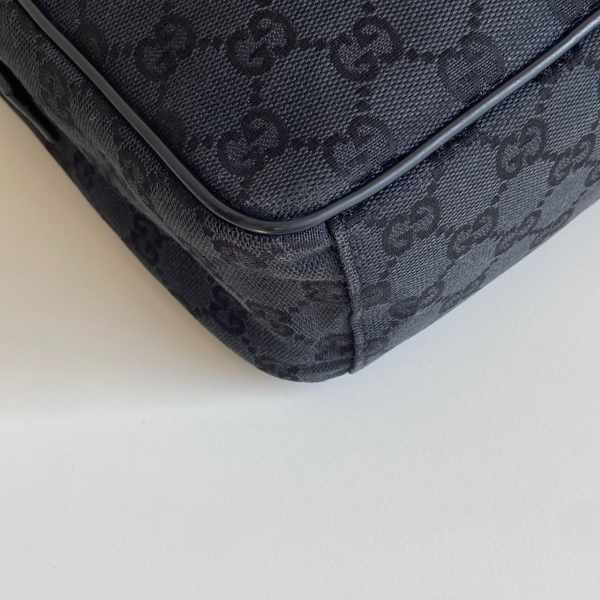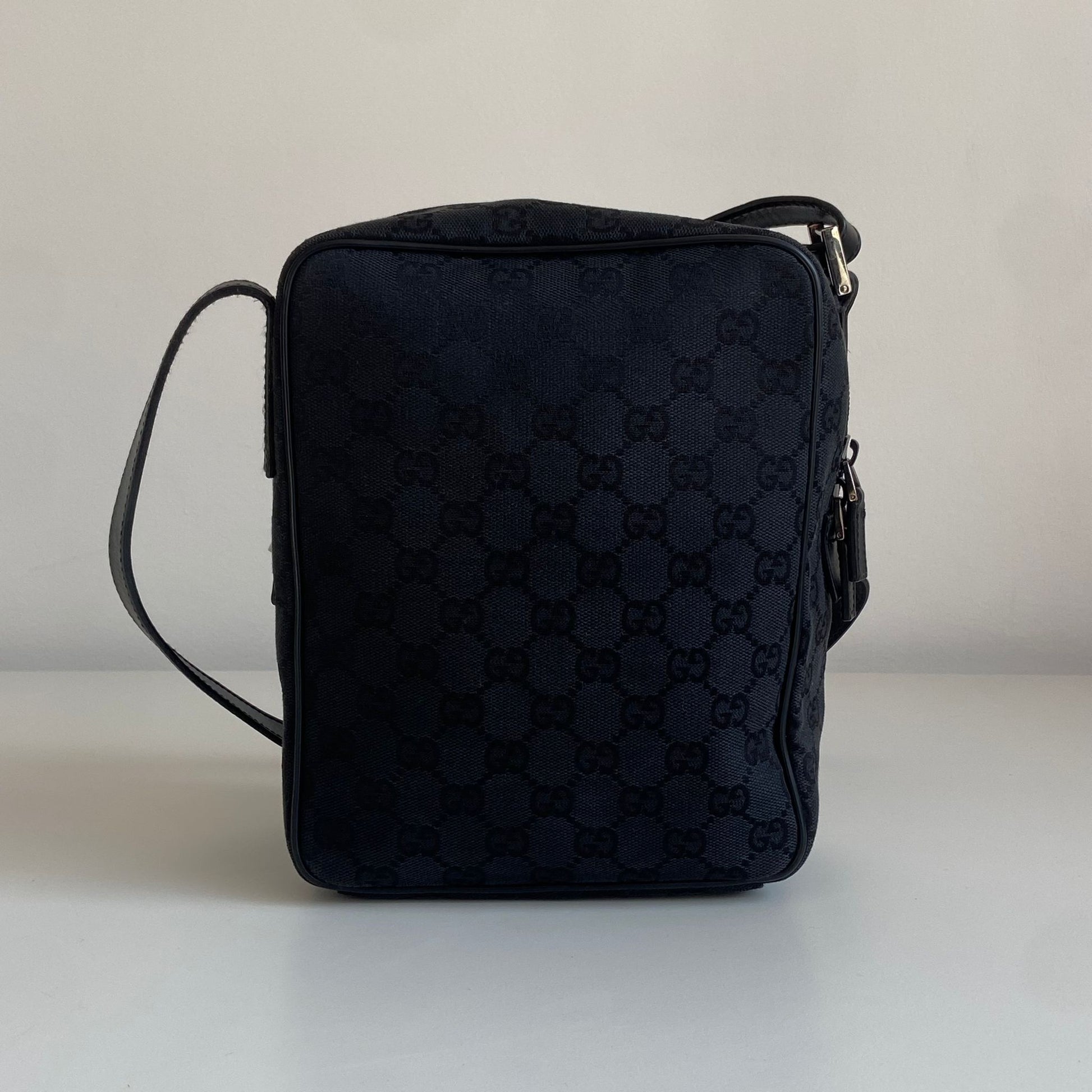 Bellissimo borsello Gucci in tela monogram GG e dettagli in pelle nera con hardware argento. Si indossa a tracolla.