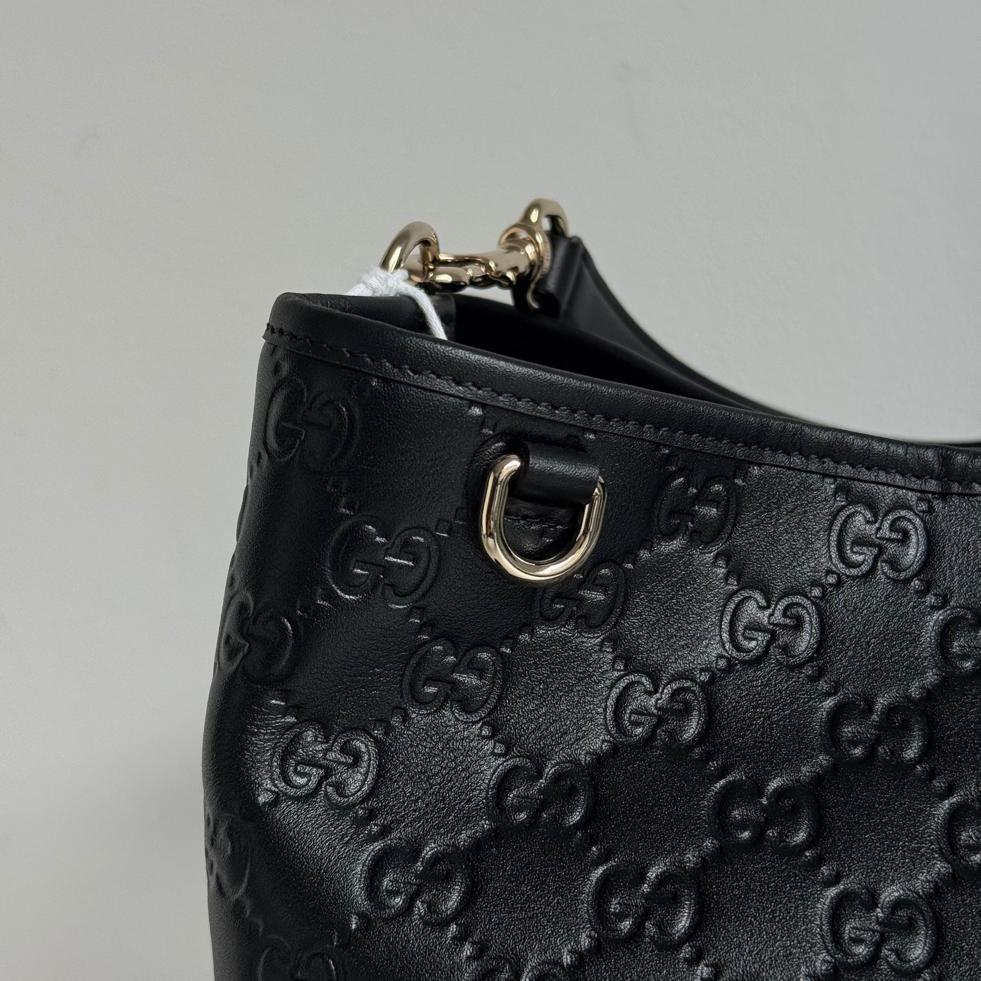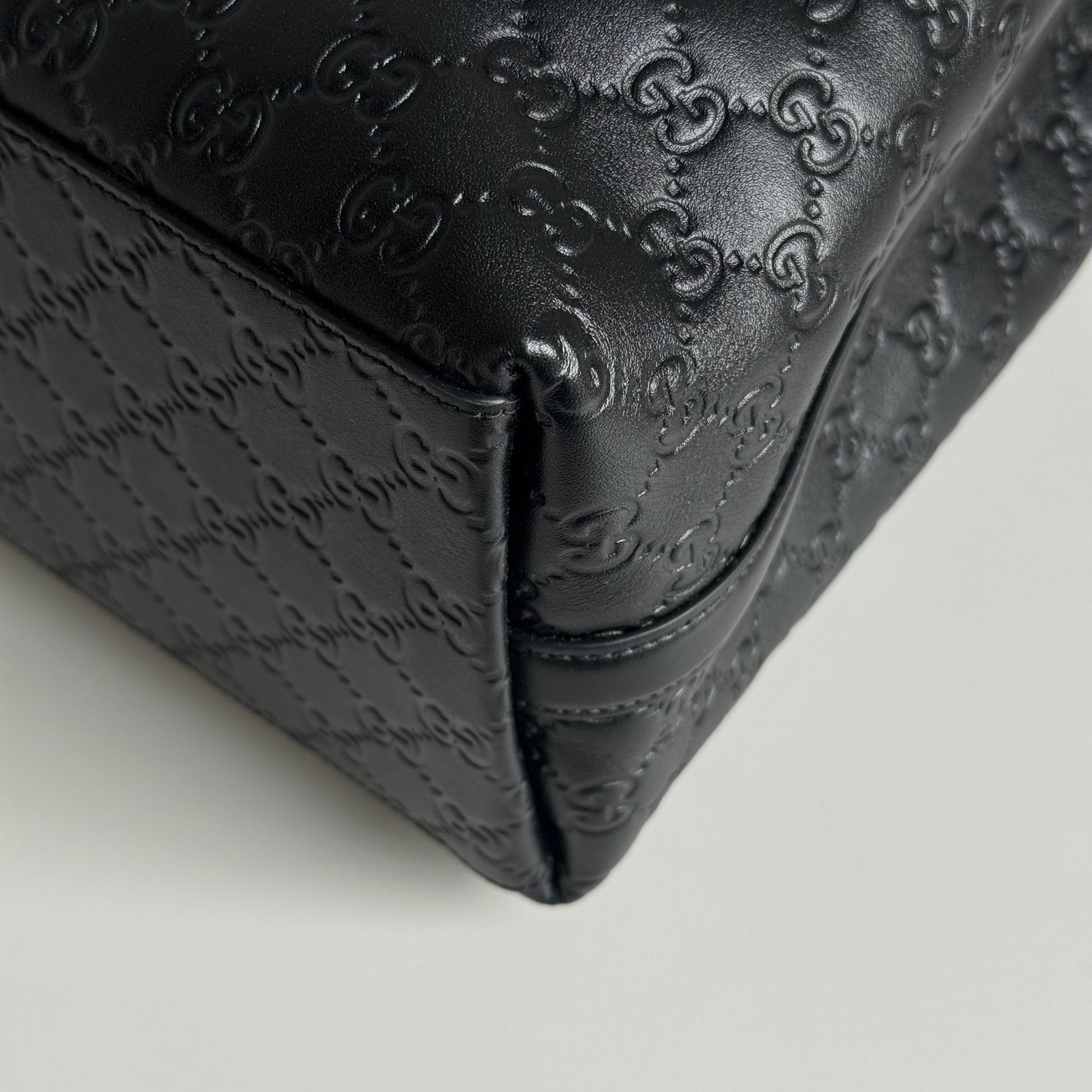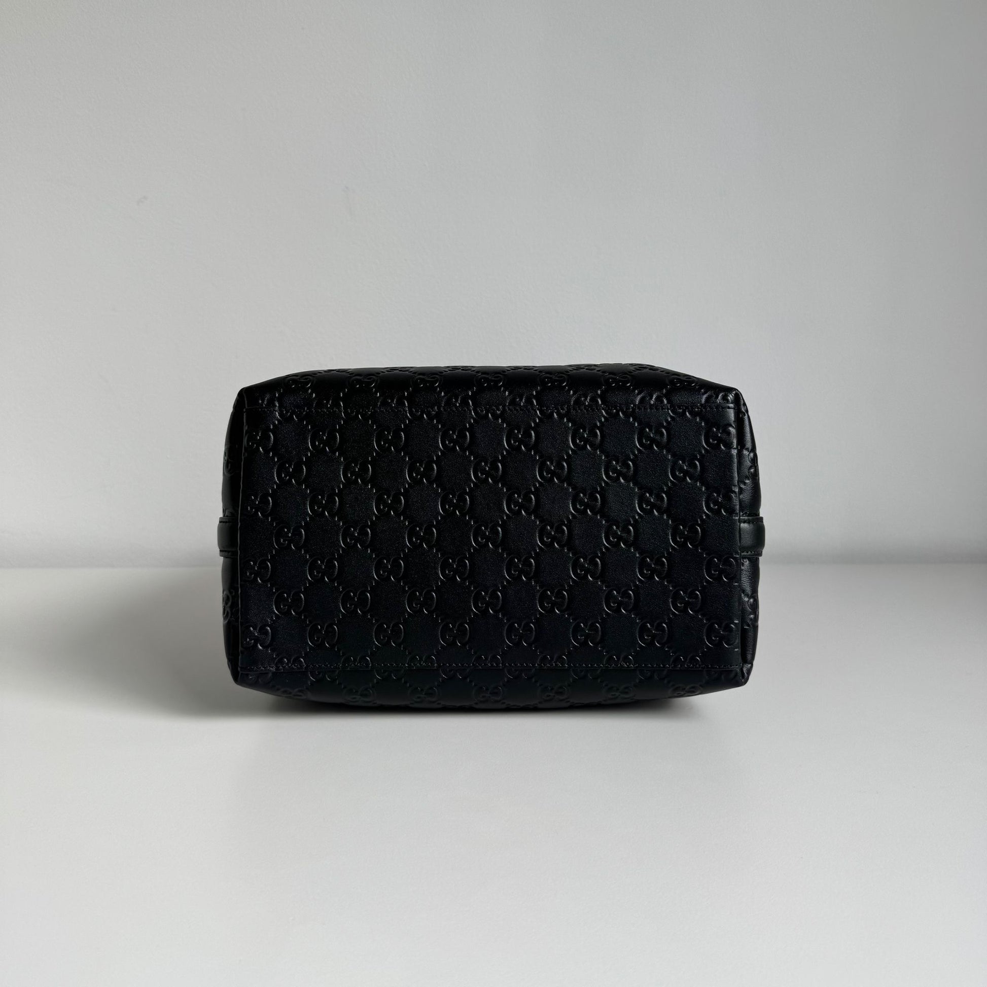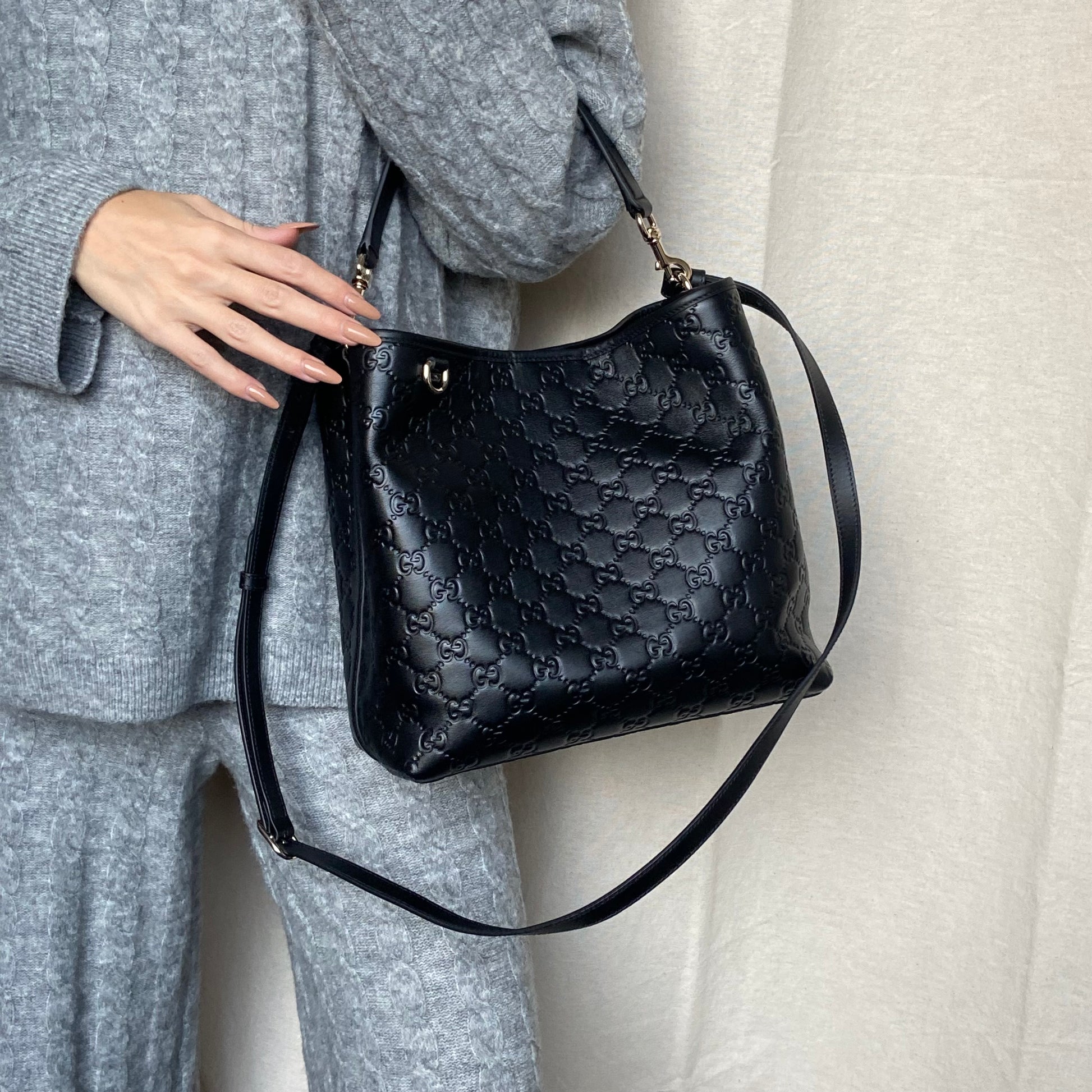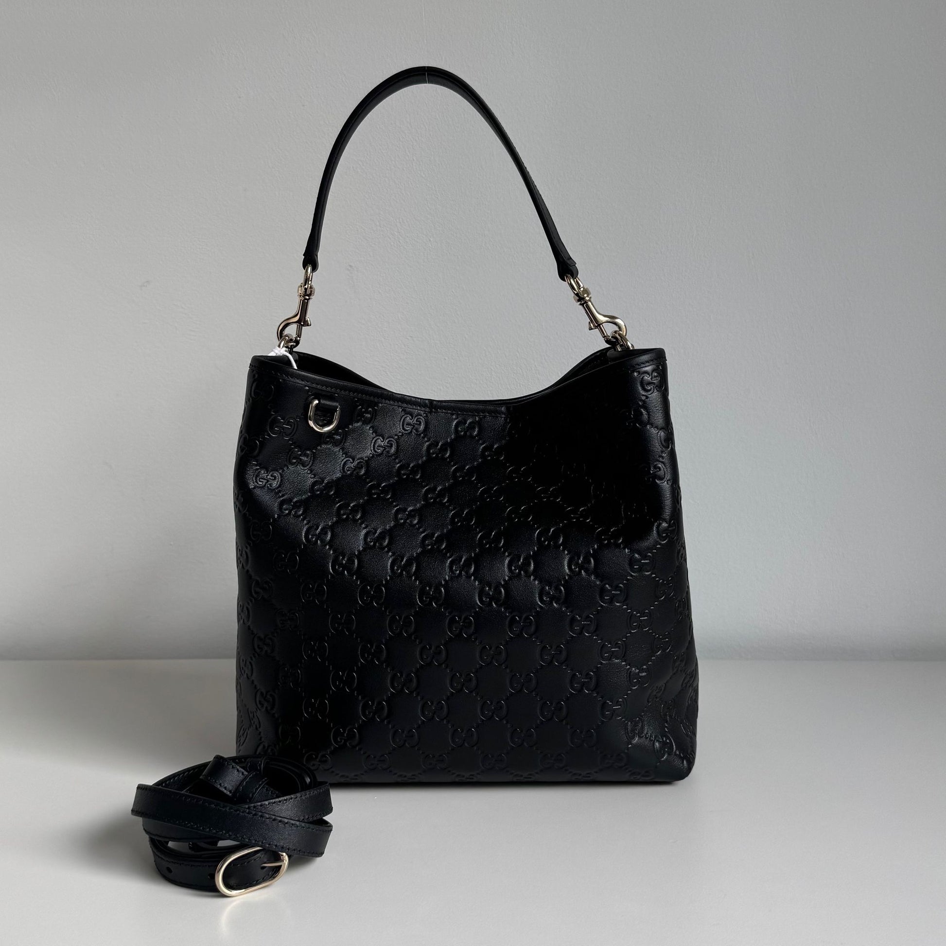 Meraviglioso secchiello Gucci modello Emblem Media in pelle Monogram GG nera con hardware oro. Si indossa a mano, a spalla e a tracolla, la tracolla è regolabile e rimovibile.