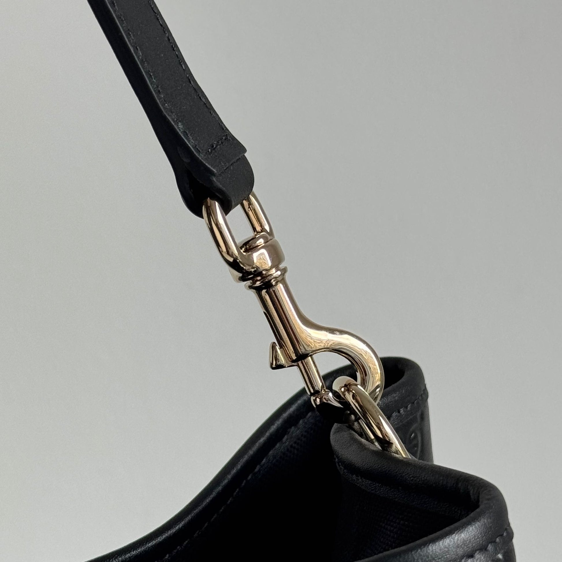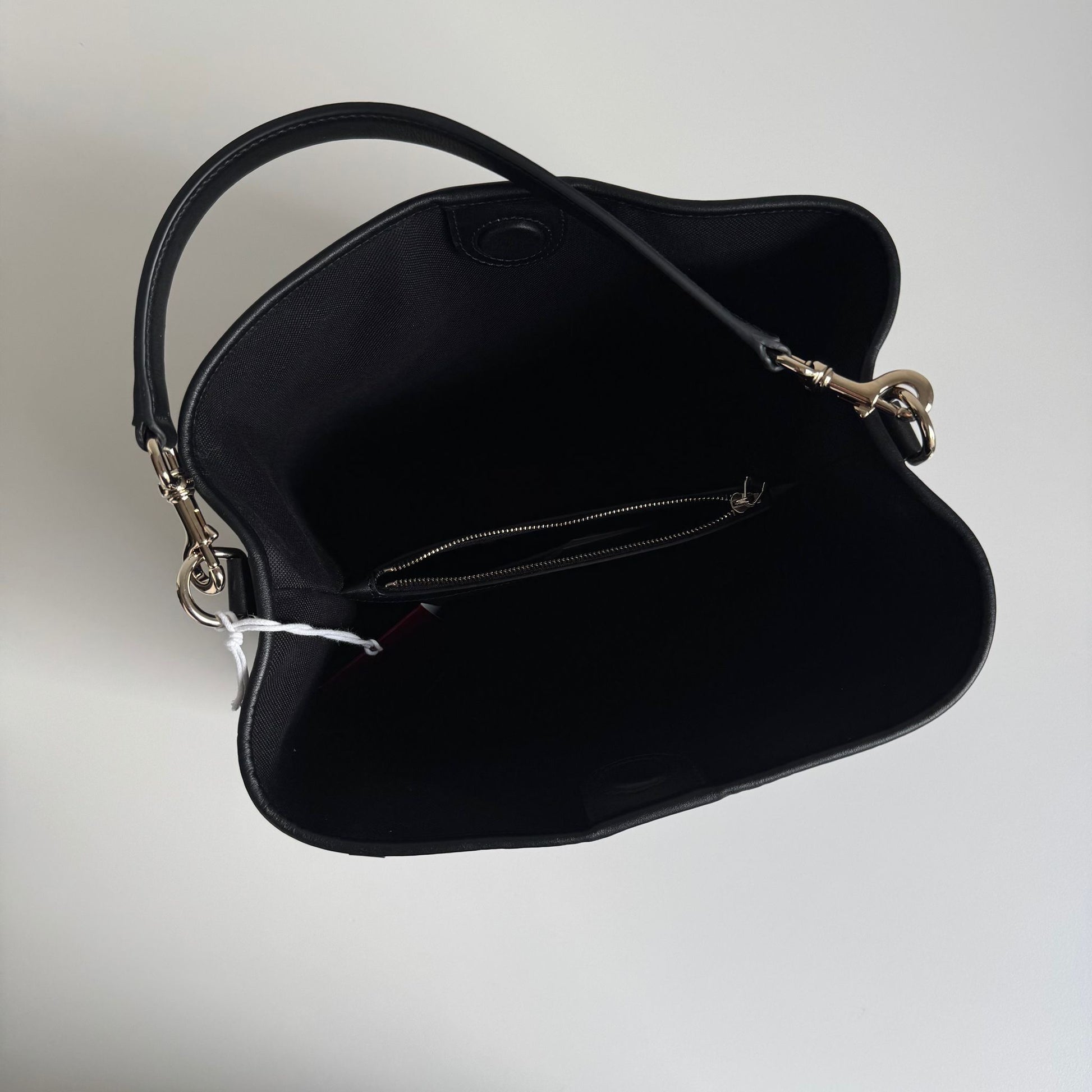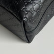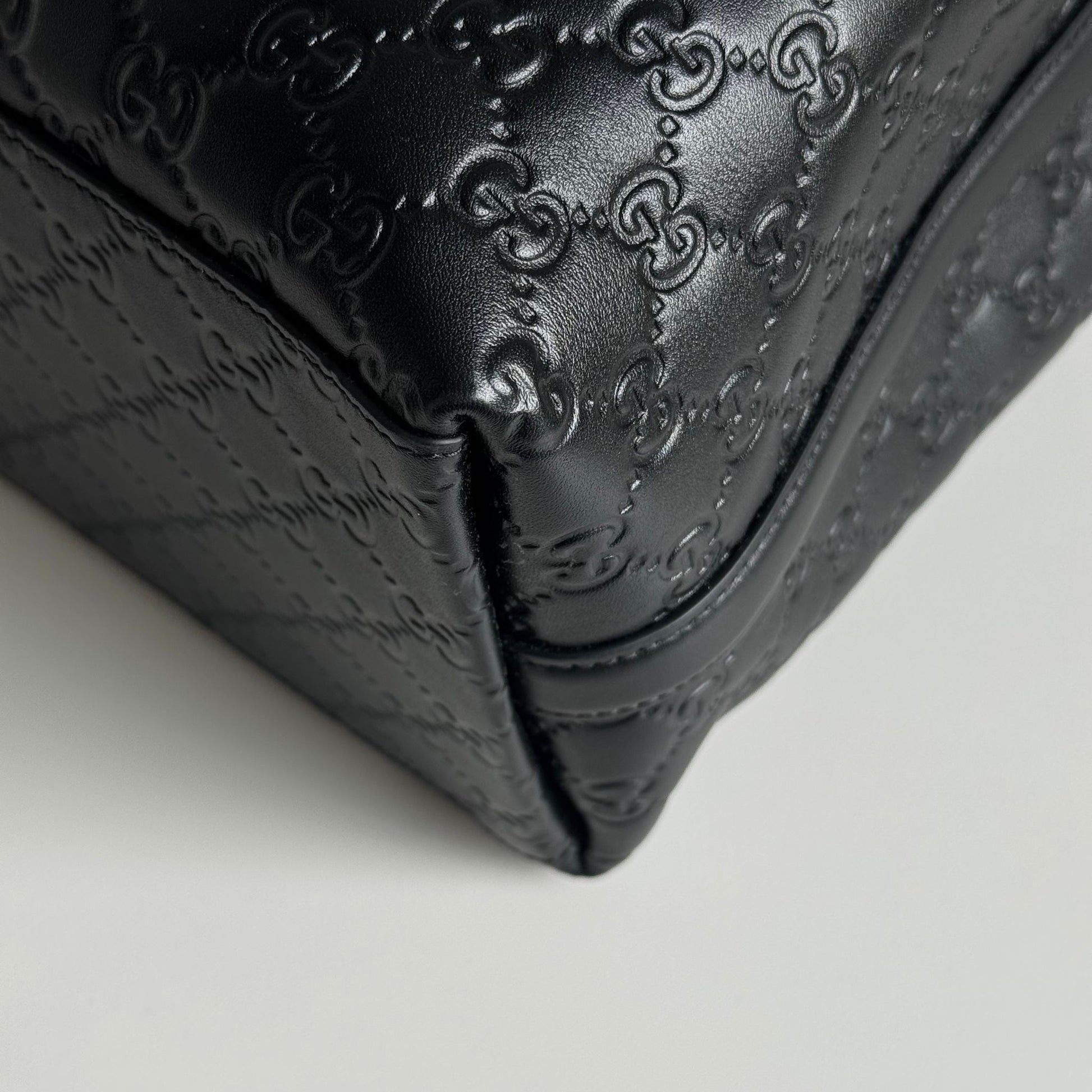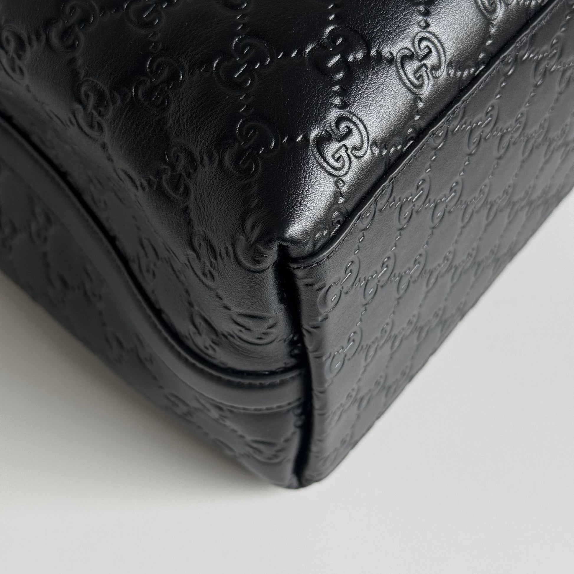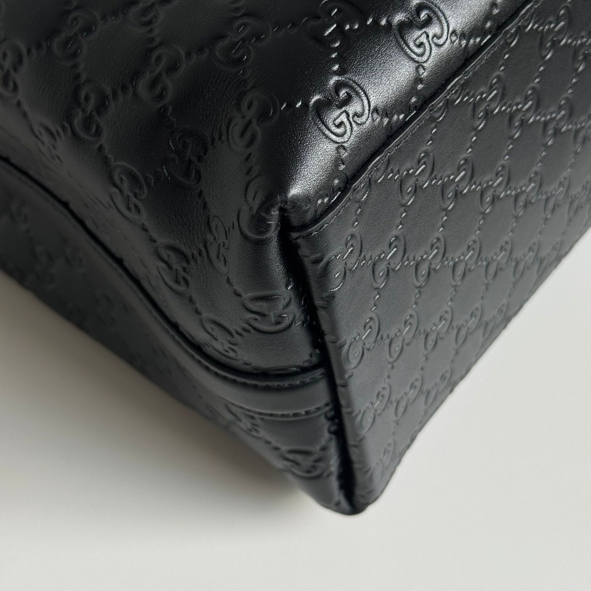 Meraviglioso secchiello Gucci modello Emblem Media in pelle Monogram GG nera con hardware oro. Si indossa a mano, a spalla e a tracolla, la tracolla è regolabile e rimovibile.