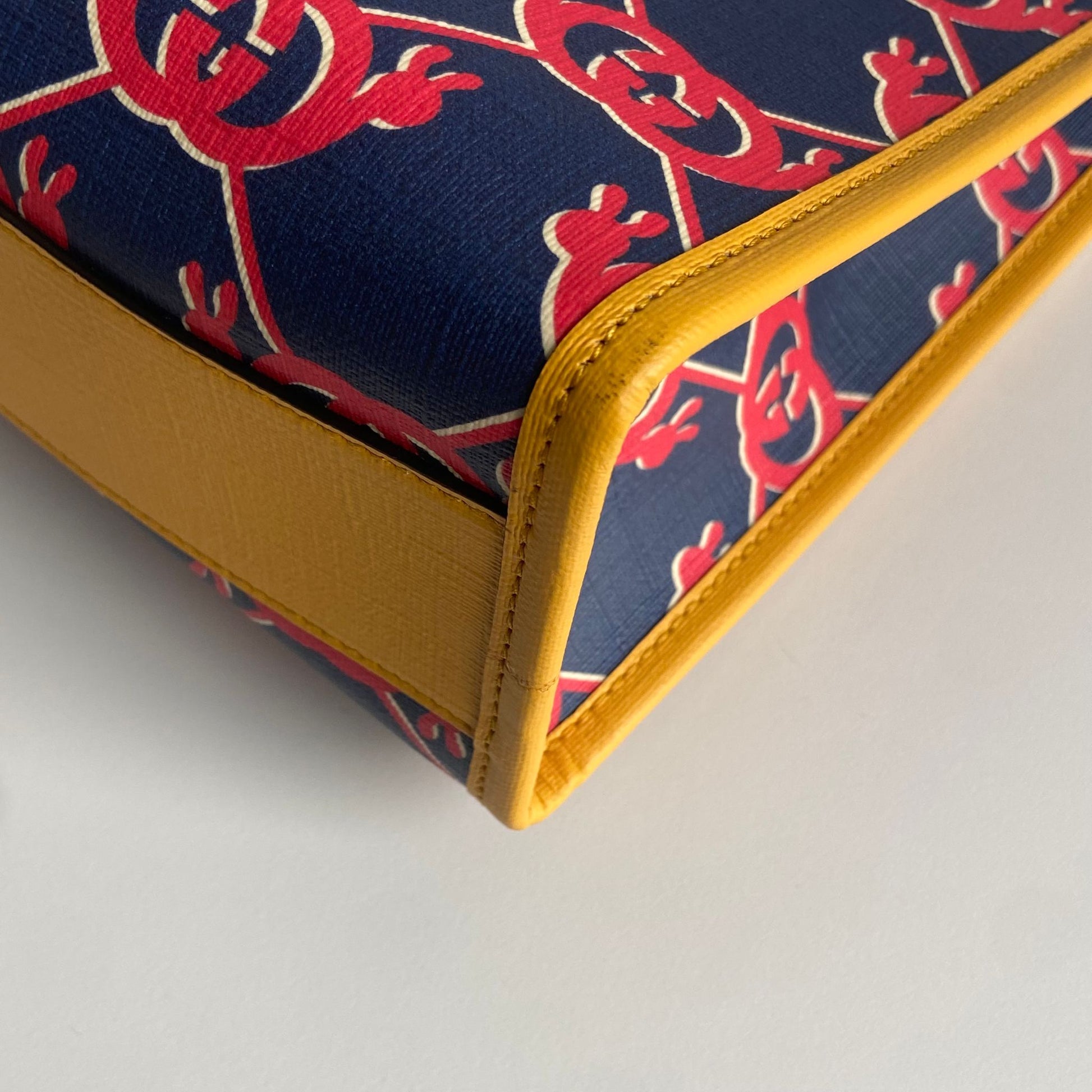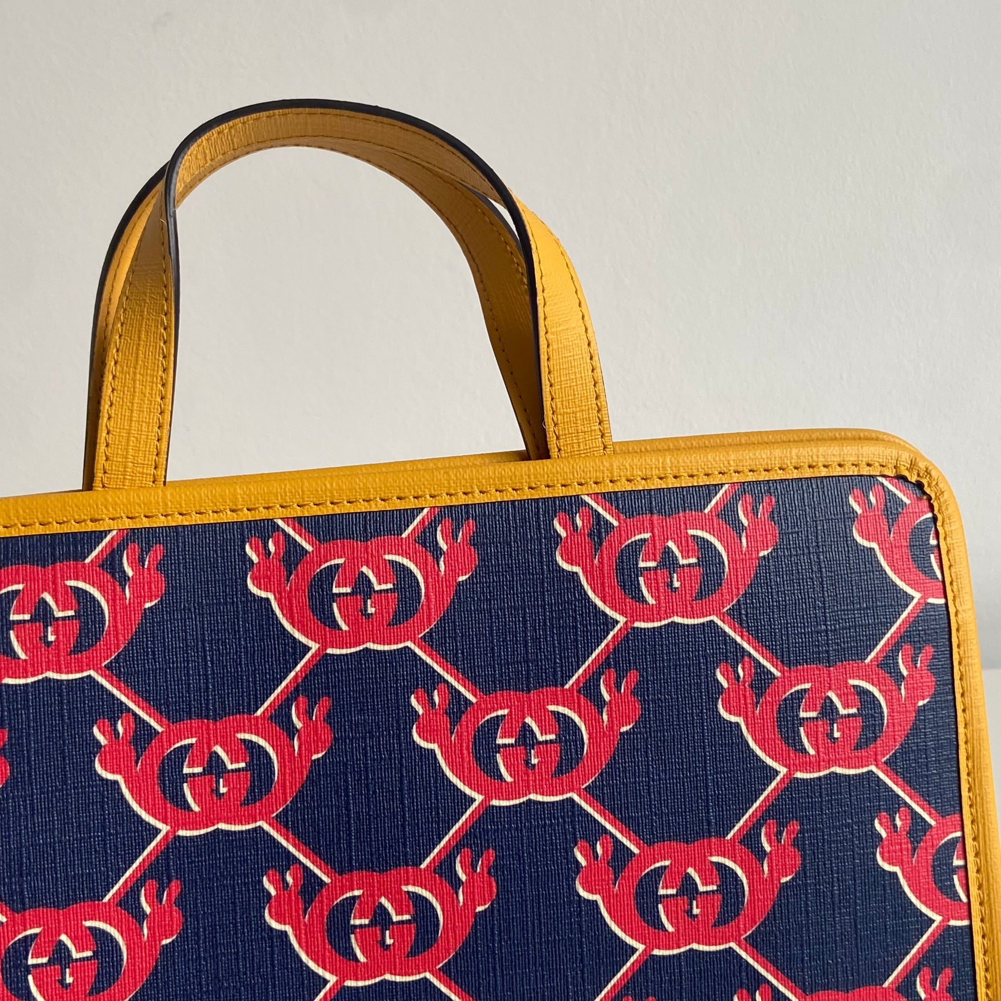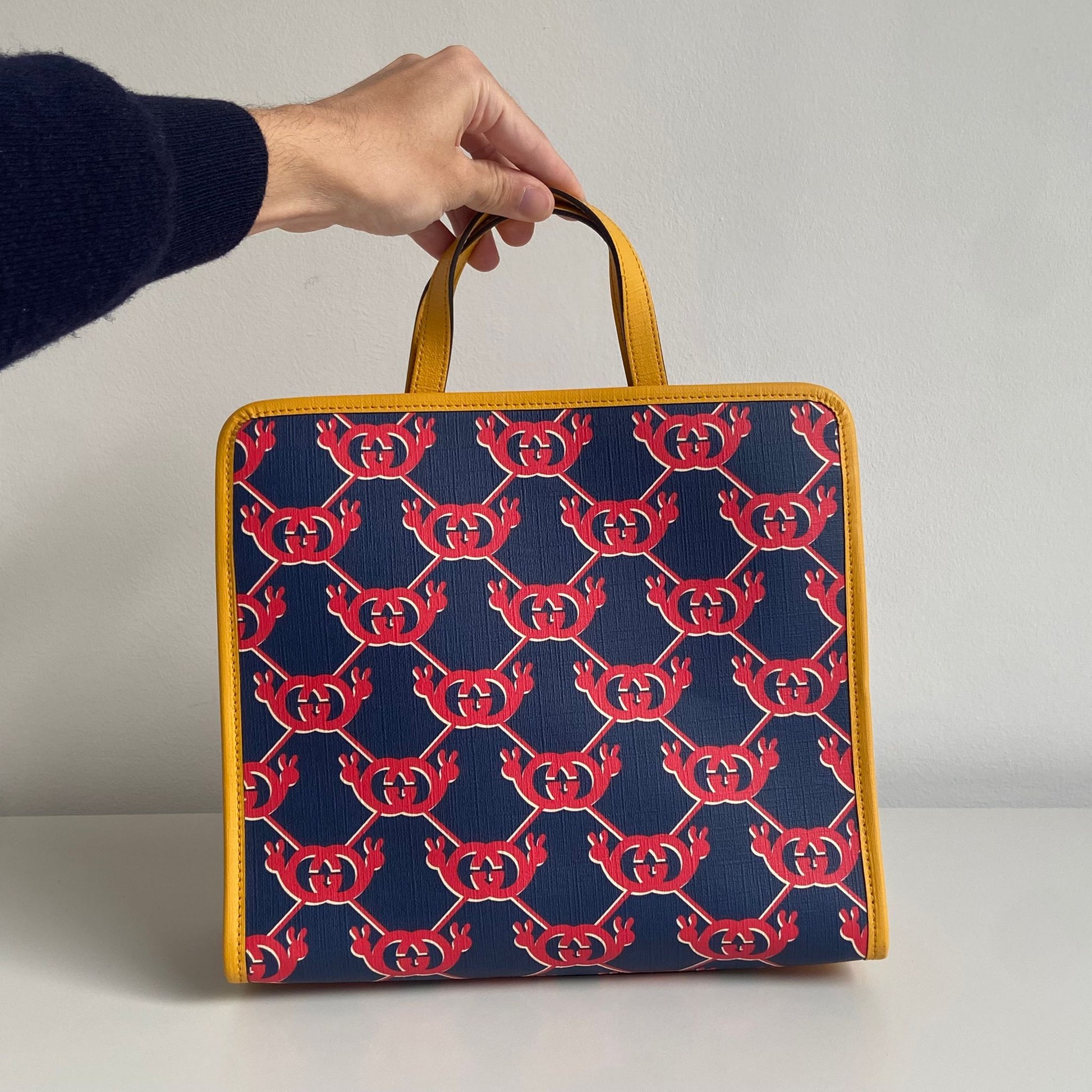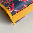 Bellissima borsa Gucci modello G Snail Interlocking collezione Kids in tela spalmata blu con motivo rosso e profili giallo senape. Si indossa a mano.