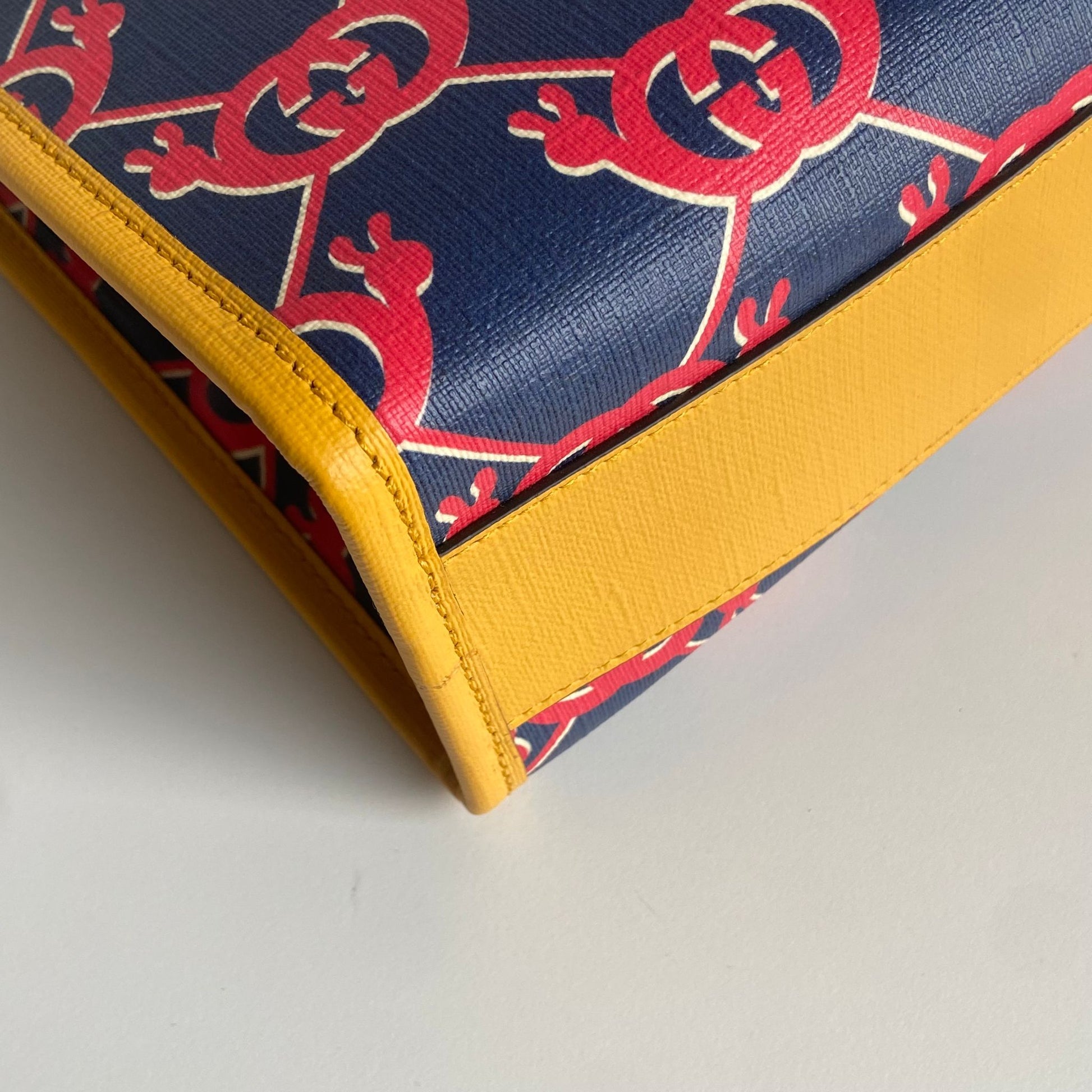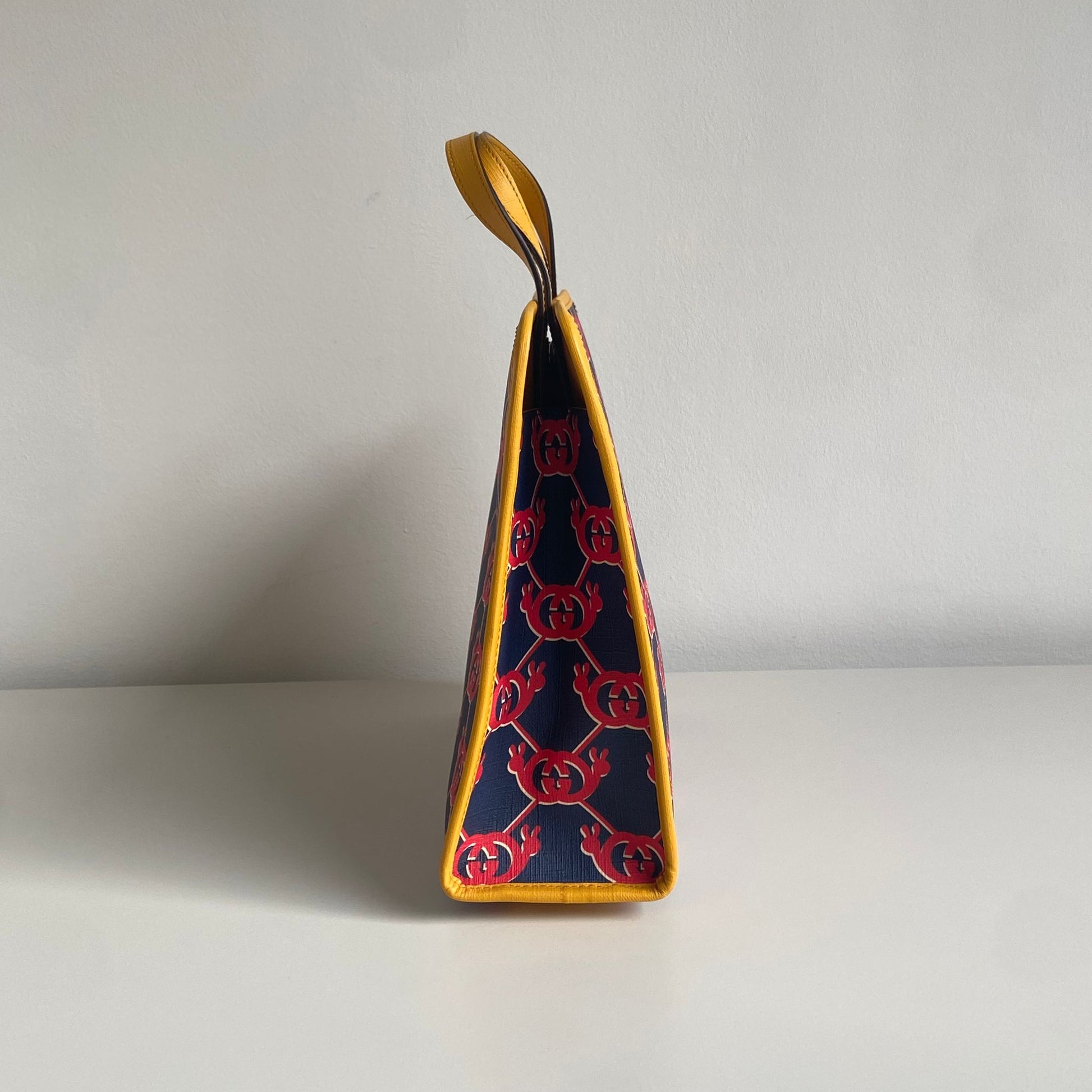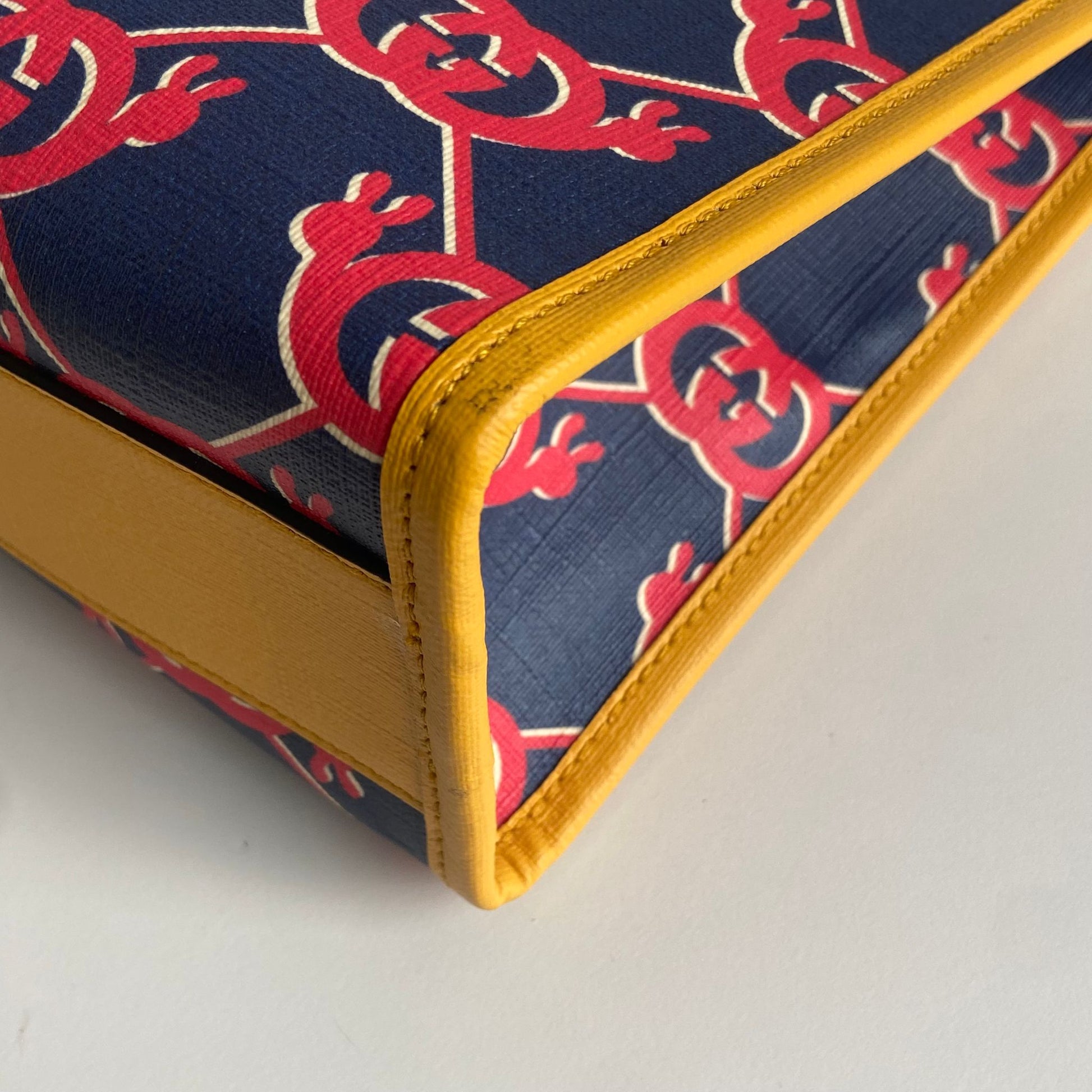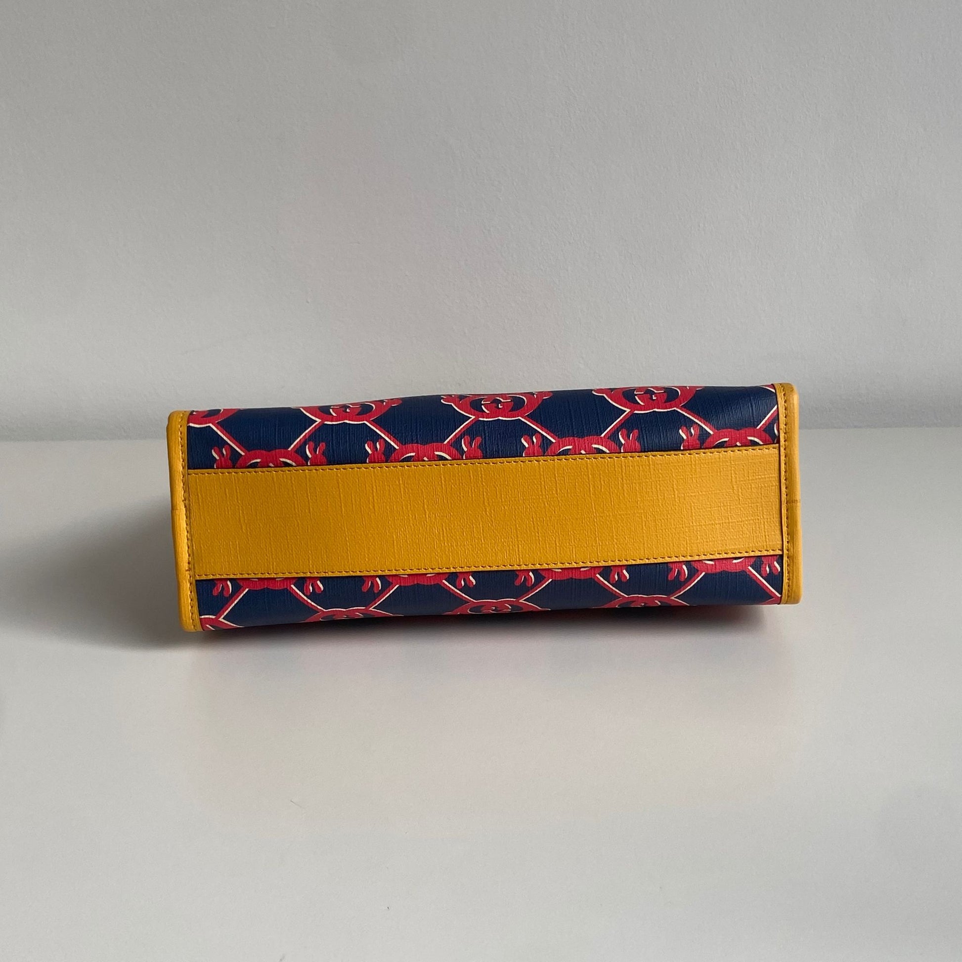 Bellissima borsa Gucci modello G Snail Interlocking collezione Kids in tela spalmata blu con motivo rosso e profili giallo senape. Si indossa a mano.