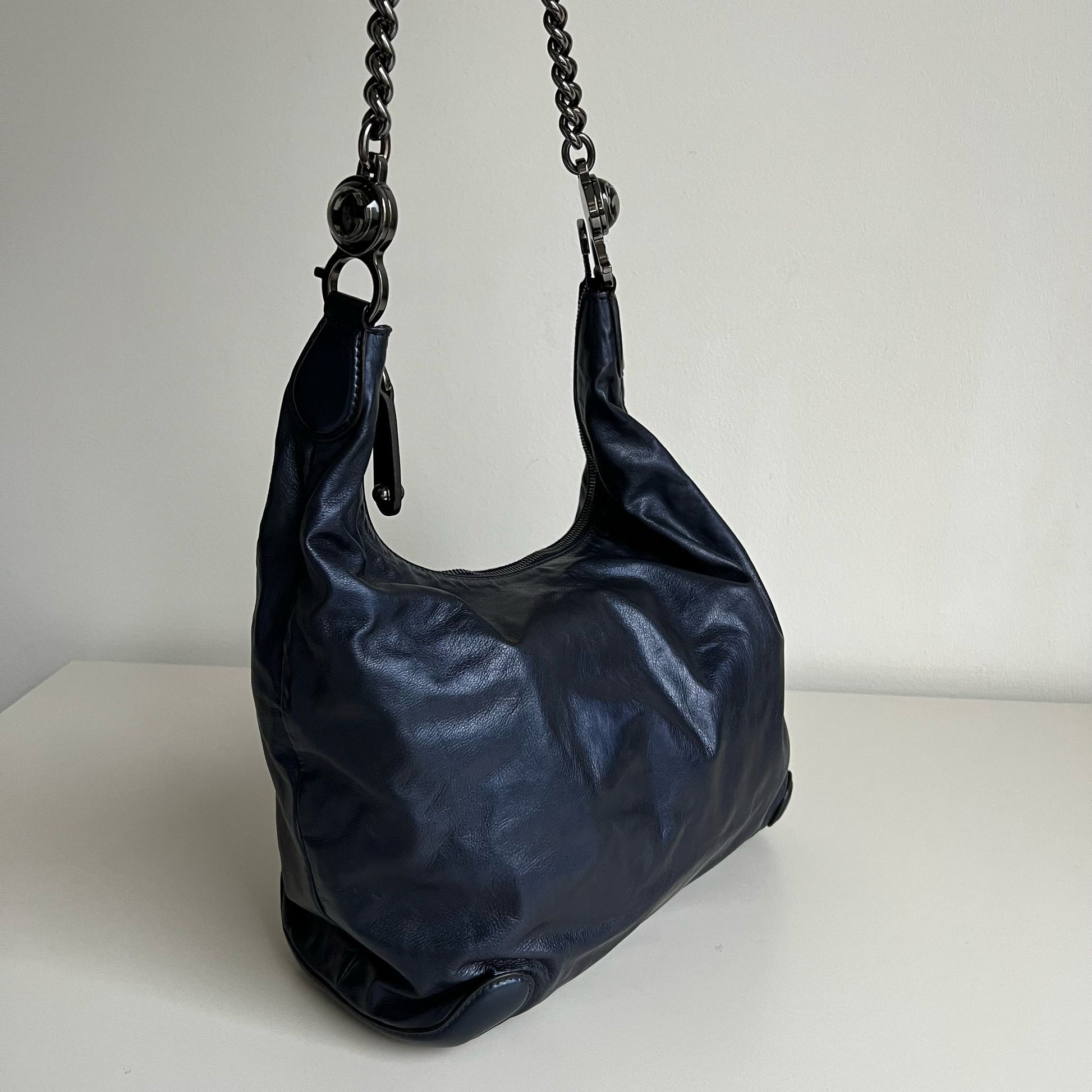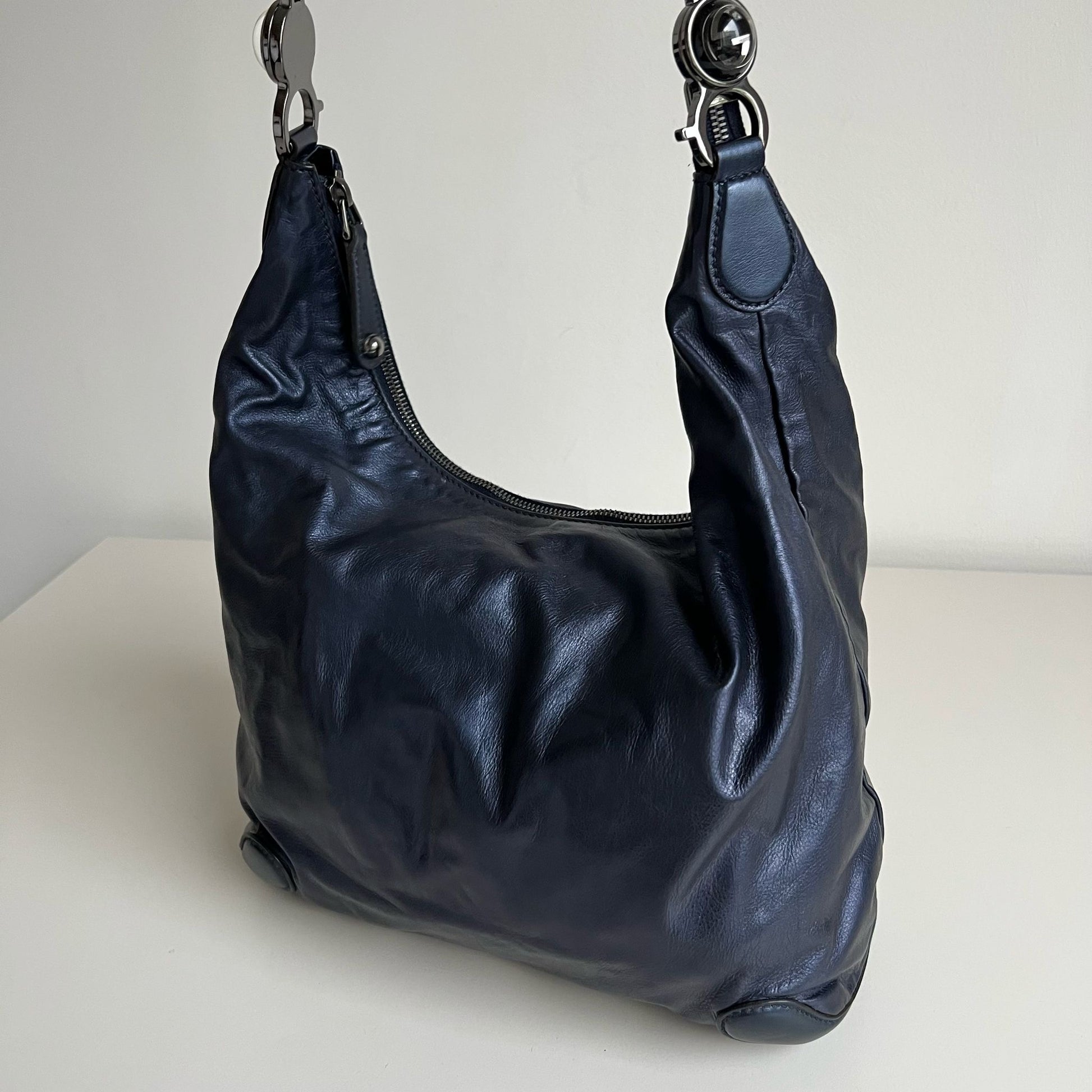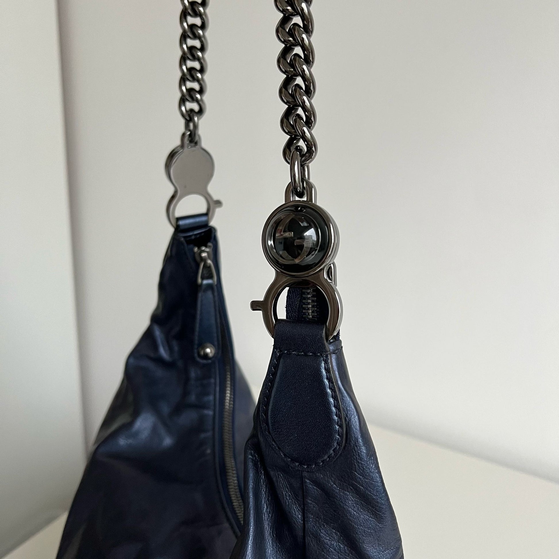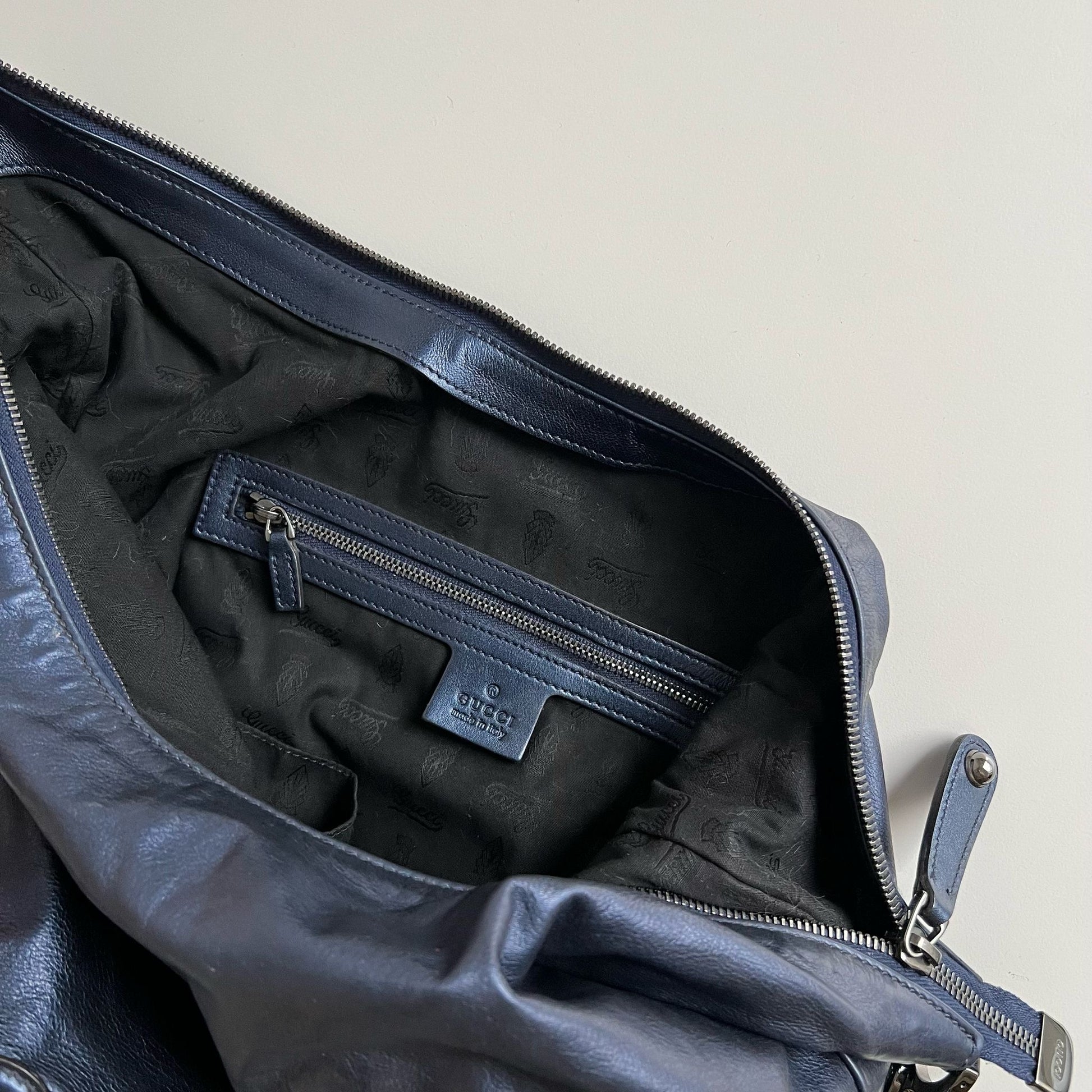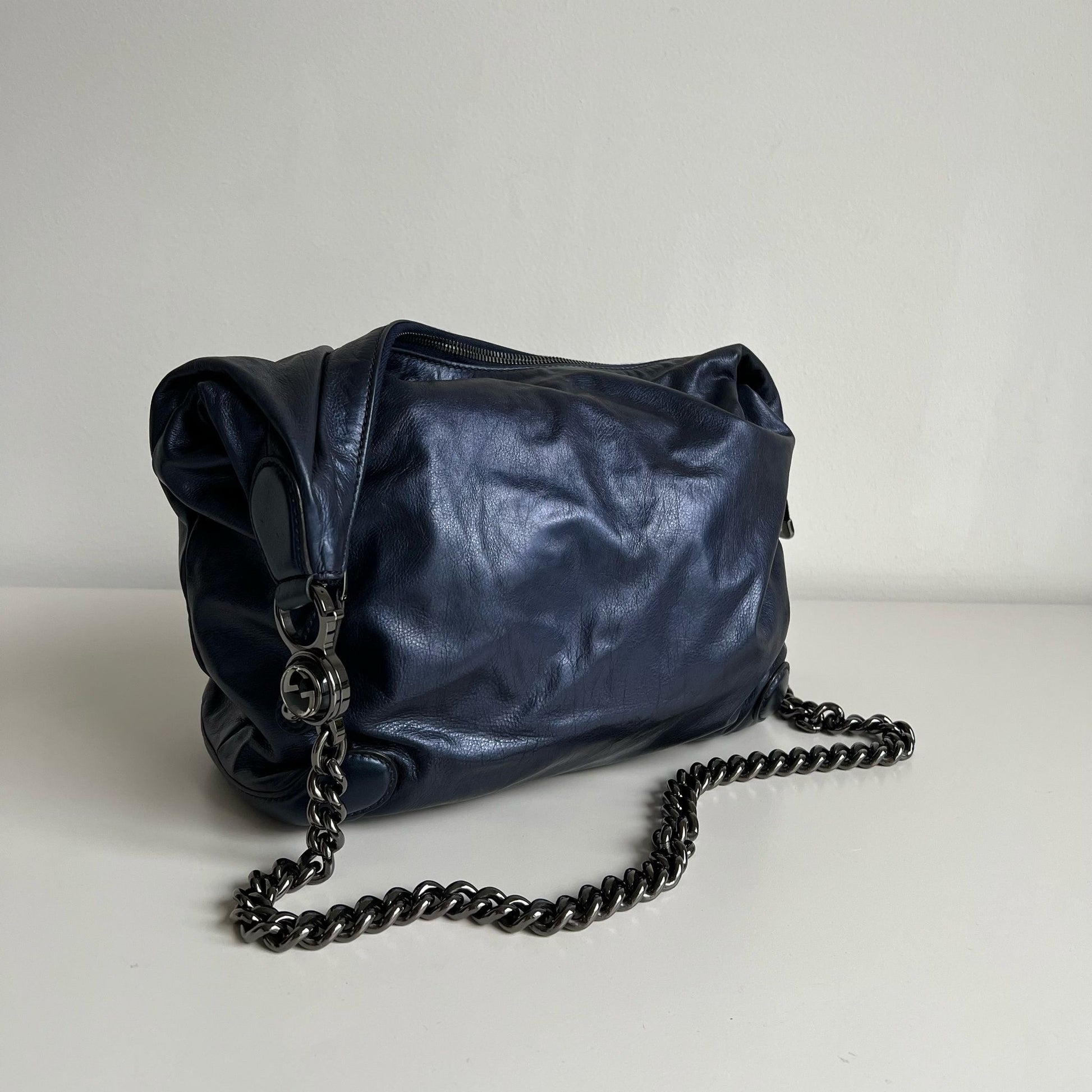 Bellissima borsa Gucci modello Galaxy in pelle blu navy metallizzato con hardware argento. Si indossa a spalla.