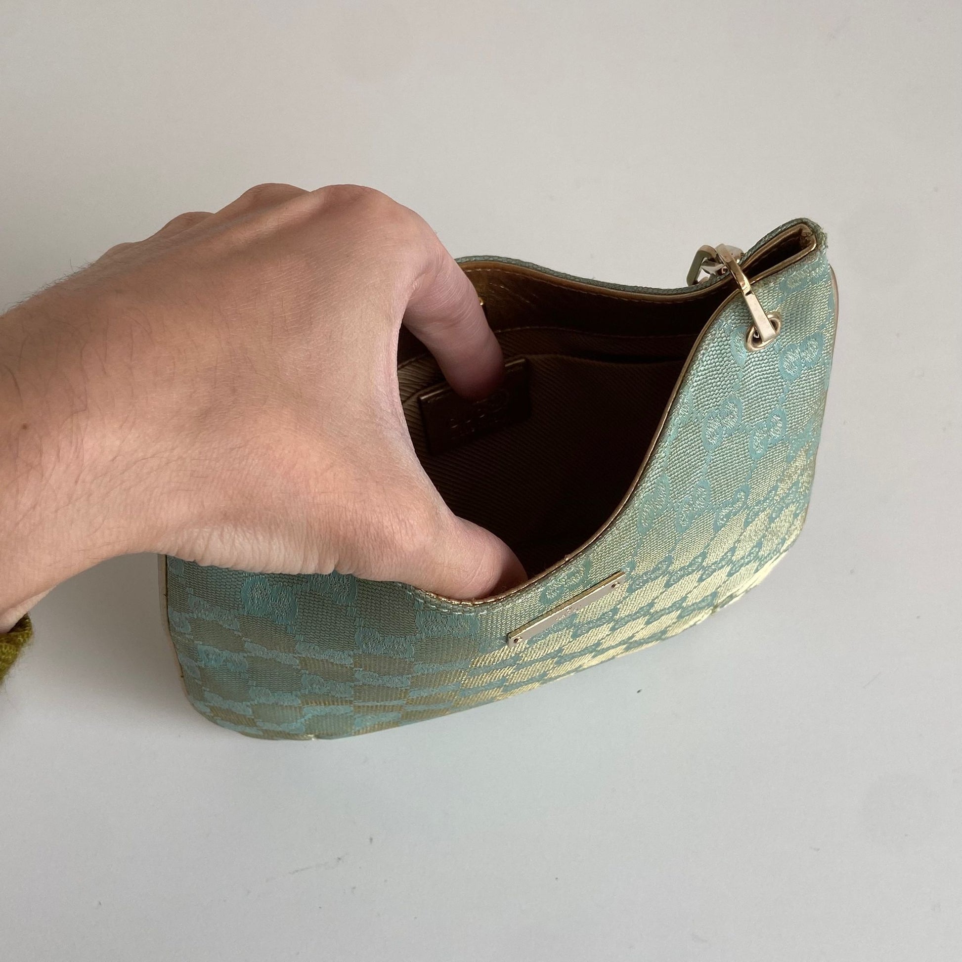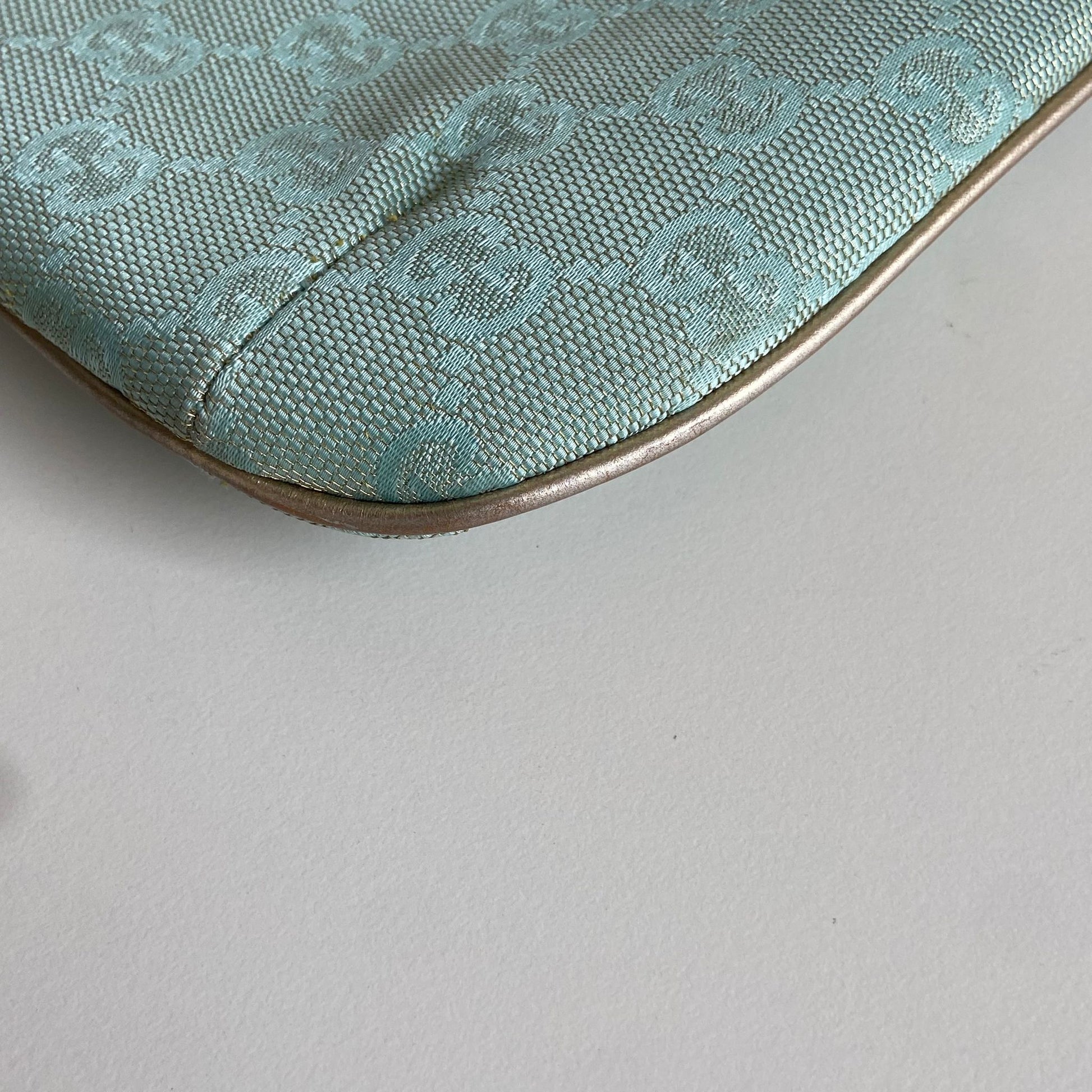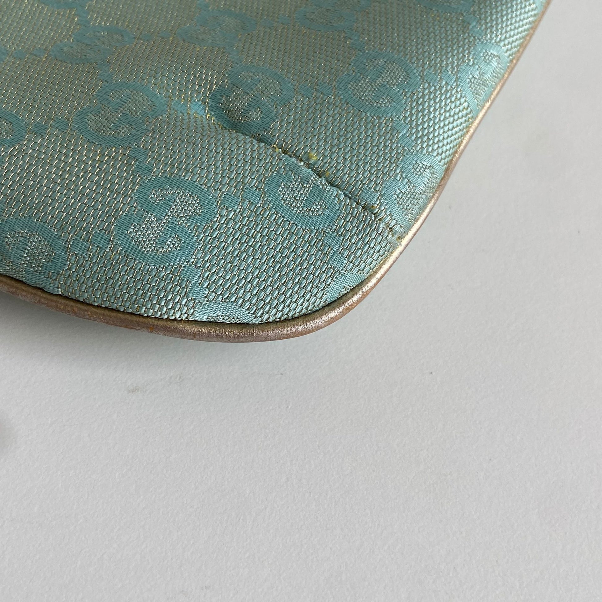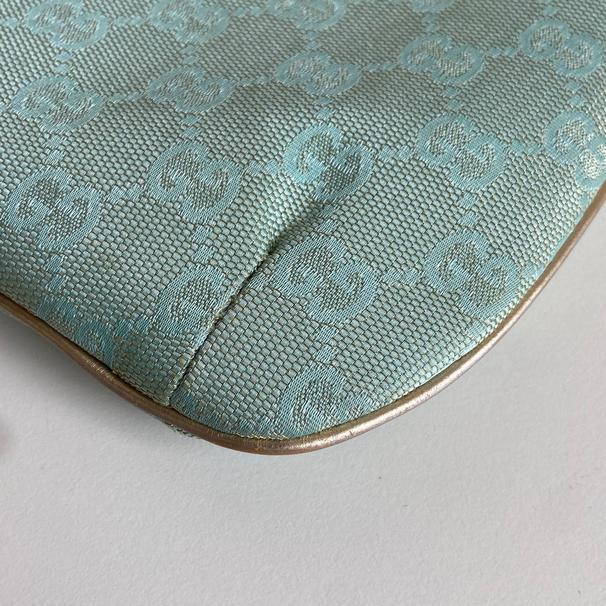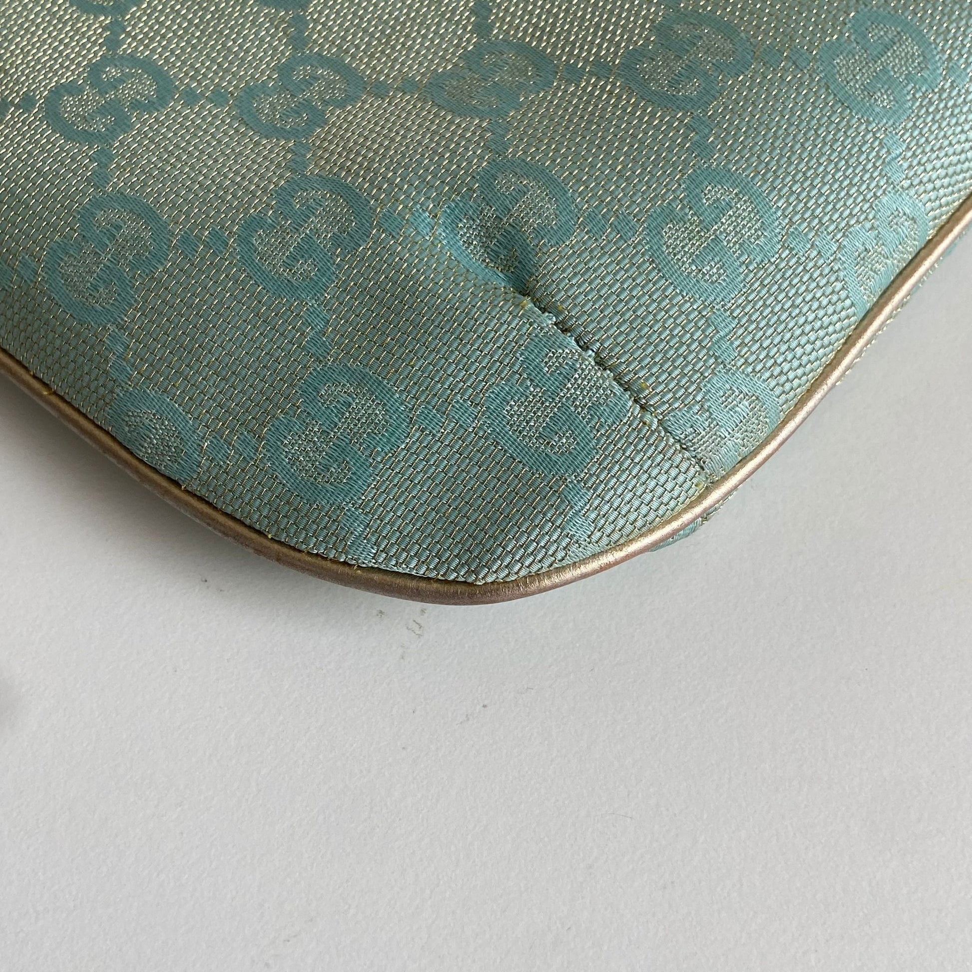 Meravigliosa borsa Gucci modello Hobo della S/S 2000 in tela GG azzurra-oro cangiante e hardware oro. Si indossa a spalla.
