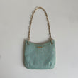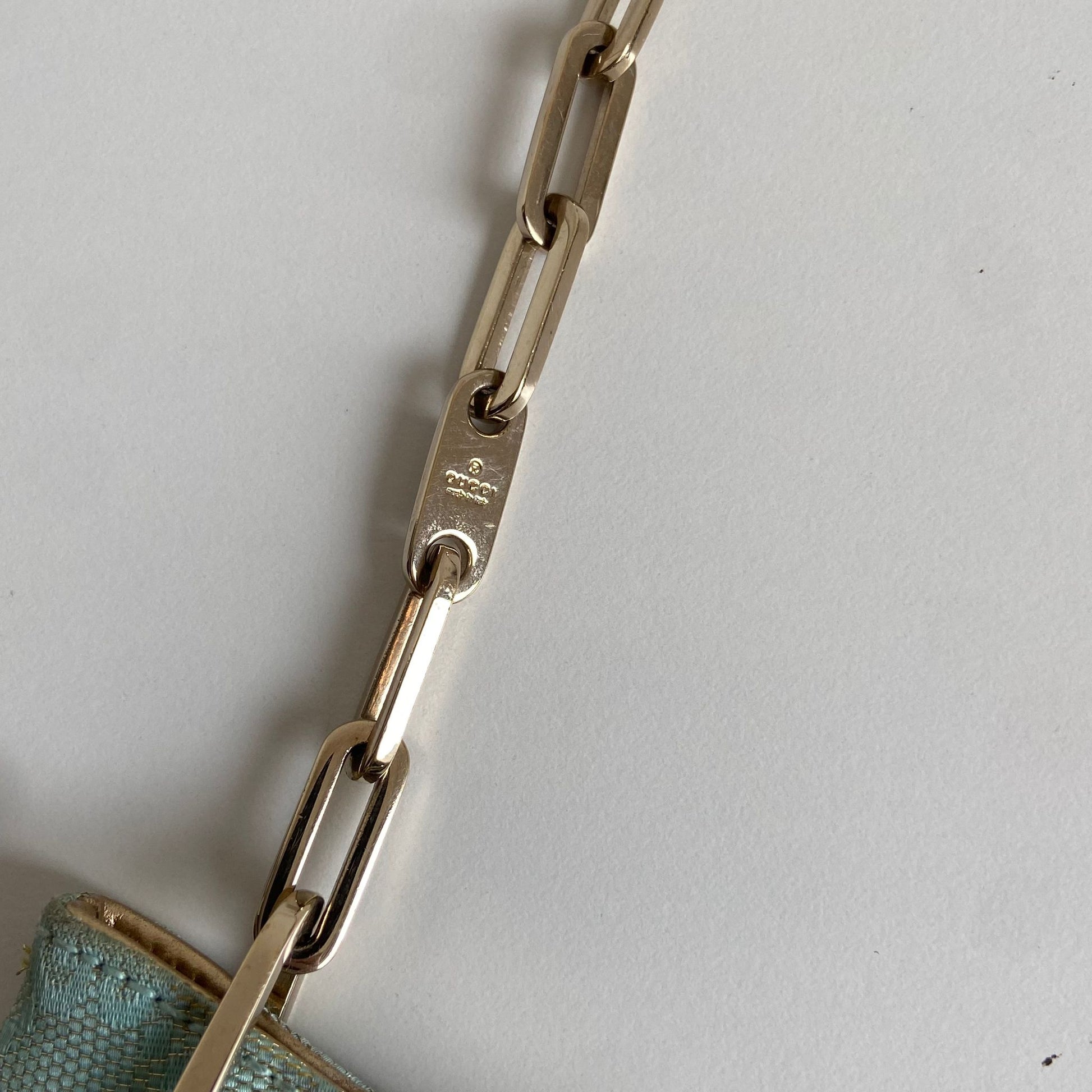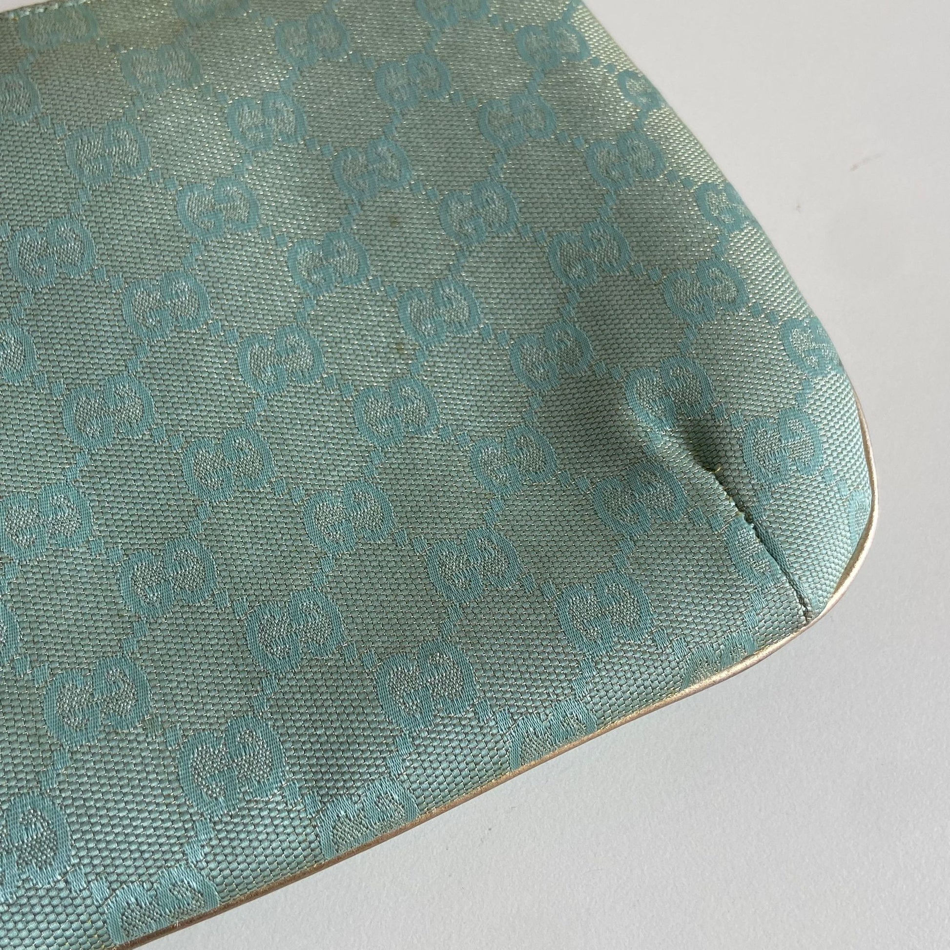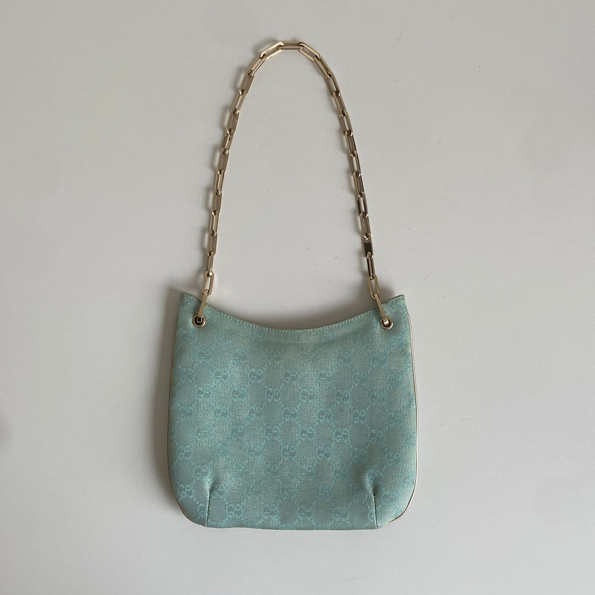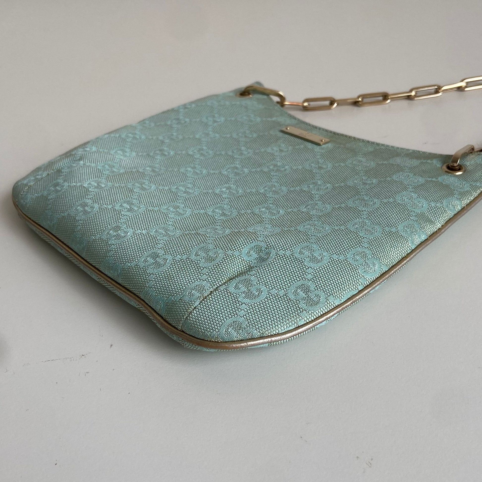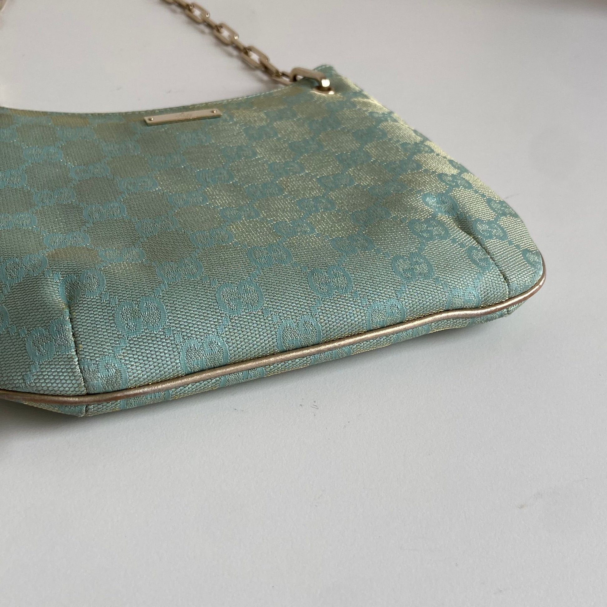 Meravigliosa borsa Gucci modello Hobo della S/S 2000 in tela GG azzurra-oro cangiante e hardware oro. Si indossa a spalla.