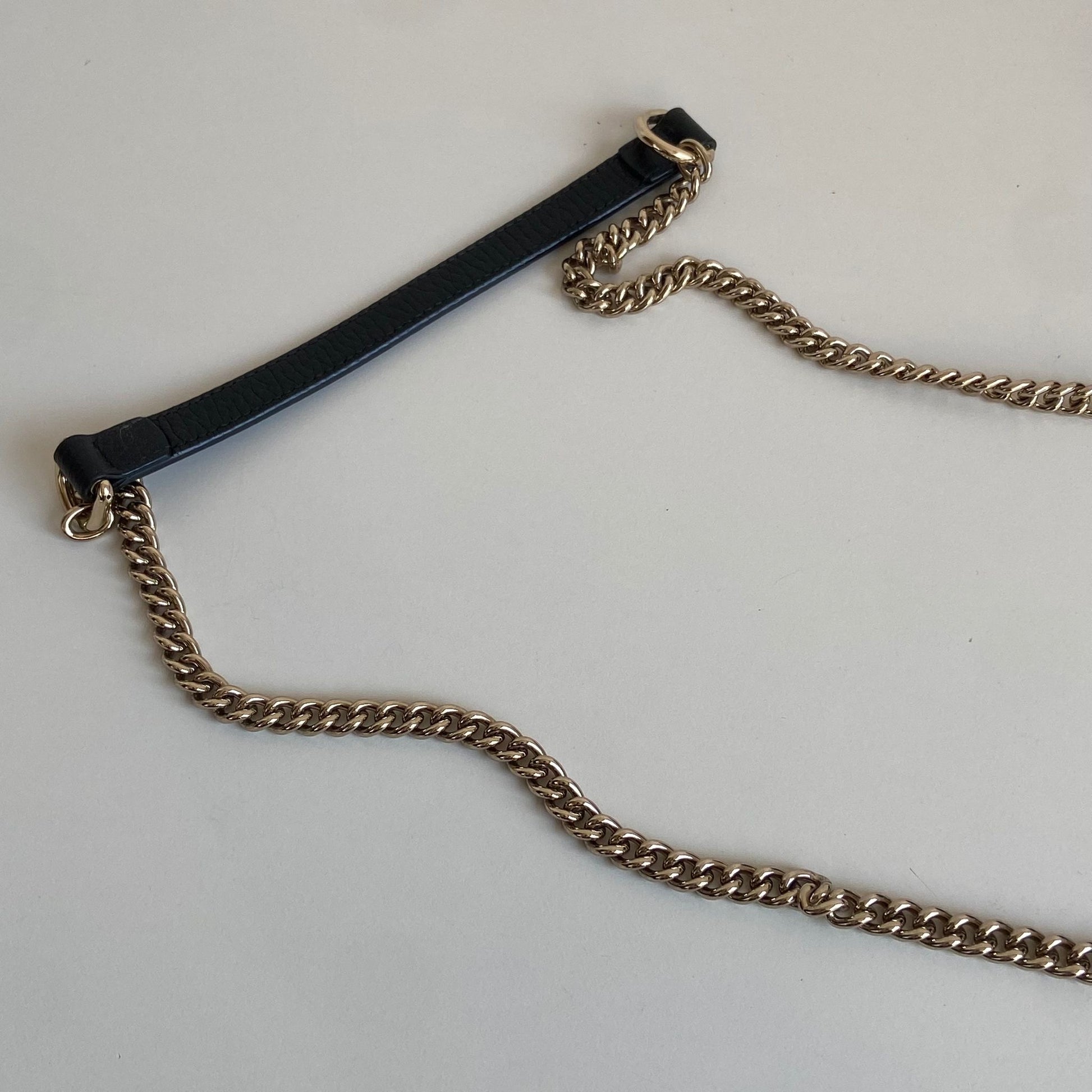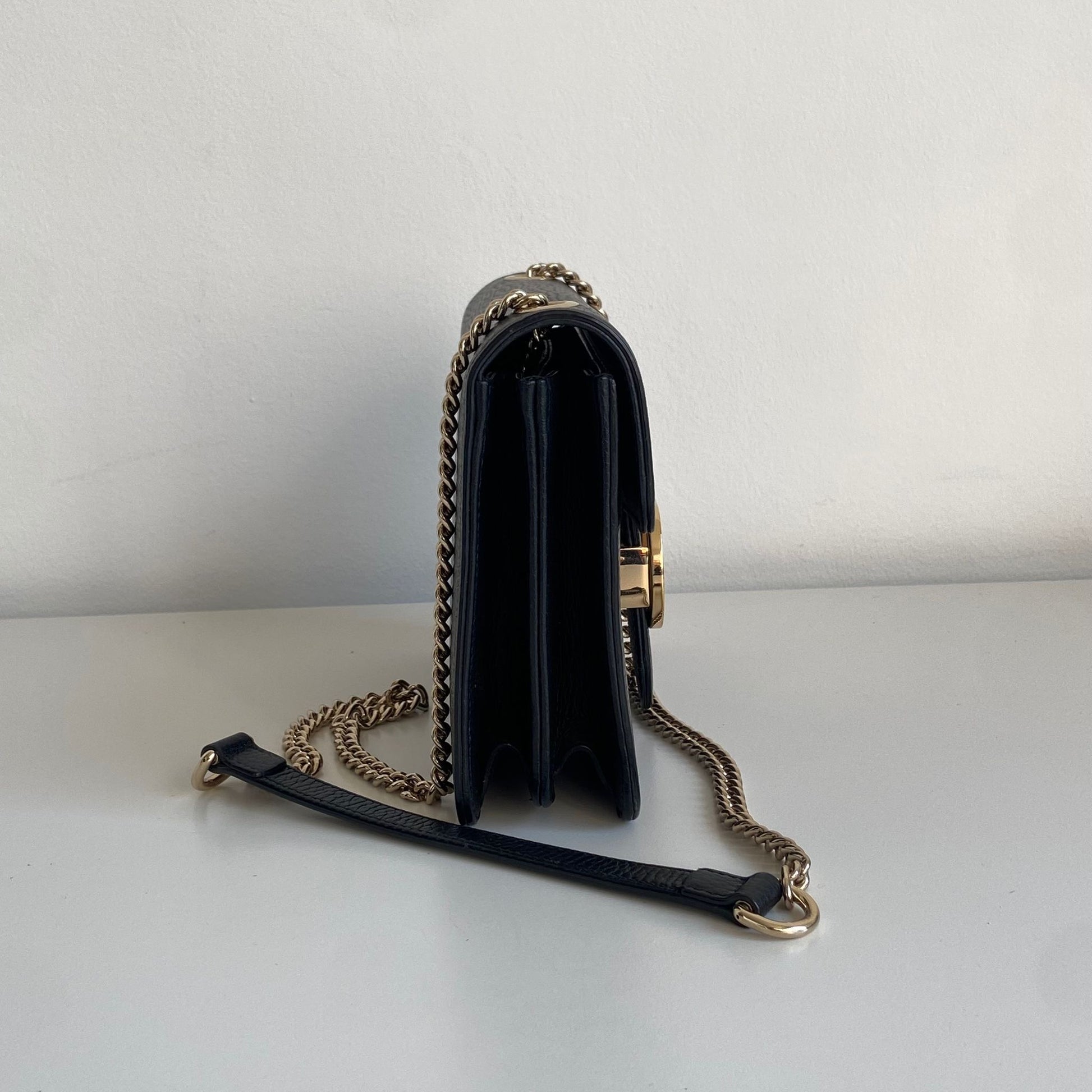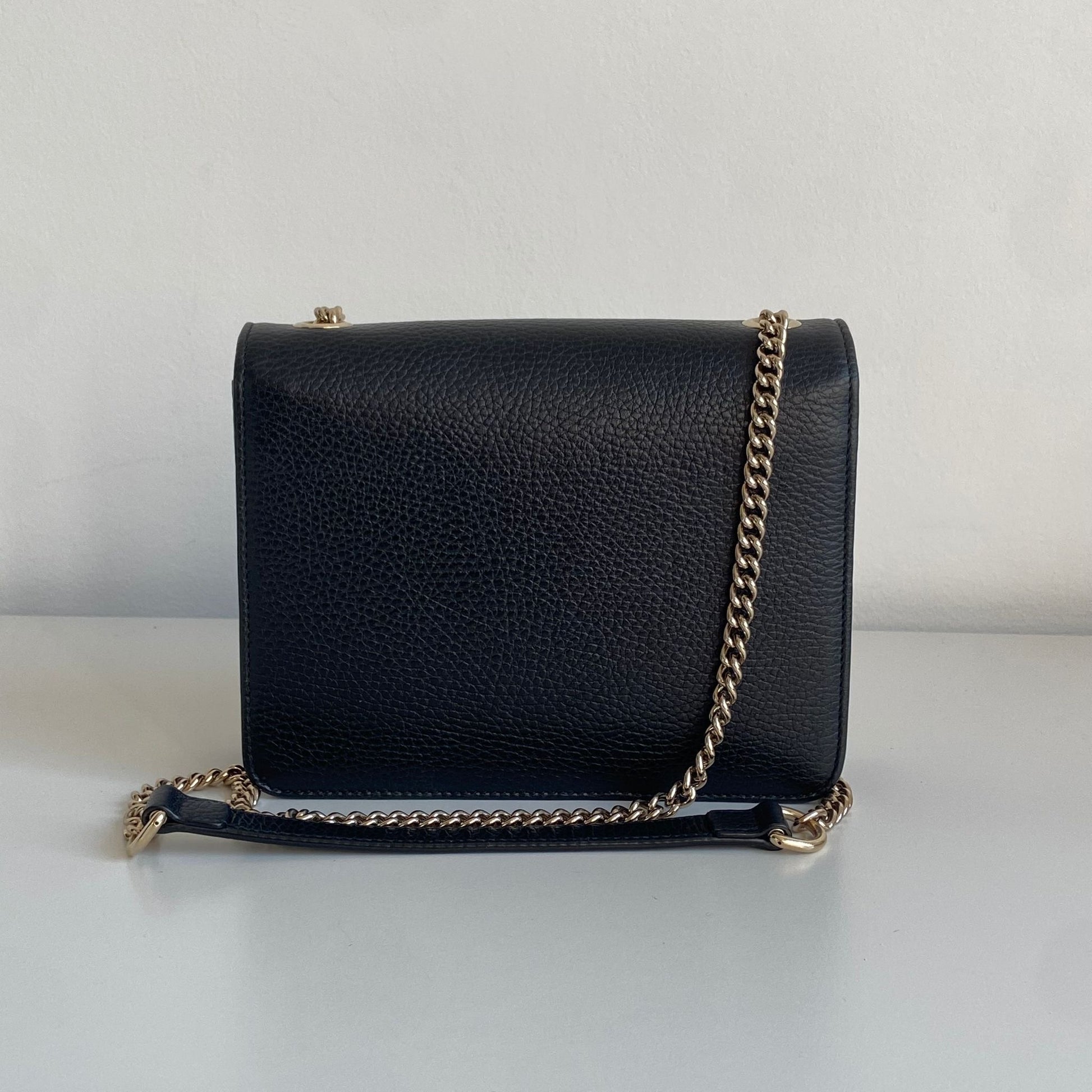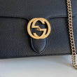 Meravigliosa borsa Gucci modello Interlocking in pelle nera e hardware oro. Si indossa a tracolla e non è rimovibile né regolabile.