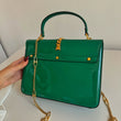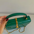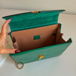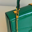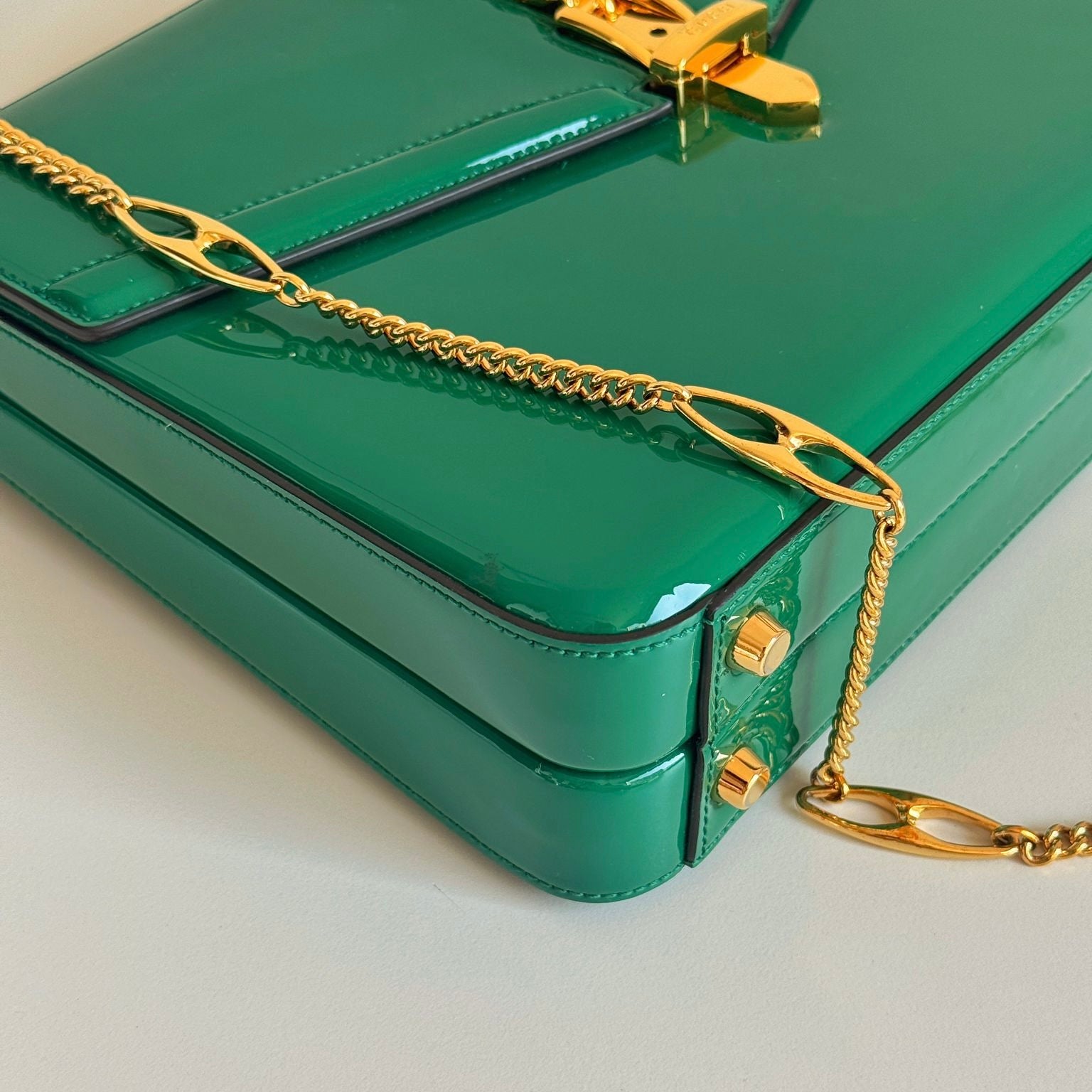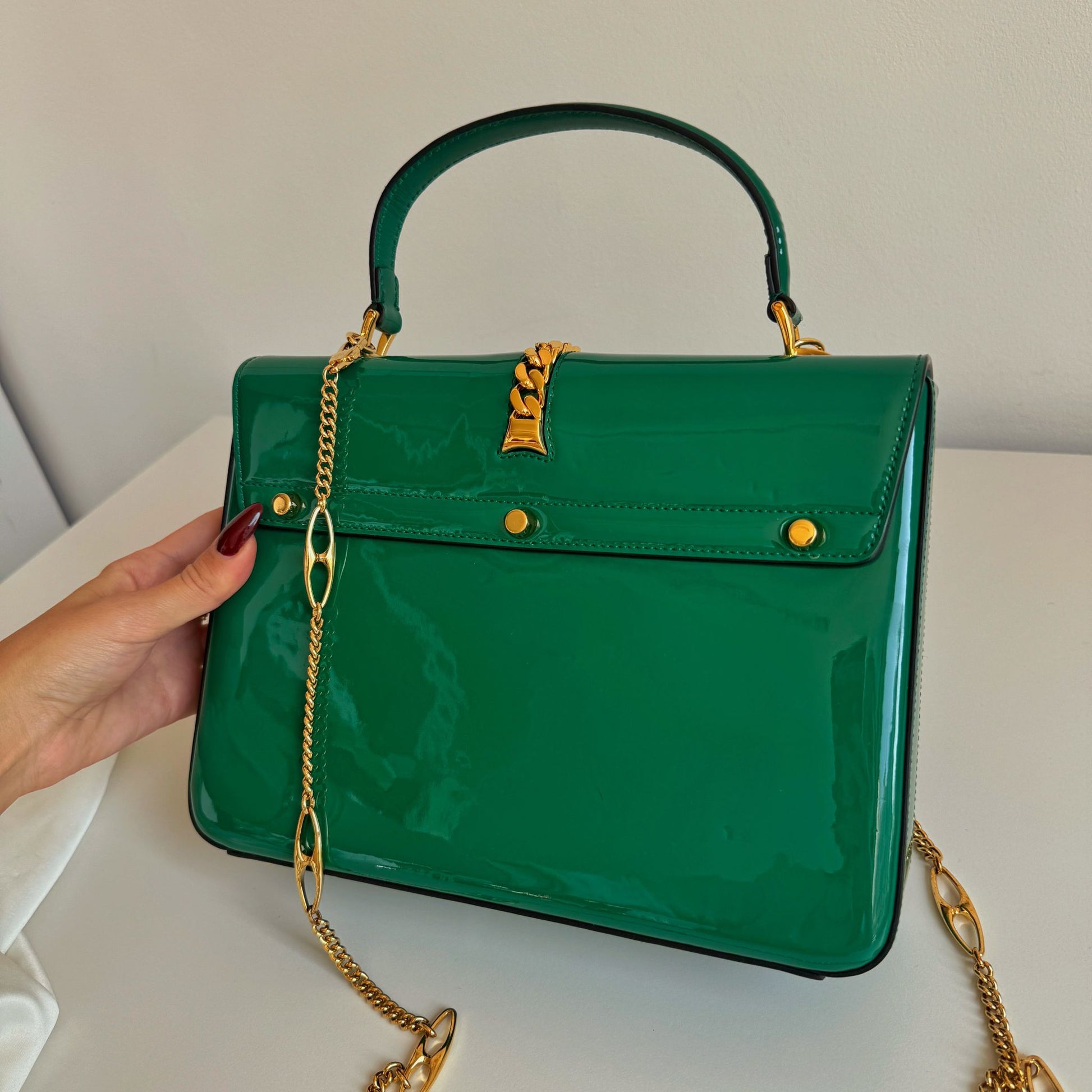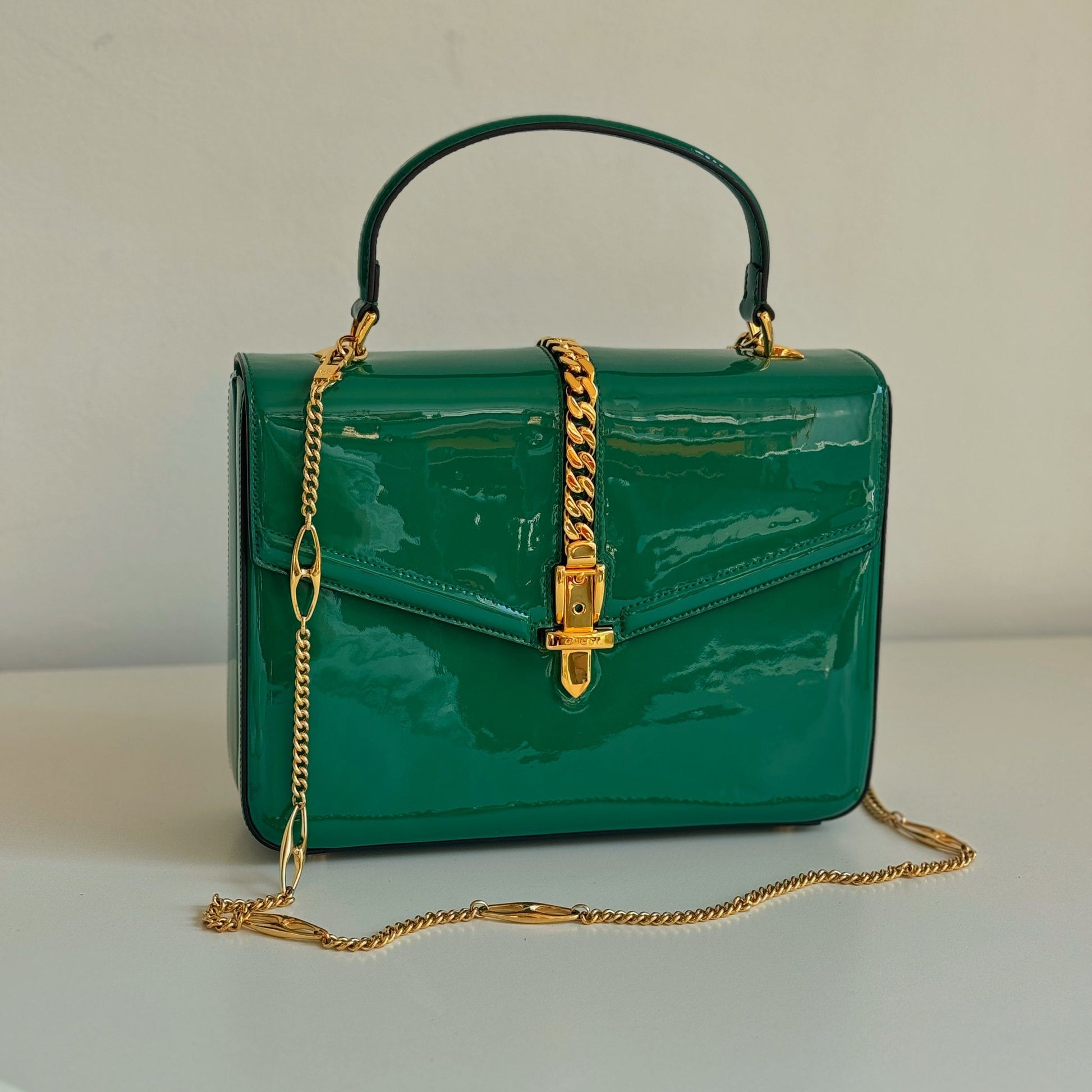 Meravigliosa borsa Gucci modello Sylvie in pelle verde smeraldo verniciata e hardware oro. Per il colore corretto si tenga presente la prima foto. Si indossa a mano e a tracolla la tracolla non è regolabile ma rimovibile.
