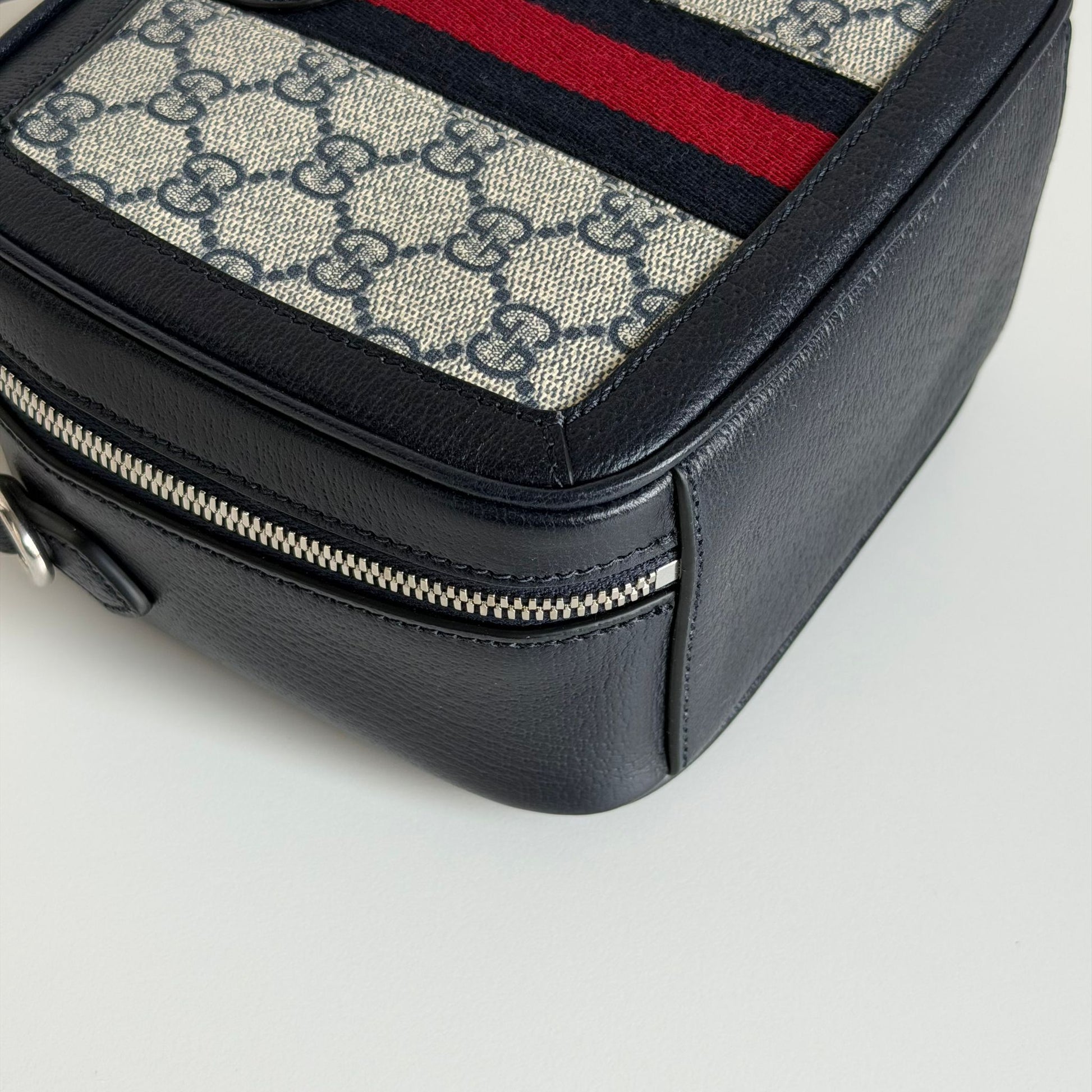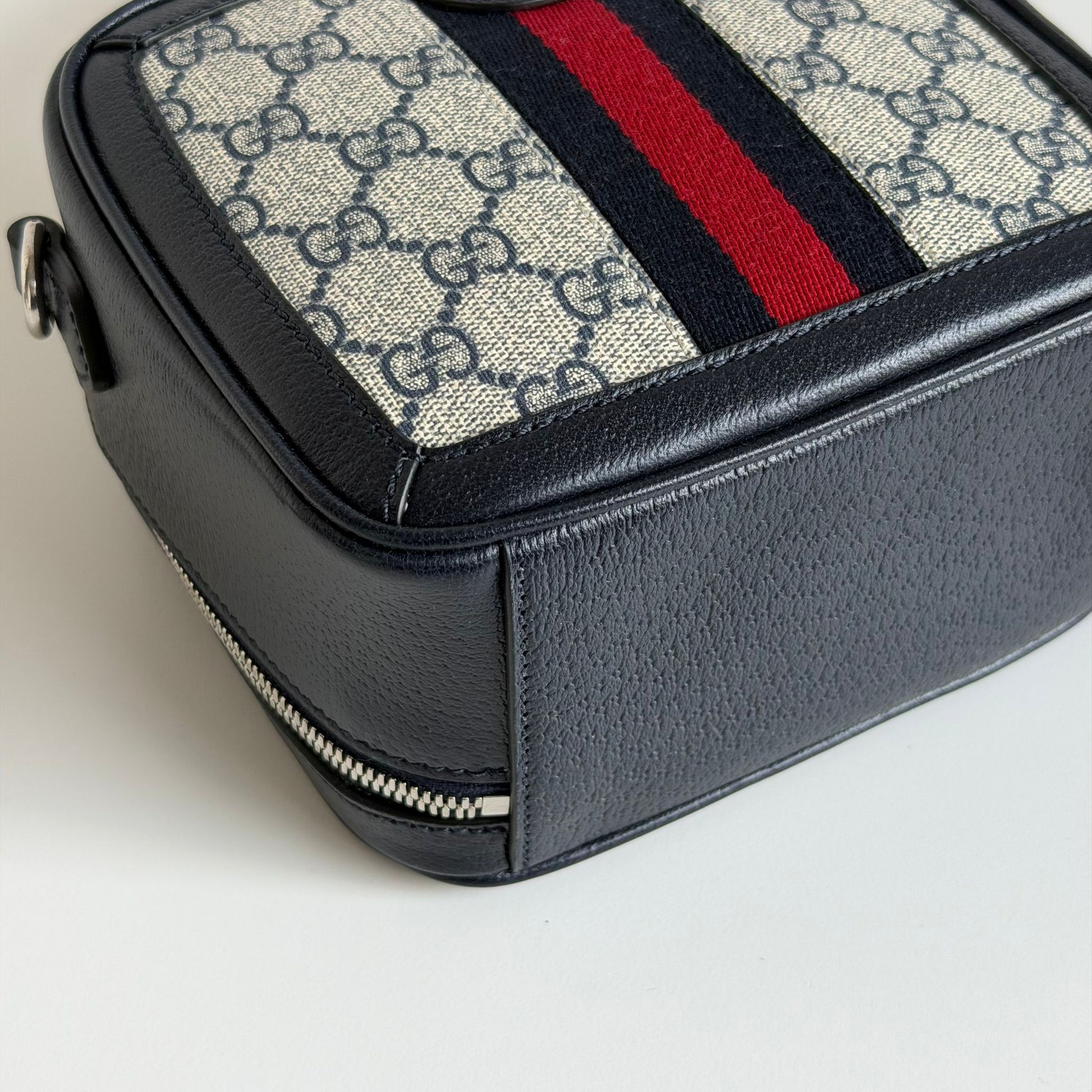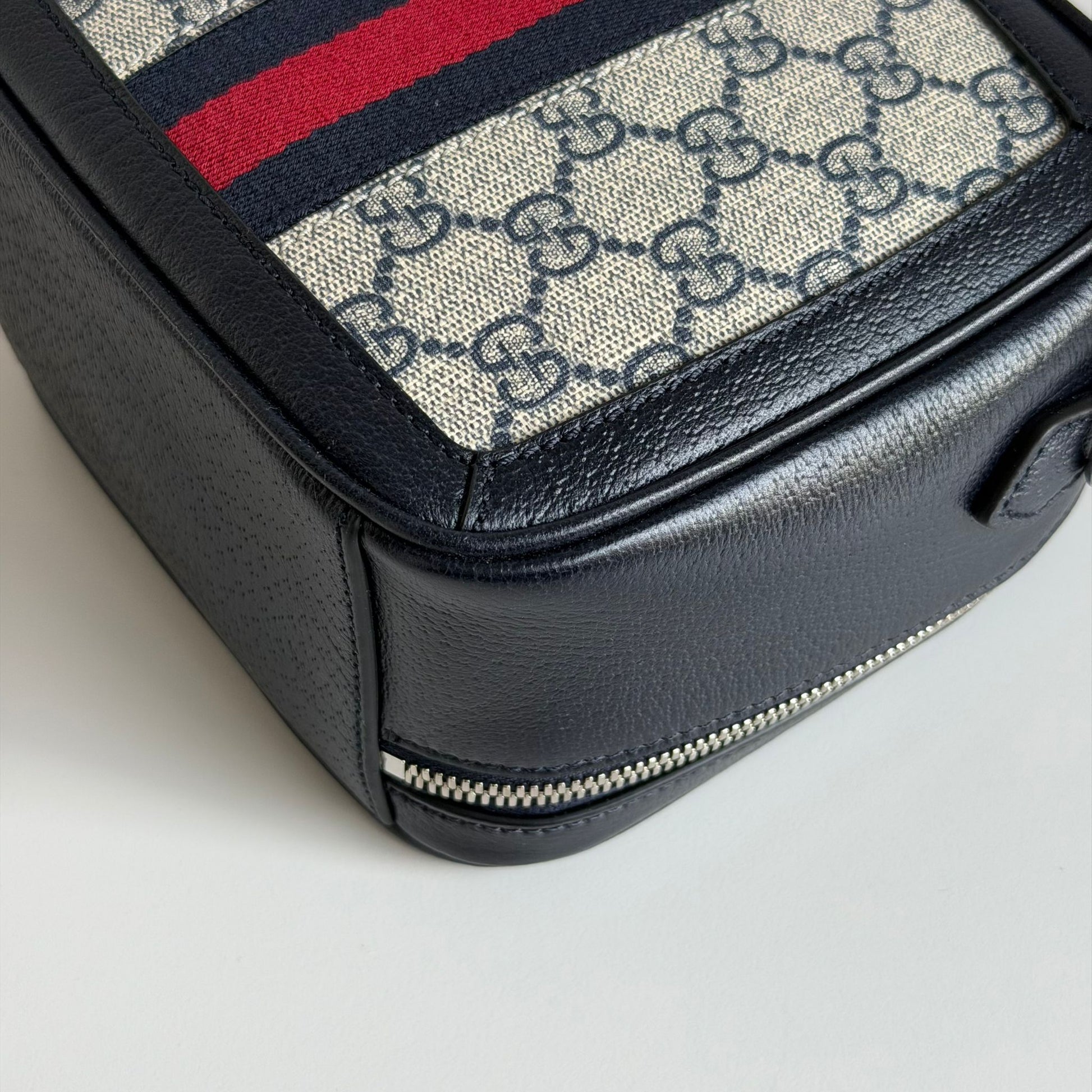Bellissima borsa Gucci Modello Ophidia zip Around Small in pelle blu scuro e tela Monogram GG beige-blu, dettagli web e hardware oro. Si indossa a mano e a tracolla, la tracolla è regolabile e rimovibile.