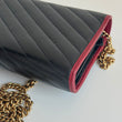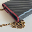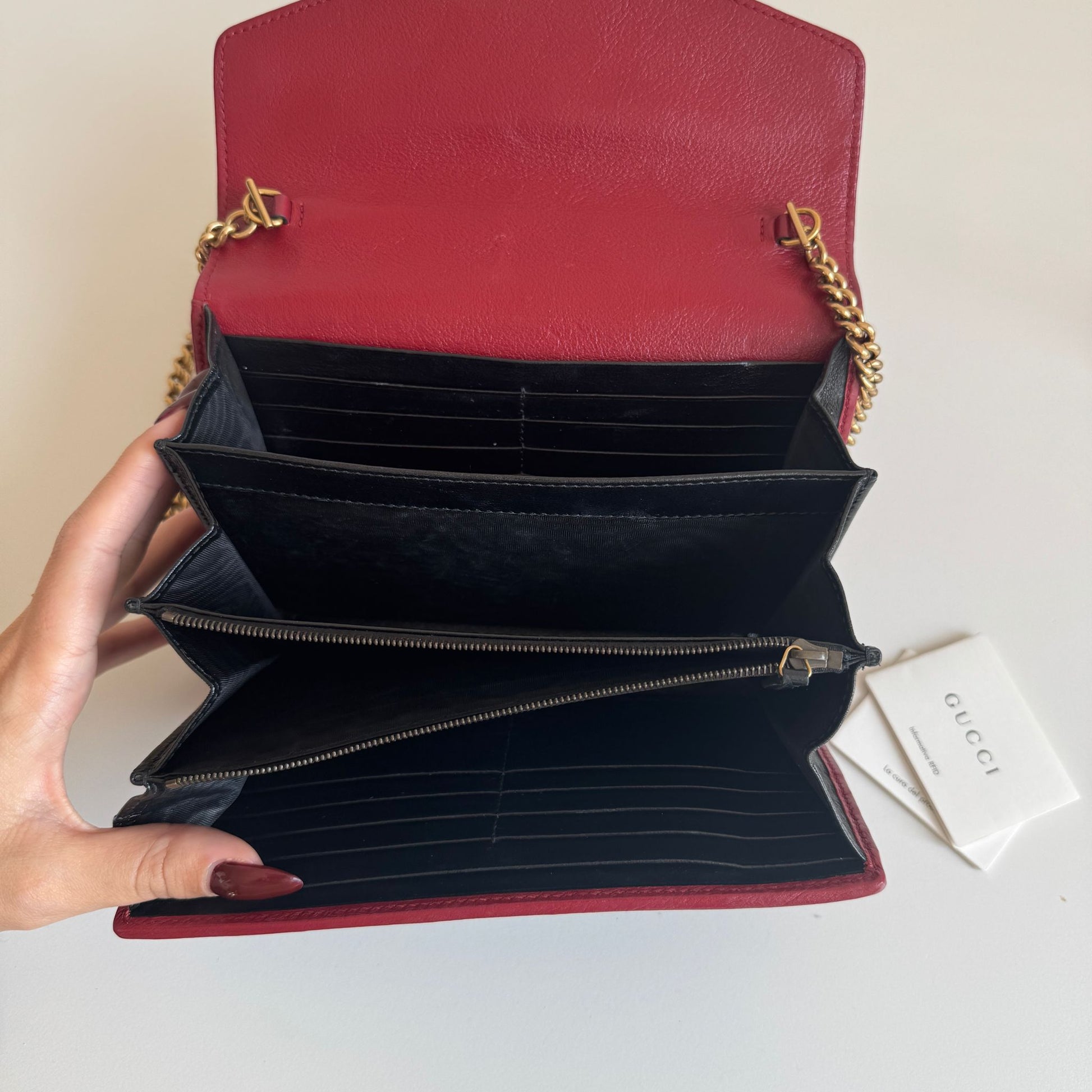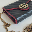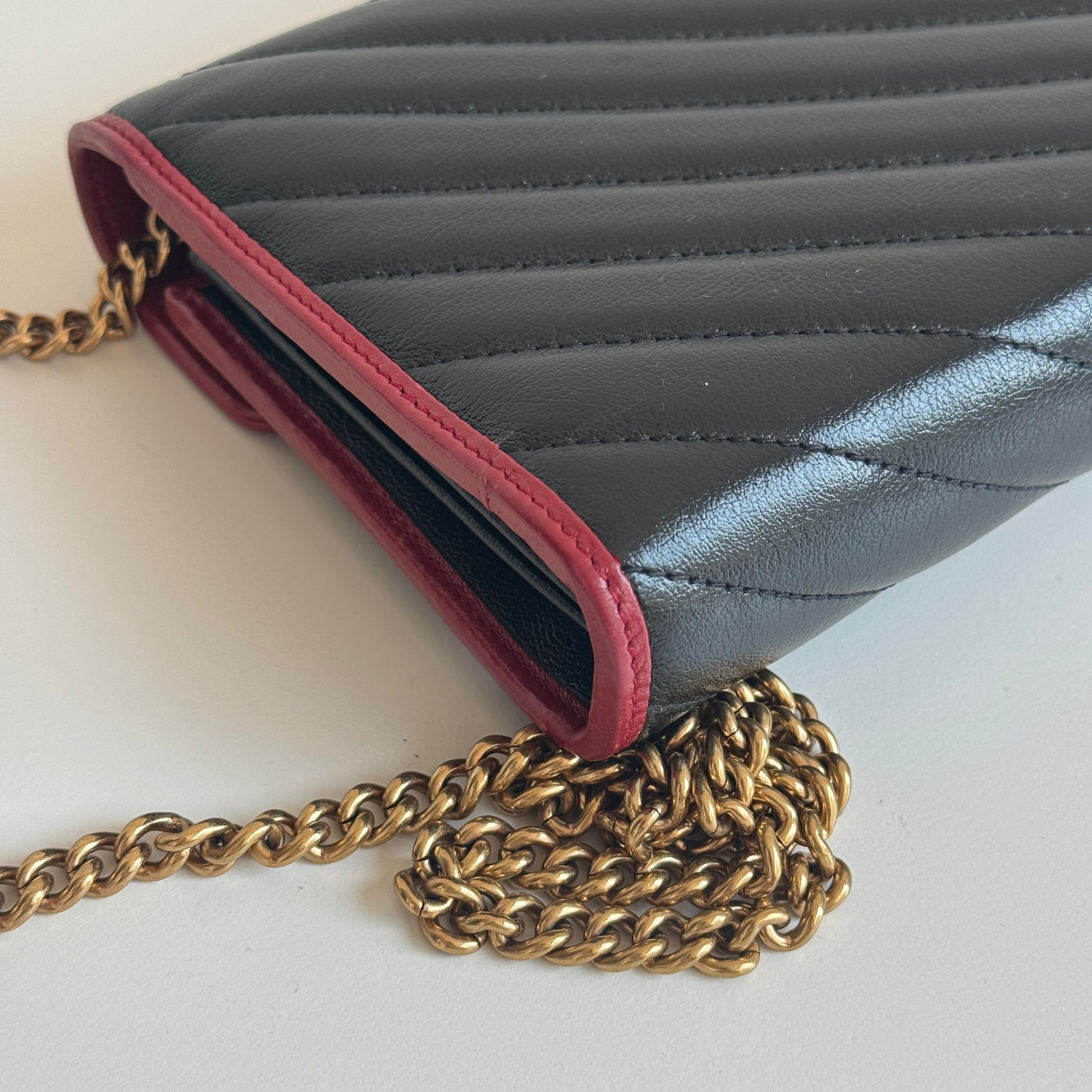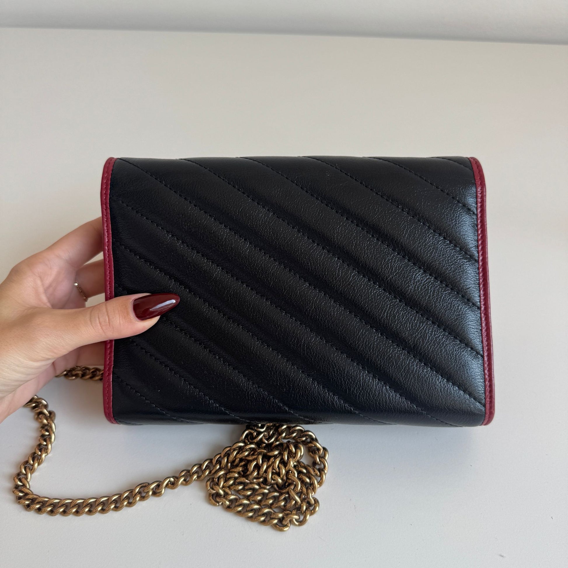 Bellissima borsa Gucci modello Marmont WOK in pelle nera con profili bordeaux e hardware oro. Si indossa a mano o a tracolla, la catena è rimovibile.