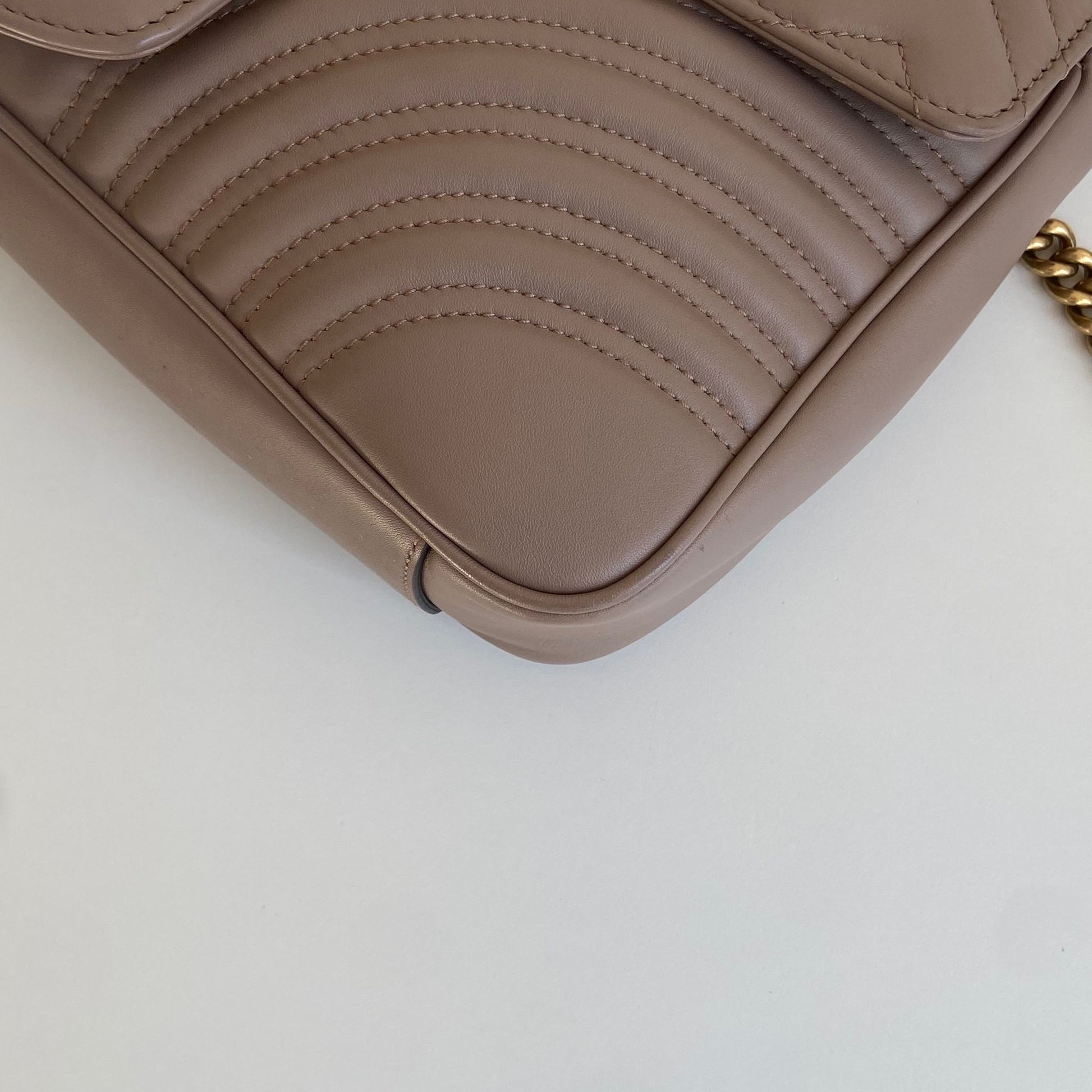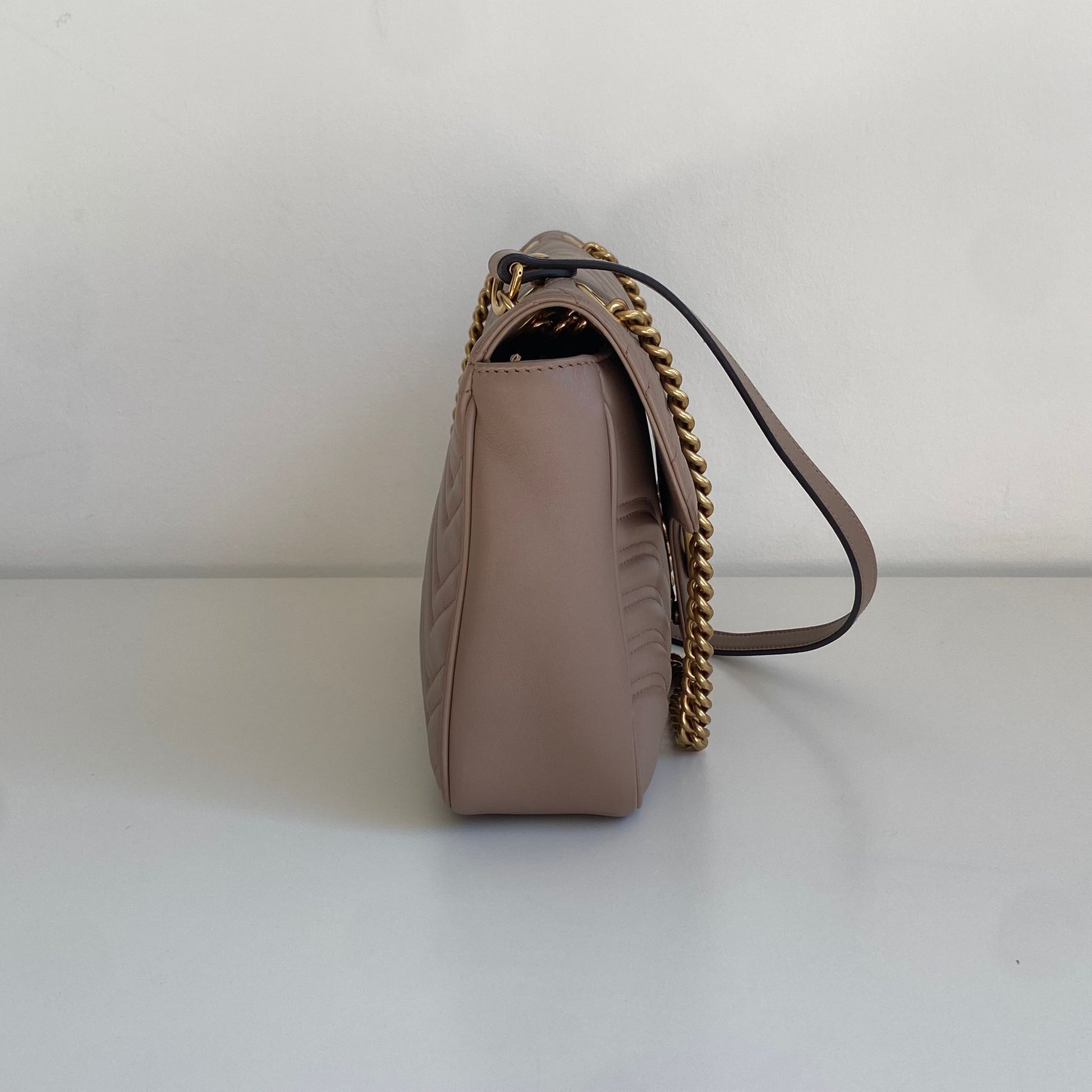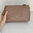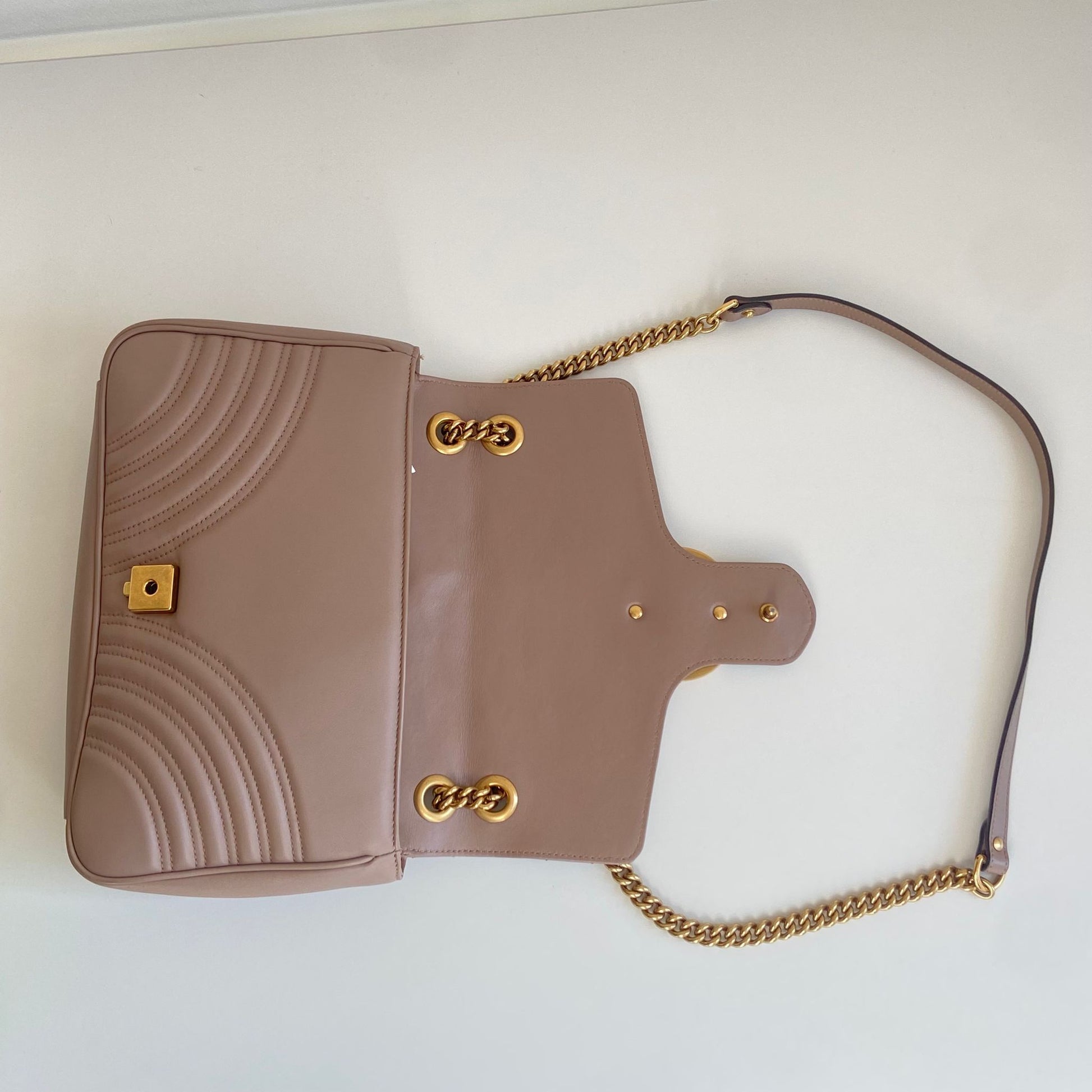 Bellissima borsa Gucci modello Marmont in pelle trapuntata color rosa antico e hardware oro. Si indossa a spalla o a tracolla.