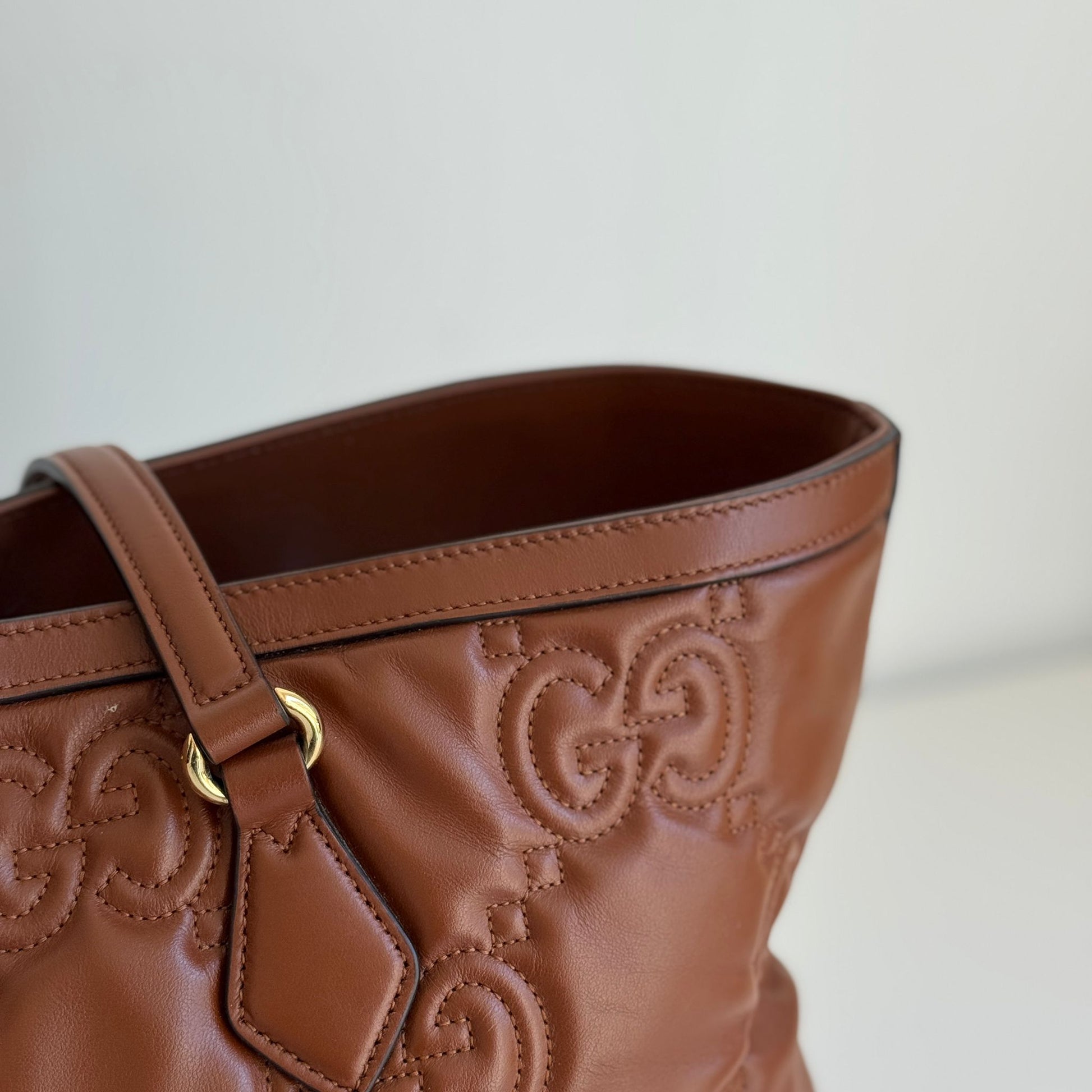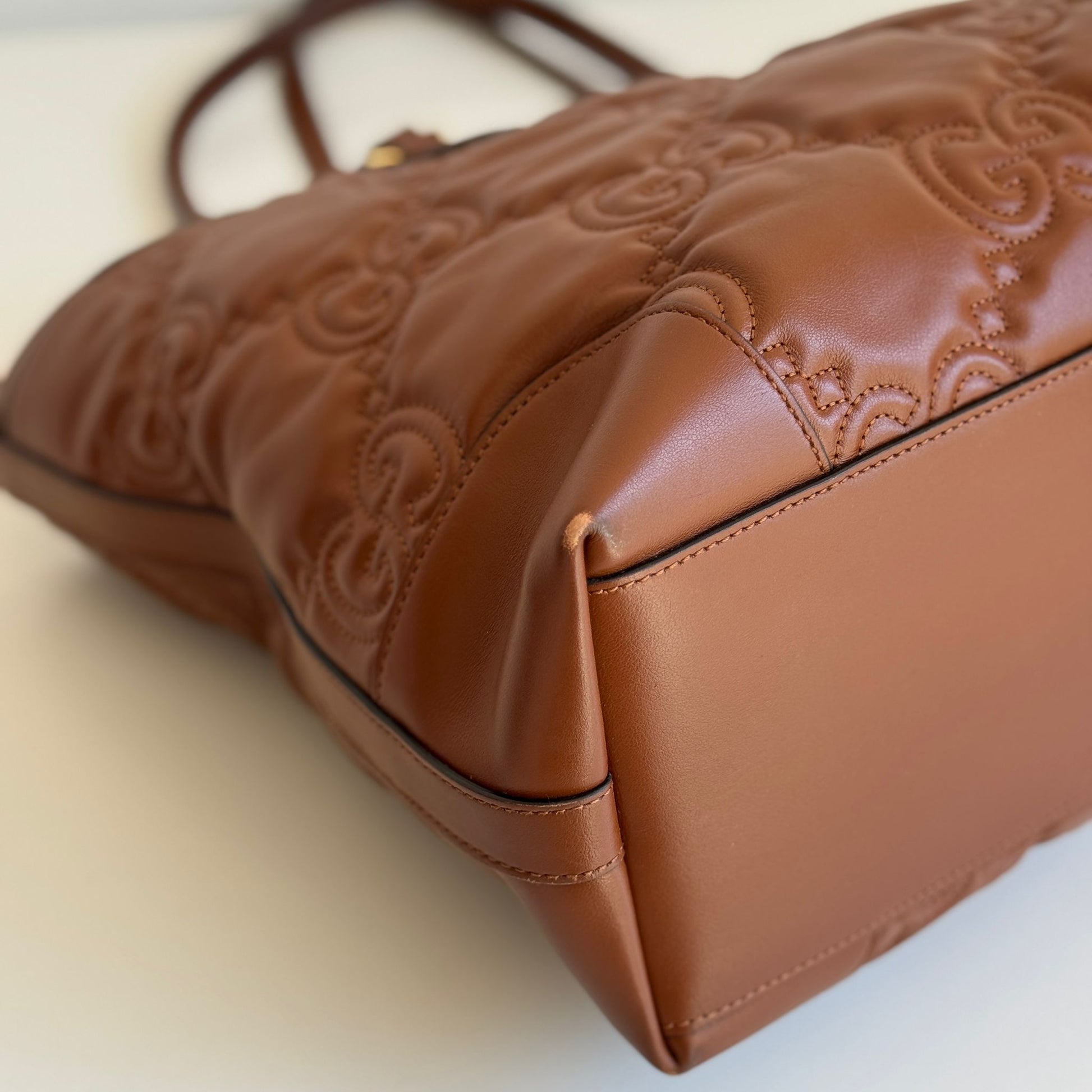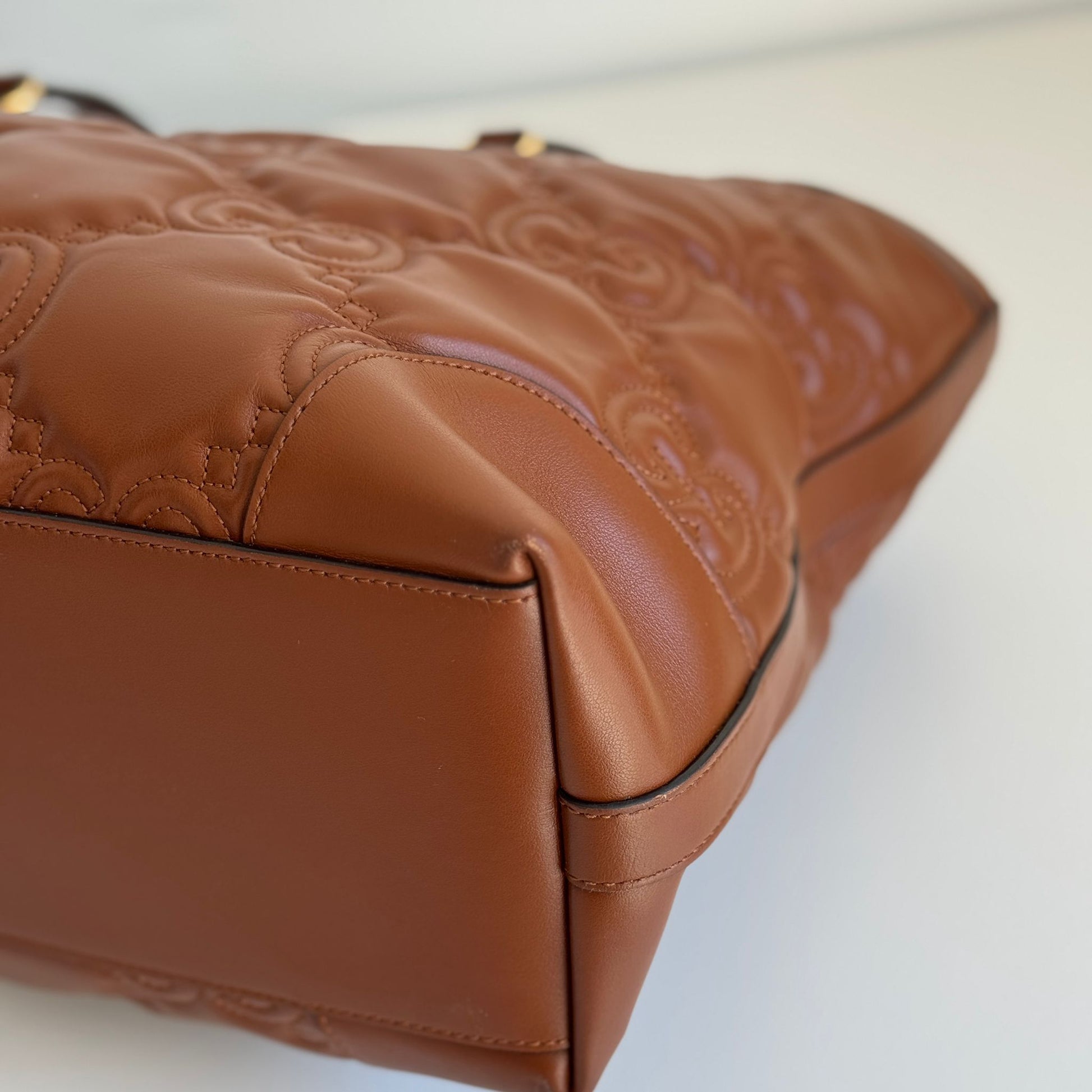 Bellissima shopper Gucci modello Ophidia Medium in pelle marrone GG Matelassé con hardware oro. Si indossa a spalla.