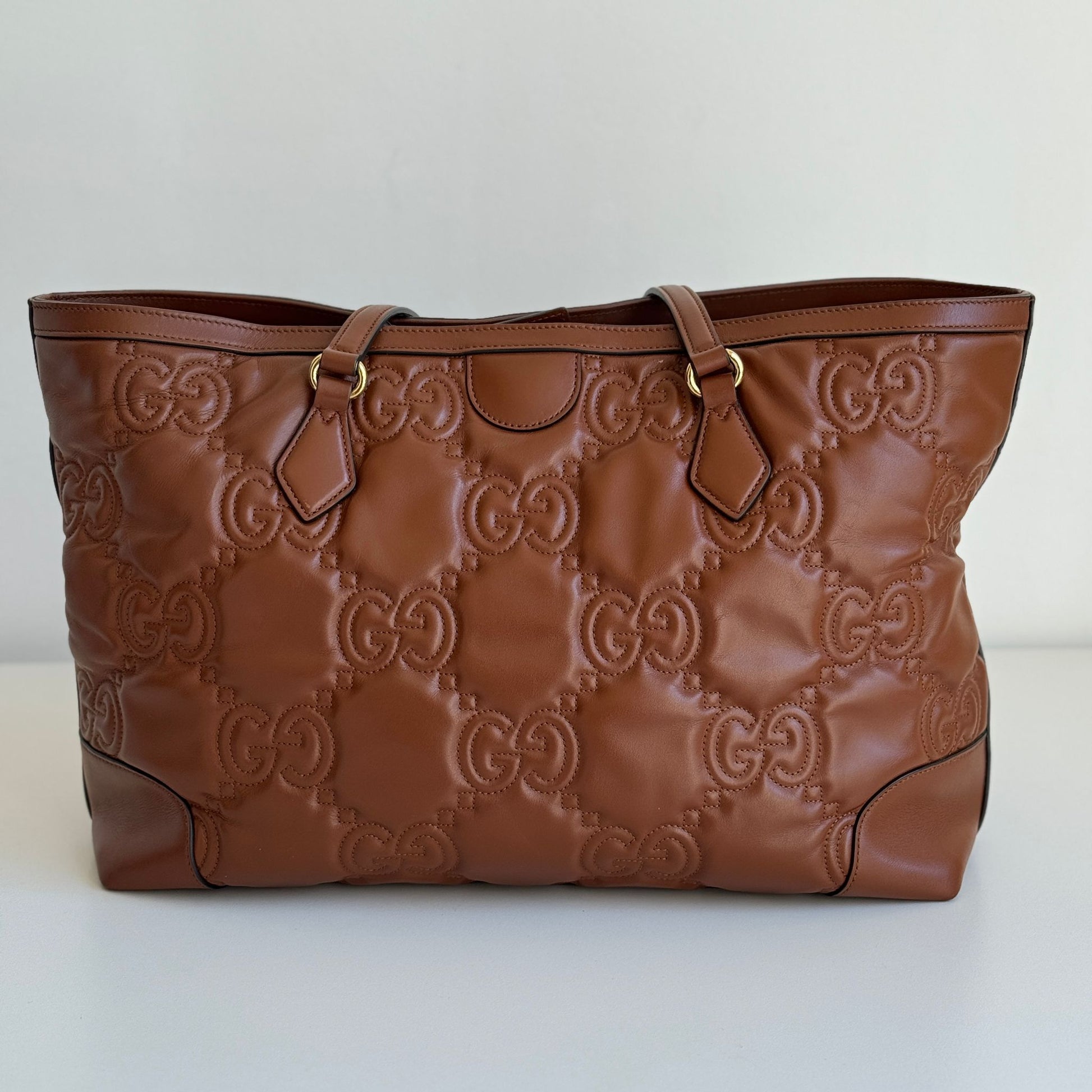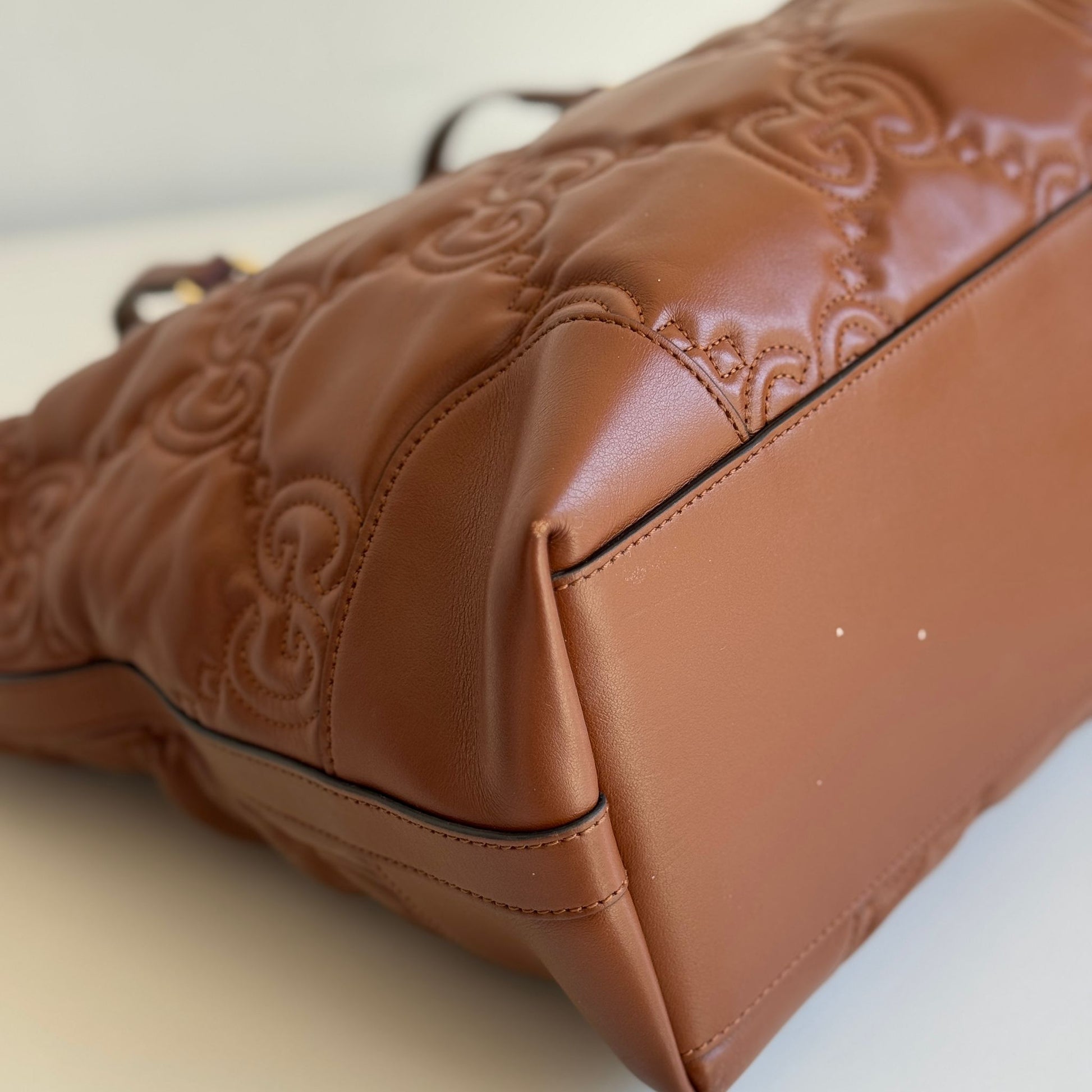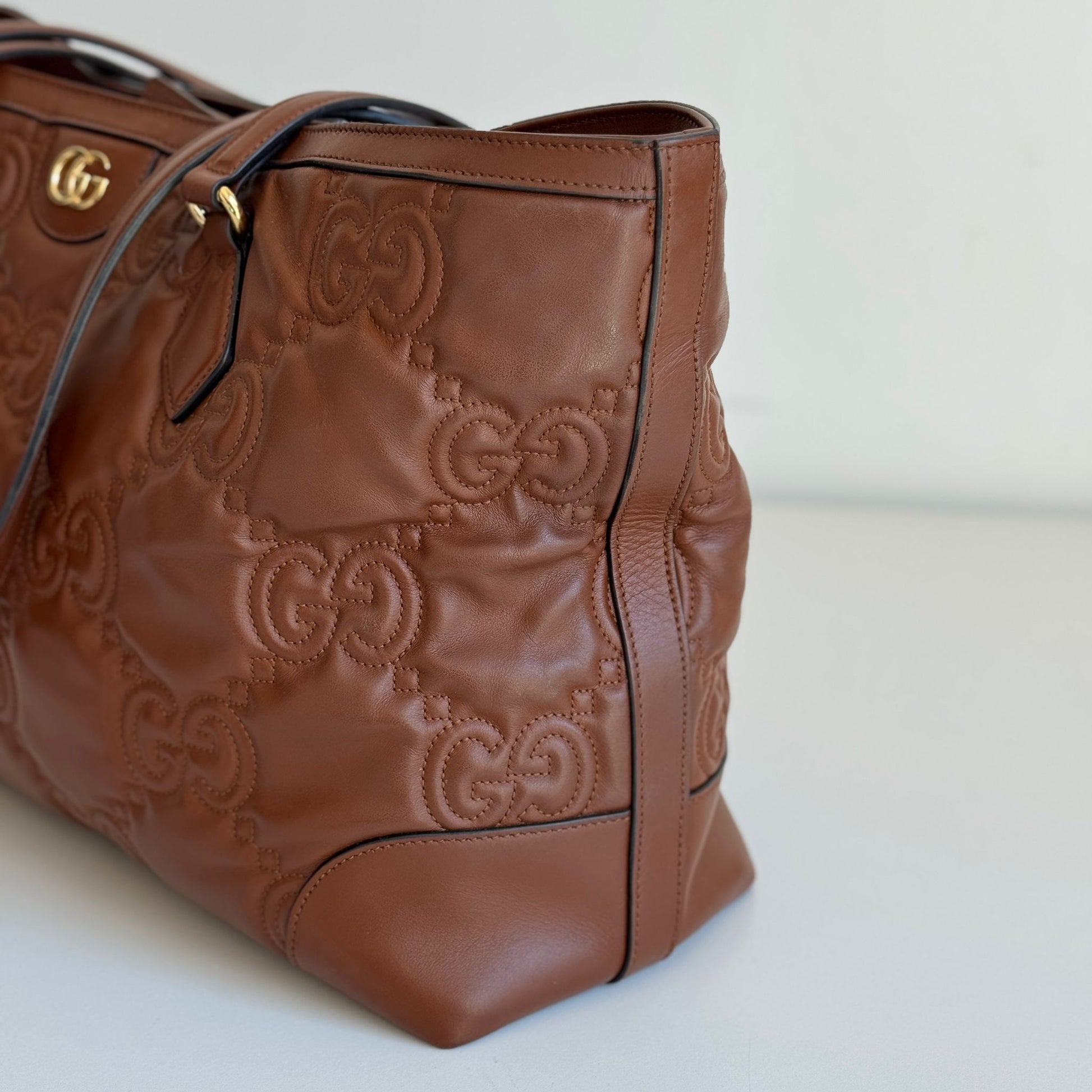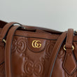 Bellissima shopper Gucci modello Ophidia Medium in pelle marrone GG Matelassé con hardware oro. Si indossa a spalla.
