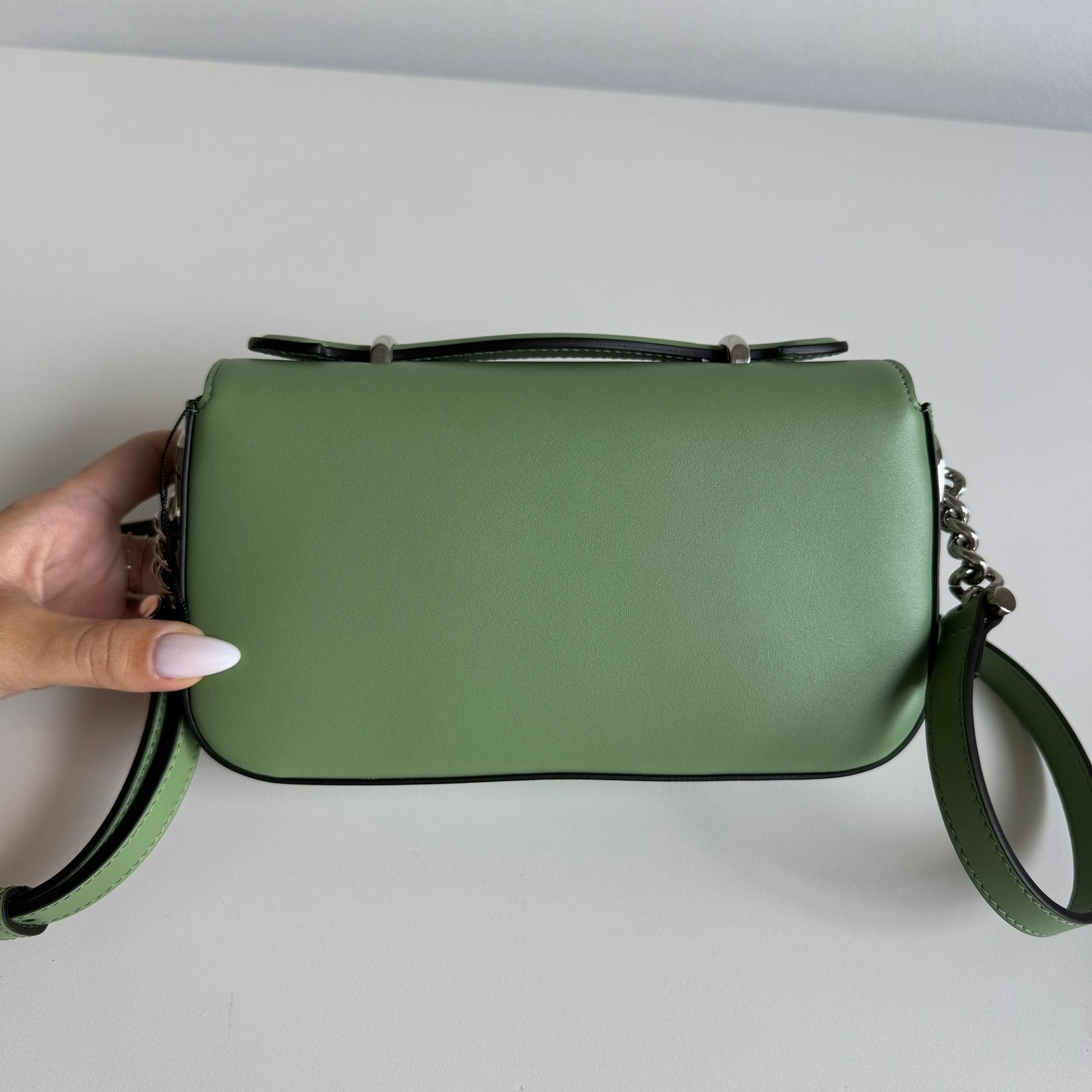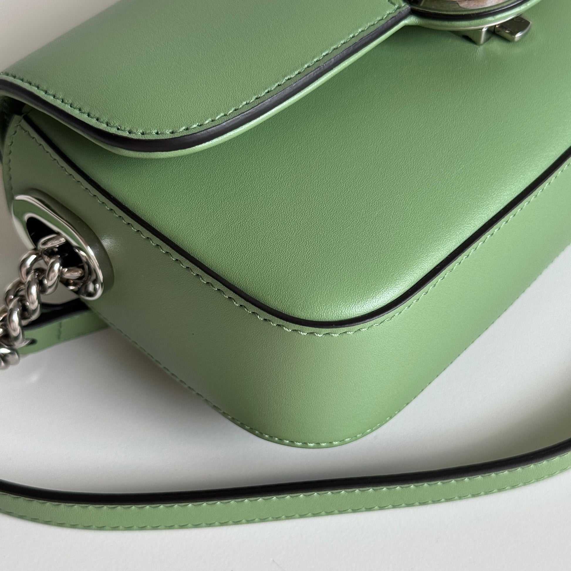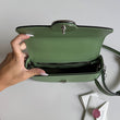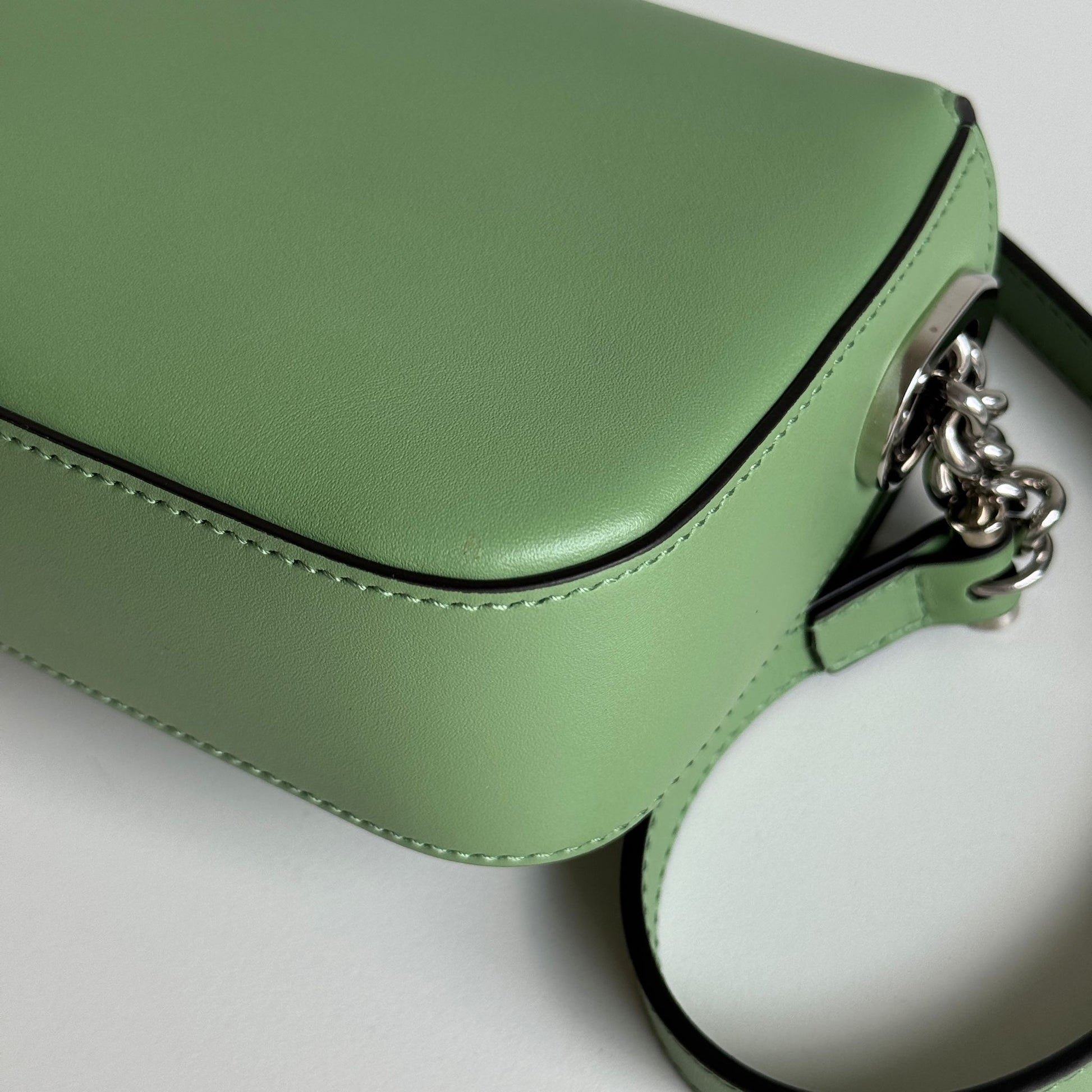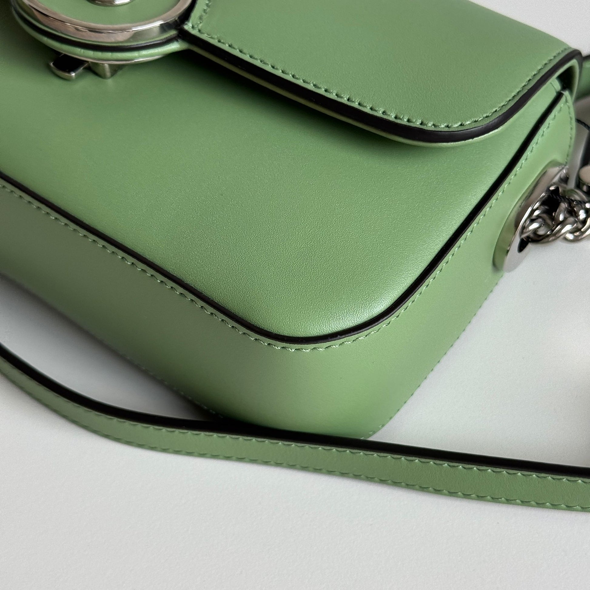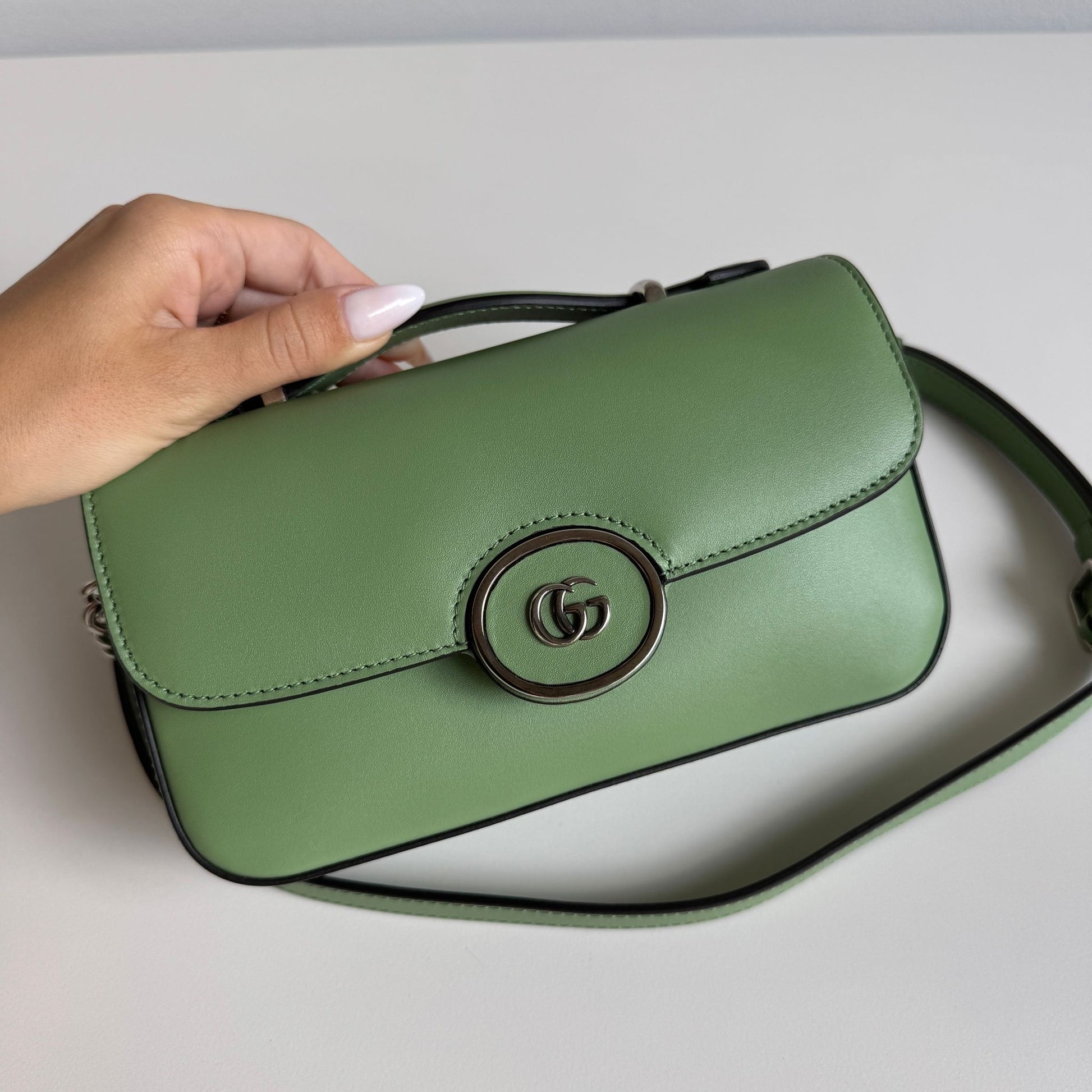Bellissima borsa Gucci modello Petite in pelle verde pastello e hardware argento. Si indossa a mano e a tracolla. La tracolla è regolabile e rimovibile.